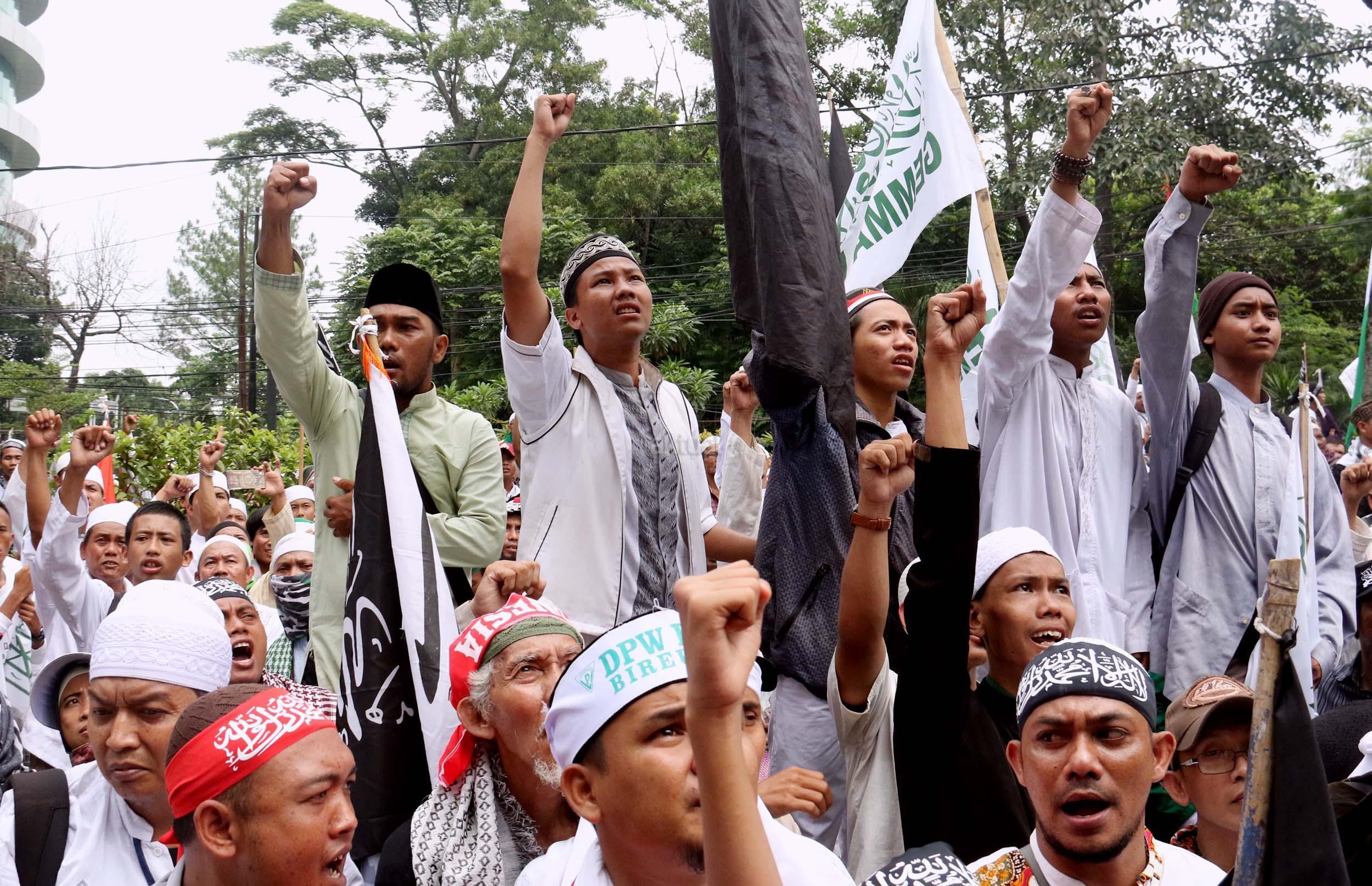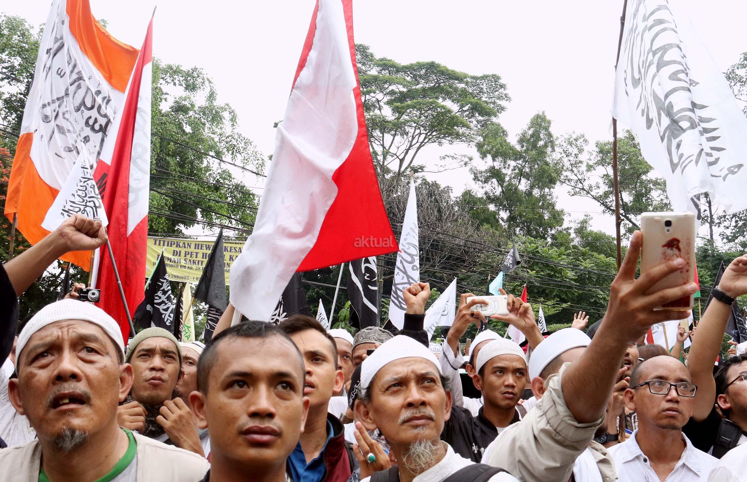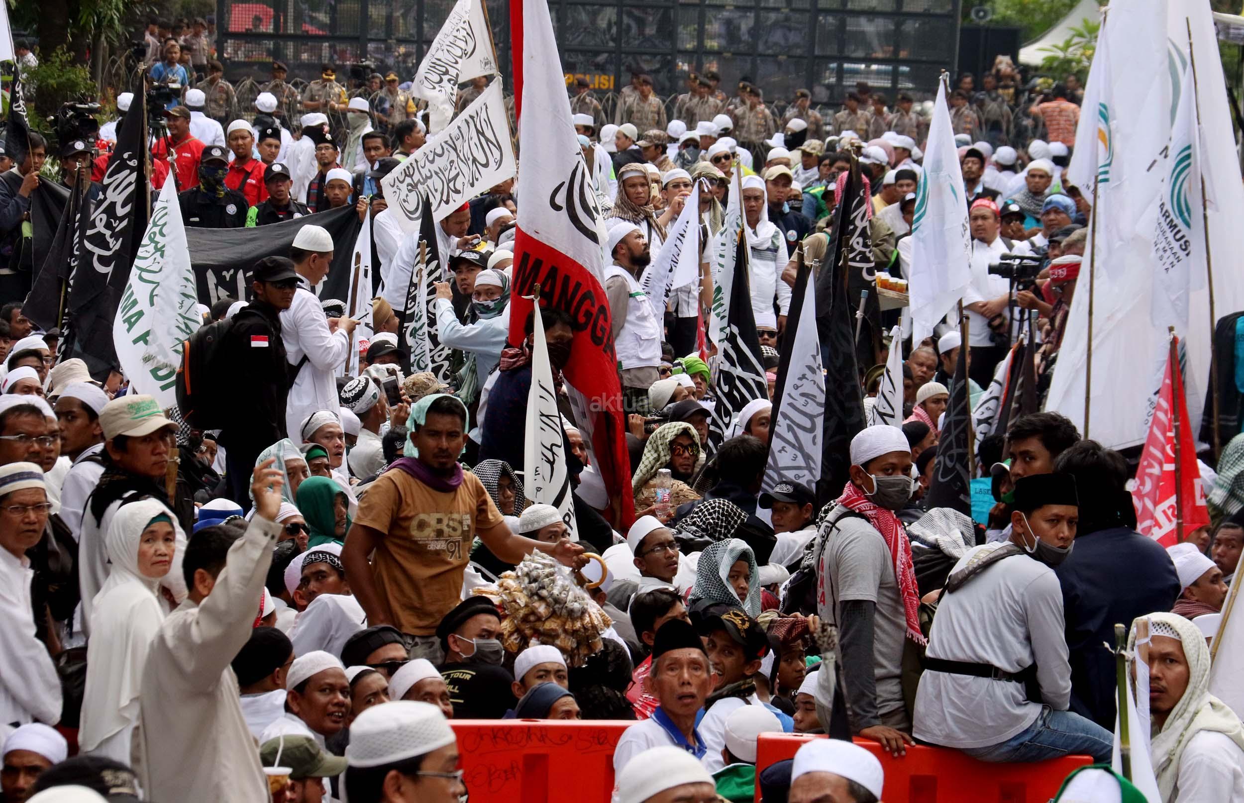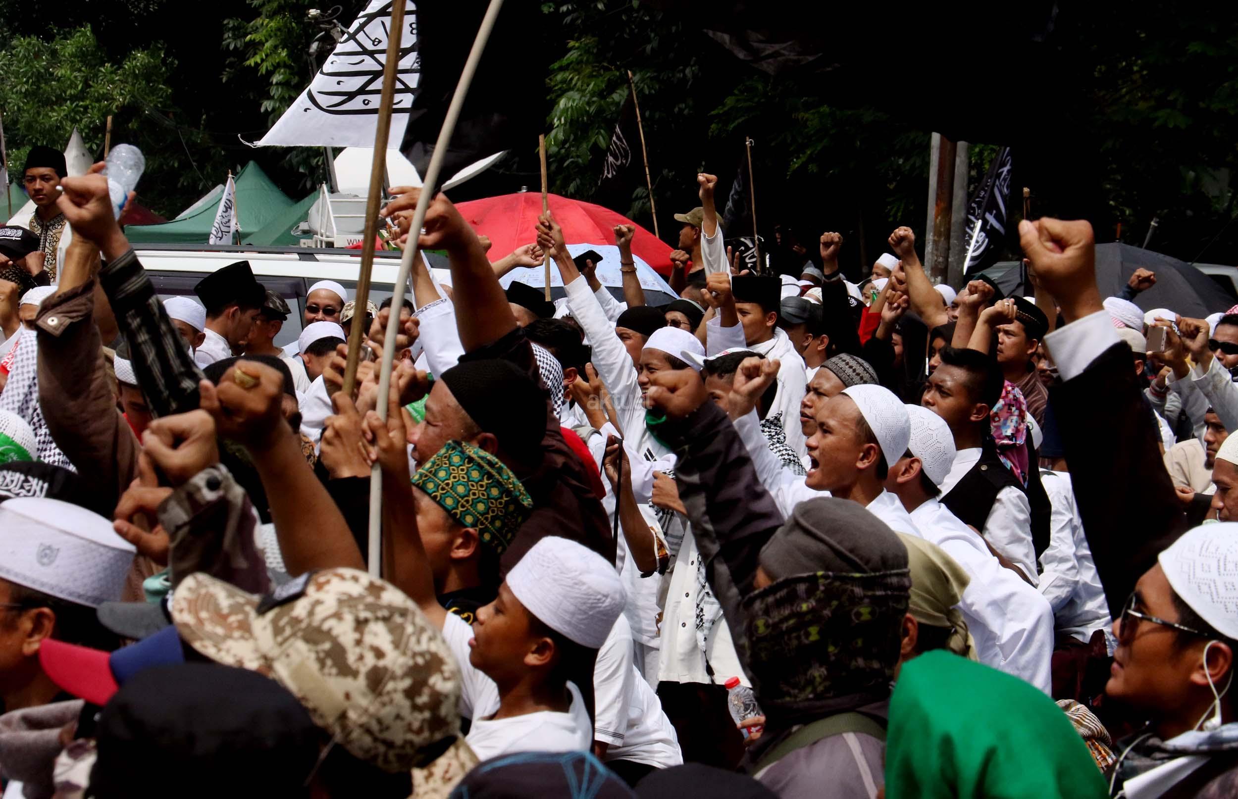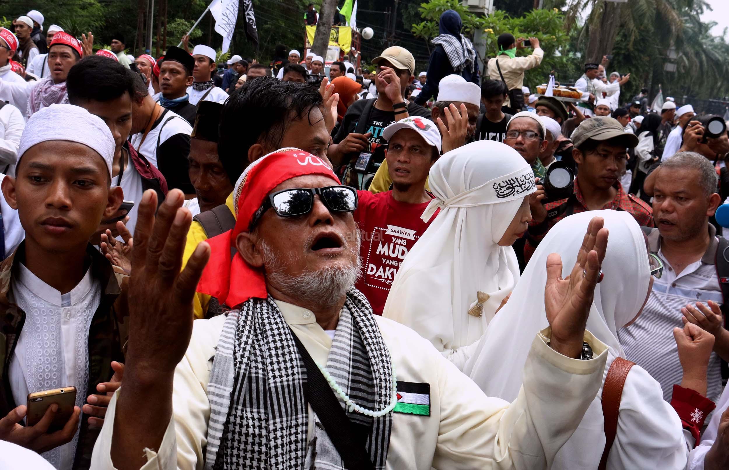 Ribuan umat Islam dari berbagai daerah berdoa atas vonis yang dijatuhkan kepada Gubernur Penista Agama Basuki Tjahaja Purnama (Ahok) di depan kantor Kementan, Jakarta, Selasa (9/5/2017). Hakim Pengadilan Negeri Jakarta Utara memutuskan menjatuhi hukuman Ahok selama dua tahun penjara karena terbukti melanggar Pasal 156 KUHP tentang penodaan agama. AKTUAL/Munzir