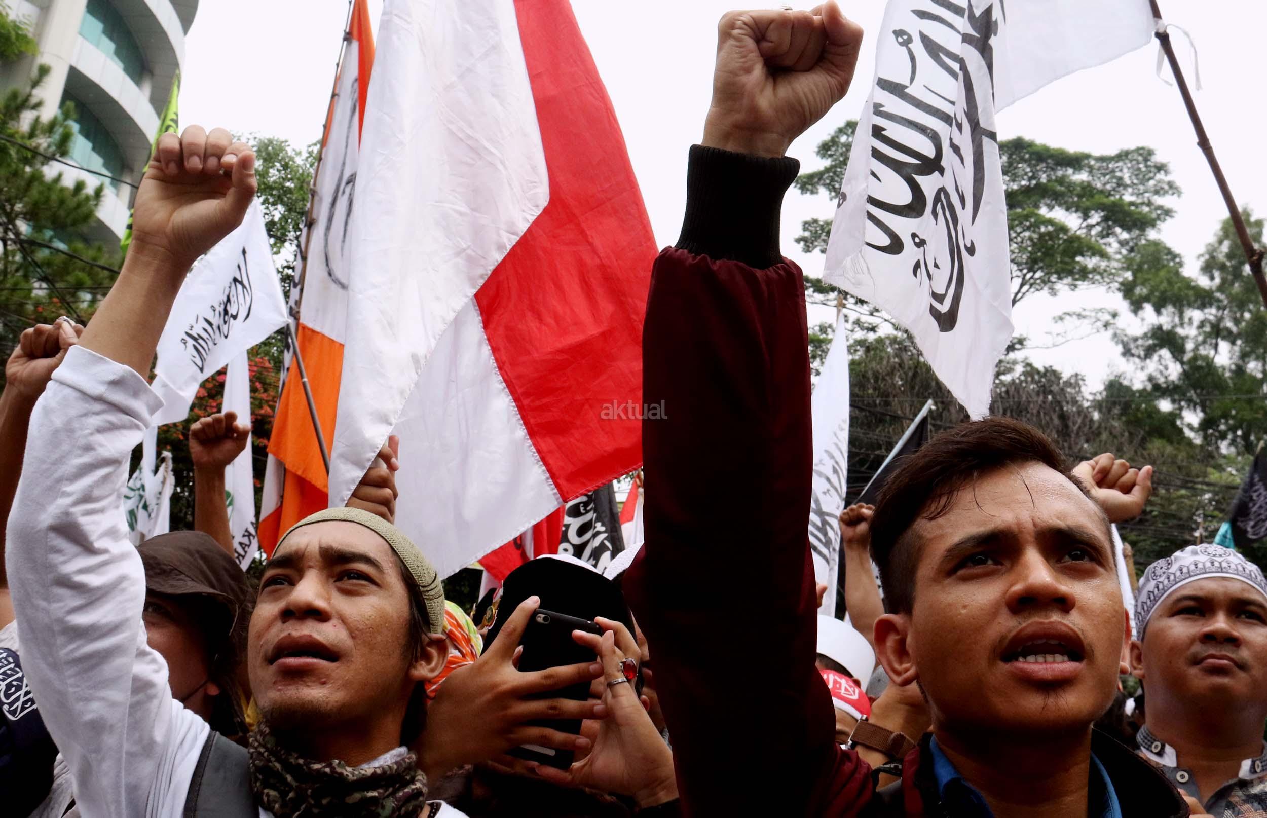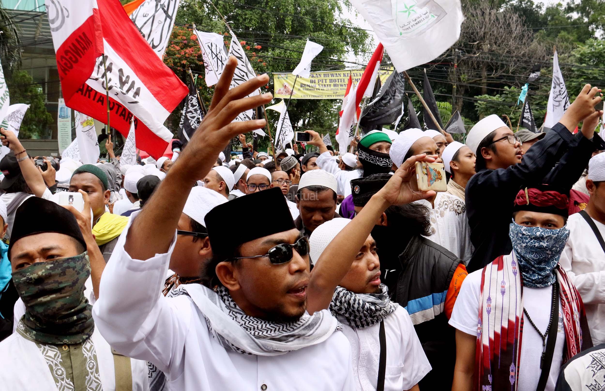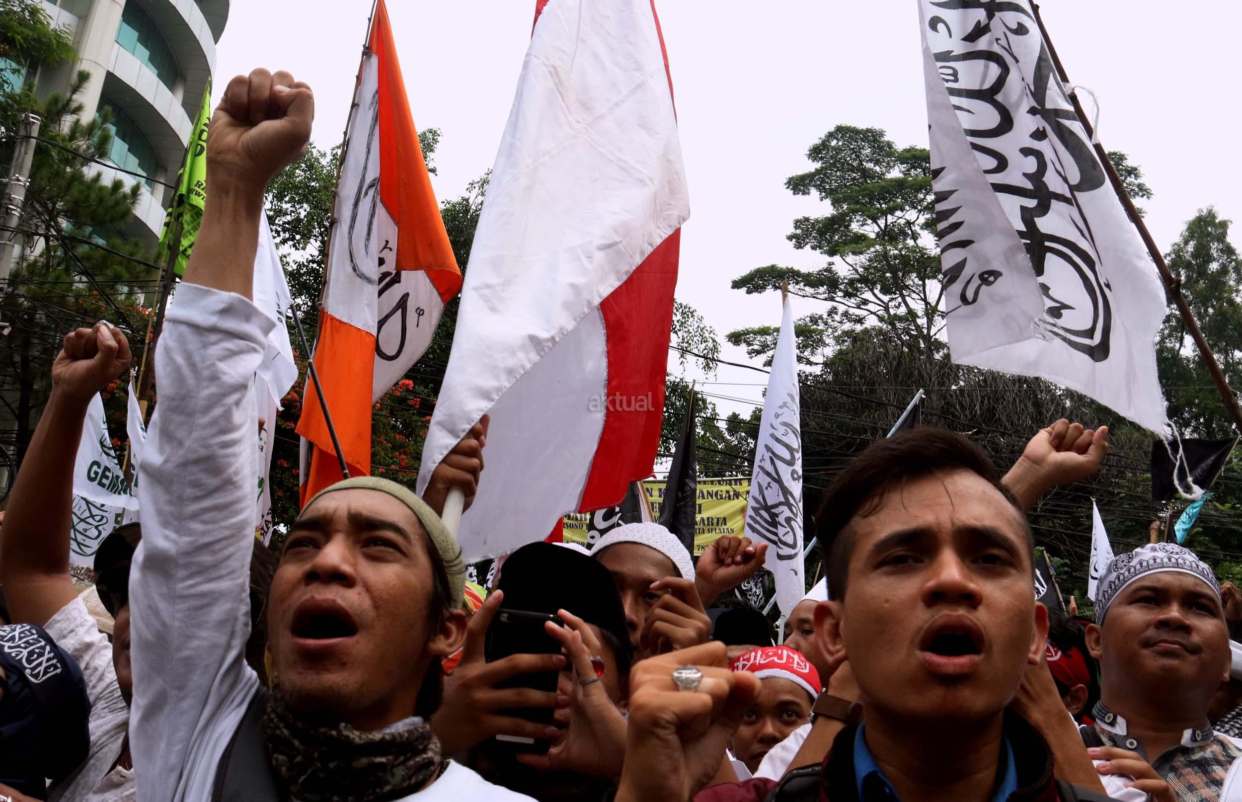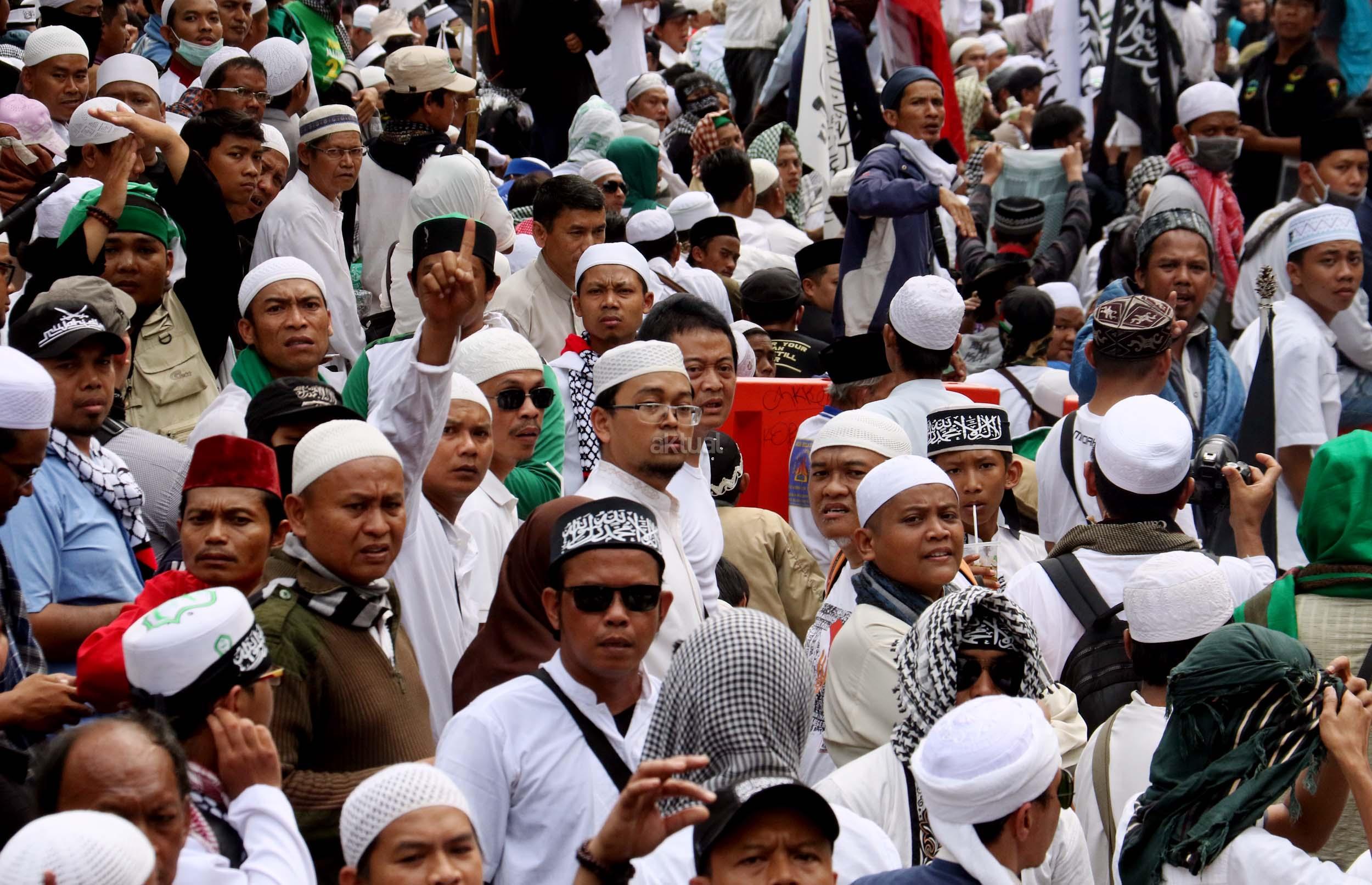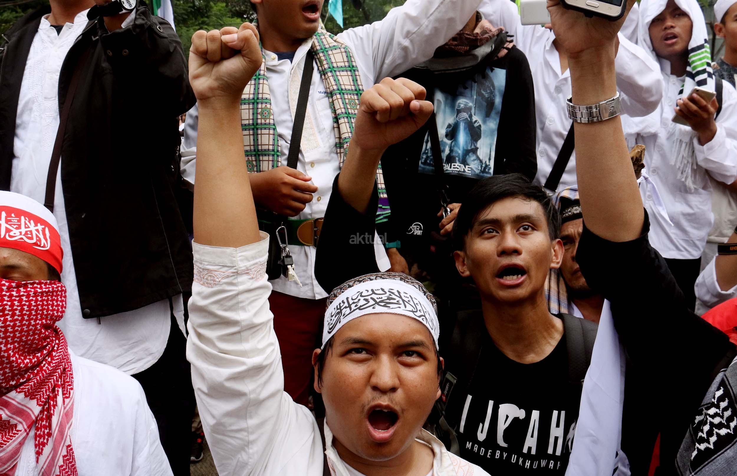 Ribuan umat Islam dari berbagai daerah berdoa atas vonis yang dijatuhkan kepada Gubernur Penista Agama Basuki Tjahaja Purnama (Ahok) di depan kantor Kementan, Jakarta, Selasa (9/5/2017). Hakim Pengadilan Negeri Jakarta Utara memutuskan menjatuhi hukuman Ahok selama dua tahun penjara karena terbukti melanggar Pasal 156 KUHP tentang penodaan agama. AKTUAL/Munzir
