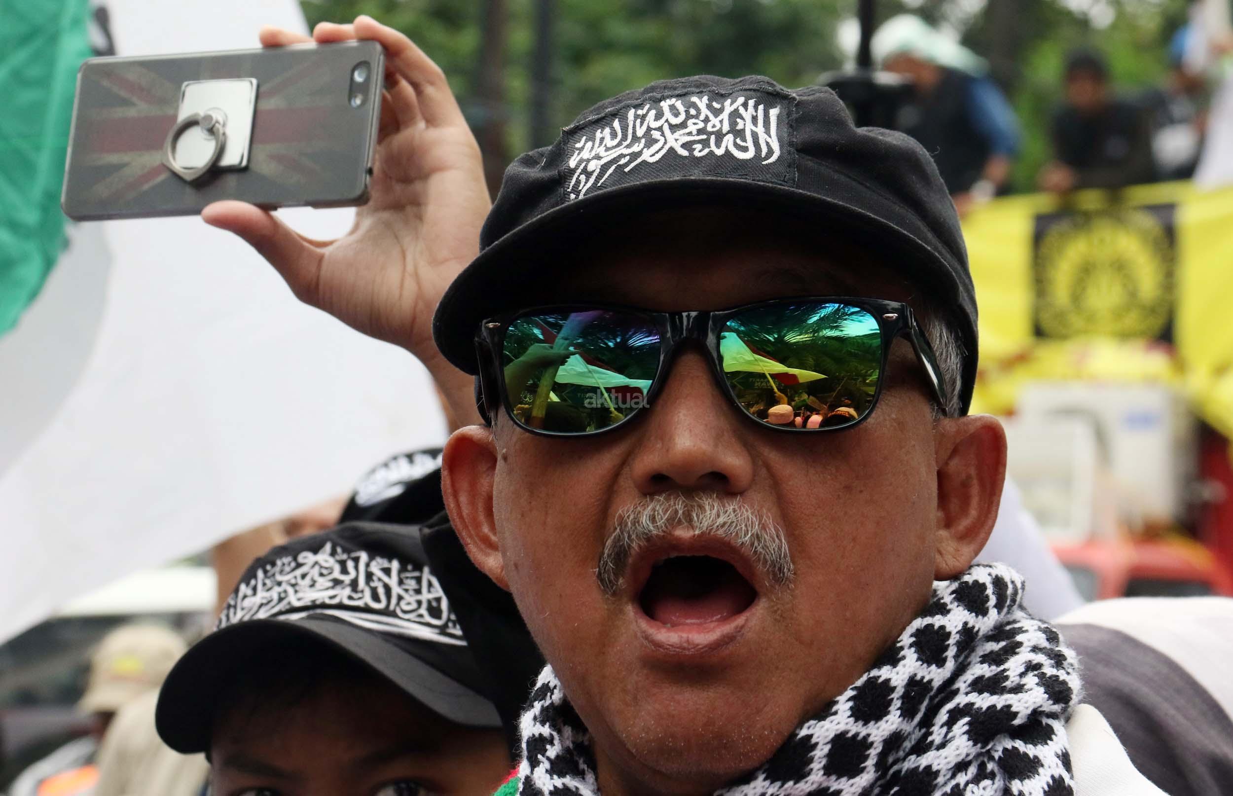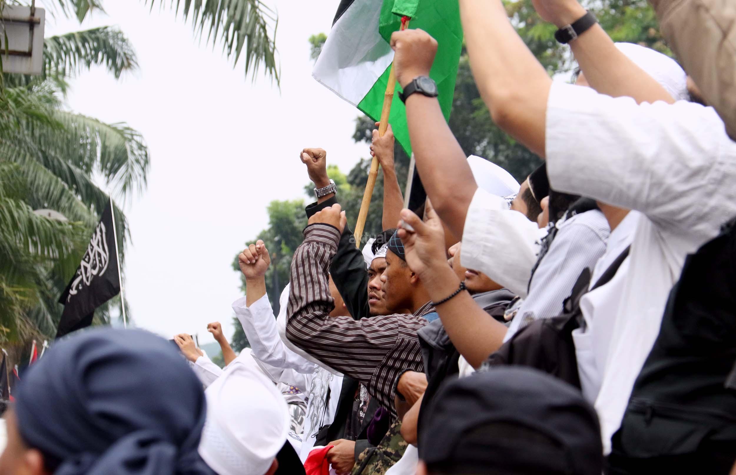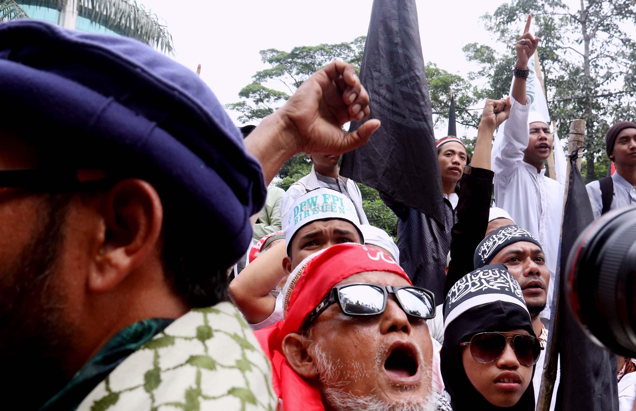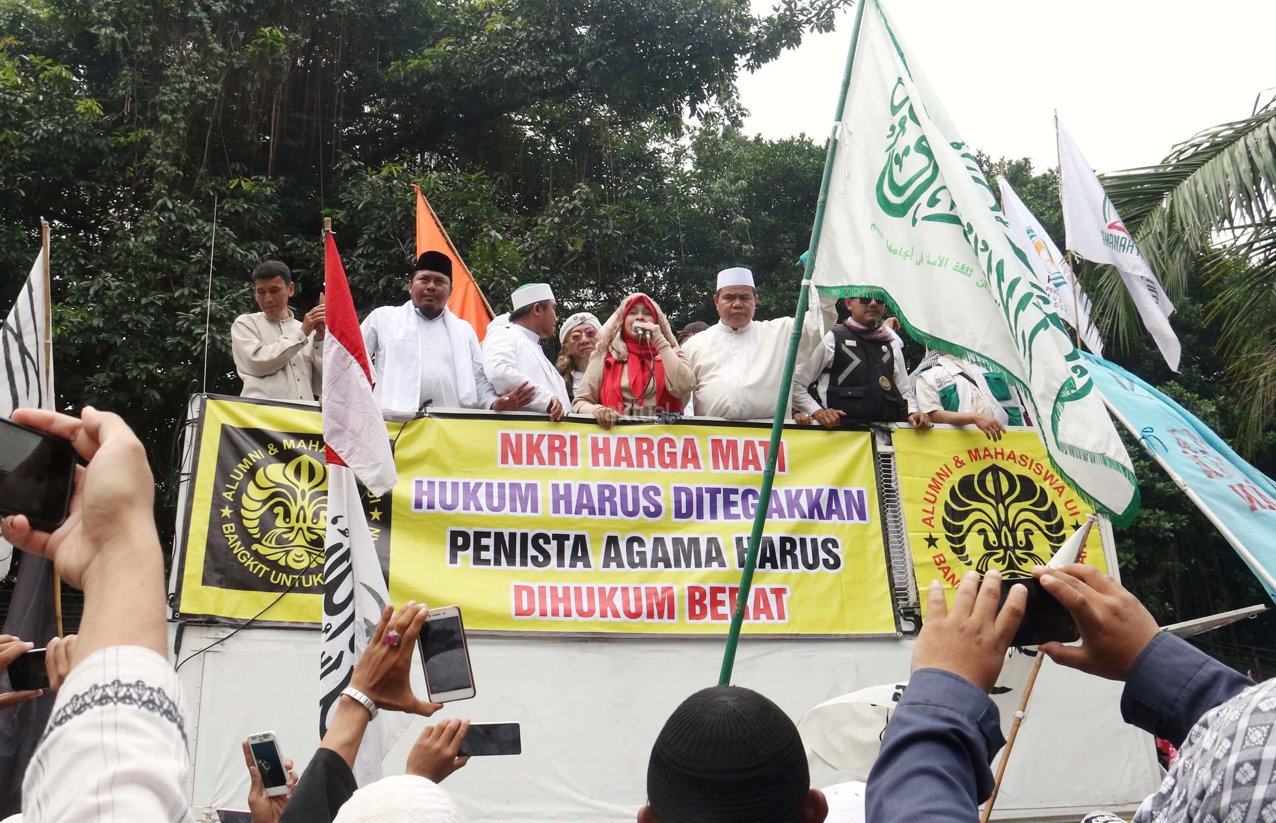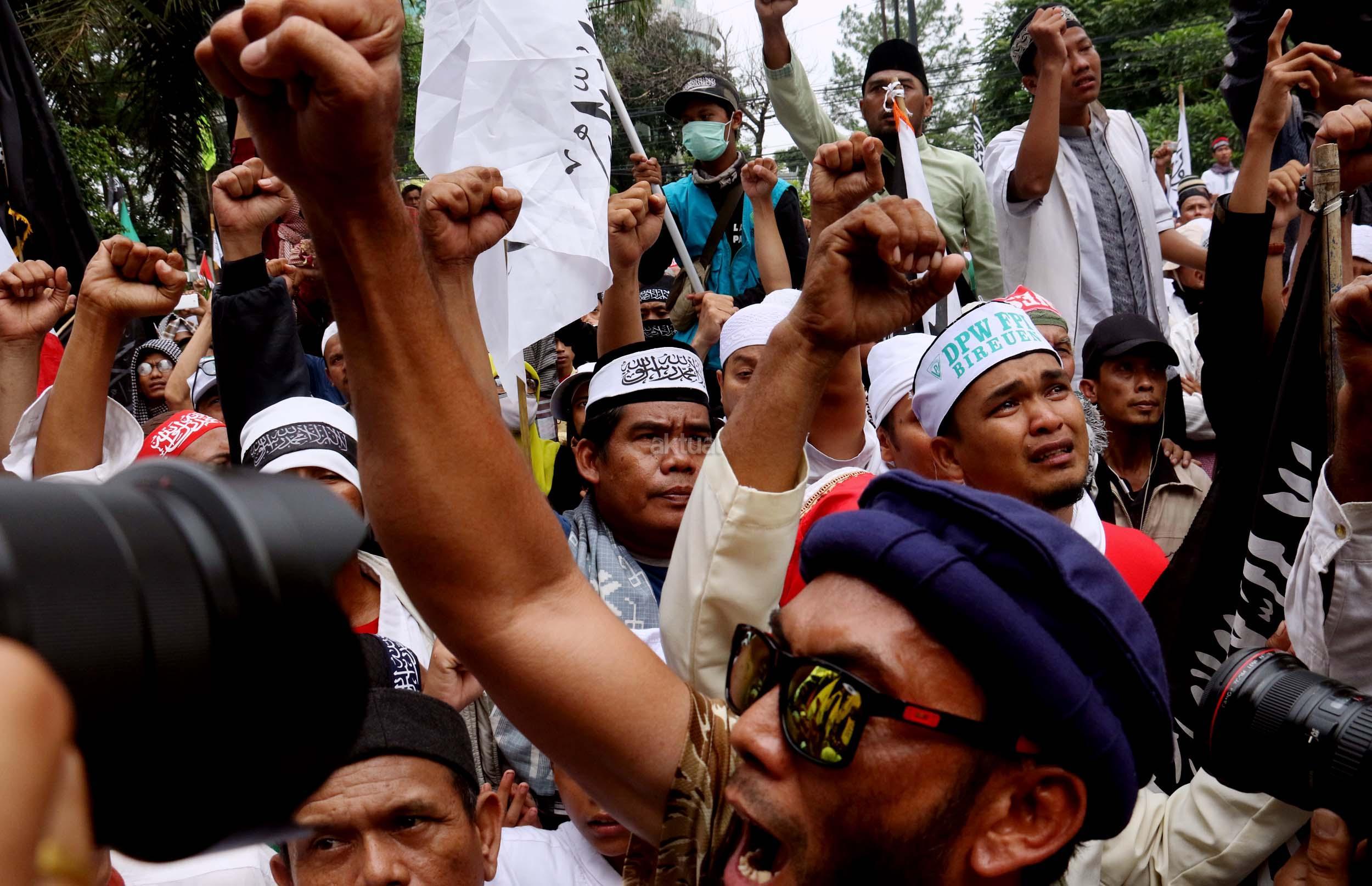 Ribuan umat Islam dari berbagai daerah berdoa atas vonis yang dijatuhkan kepada Gubernur Penista Agama Basuki Tjahaja Purnama (Ahok) di depan kantor Kementan, Jakarta, Selasa (9/5/2017). Hakim Pengadilan Negeri Jakarta Utara memutuskan menjatuhi hukuman Ahok selama dua tahun penjara karena terbukti melanggar Pasal 156 KUHP tentang penodaan agama. AKTUAL/Munzir