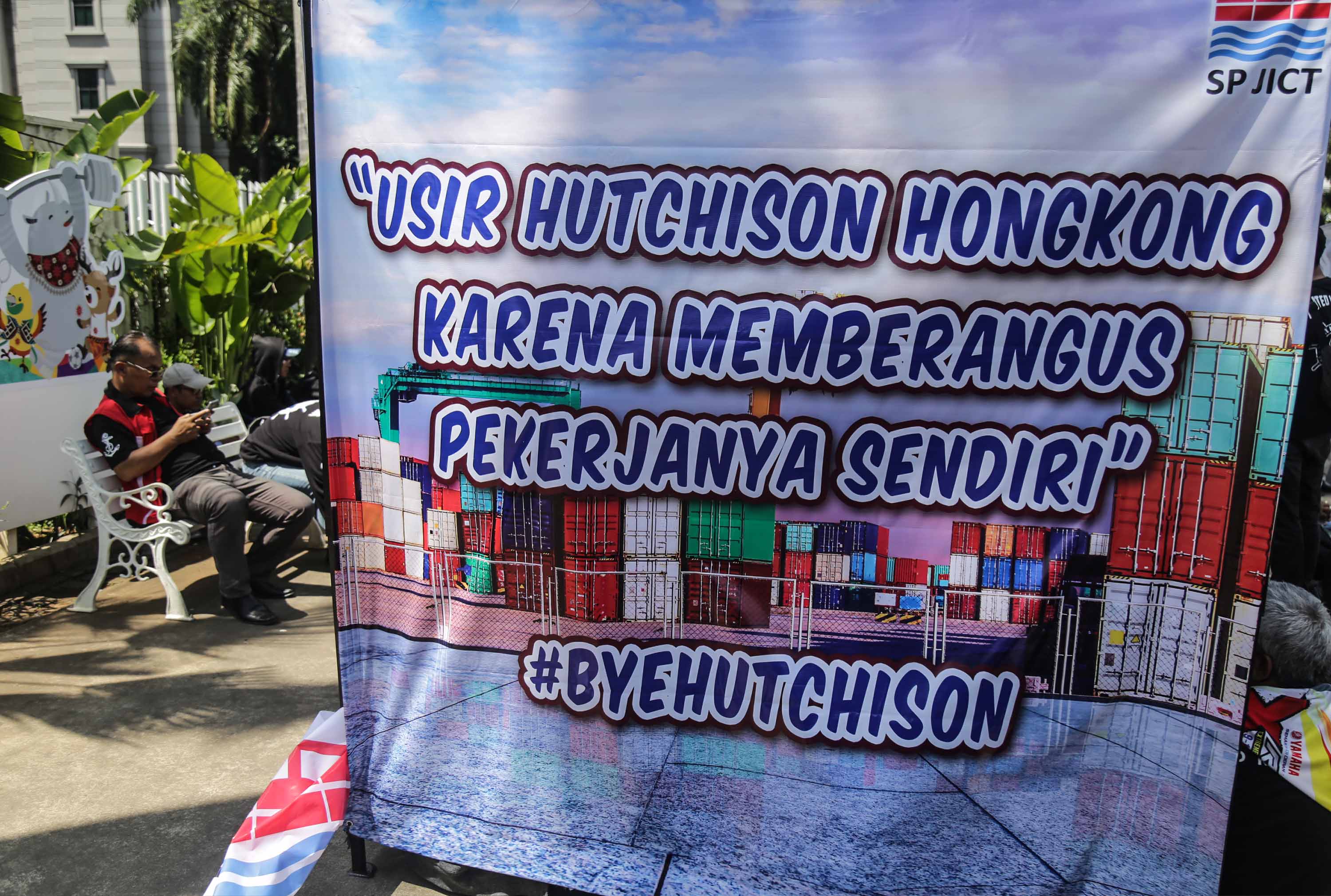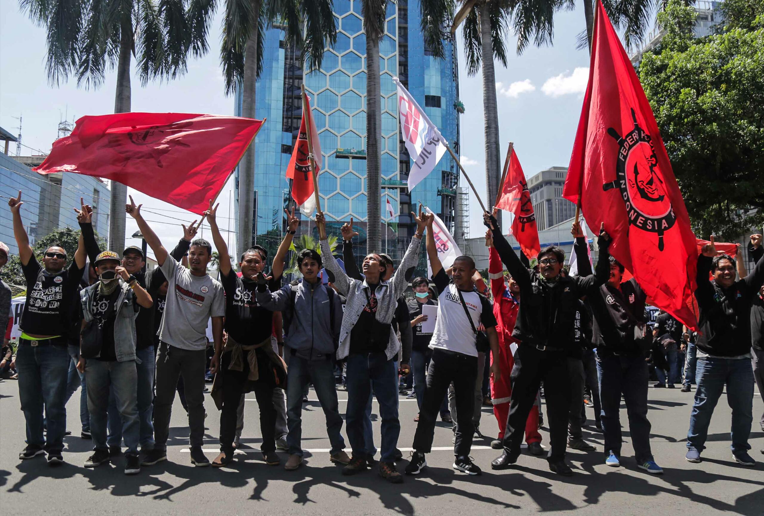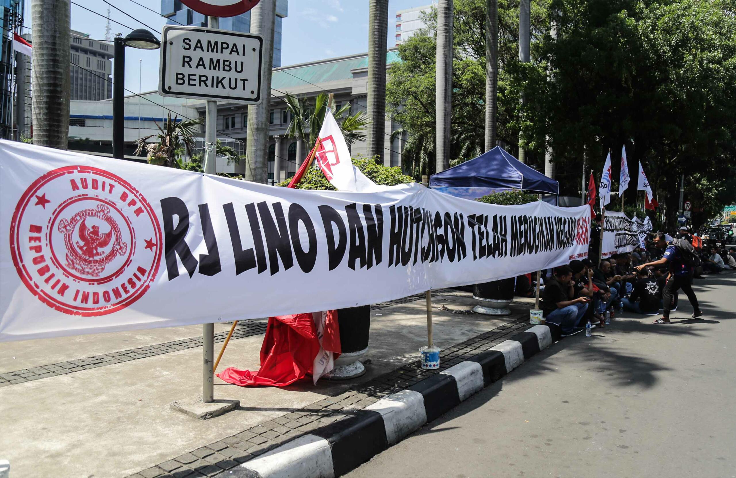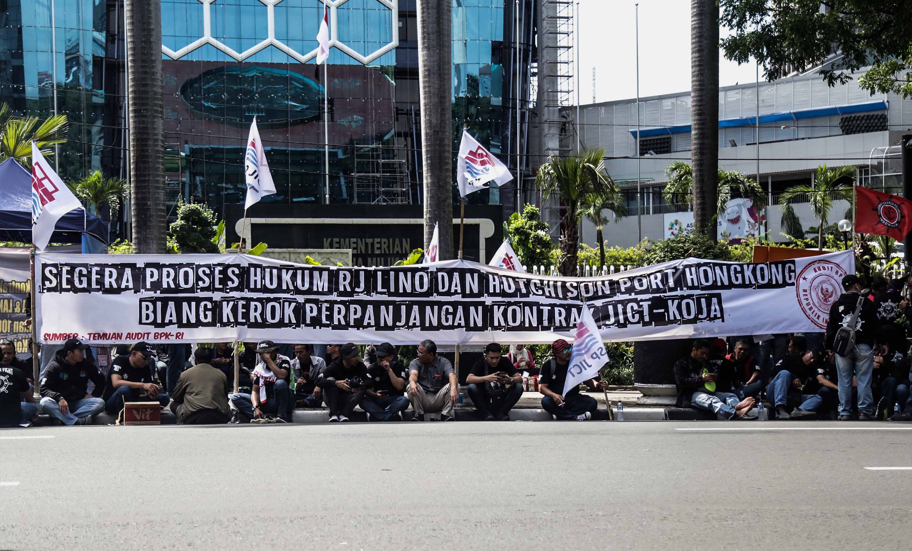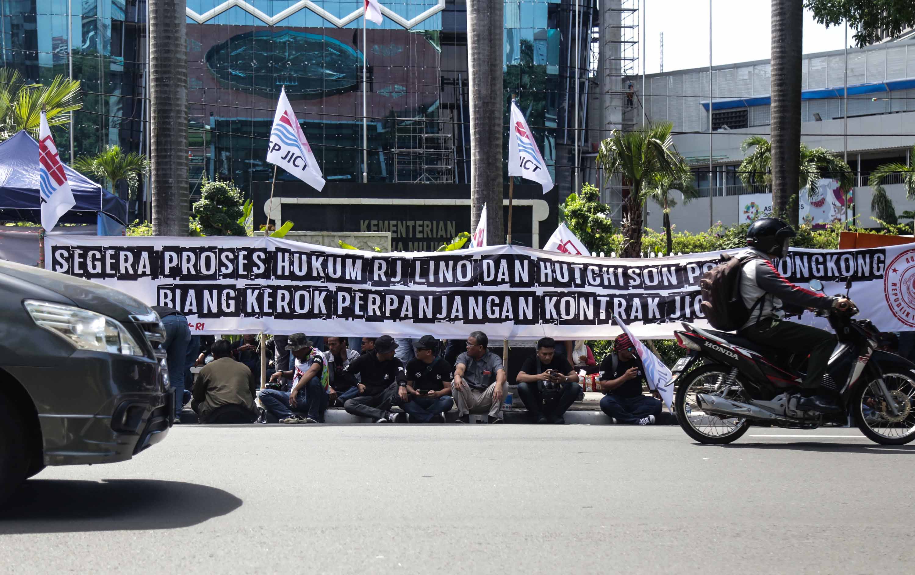 Puluhan anggota Serikat Pekerja Jakarta International Container Terminal (SP JICT) melakukan unjukrasa di depan gedung Kementrian BUMN, Jakarta, Senin (17/12). Dalam aksinya mereka mengkritisi kontrak pelabuhan petikemas terbesar di Indonesia JICT-Koja (2015-2038) kepada Hutchison Hong Kong yang terbukti melanggar Undang-undang tanpa izin konsensi pemerintah dalam hal ini Kementrian Perhubungan yang merugikan negara hampir Rp 6 trilyun. AKTUAL/Tino Oktaviano