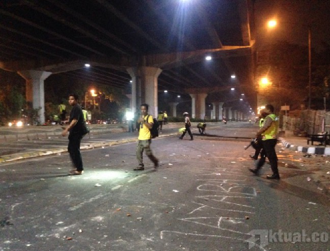 Anggota kepolisian dari Polsek Pulogadung yang diturunkan untuk membuka blokir jalan yang menyebabkan kemacetan panjang, mendapat perlawanan sengit dari puluhan mahasiswa yang berunjuk rasa sejak pukul 18.00Wib.