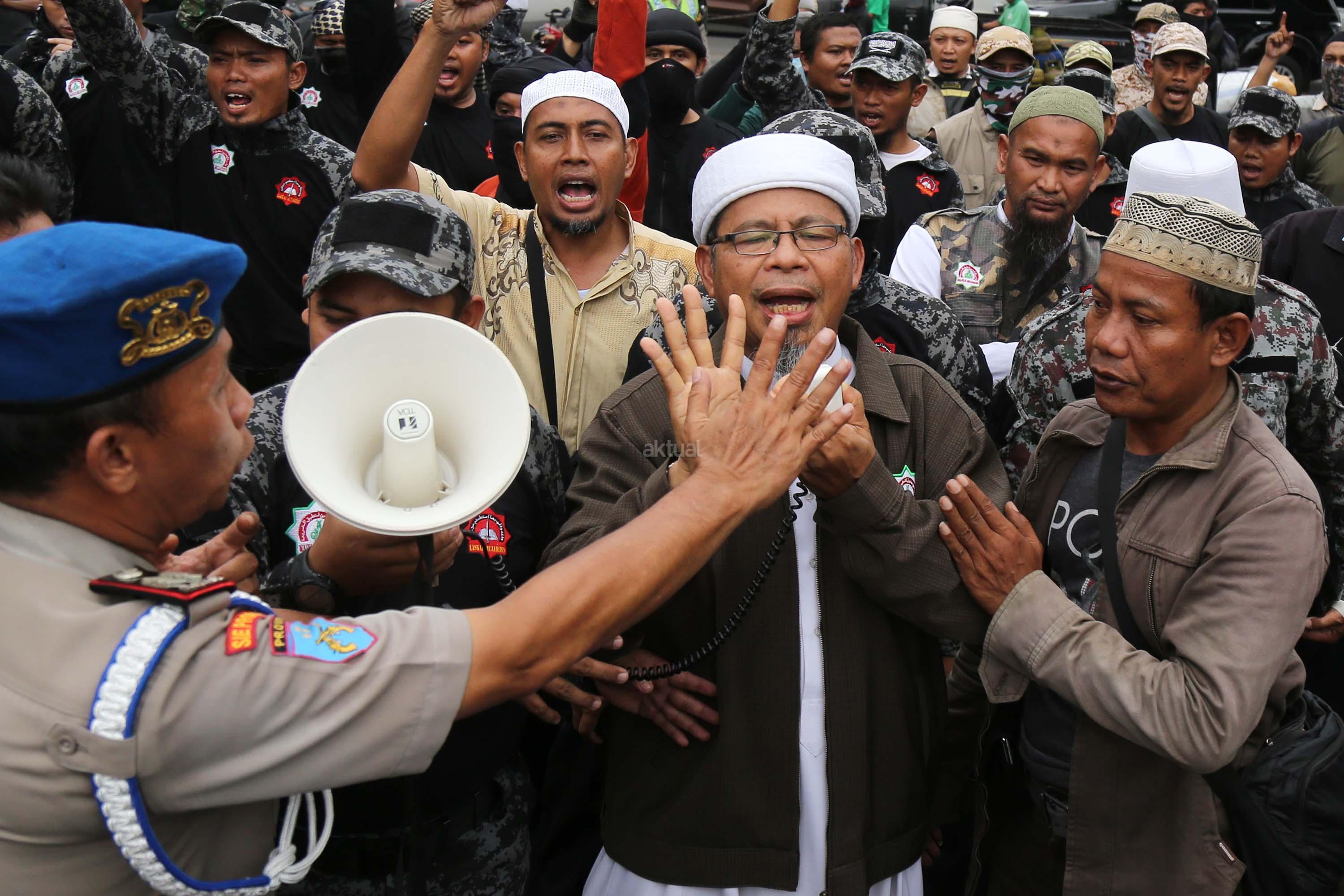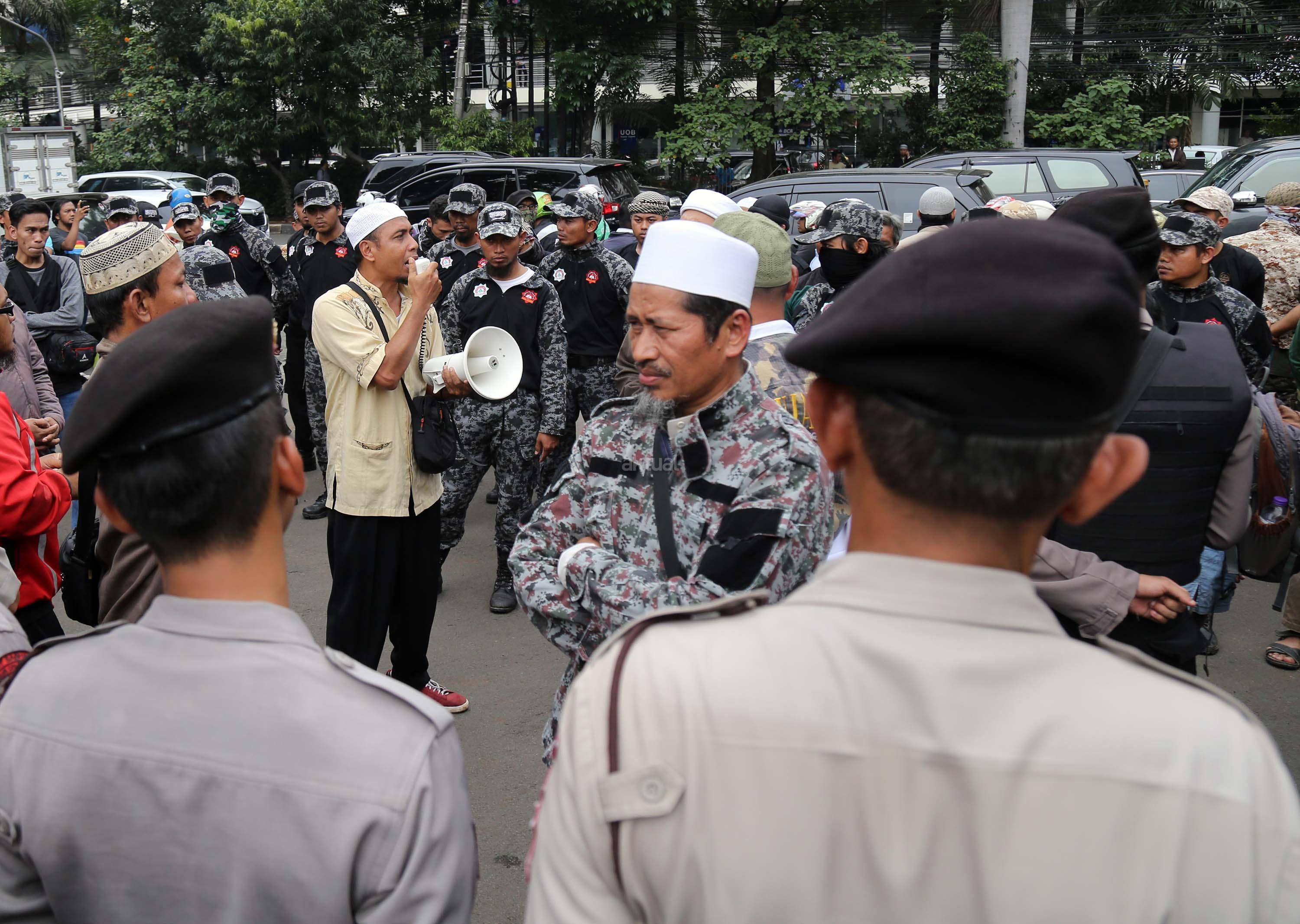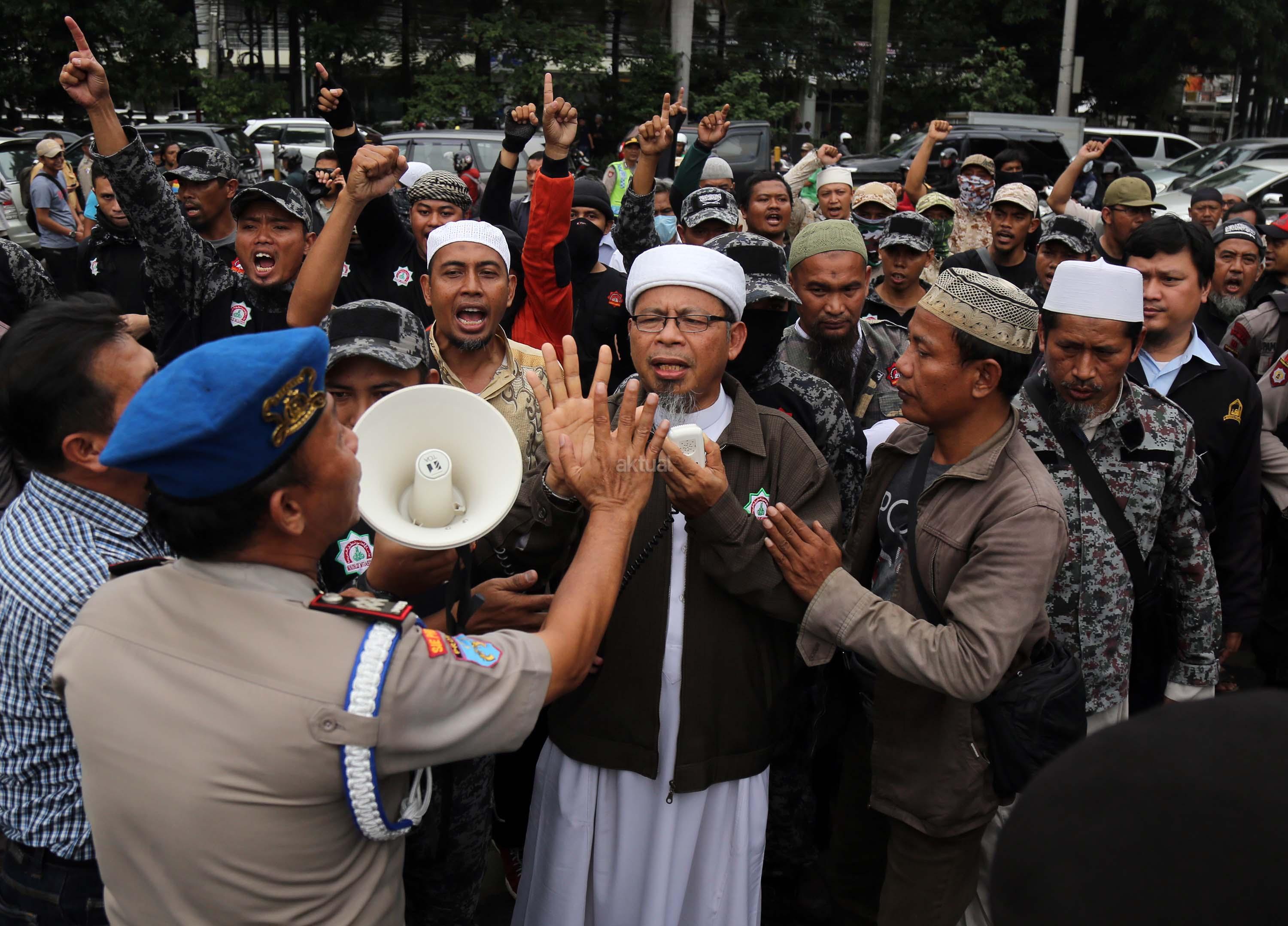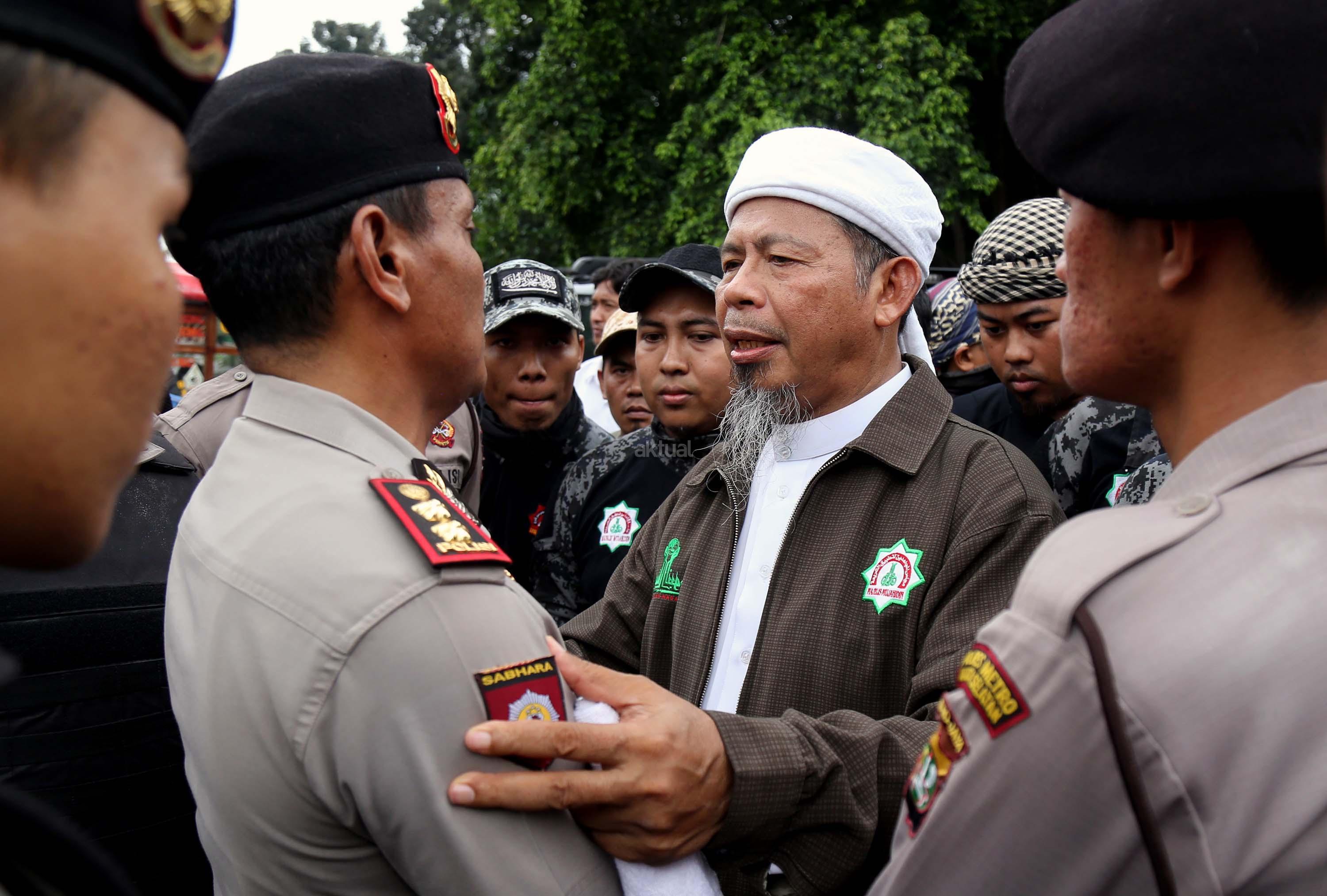 Ustad Abu Jibril dan kelompok Laskar Mujahid menggelar aksi di sekitar Balai Sudirman, Jakarta Selatan, Rabu (12/10). Massa menolak acara peringatan Asyura di Balai Sudirman yang digelar oleh mayoritas umat Syiah. Aktual/Tino Oktaviano
