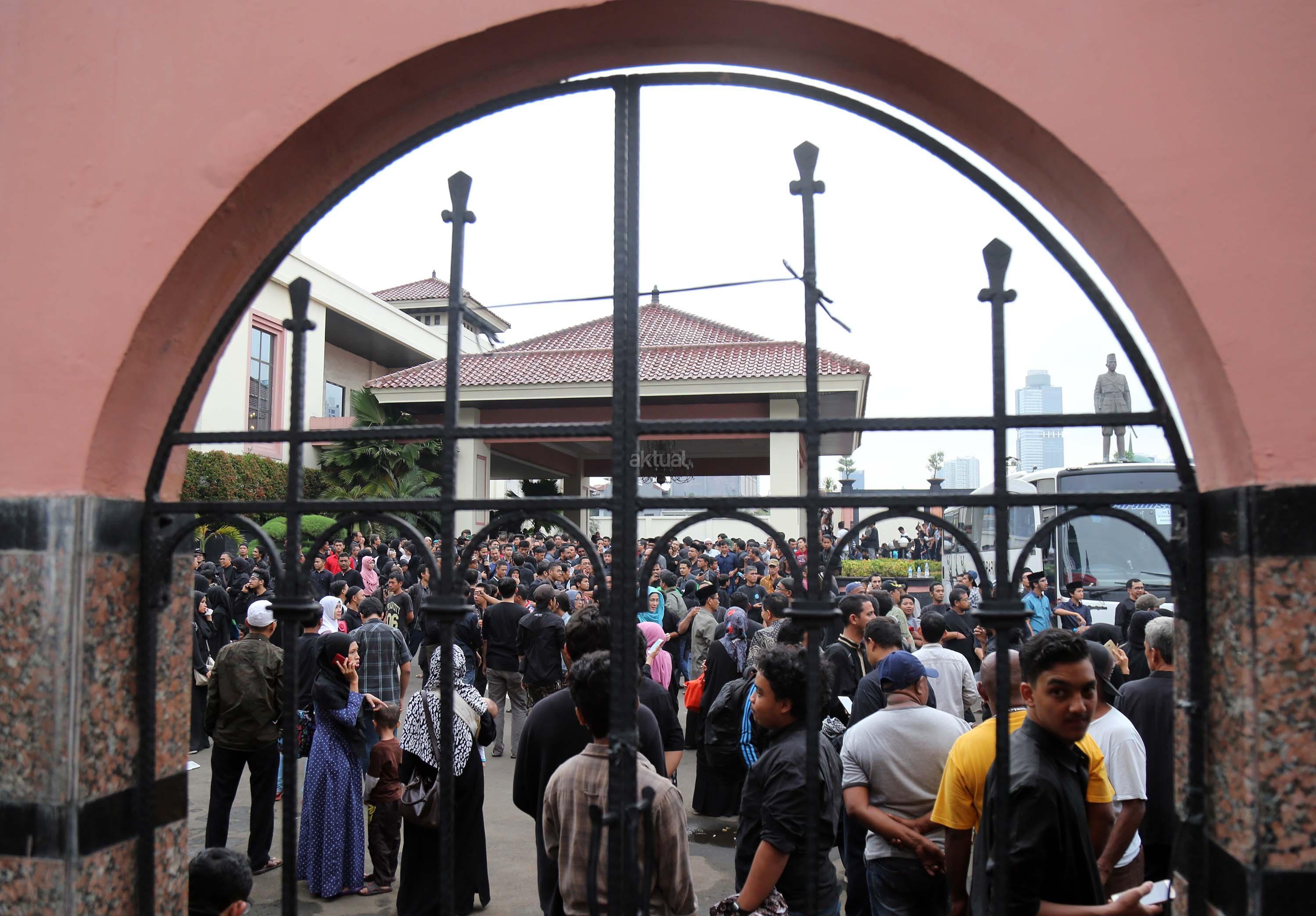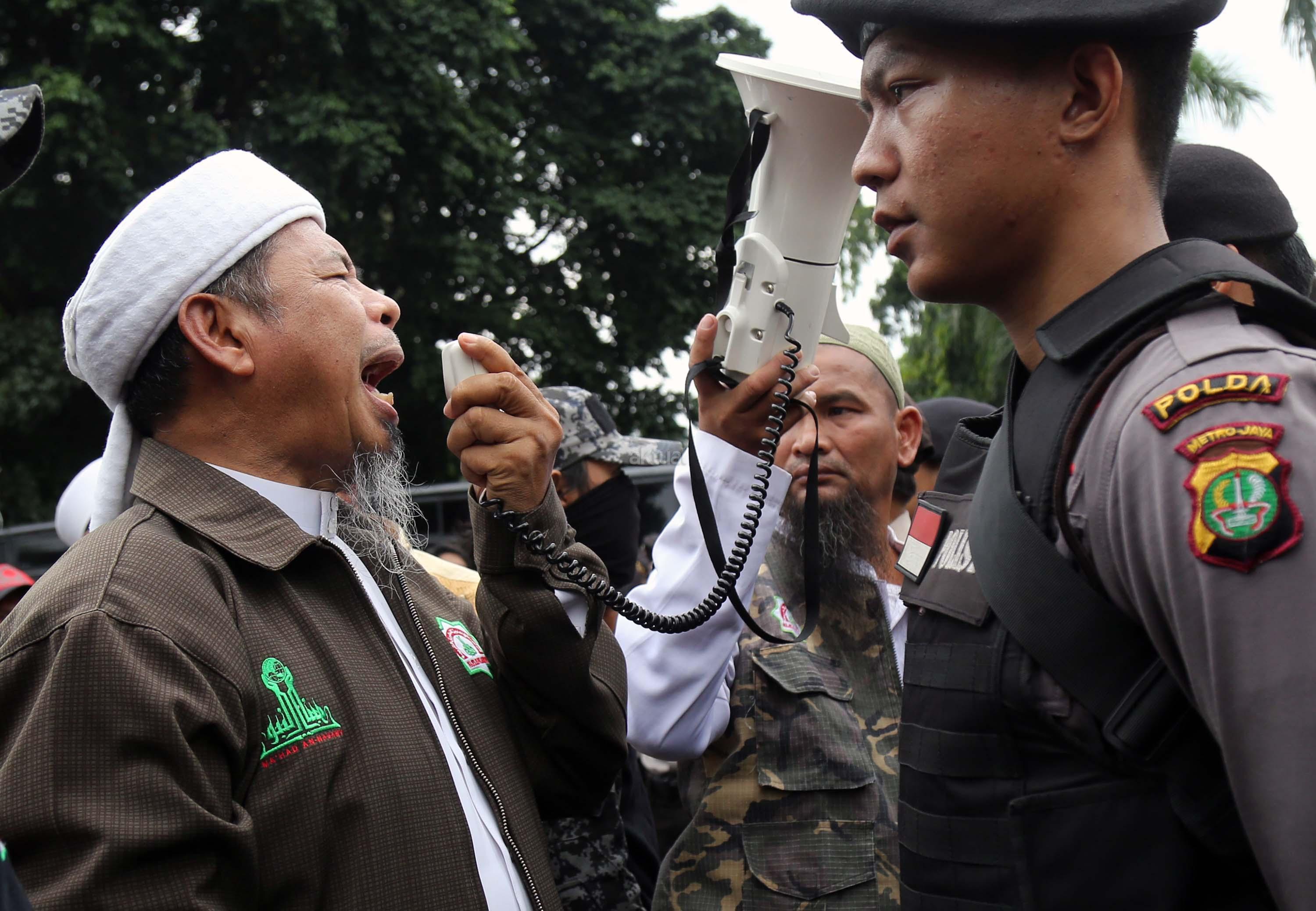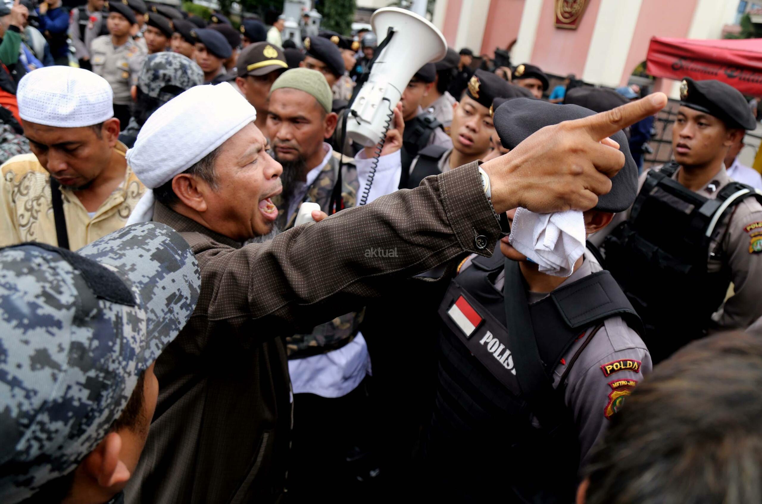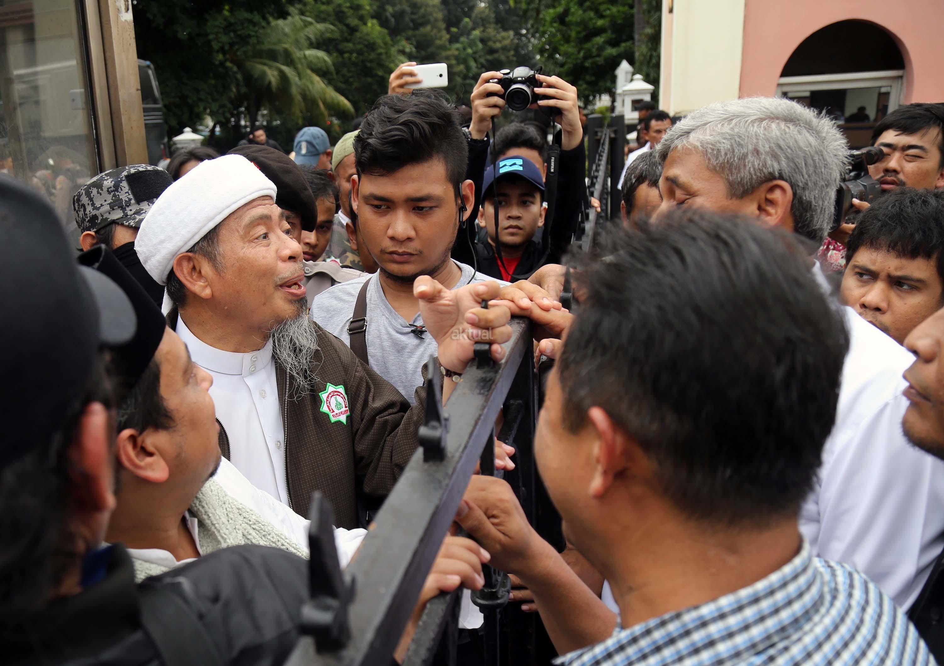 Ustad Abu Jibril dan kelompok Laskar Mujahid menggelar aksi di sekitar Balai Sudirman, Jakarta Selatan, Rabu (12/10). Massa menolak acara peringatan Asyura di Balai Sudirman yang digelar oleh mayoritas umat Syiah. Aktual/Tino Oktaviano