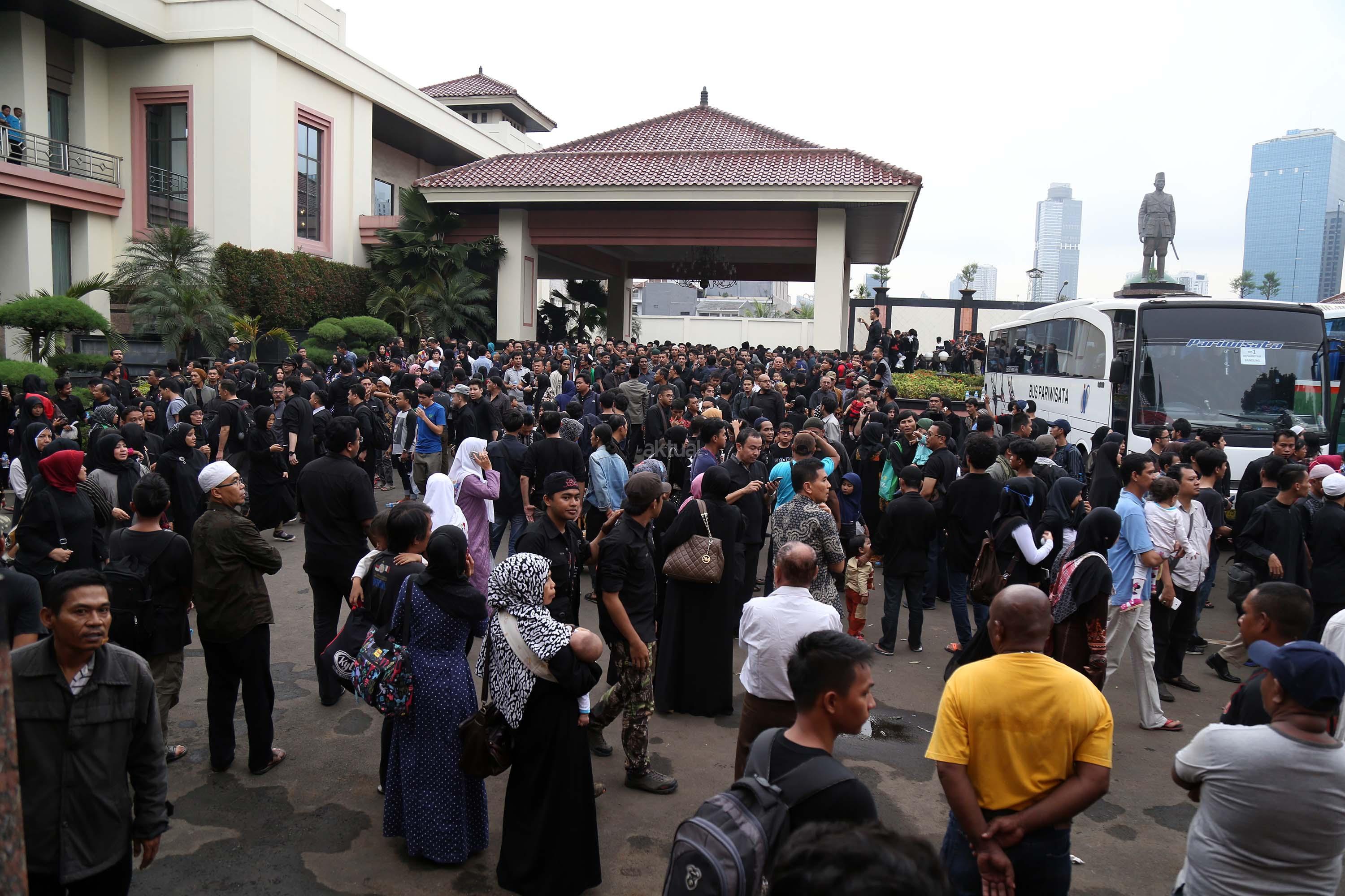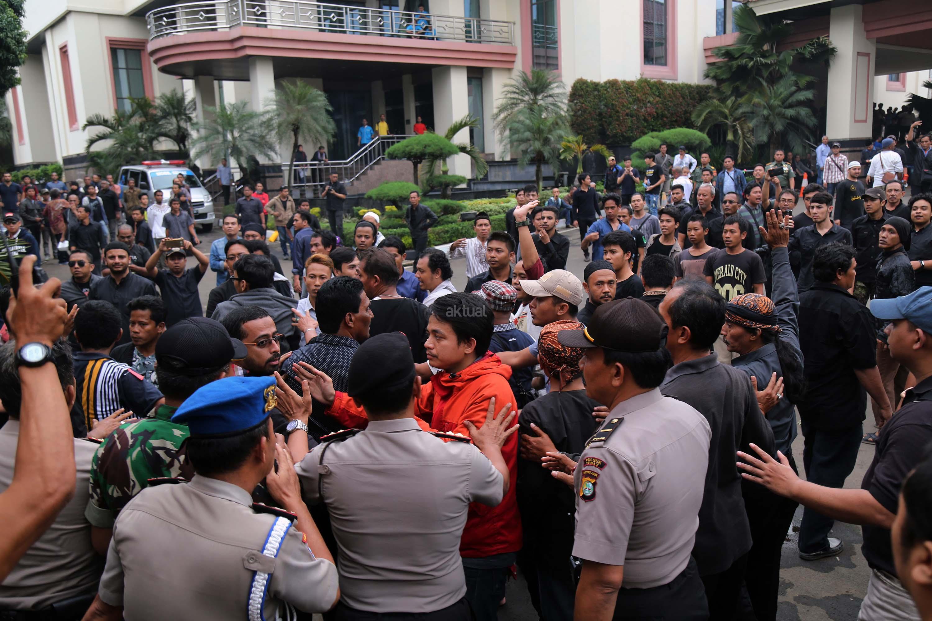 Massa dari kelompok Laskar Mujahid menggelar aksi di sekitar Balai Sudirman, Jakarta Selatan, Rabu (12/10). Massa menolak acara peringatan Asyura di Balai Sudirman yang digelar oleh mayoritas umat Syiah. Aktual/Tino Oktaviano