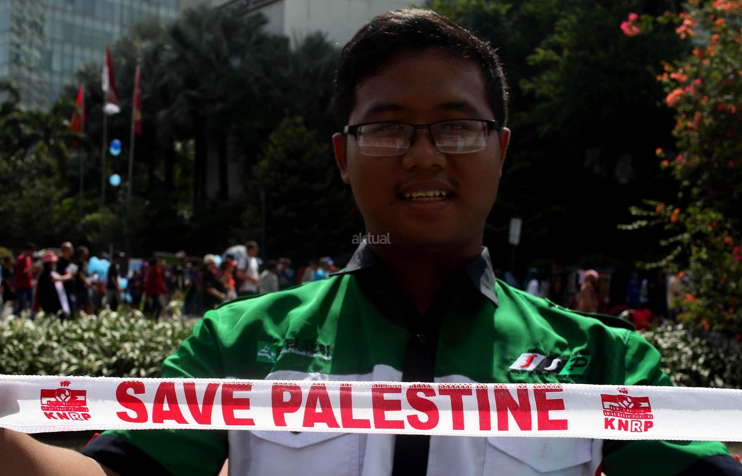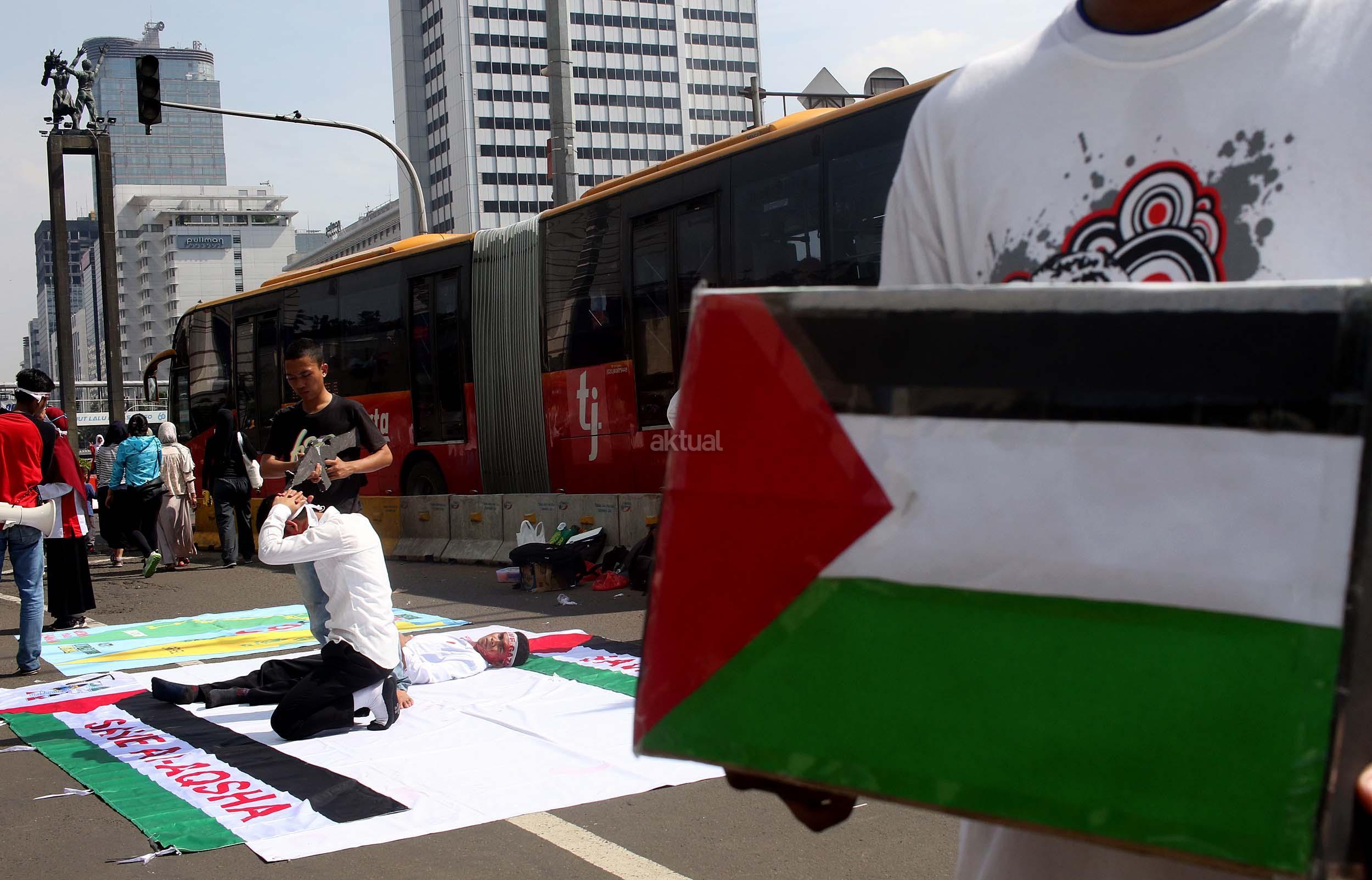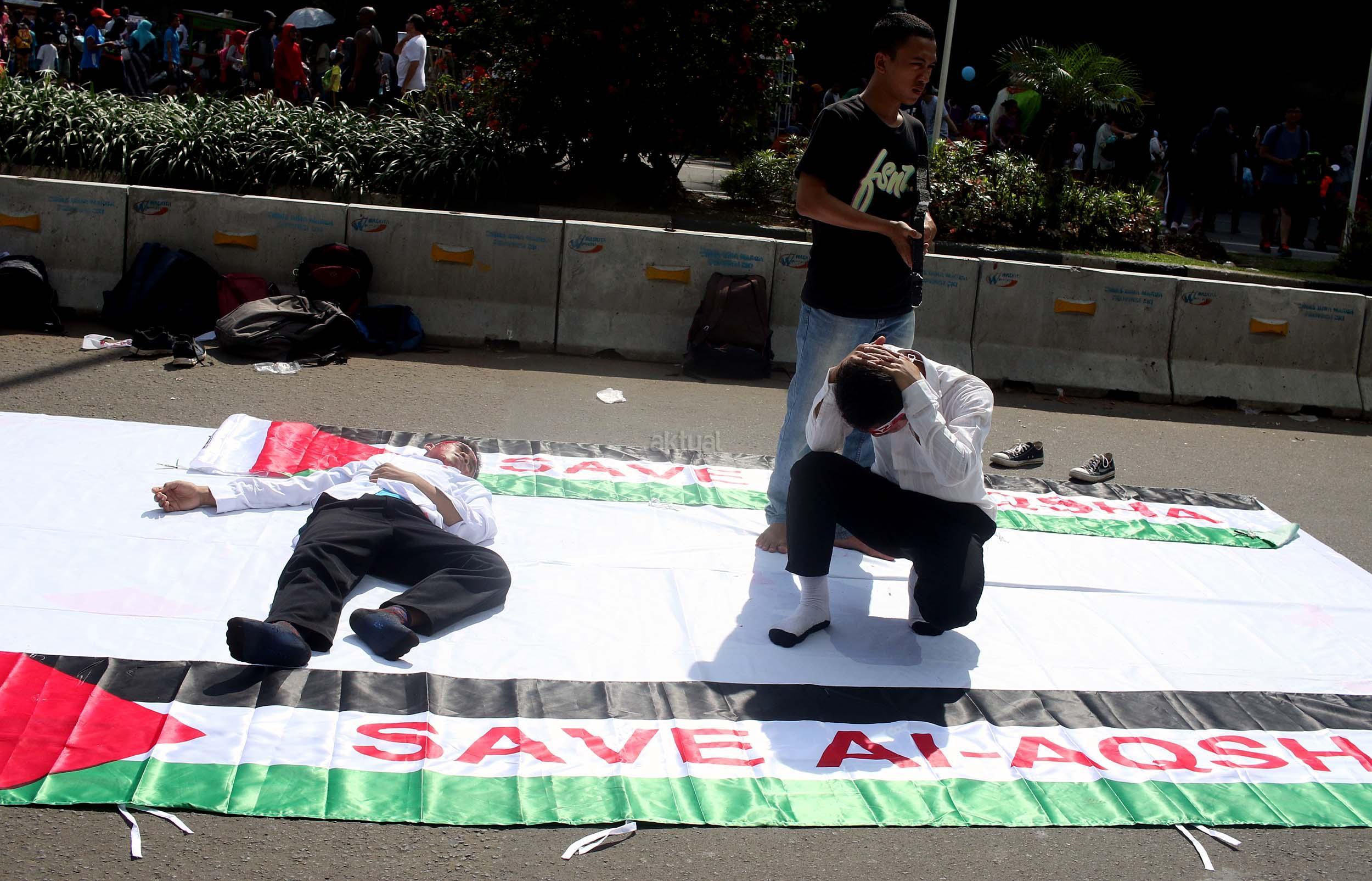 Sejumlah mahasiswa yang tergabung dalam Lembaga Dakwah Kampus (LDK) STEI SEBI melakukan aksi kampanye Palestina Menanti, Kemanangan Harga Mati di kawasan CFD, Jakarta, Minggu (30/10/2016). Dalam aksinya para mahasiswa memainkan teaterikal bagaimana kehidupan rakyat Palestina masih mengalami todongan senjata dan pengusiran paksa oleh pemerintahan Zionis Israel.