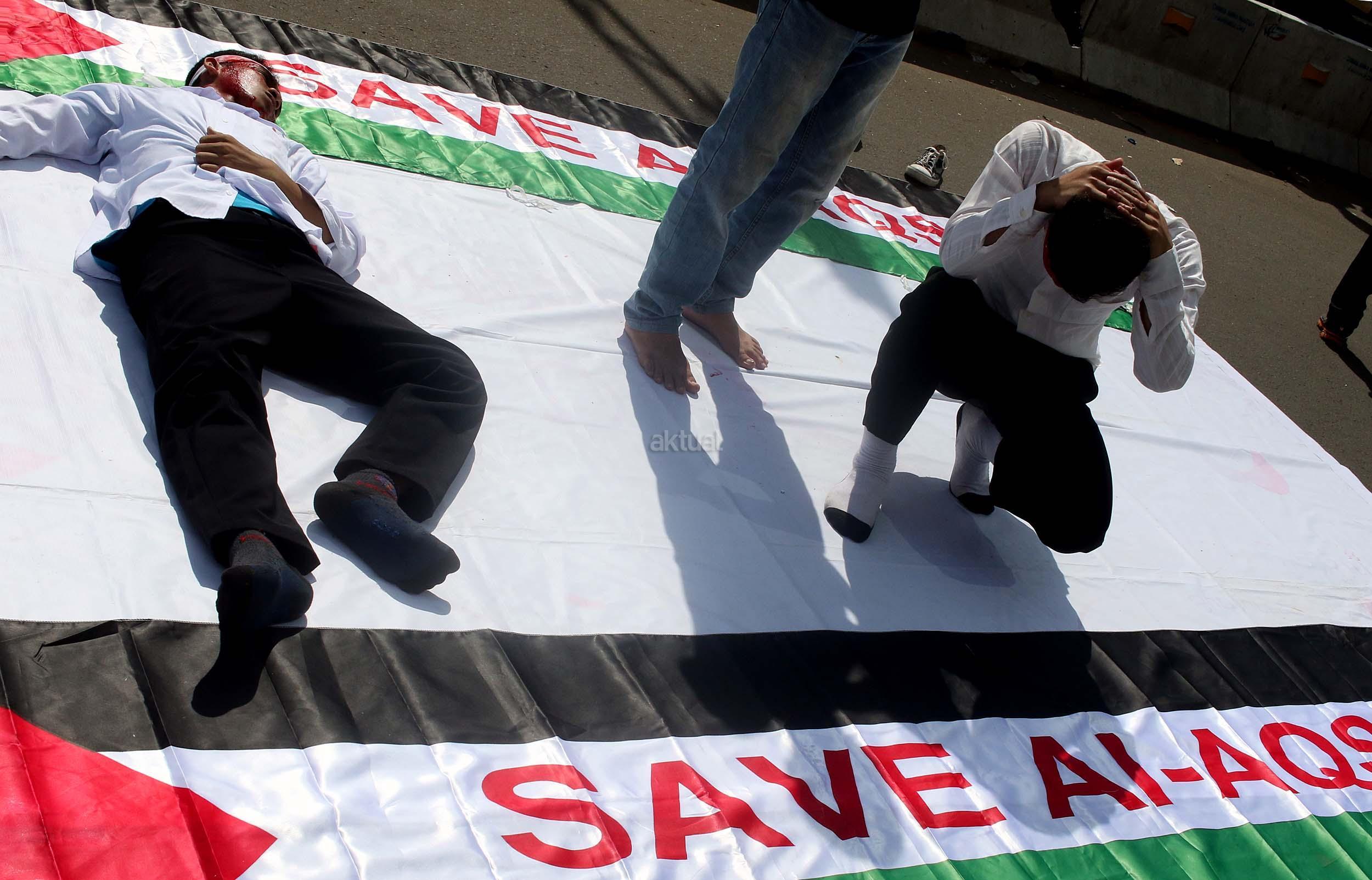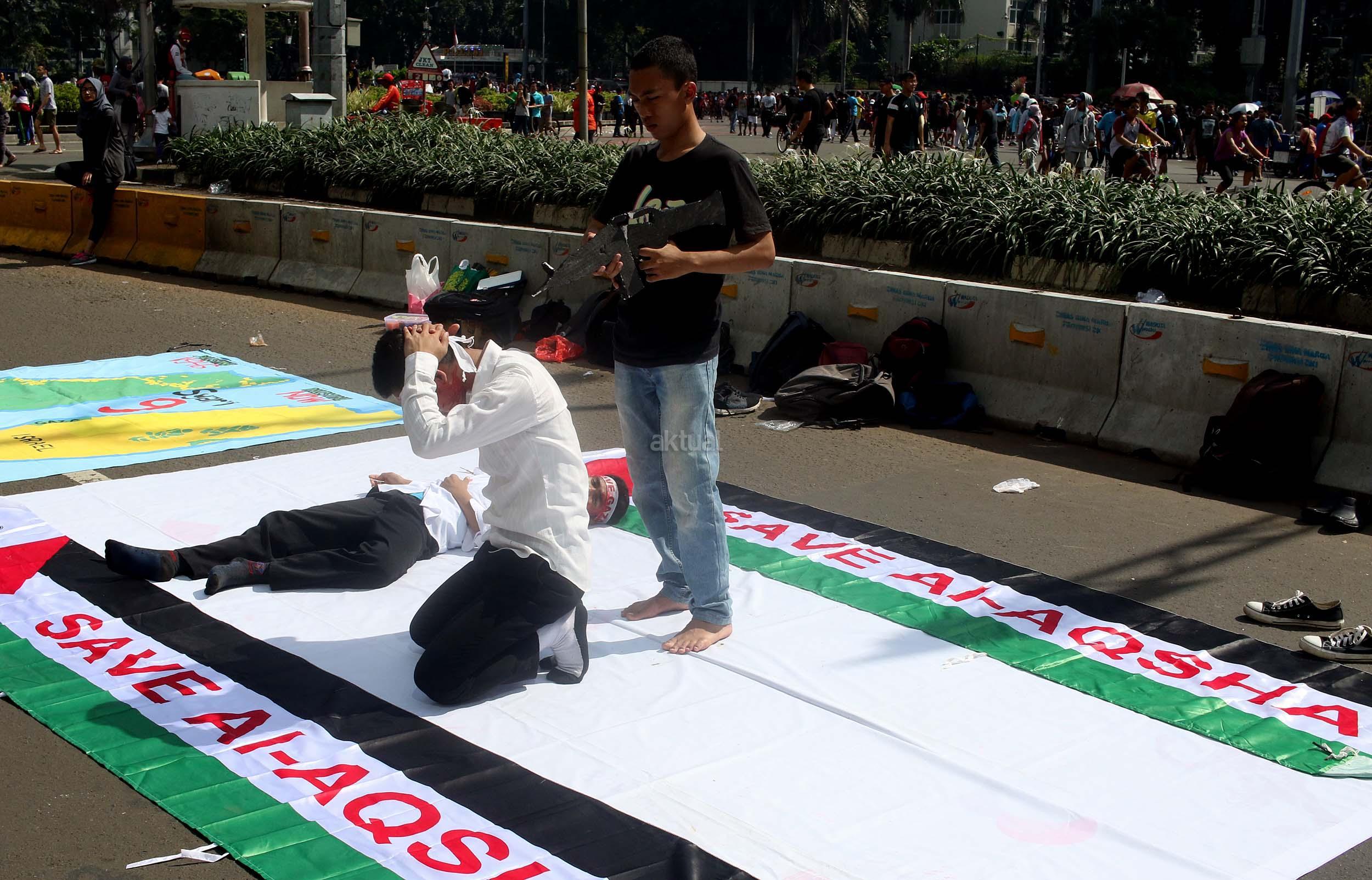 Sejumlah mahasiswa yang tergabung dalam Lembaga Dakwah Kampus (LDK) STEI SEBI melakukan aksi kampanye Palestina Menanti, Kemanangan Harga Mati di kawasan CFD, Jakarta, Minggu (30/10/2016). Dalam aksinya para mahasiswa memainkan teaterikal bagaimana kehidupan rakyat Palestina masih mengalami todongan senjata dan pengusiran paksa oleh pemerintahan Zionis Israel. AKTUAL/Munzir