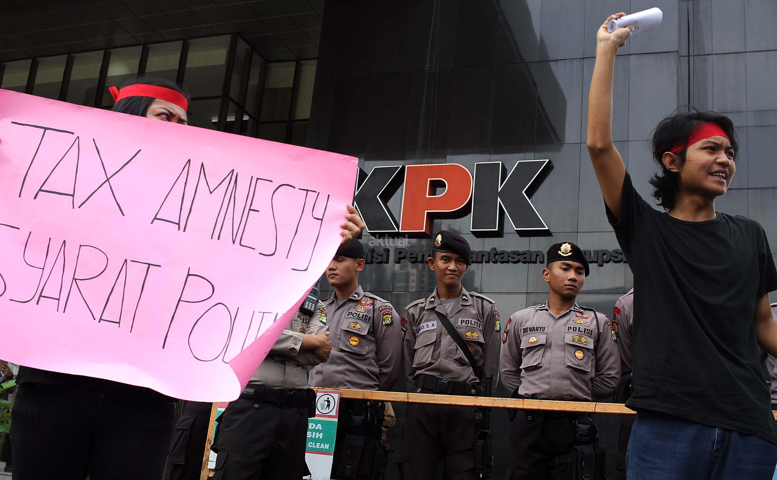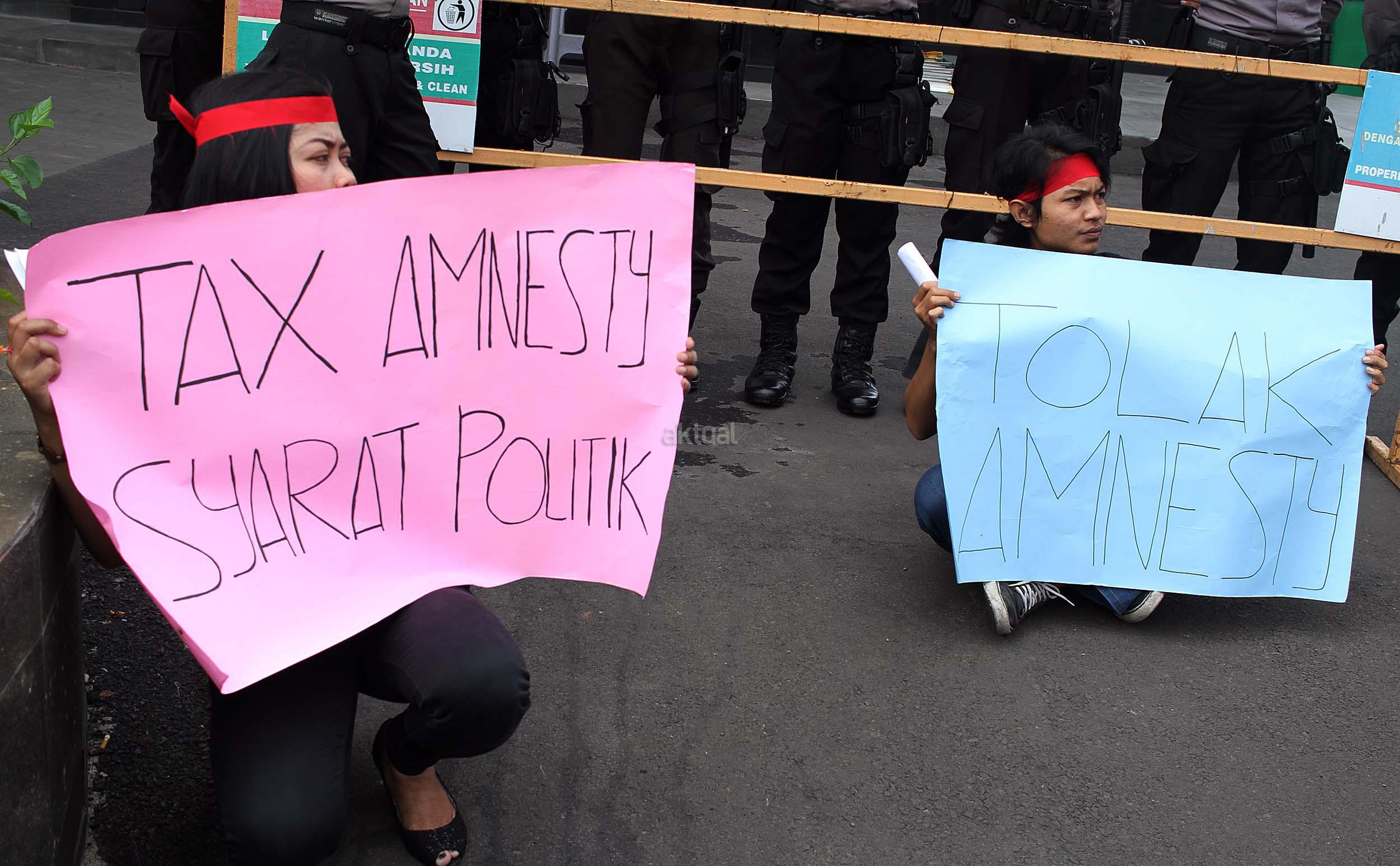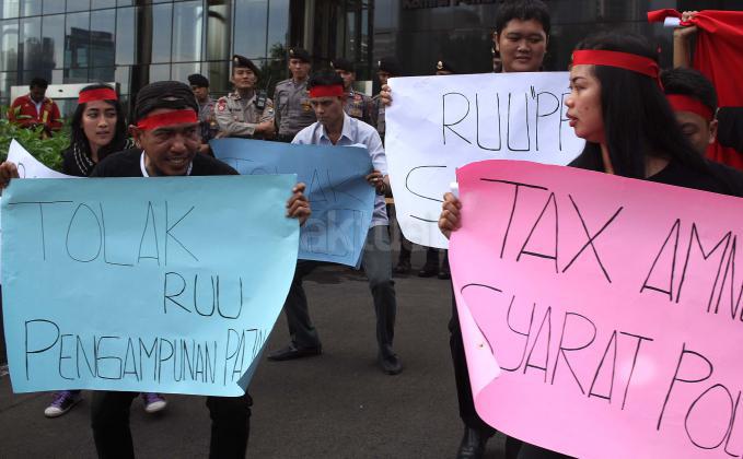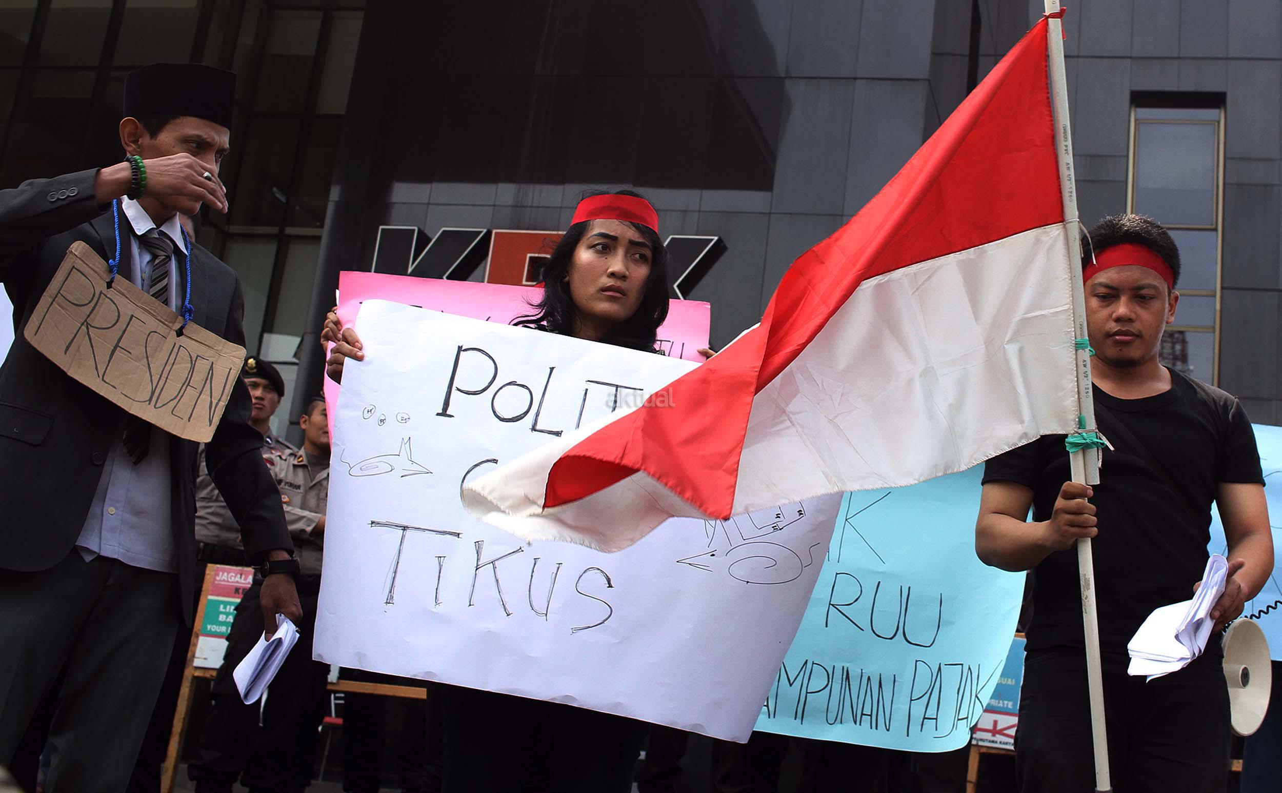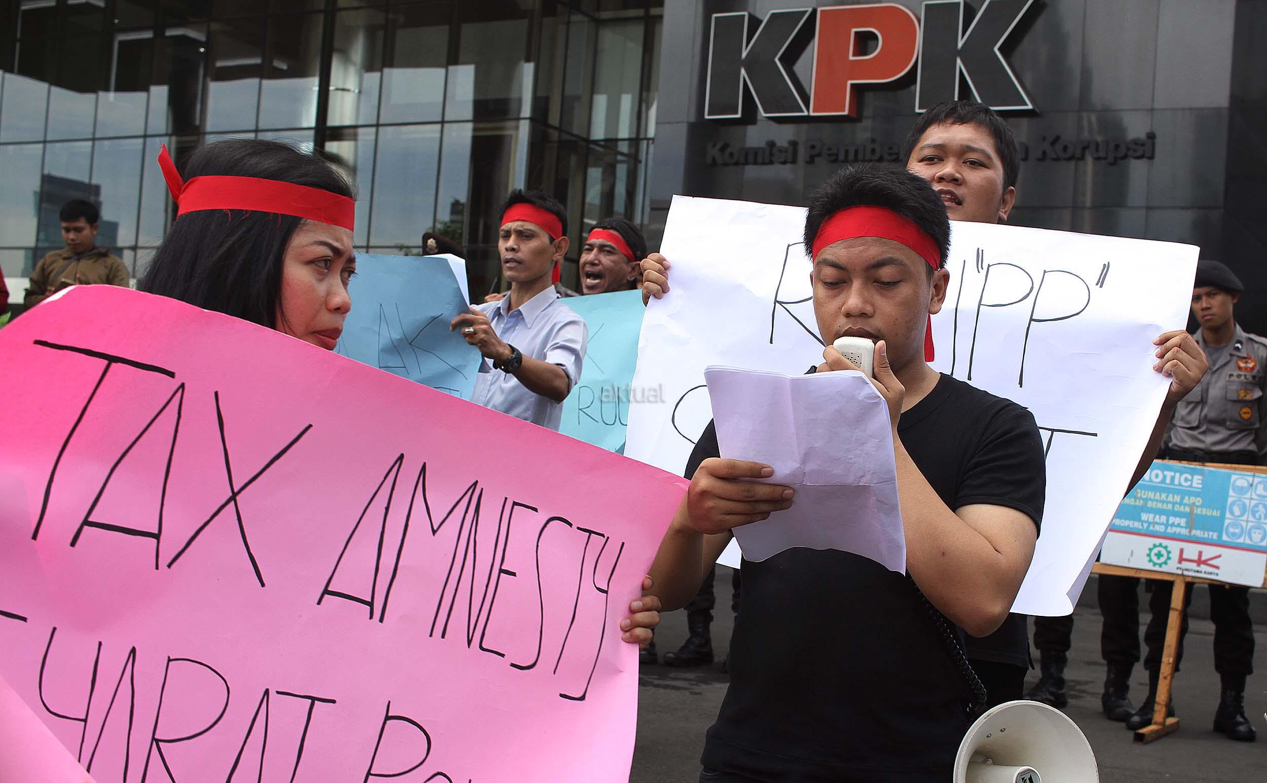 Puluhan aktivis FITRA menggelar aksi menolak pengampunan pengemplang pajak (Tax Amnesty) didepan Gedung KPK di Jakarta, Selasa (21/6/2016). FITRA juga meminta KPK mengawasi proses pembahasan UU Tax Amnesty yang dinilai rawan transaksional.