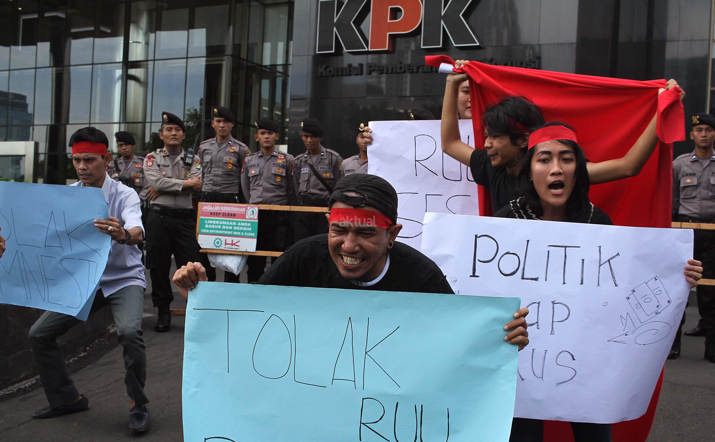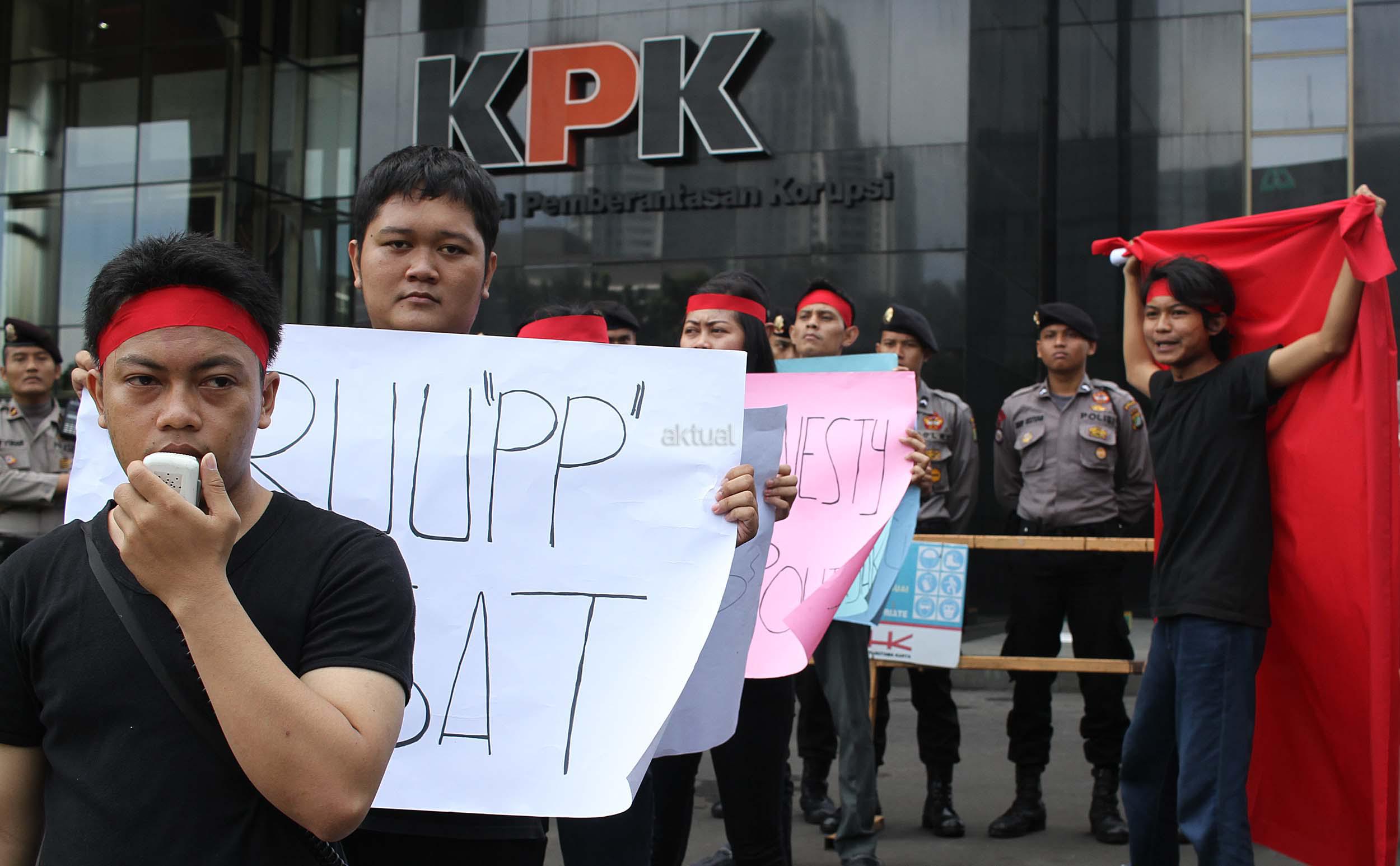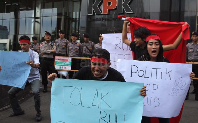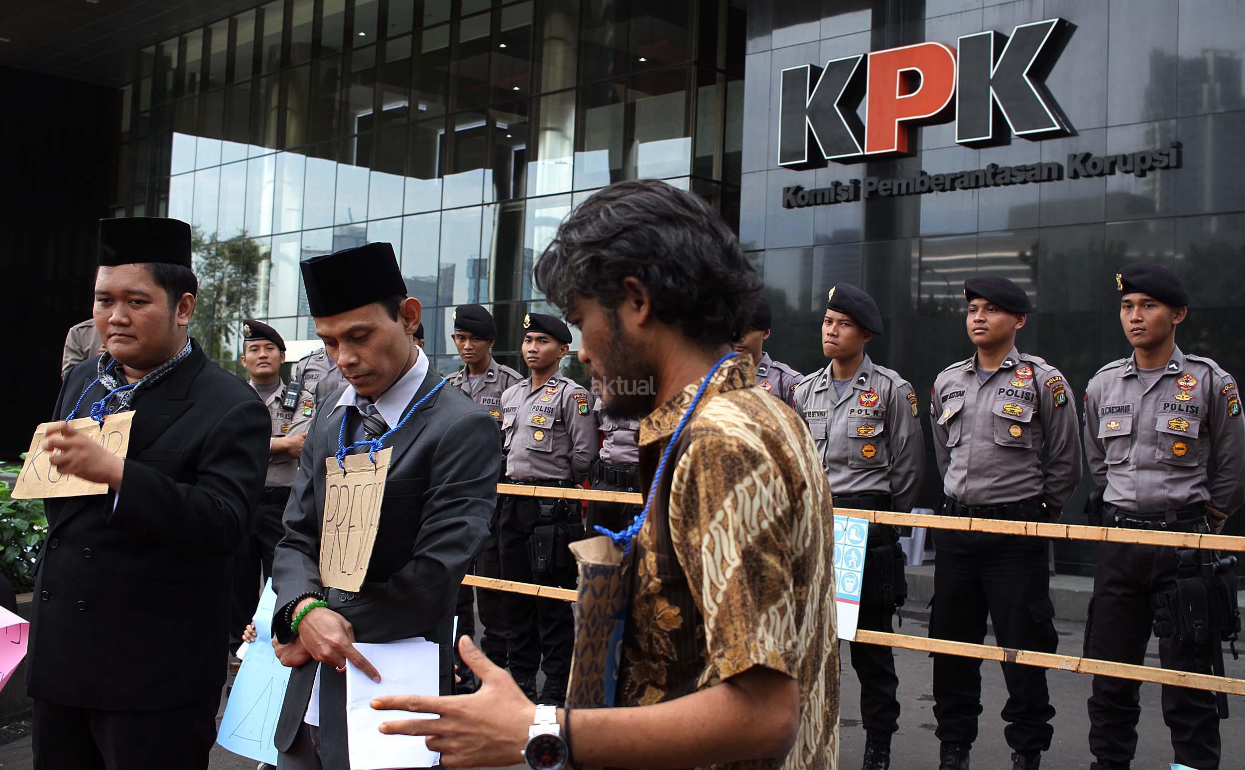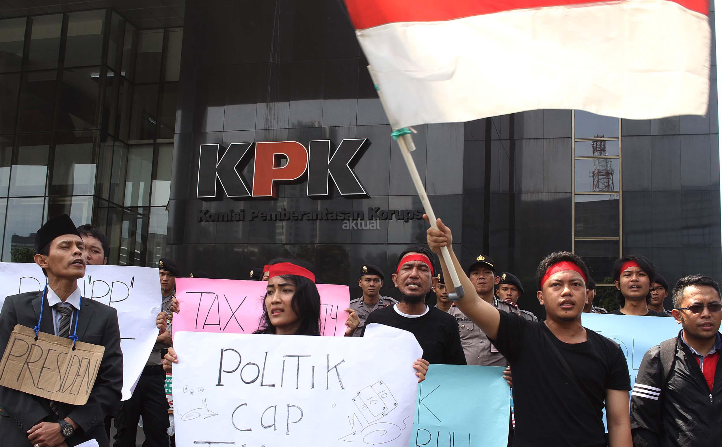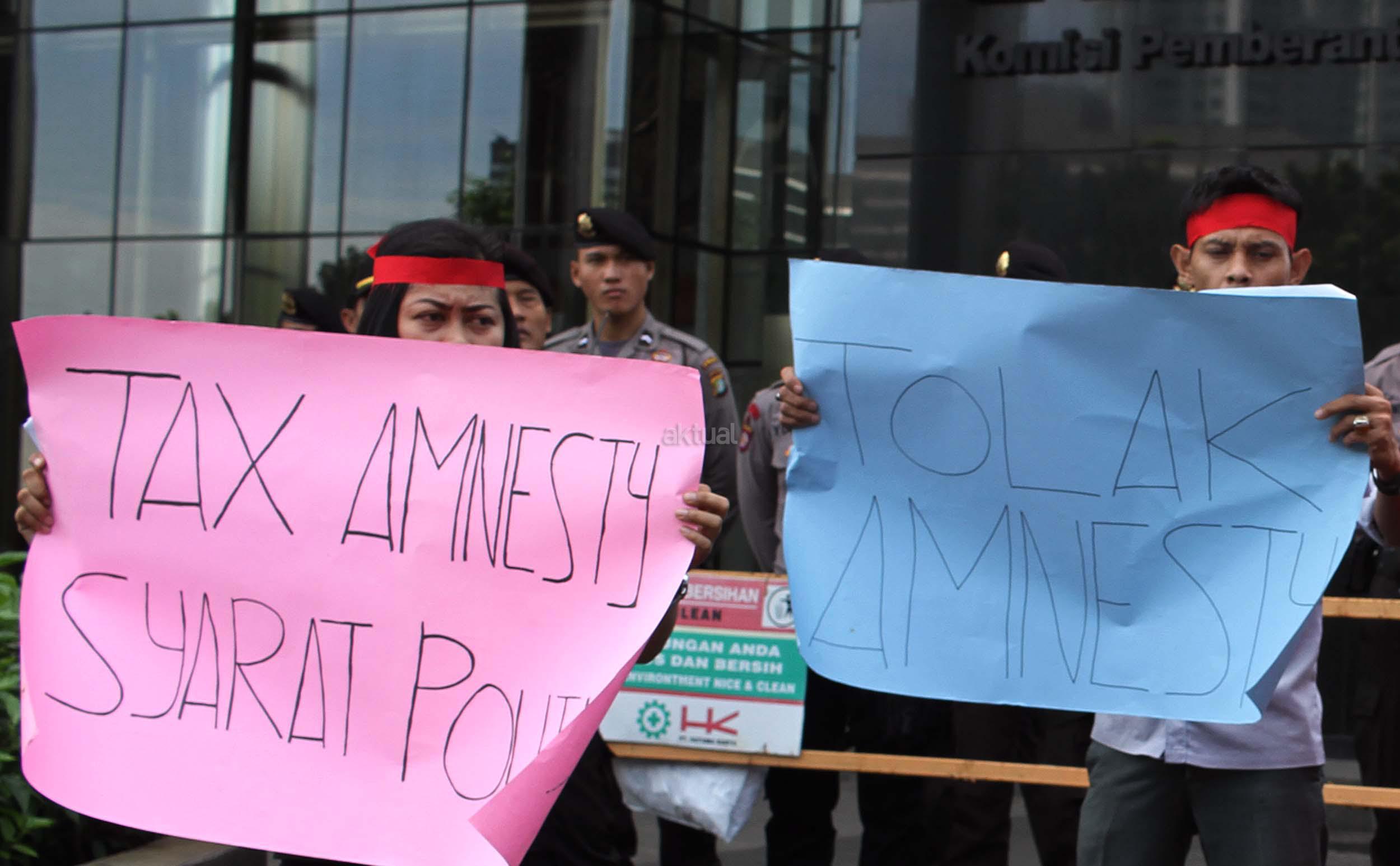 Puluhan aktivis FITRA menggelar aksi menolak pengampunan pengemplang pajak (Tax Amnesty) didepan Gedung KPK di Jakarta, Selasa (21/6/2016). FITRA juga meminta KPK mengawasi proses pembahasan UU Tax Amnesty yang dinilai rawan transaksional.