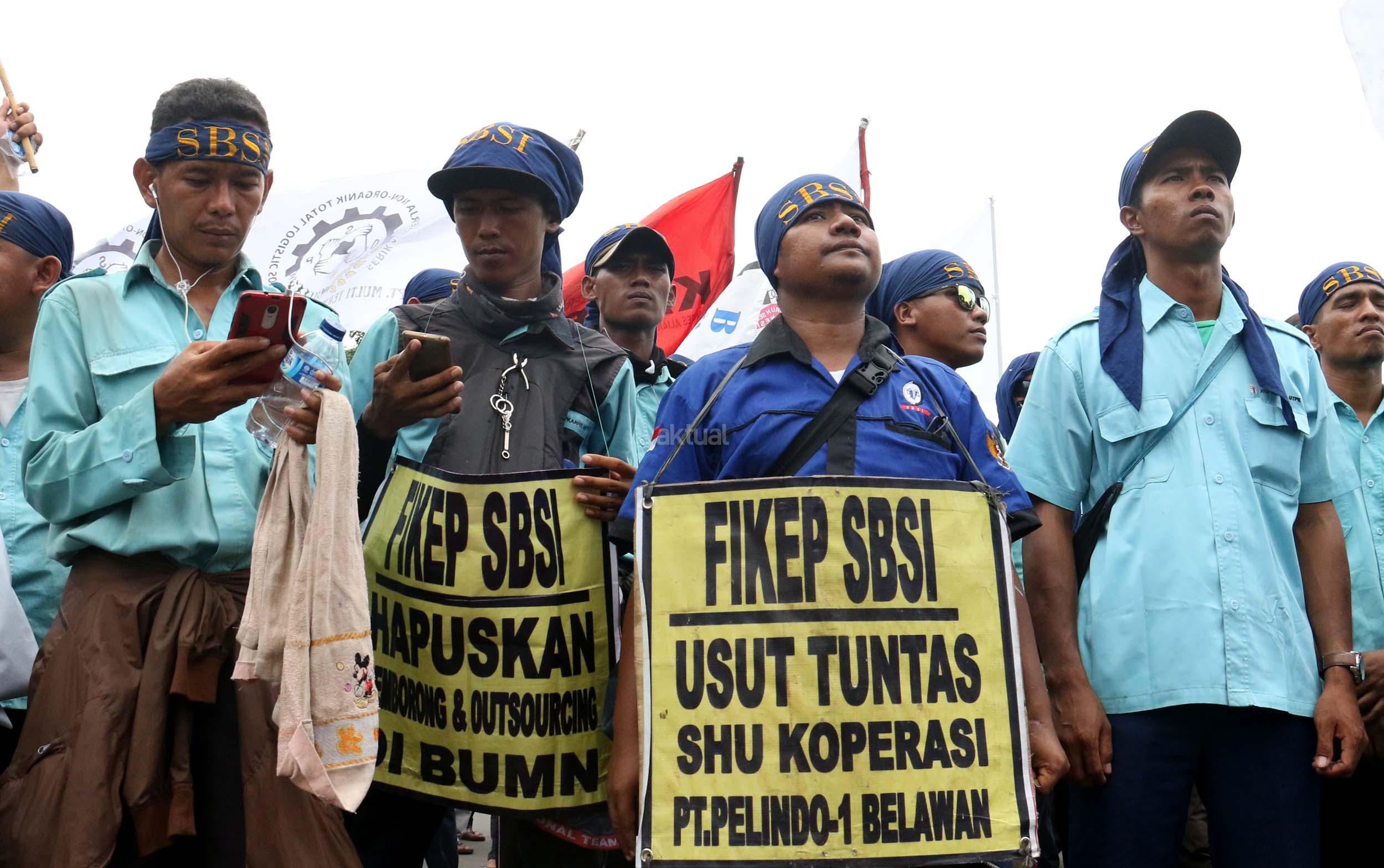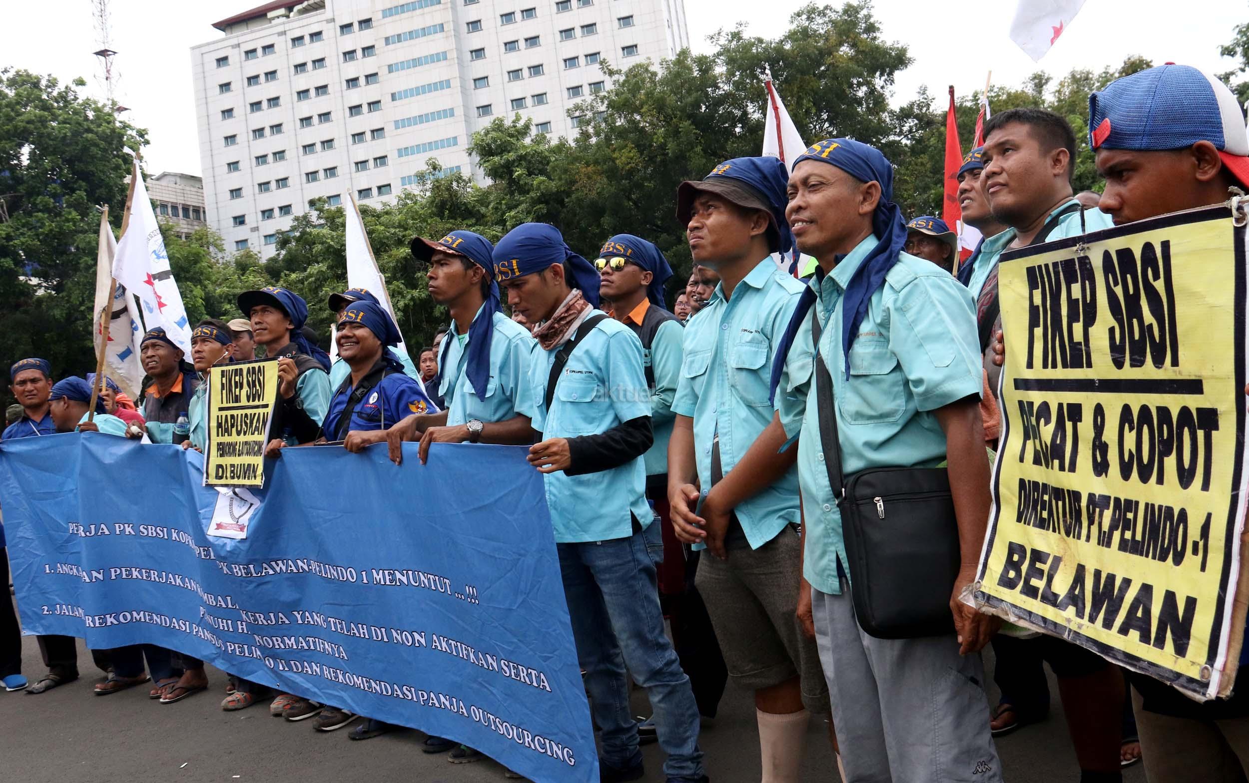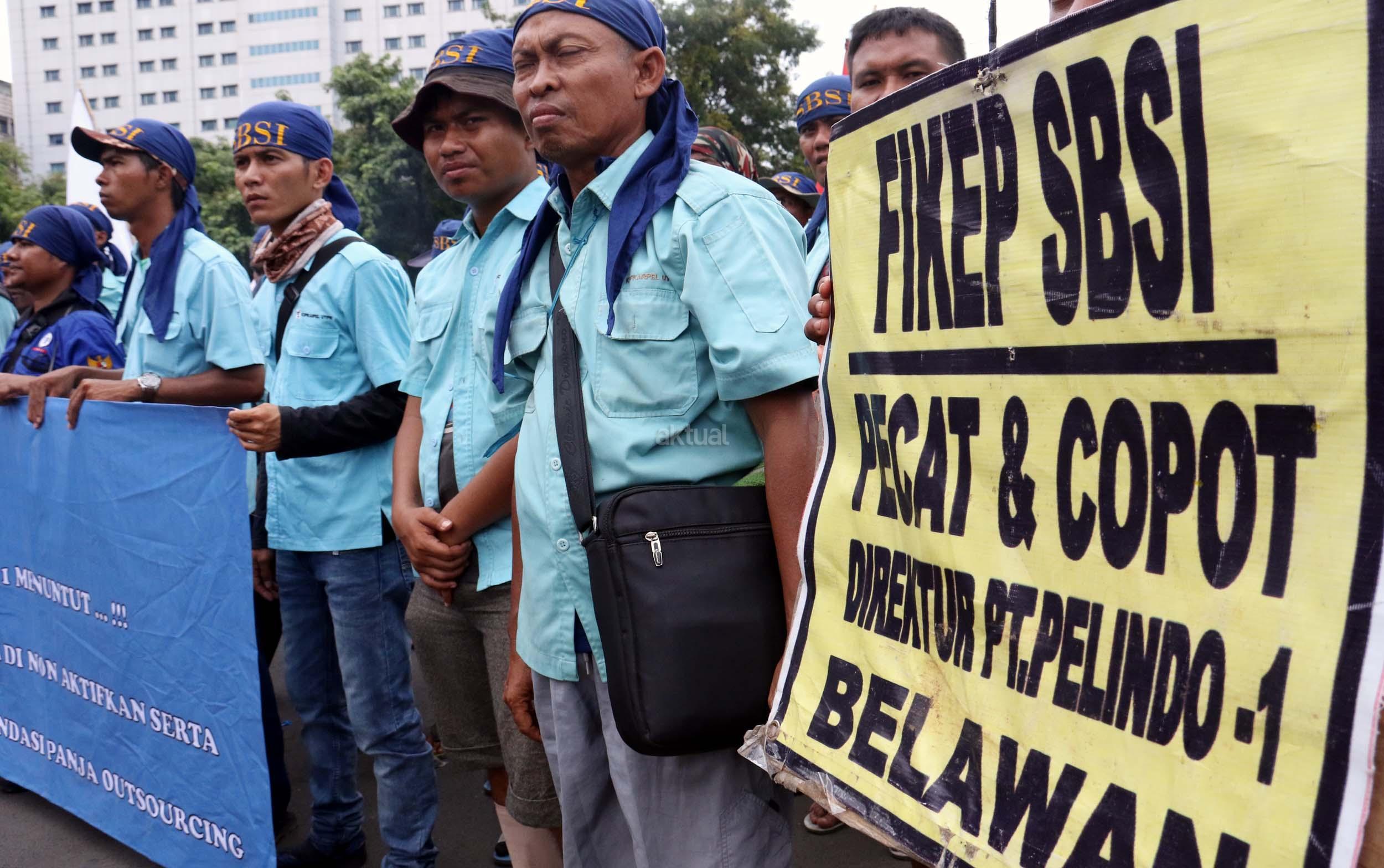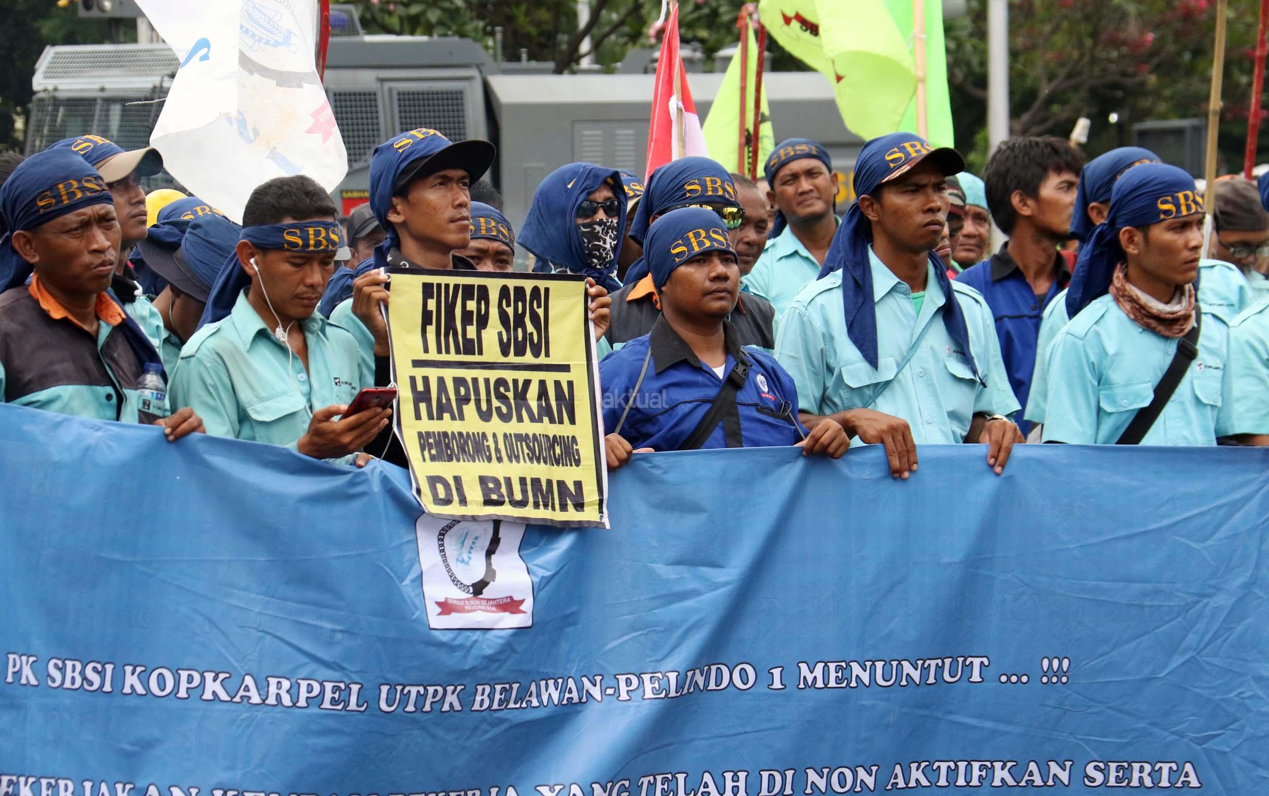 Ratusan pekerjan pelabuhan ang terdiri dari berbagai elemen buruh melakukan aksi unjukrasa di depan Istana Merdeka, Jakarta, Senin (27/2/2017). Dalam aksinya mereka berharap agar Presiden Joko Widodo dapat memastikan ditegakannya aturan ketenagakerjaan dan memastikan pelaksanaan pelabuhan yang profesional bagi kemajuan negeri. AKTUAL/Munzir