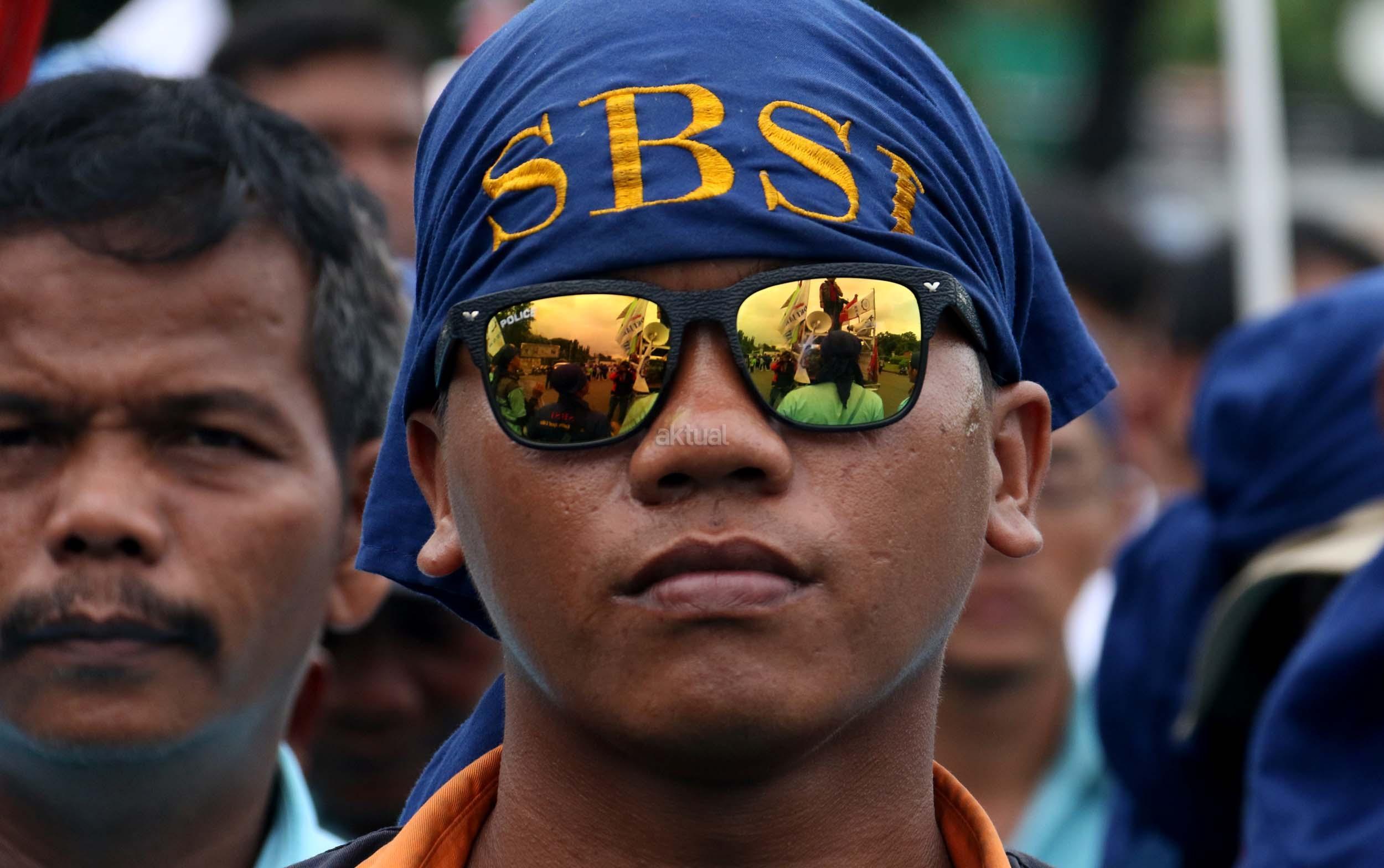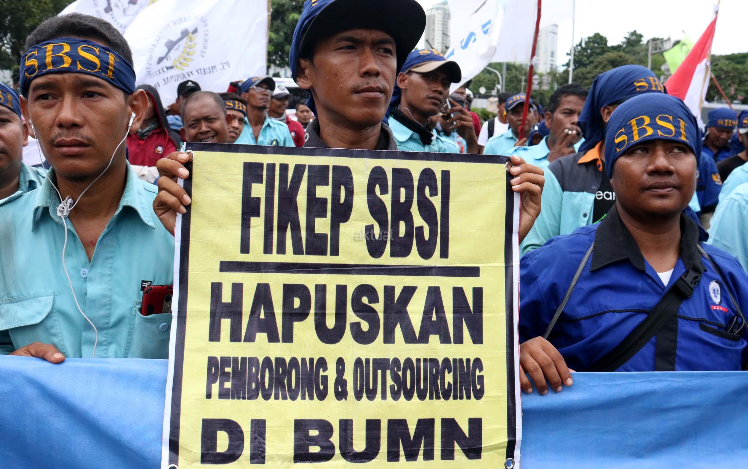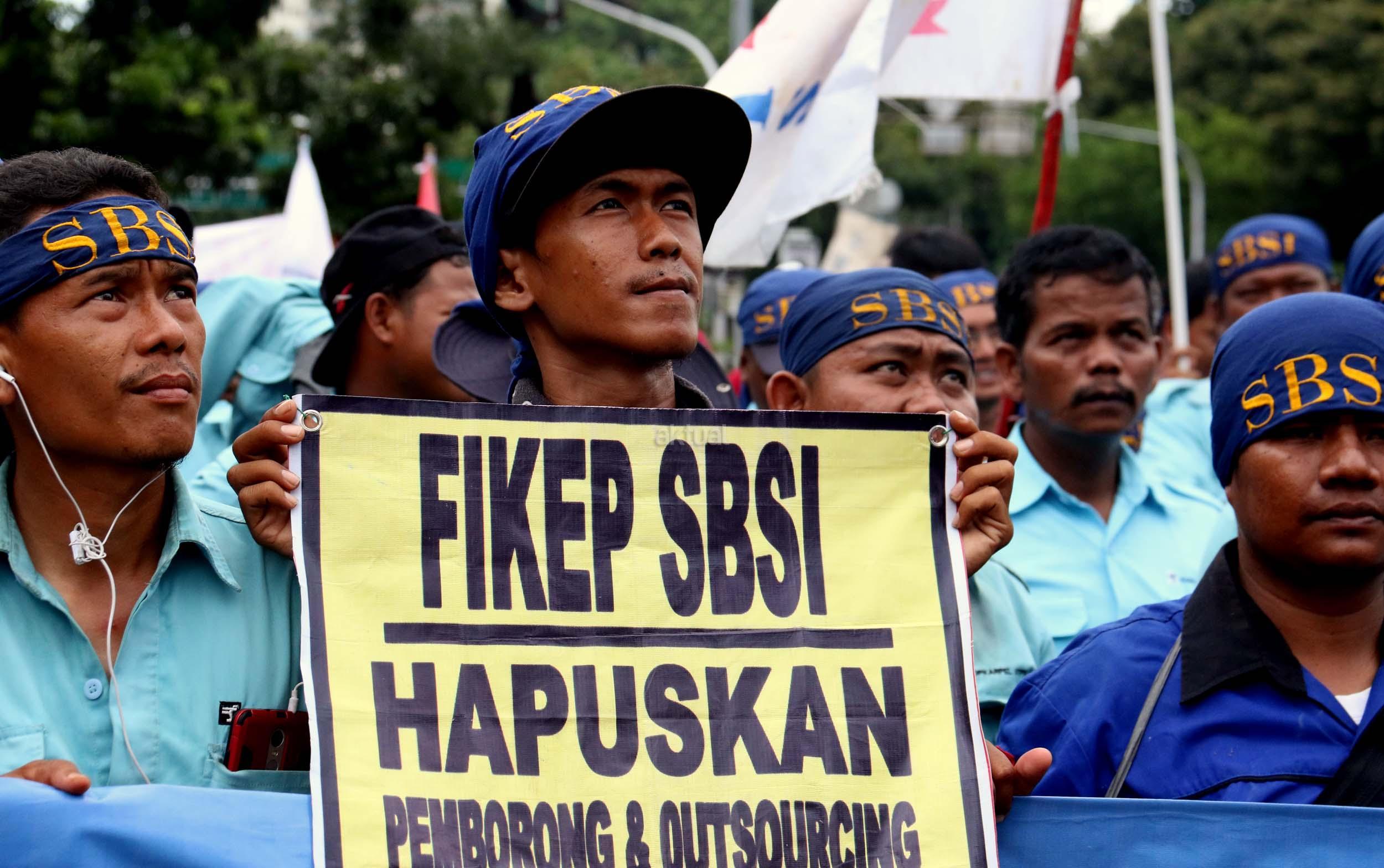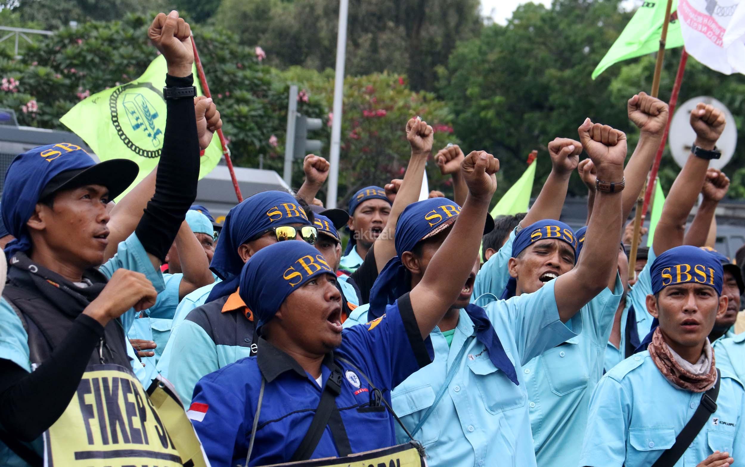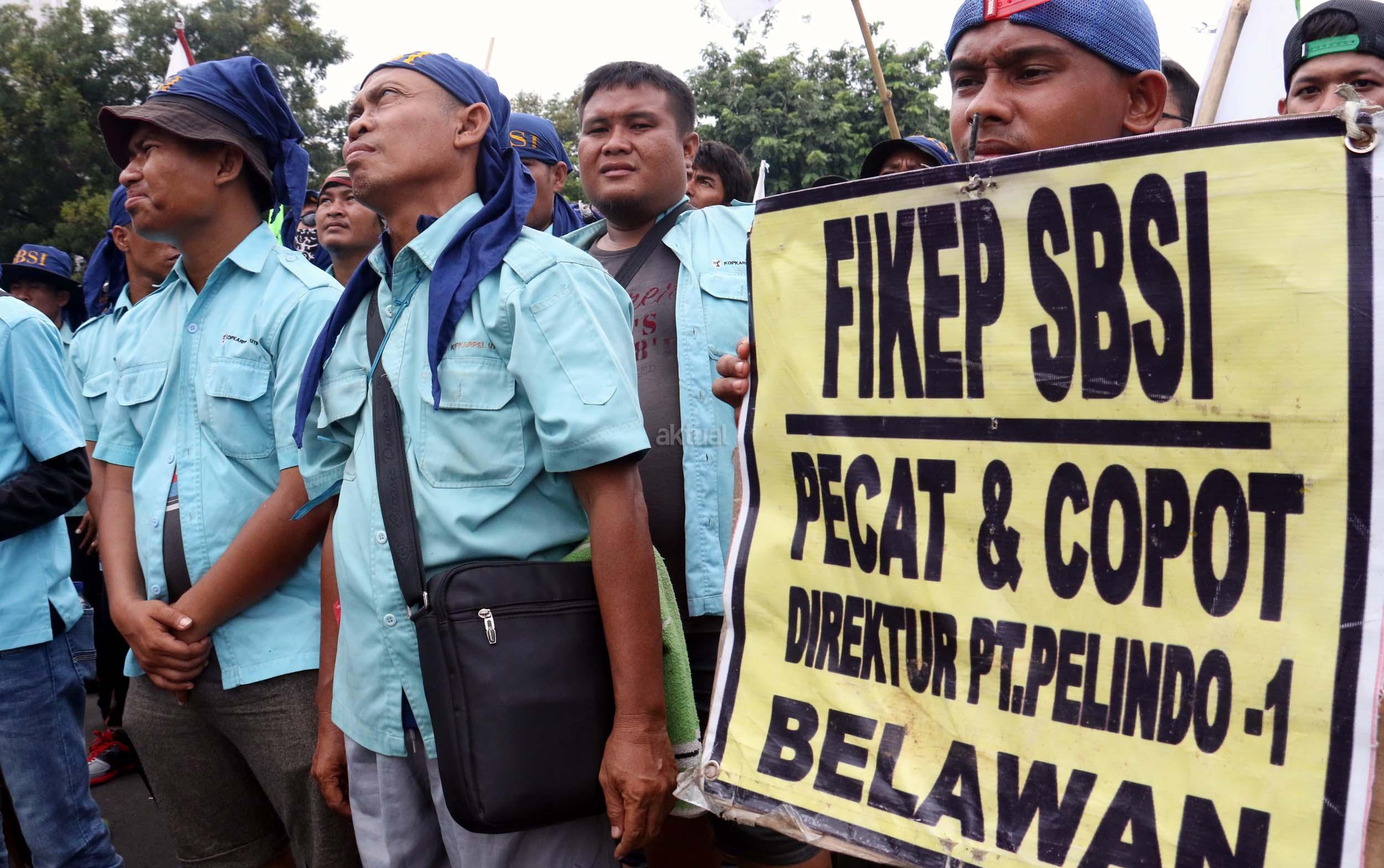 Ratusan pekerjan pelabuhan ang terdiri dari berbagai elemen buruh melakukan aksi unjukrasa di depan Istana Merdeka, Jakarta, Senin (27/2/2017). Dalam aksinya mereka berharap agar Presiden Joko Widodo dapat memastikan ditegakannya aturan ketenagakerjaan dan memastikan pelaksanaan pelabuhan yang profesional bagi kemajuan negeri. AKTUAL/Munzir