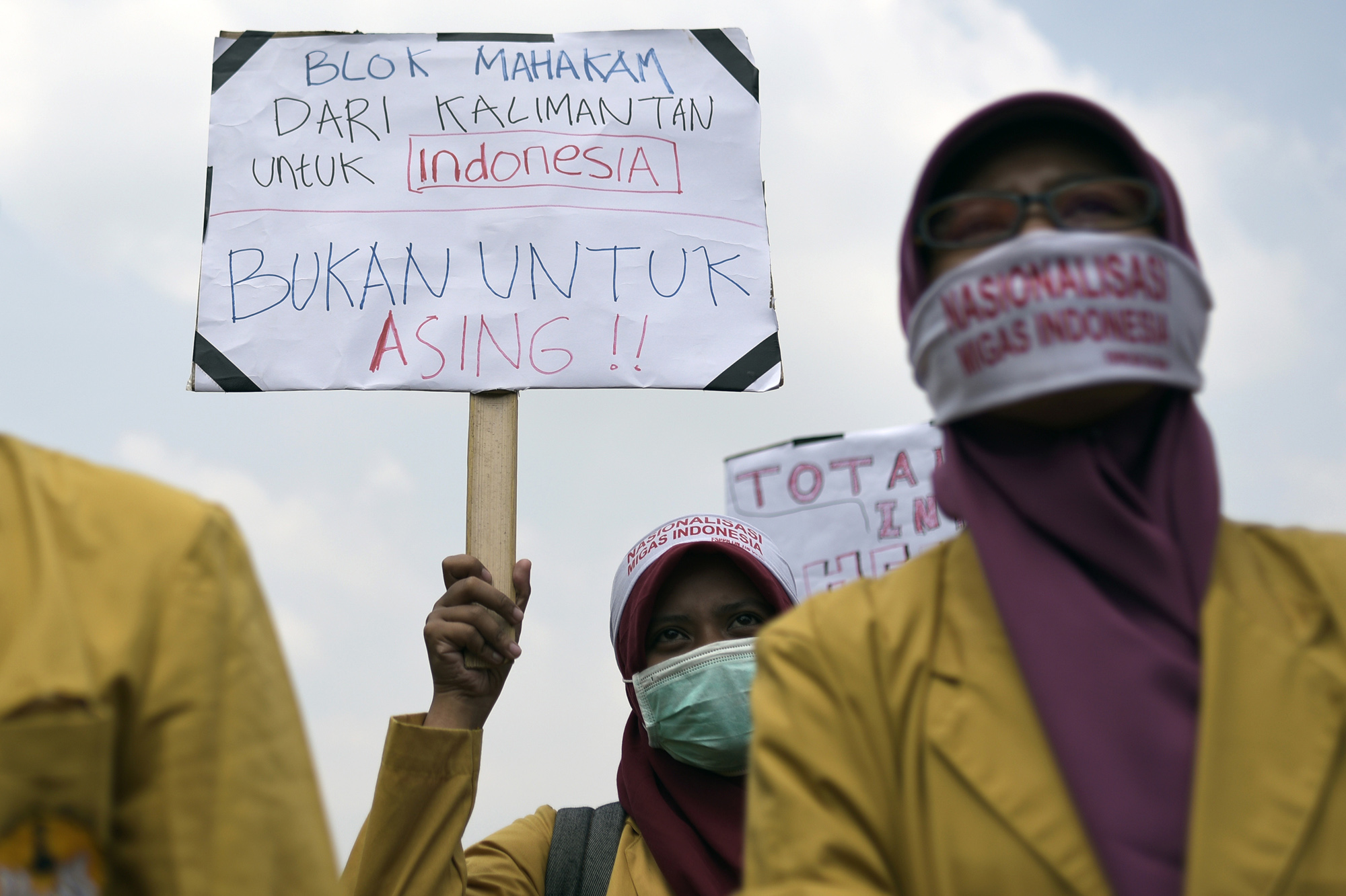 Sejumlah mahasiswa mengikuti aksi damai yang digelar Federasi Serikat Pekerja Pertamina Bersatu di depan Istana Merdeka, Jakarta, Kamis (6/8). Dalam aksinya mereka menolak pengelolaan Wilayah Kerja Mahakam oleh pihak asing dan meminta pemerintah untuk segera menyerahkan sepenuhnya pengelolaan kepada PT Pertamina (Persero). ANTARA FOTO/Sigid Kurniawan/pd/15.