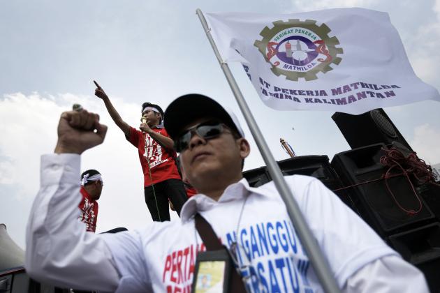 Massa yang tergabung dalam Federasi Serikat Pekerja Pertamina Bersatu menggelar aksi damai dengan melakukan long march menuju Istana Merdeka di Jalan Medan Merdeka Barat, Jakarta, Kamis (6/8). Dalam aksinya mereka menolak pengelolaan Wilayah Kerja Mahakam oleh pihak asing dan meminta pemerintah untuk segera menyerahkan sepenuhnya pengelolaan kepada PT Pertamina (Persero). ANTARA FOTO/Sigid Kurniawan/pd/15.