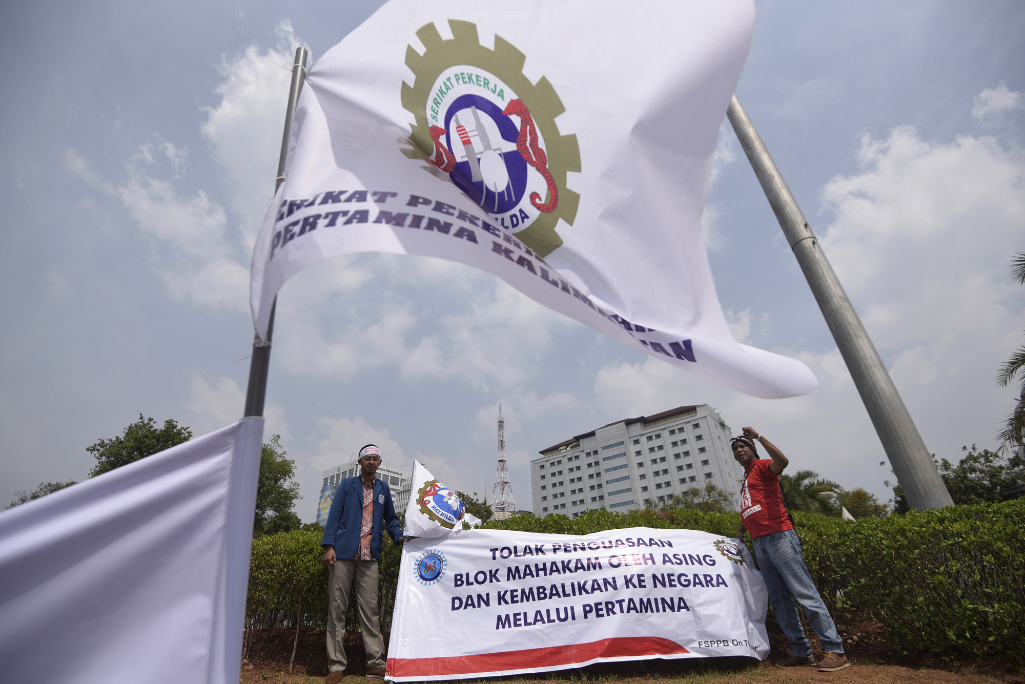 Massa yang tergabung dalam Federasi Serikat Pekerja Pertamina Bersatu menggelar aksi damai di depan Istana Merdeka, Jakarta, Kamis (6/8). Dalam aksinya mereka menolak pengelolaan Wilayah Kerja Mahakam oleh pihak asing dan meminta pemerintah untuk segera menyerahkan sepenuhnya pengelolaan kepada PT Pertamina (Persero). ANTARA FOTO/Sigid Kurniawan/pd/15.