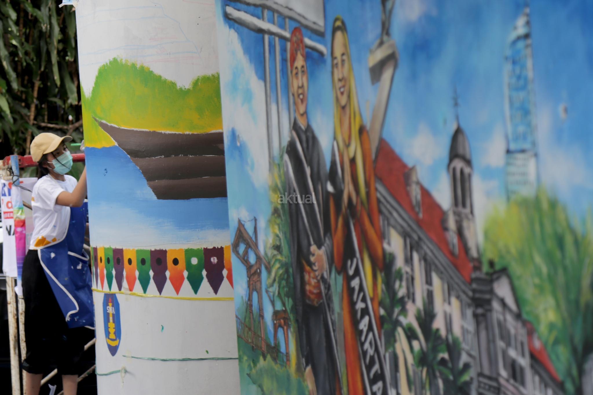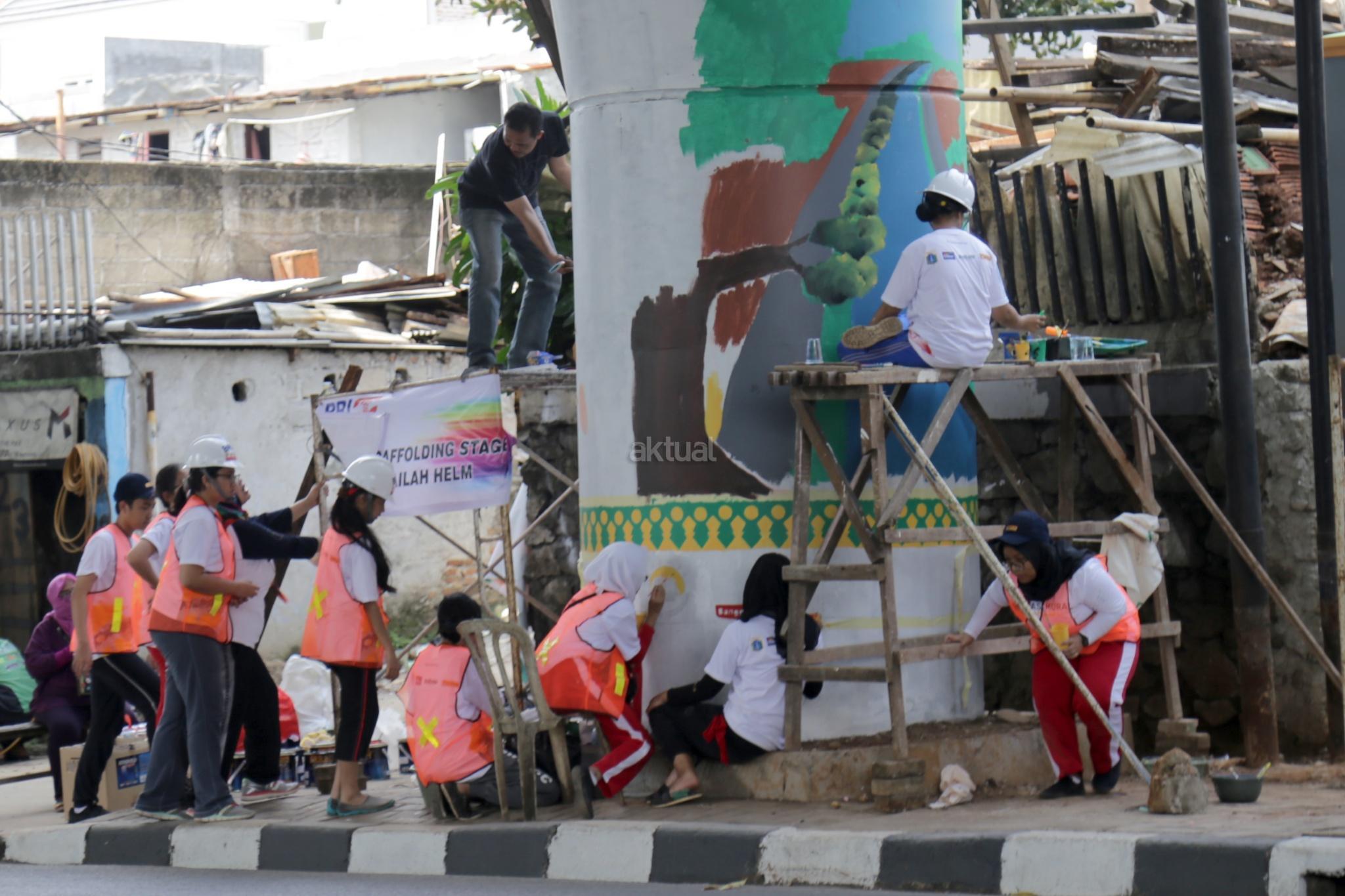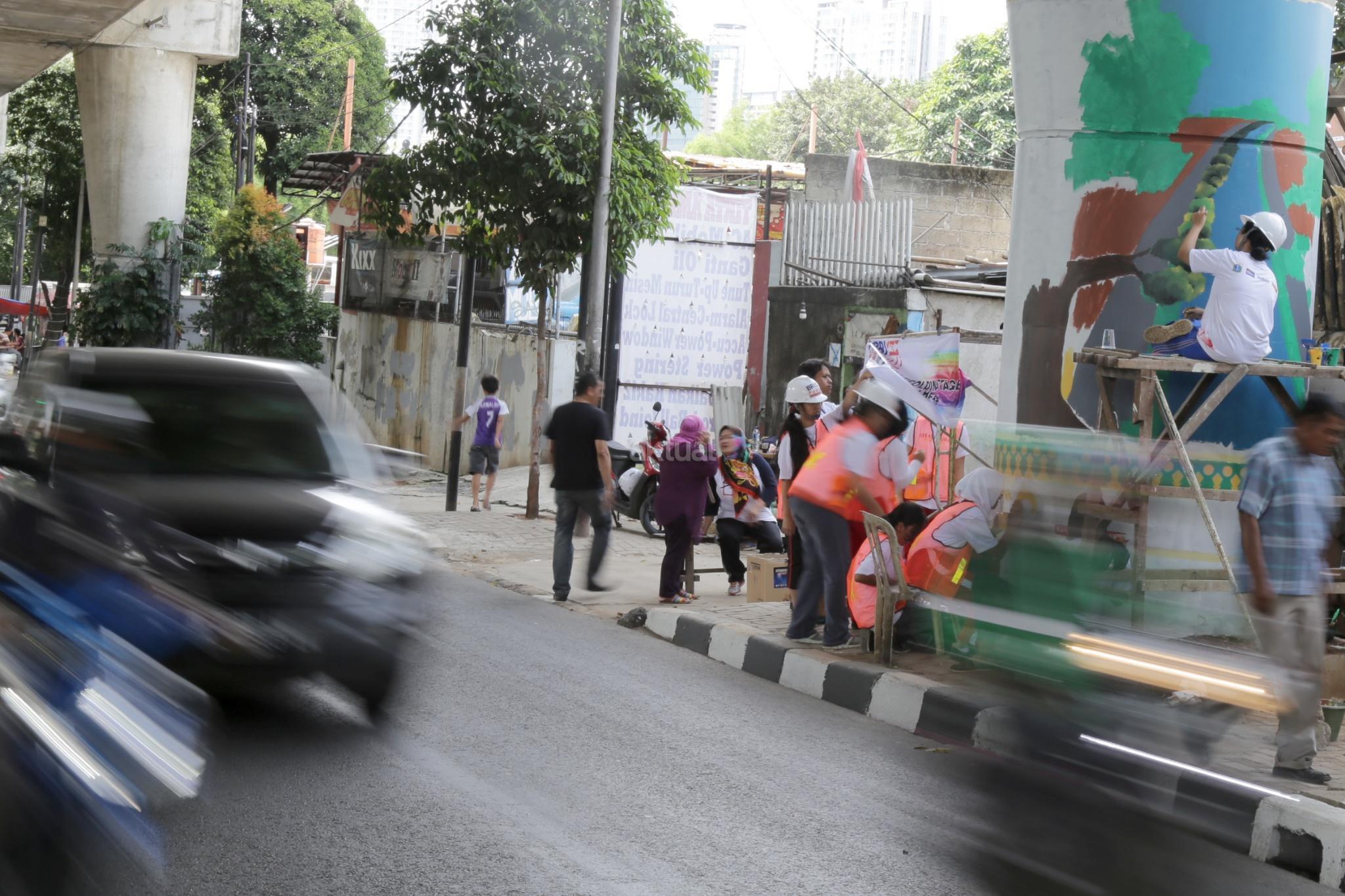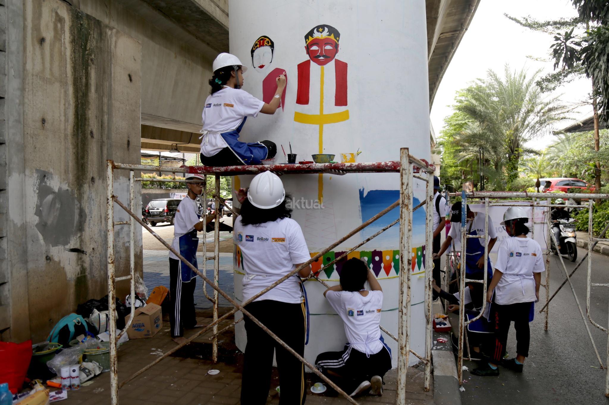 Aksi Pelajar Melukis Mural di Tiang Jalan Layang Non Tol Antasari