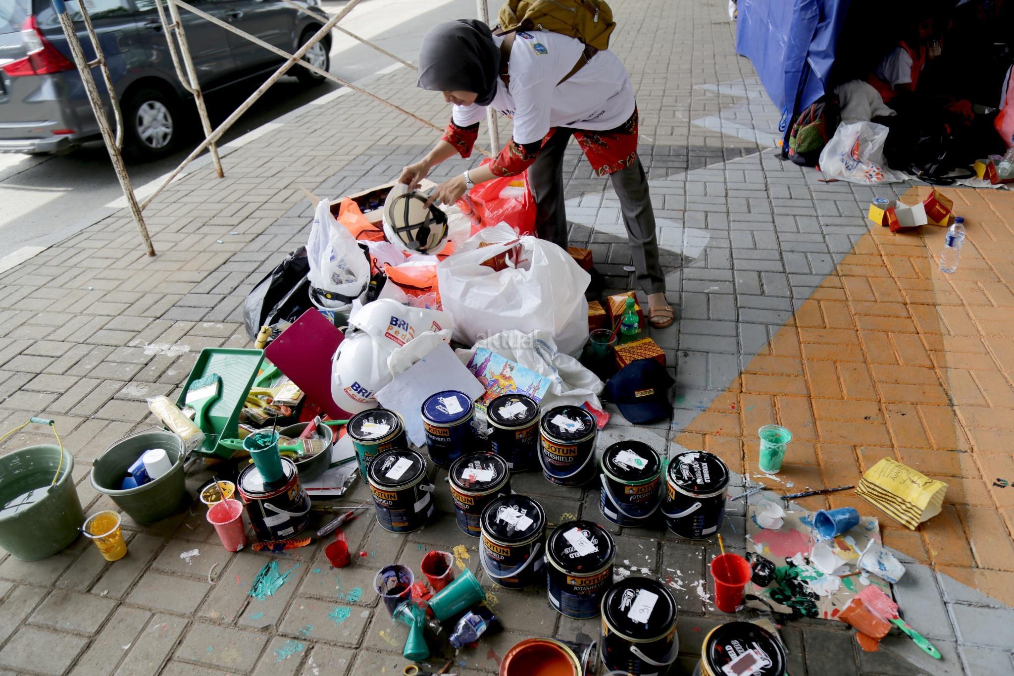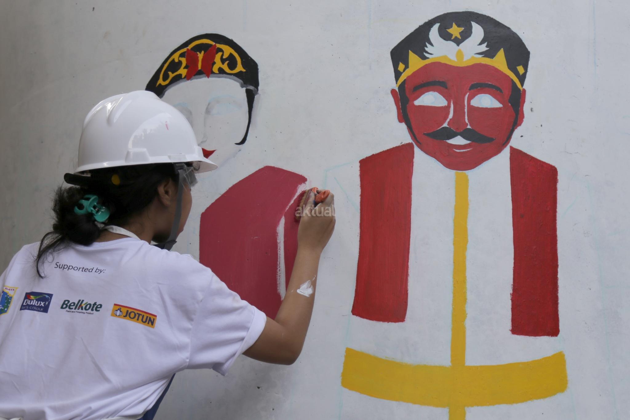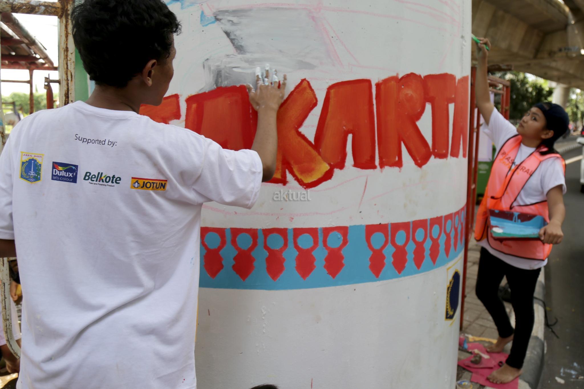 Sejumlah pelajar membuat mural di tiang jalan layang non-tol Antasari, Jakarta Selatan, Sabtu (10/3/18). Sebanyak 64 tiang jalan layang non tol ini mulai dilukis untuk mempercantik suasana jalan Antasari. Program ini diresmikan oleh Gubernur DKI Jakarta Anies Baswedan. Pengecatan ini juga bagian dari kerjasama dengan BRI, PT Jotun Indonesia, PT Dulux Indonesia, IKJ, dan Belkote. AKTUAL/Tino Oktaviano