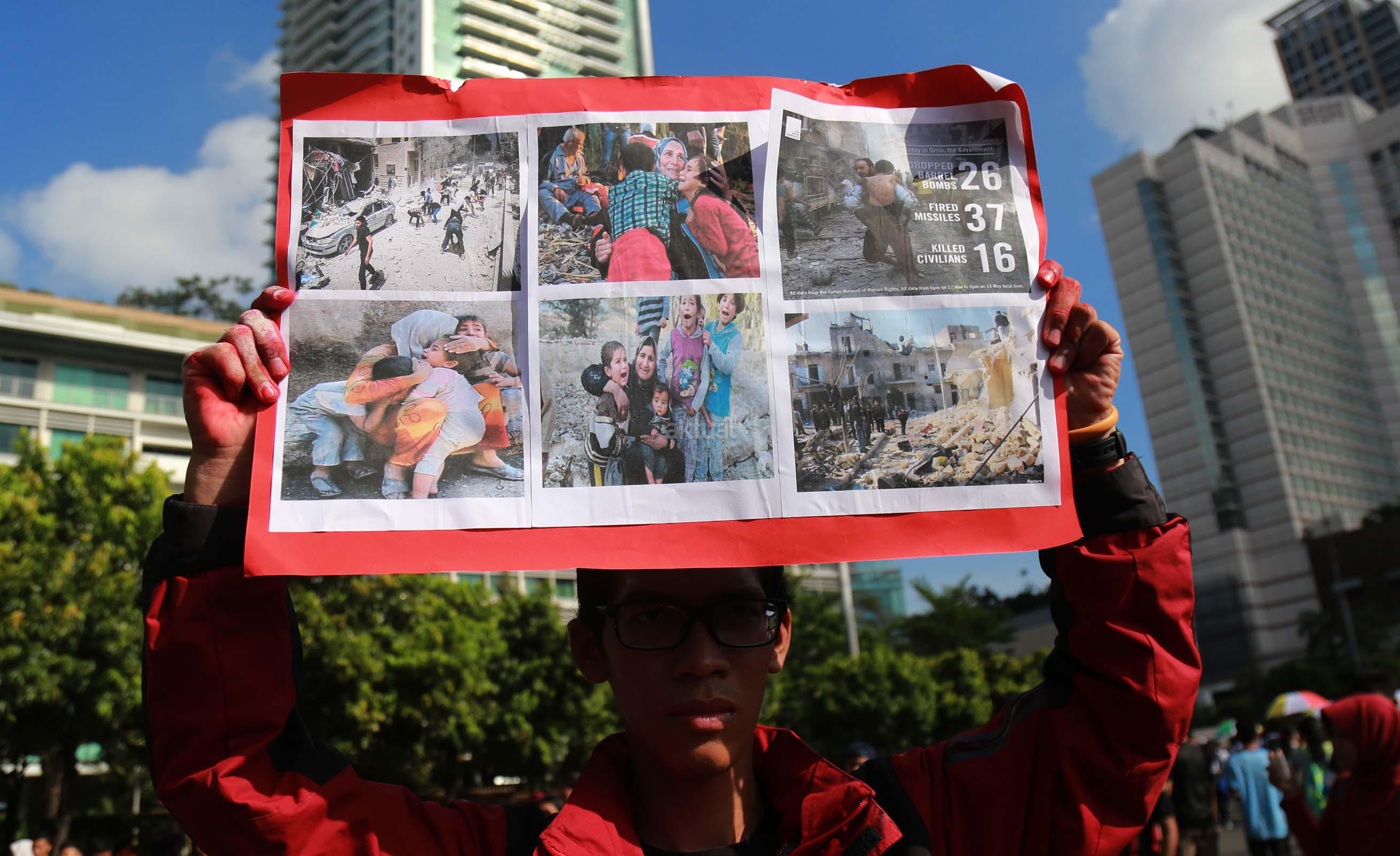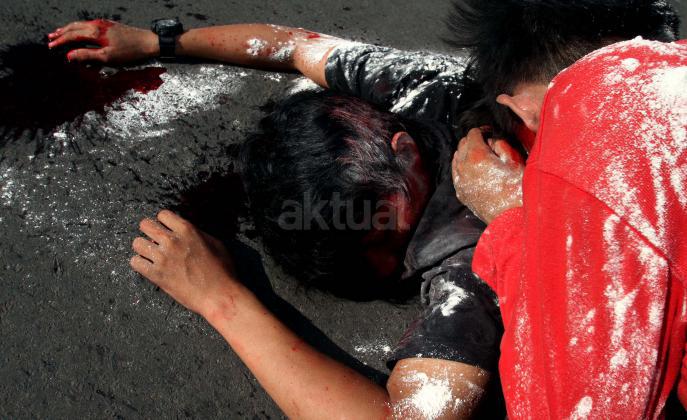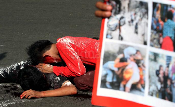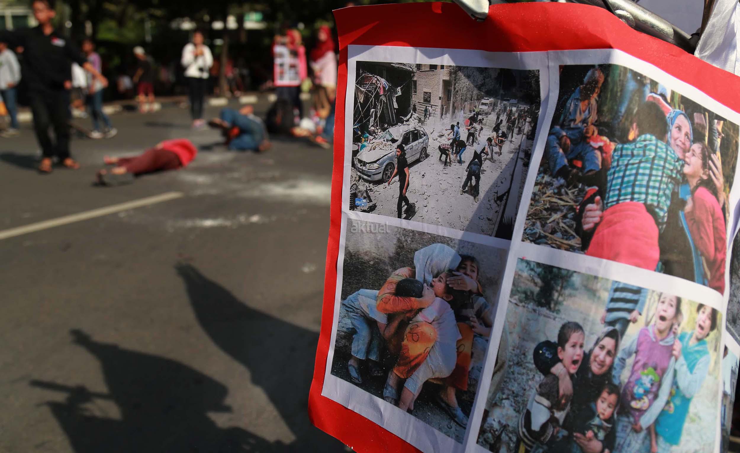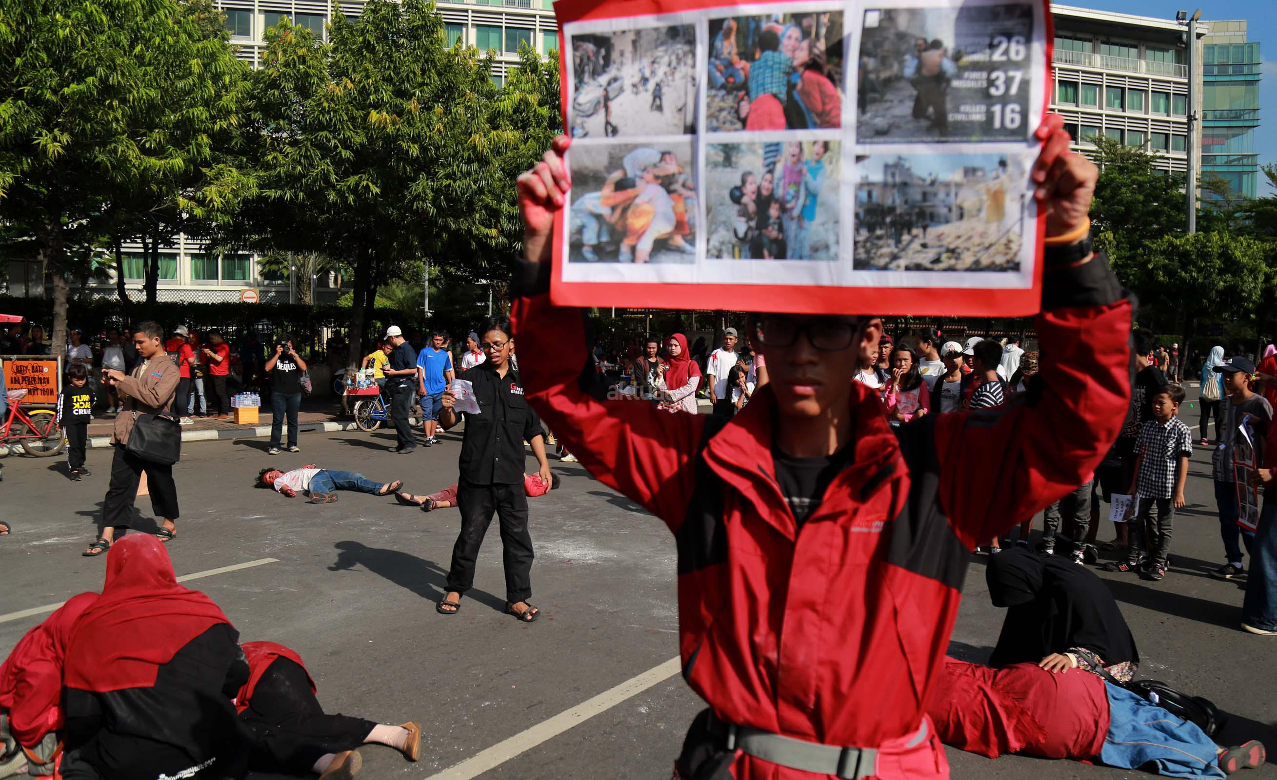 Puluhan mahasiswa yang tergabung dalam Korps Reaksi Cepat (KRC) Kammi melakukan aksi theaterikal perang saudara Aleppo Suriah, di Car Free Day (CFD), Jakarta, Minggu (15/5/2016). Selain aksi theaterikal Koprs Reaksi Cepat (KRC) Kammi melakukan penggalangan dana untuk para korban perang saudara di Aleppo, Suriah.