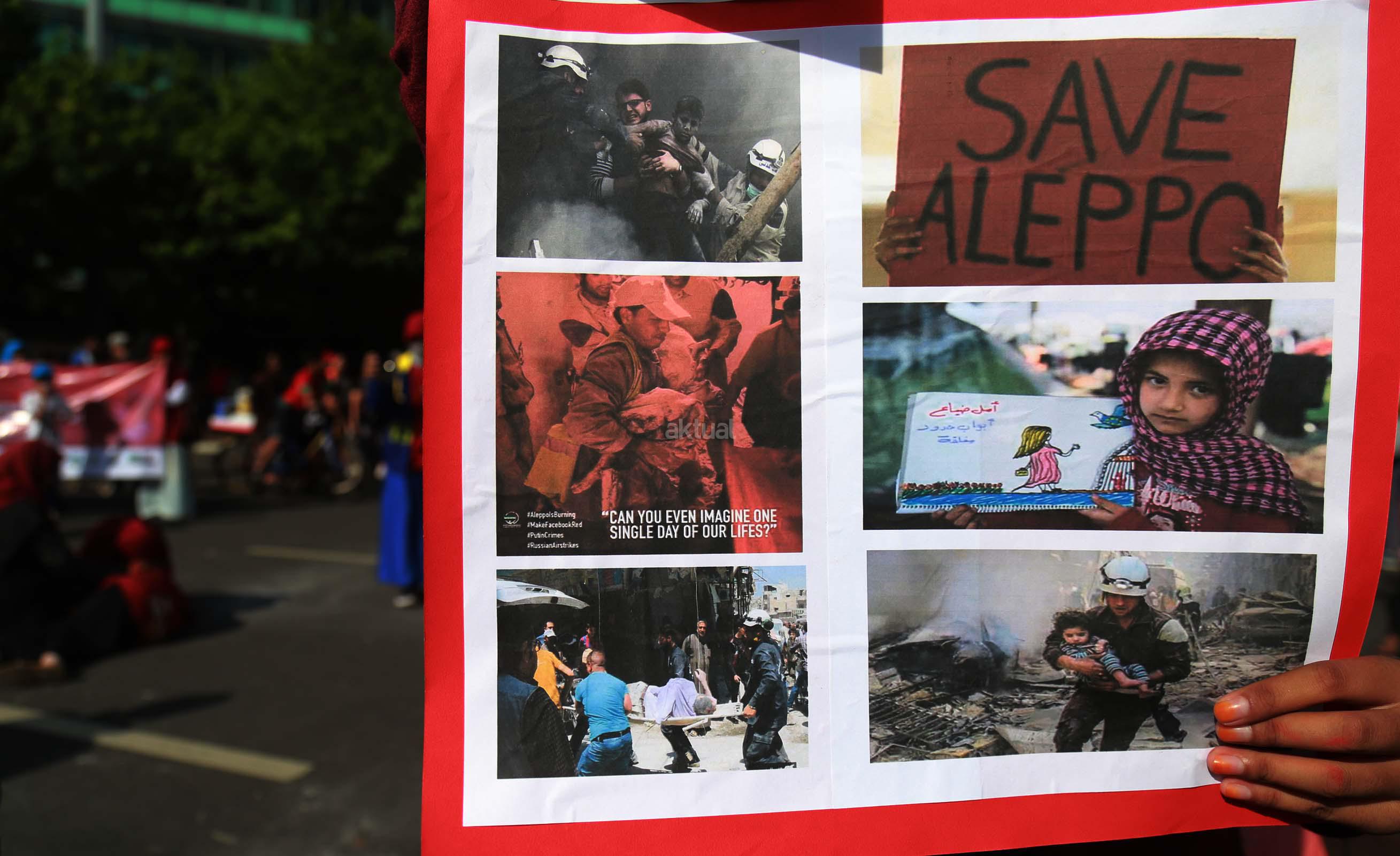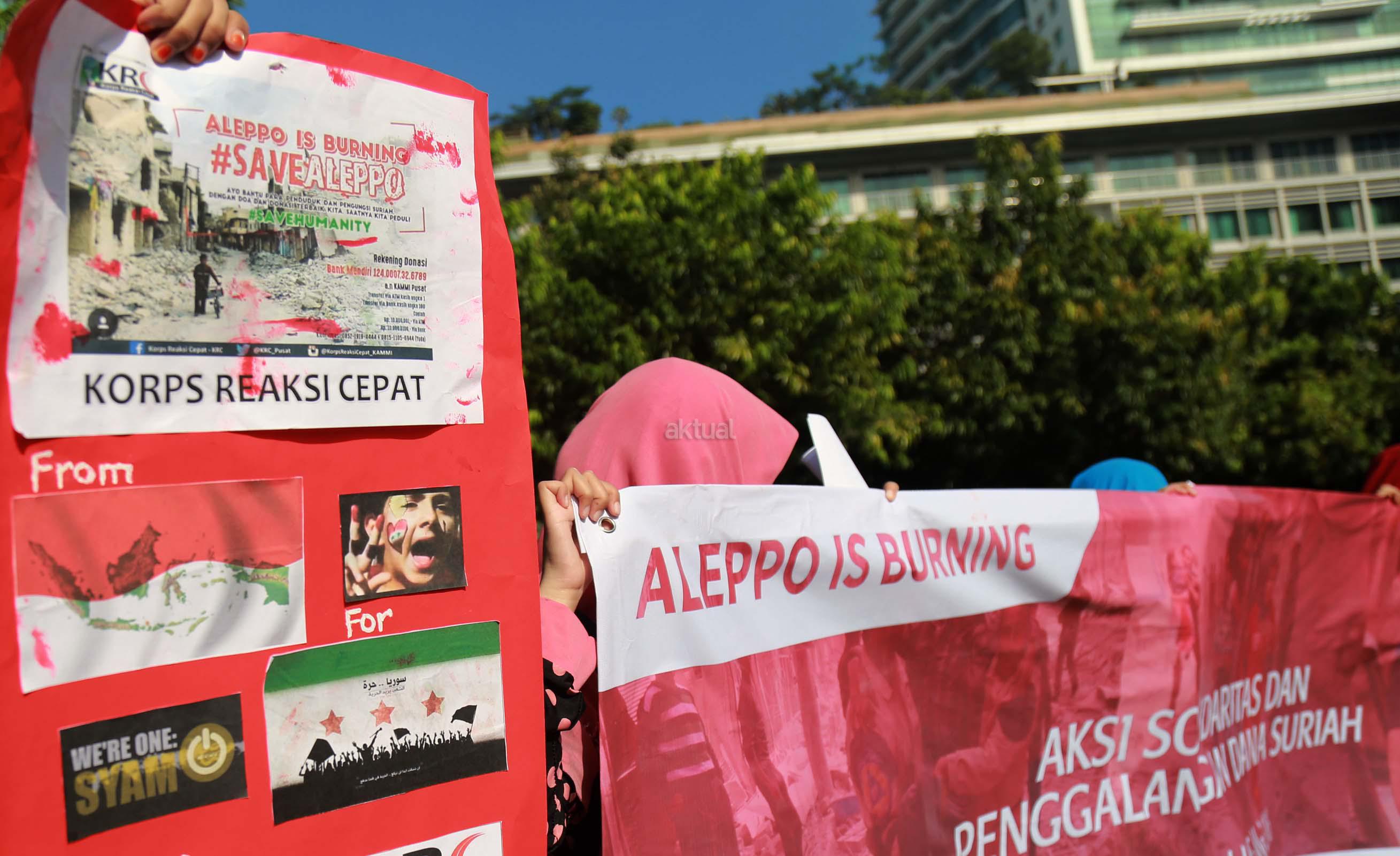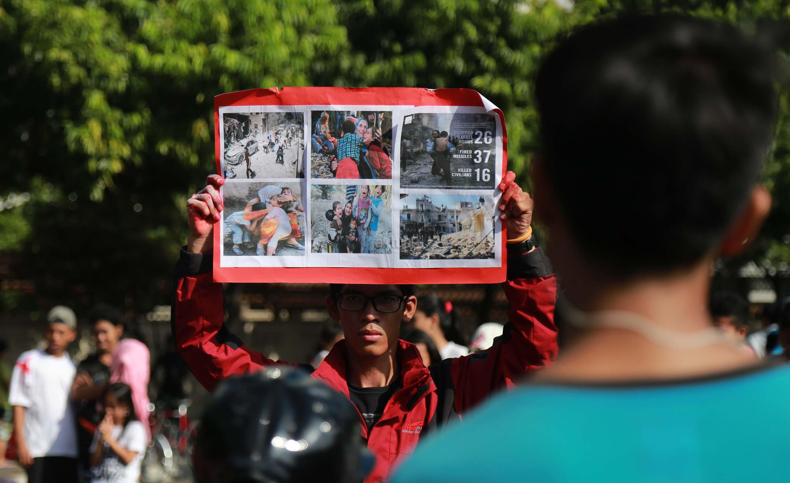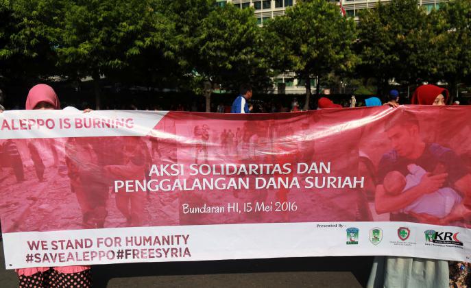 Puluhan mahasiswa yang tergabung dalam Korps Reaksi Cepat (KRC) Kammi melakukan aksi theaterikal perang saudara Aleppo Suriah, di Car Free Day (CFD), Jakarta, Minggu (15/5/2016). Selain aksi theaterikal Koprs Reaksi Cepat (KRC) Kammi melakukan penggalangan dana untuk para korban perang saudara di Aleppo, Suriah.
