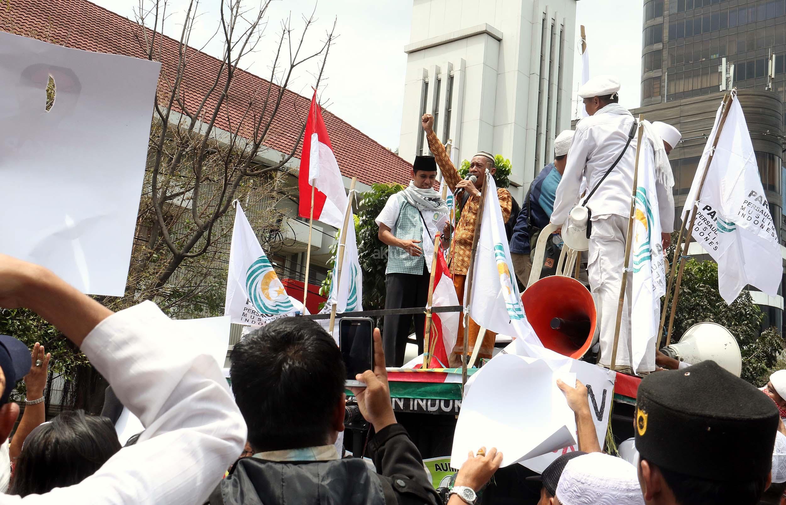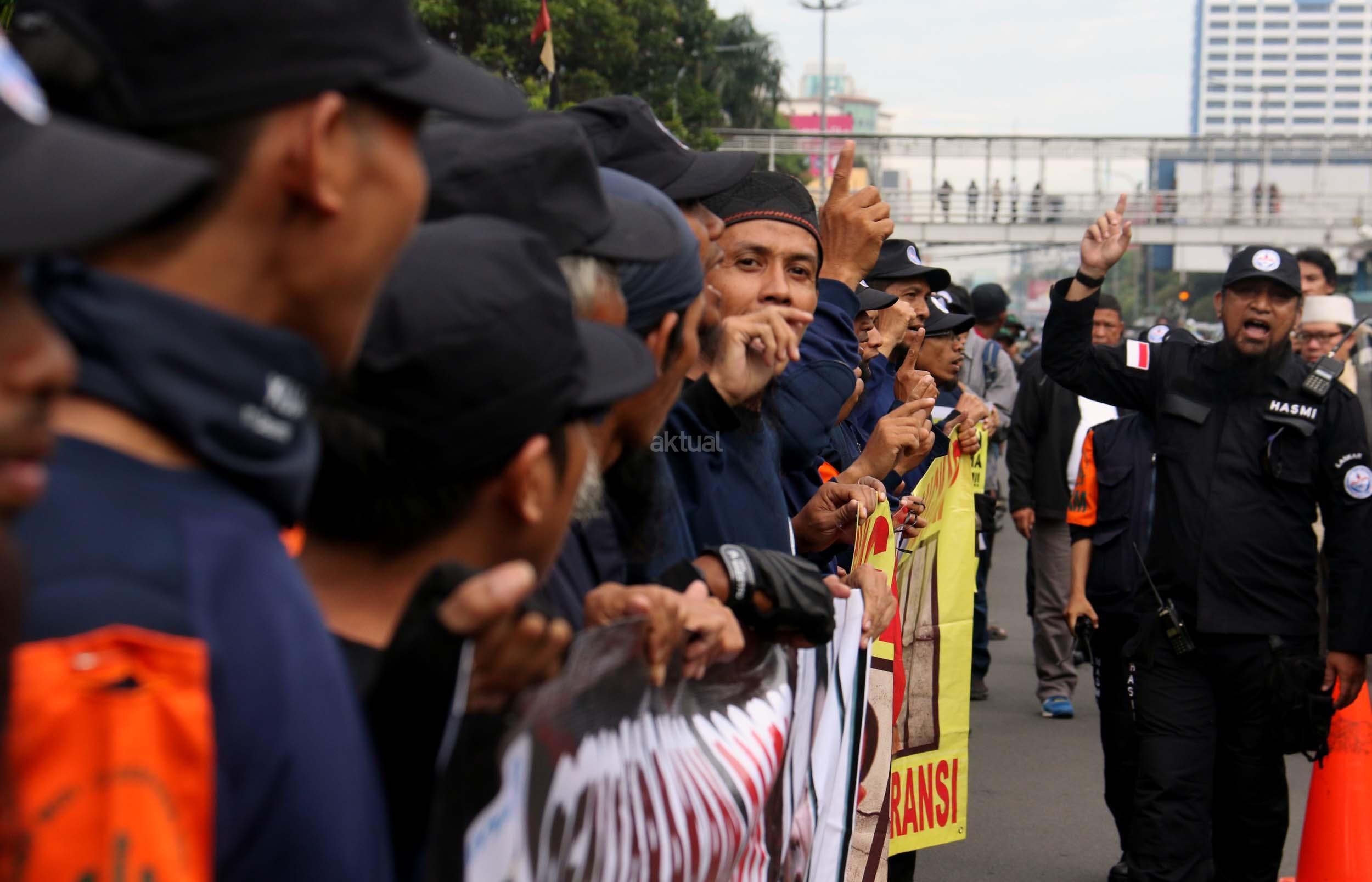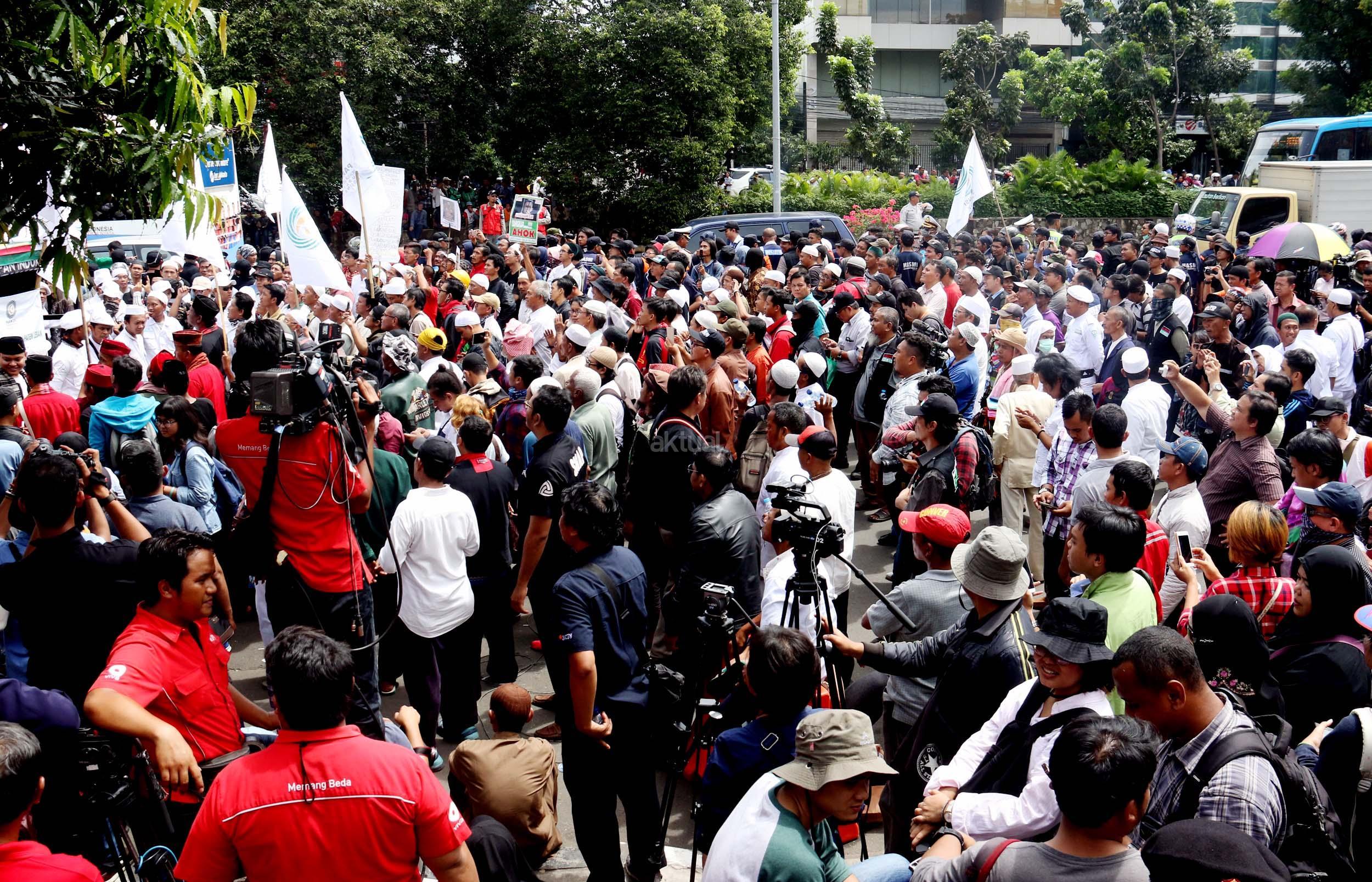 Ratusan massa yang tergabung dalam Gerakan Nasional Pengawal Fatwa (GNPF) MUI melakukan aksi unjuk rasa di depan PN Jakarta Utara, saat berlangsungnya sidang perdana kasus dugaan penistaan agama yang melibatkan Gubernur DKI Jakarta nonaktif Basuki Tjahaja Purnama (Ahok), di Jakarta, Selasa (13/12/2016). Massa dari berbagai elemen hadir mengawal jalannya sidang perdana kasus dugaan penistaan agama yang beragendakan pembacaan surat dakwaan. AKTUAL/Munzir