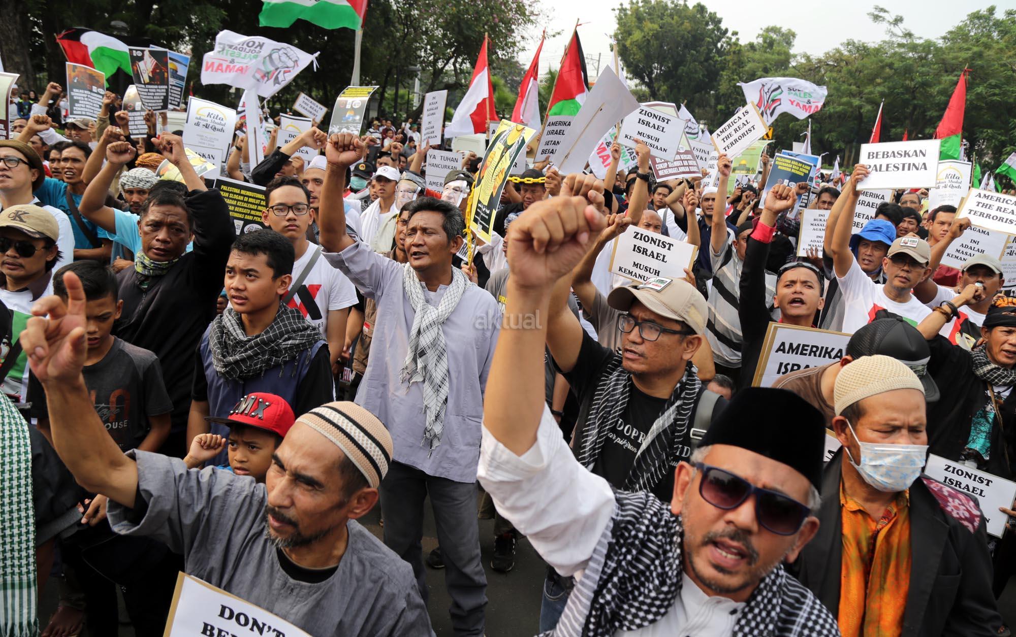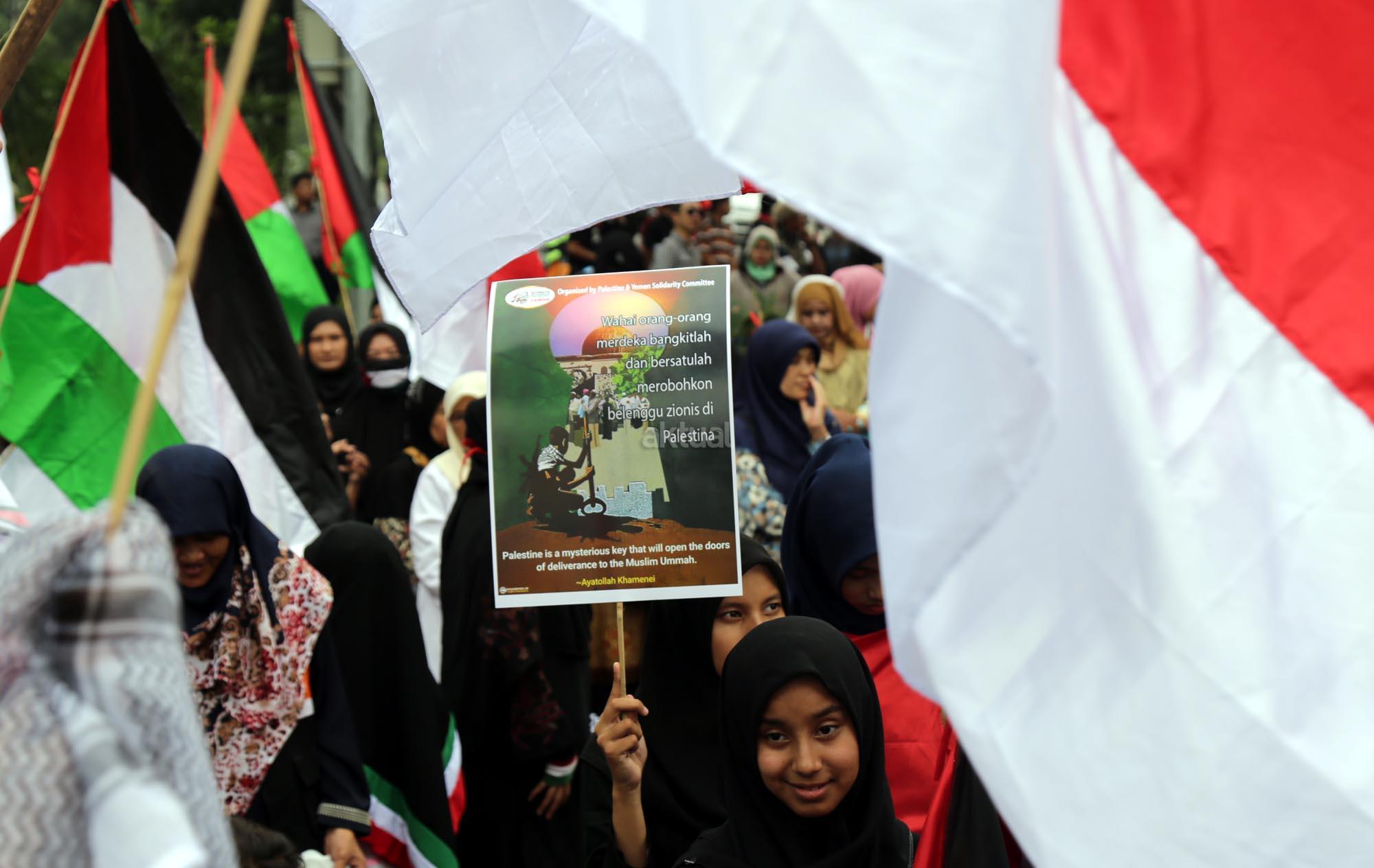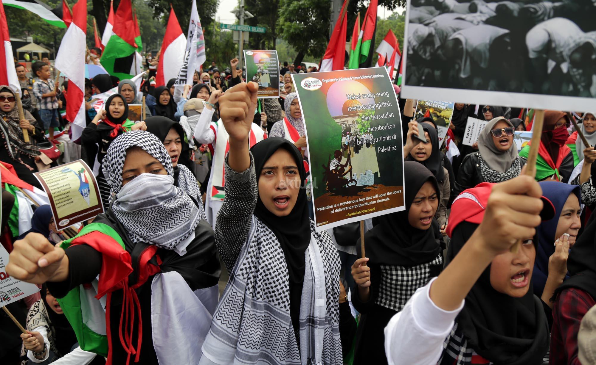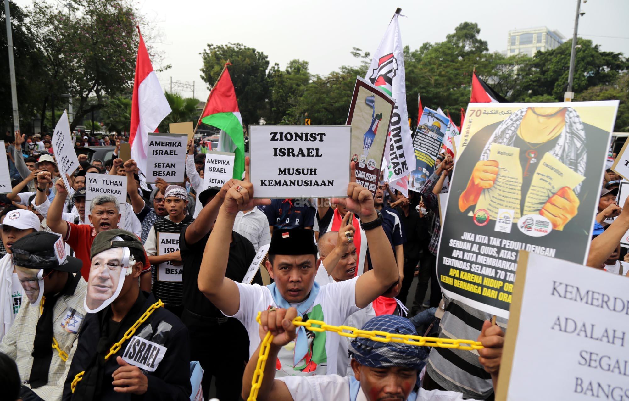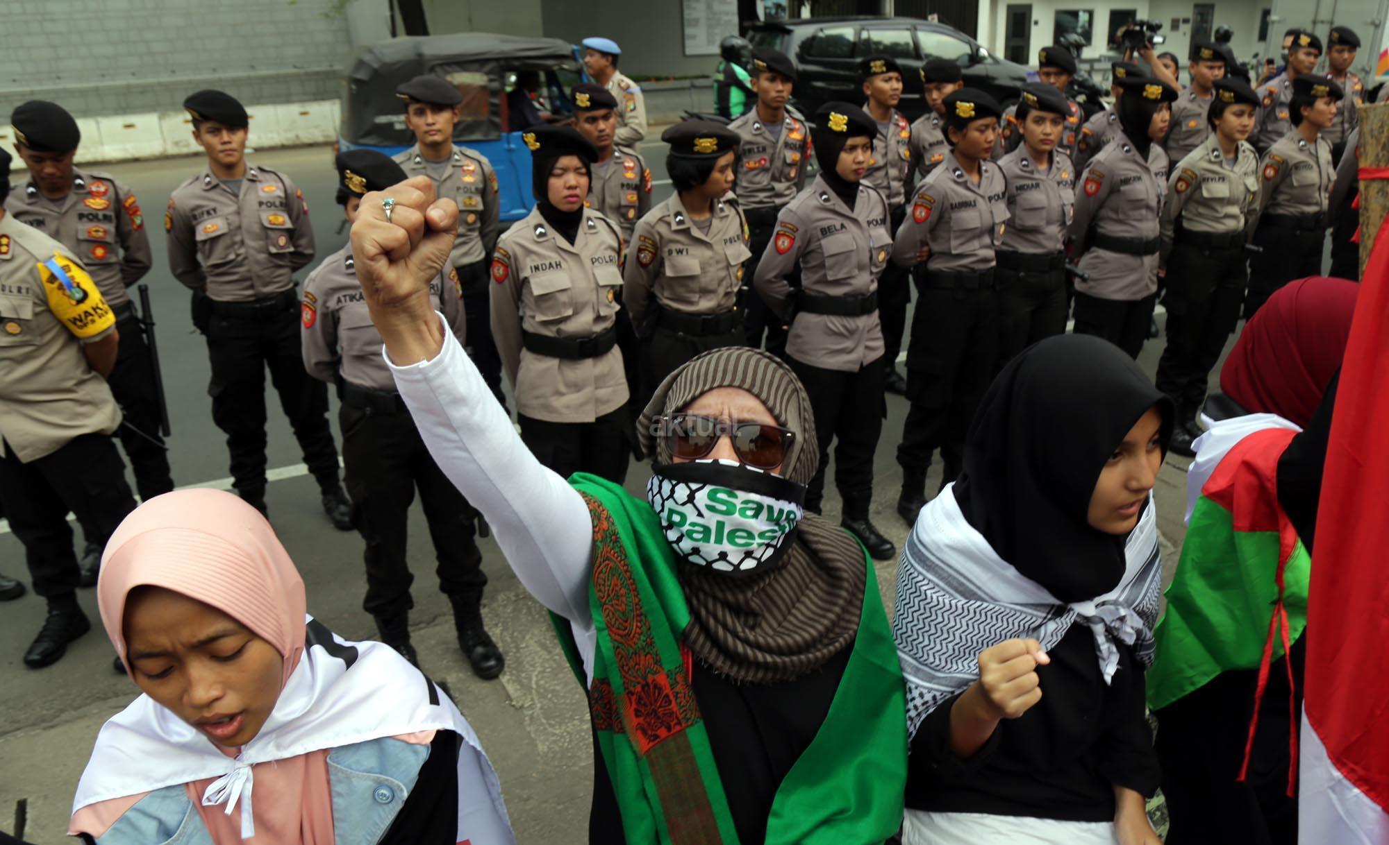 Sejumlah umat muslim melakukan aksi memperingati hari Al Quds atau Jumat terakhir di bulan Ramadan di depan Kedutaan Besar Amerika Serikat, Jakarta, Jumat (8/6/2018). Tahun ini dunia Islam dan dunia Arab harus memberikan dukungannya terhadap Palestina dalam pawai Hari Quds Sedunia. Sebab, Palestina di tahun ini menjadi sasaran agresi rezim Zionis melebihi tahun-tahun sebelumnya. AKTUAL/Tino Oktaviano