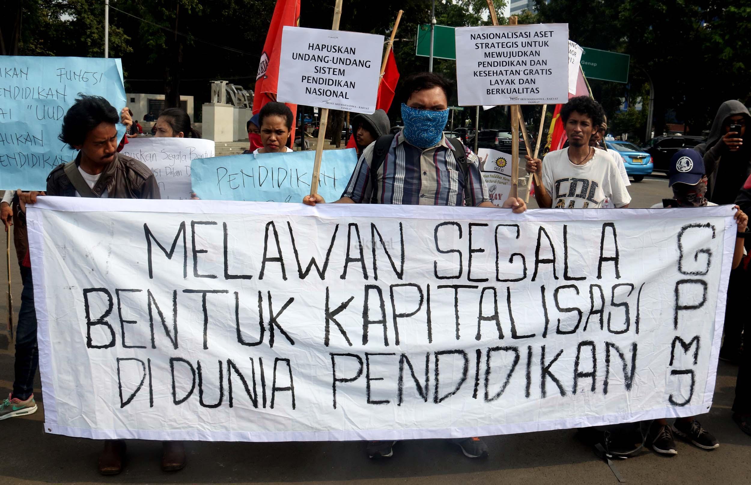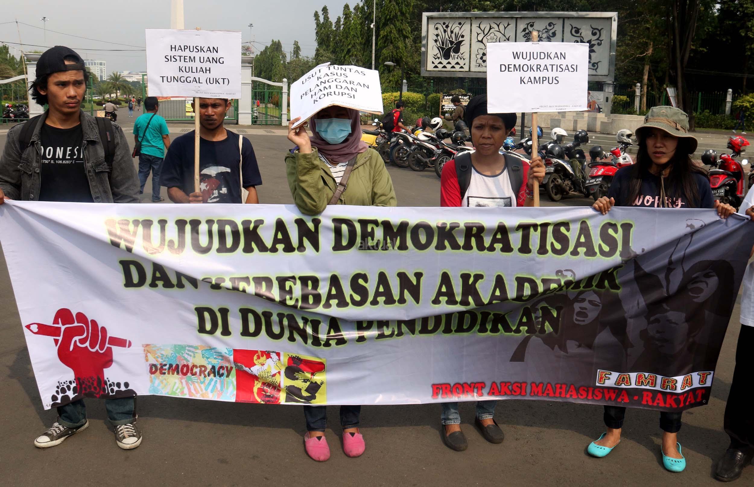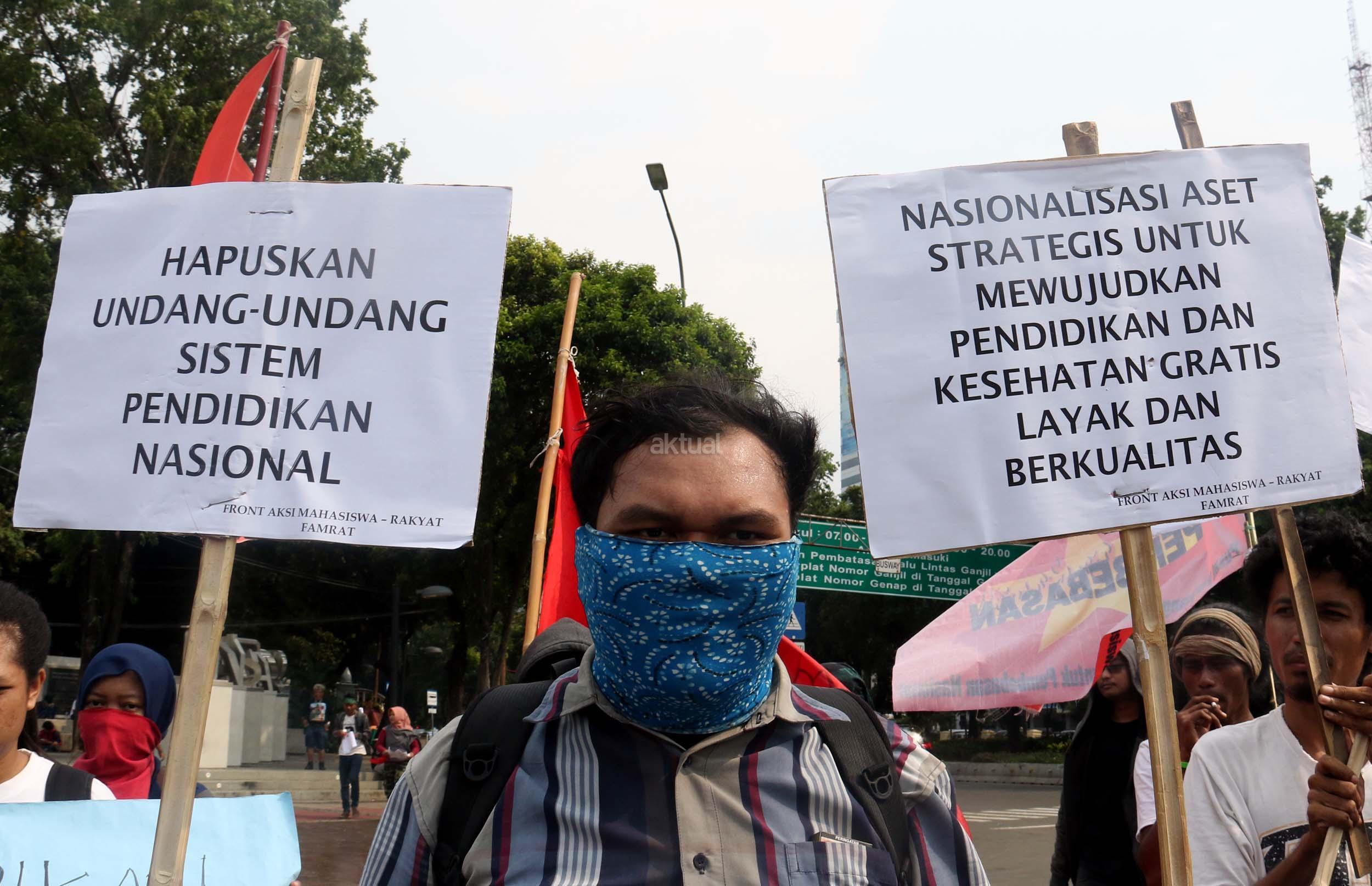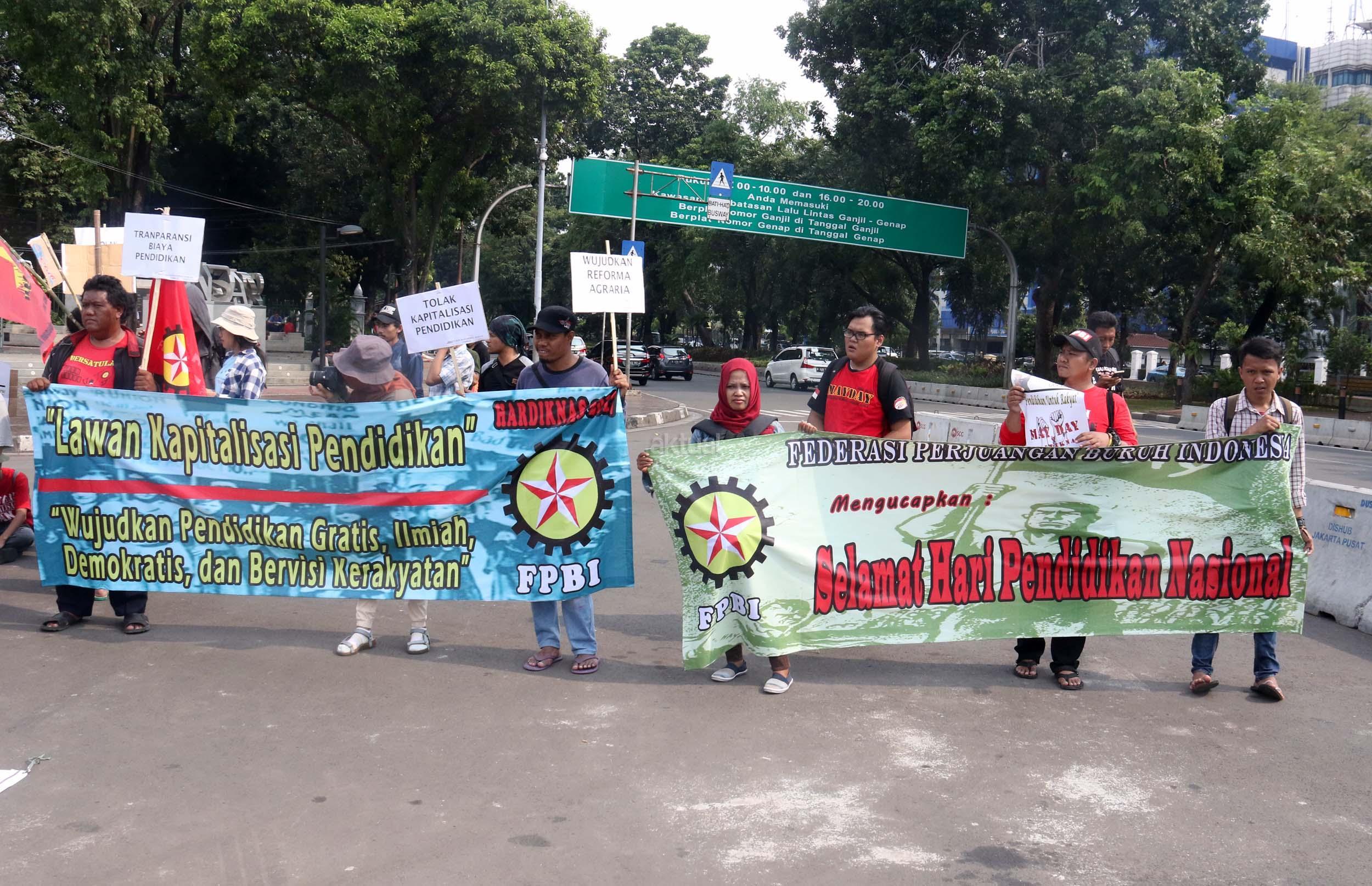 Sejumlah mahasiswa yang tergabung dalam Aliansi Mahasiswa Indonesia melakukan aksi unjuk rasa di depan Istana Merdeka, Jakarta, Selasa (2/5/2017). Dalam aksi tersebut mereka meminta pemerintah untuk mewujudkan pendidikan yang merata untuk rakyat. AKTUAL/Munzir