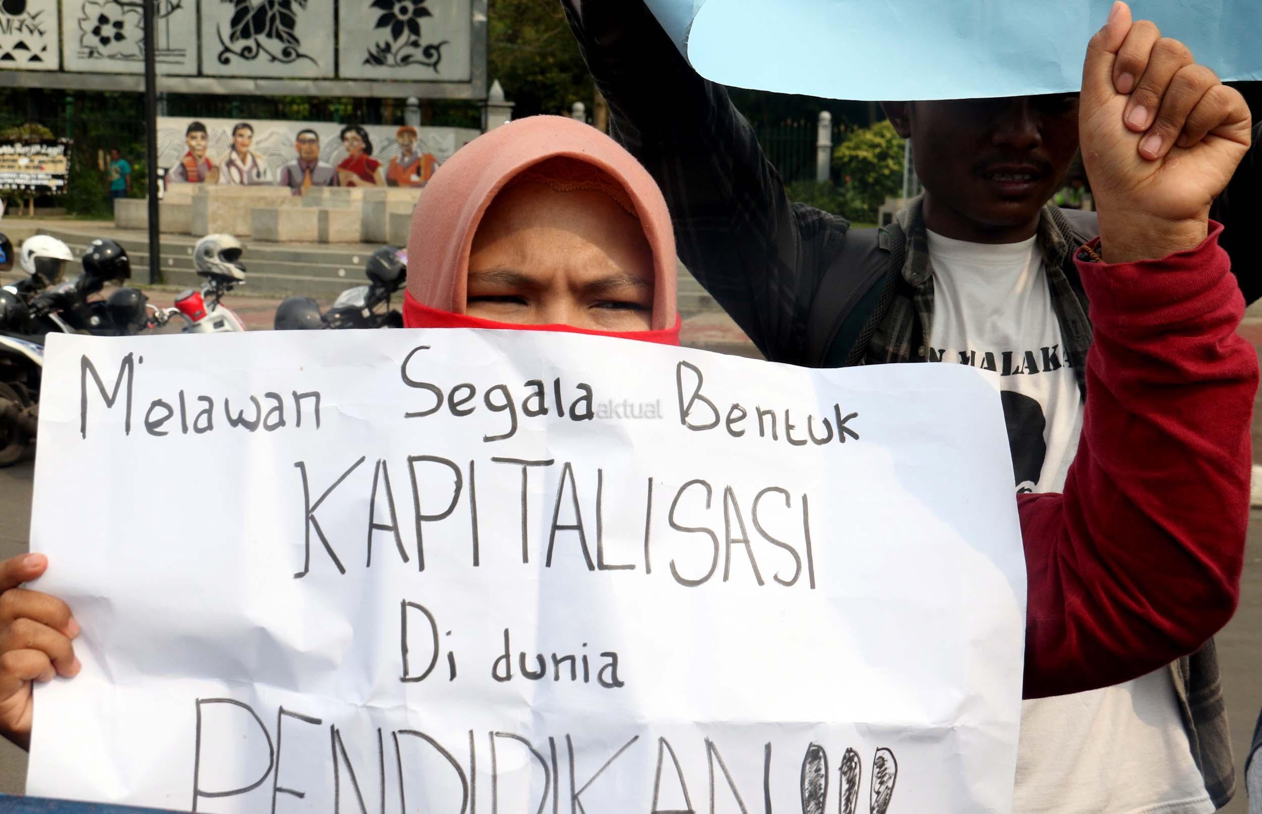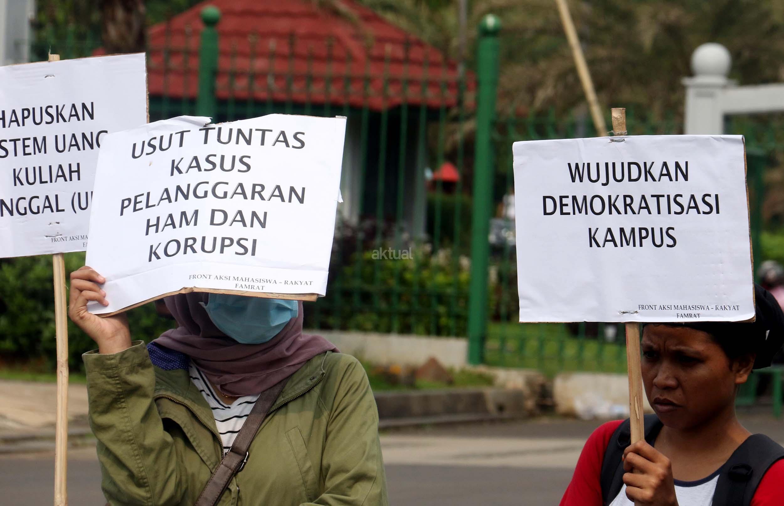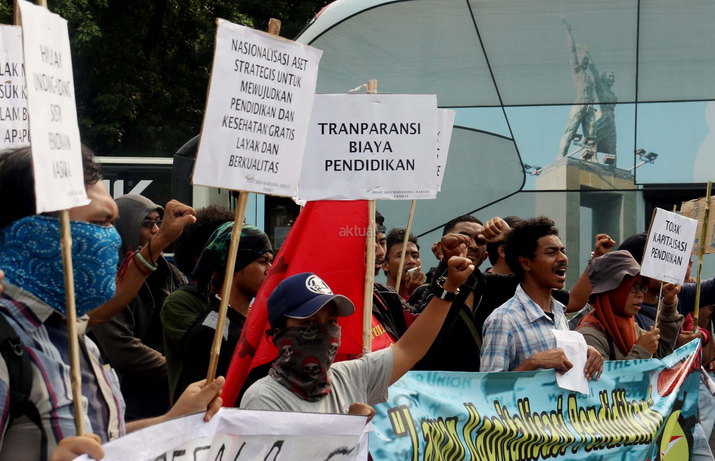 Sejumlah mahasiswa yang tergabung dalam Aliansi Mahasiswa Indonesia melakukan aksi unjuk rasa di depan Istana Merdeka, Jakarta, Selasa (2/5/2017). Dalam aksi tersebut mereka meminta pemerintah untuk mewujudkan pendidikan yang merata untuk rakyat. AKTUAL/Munzir