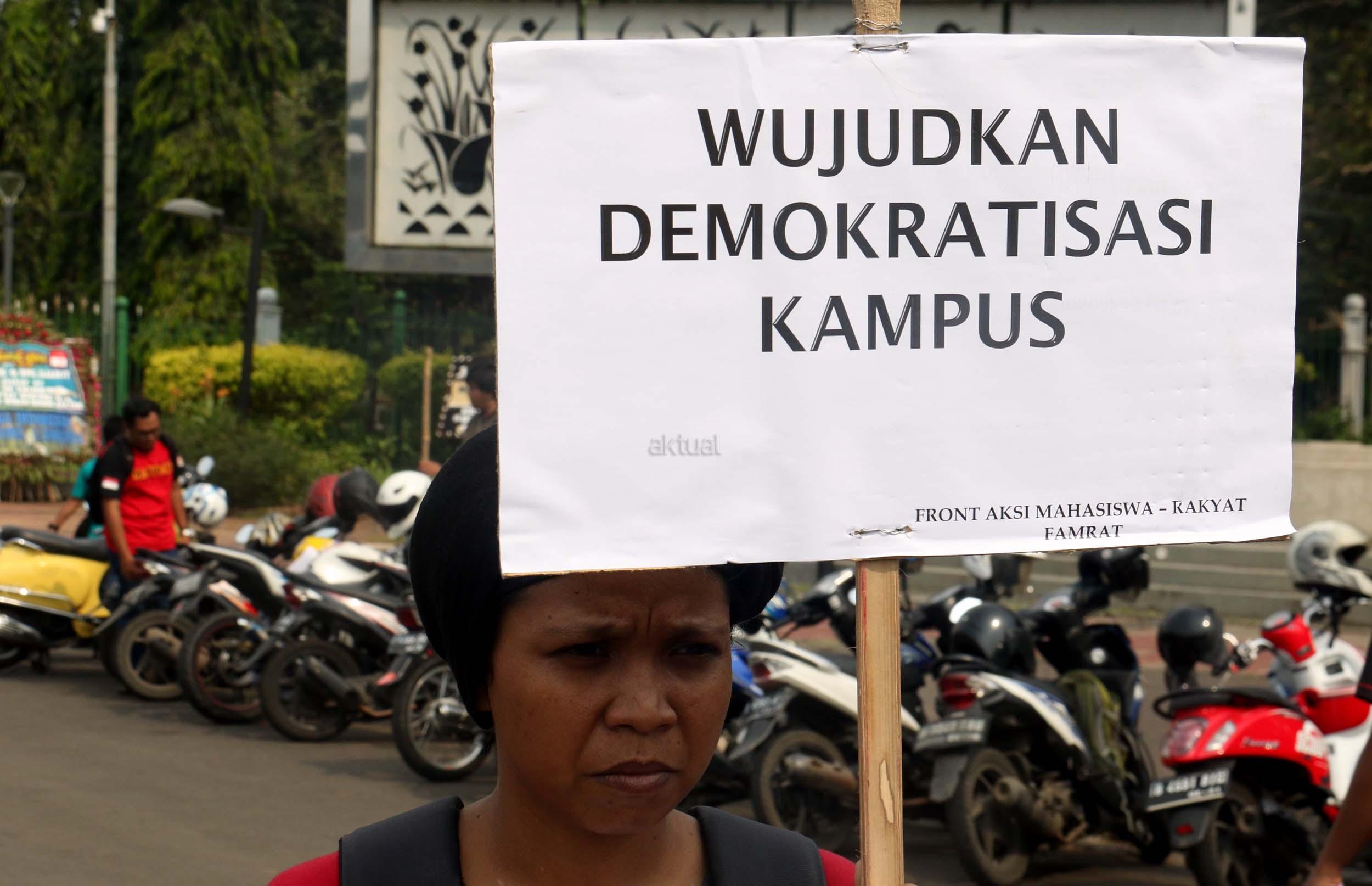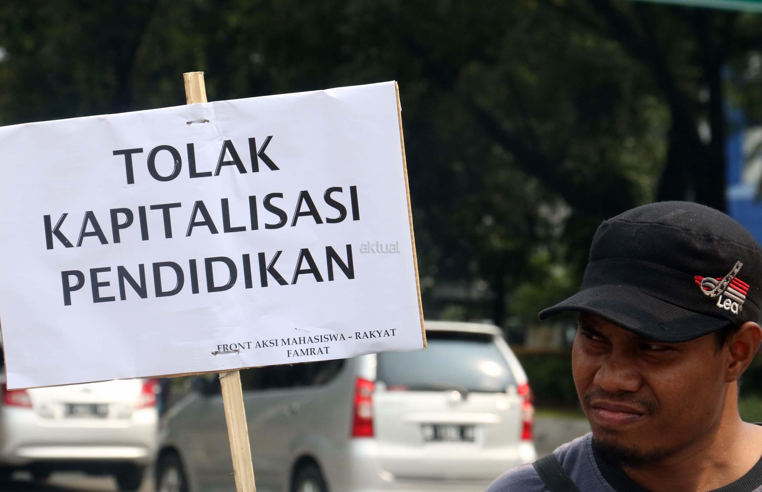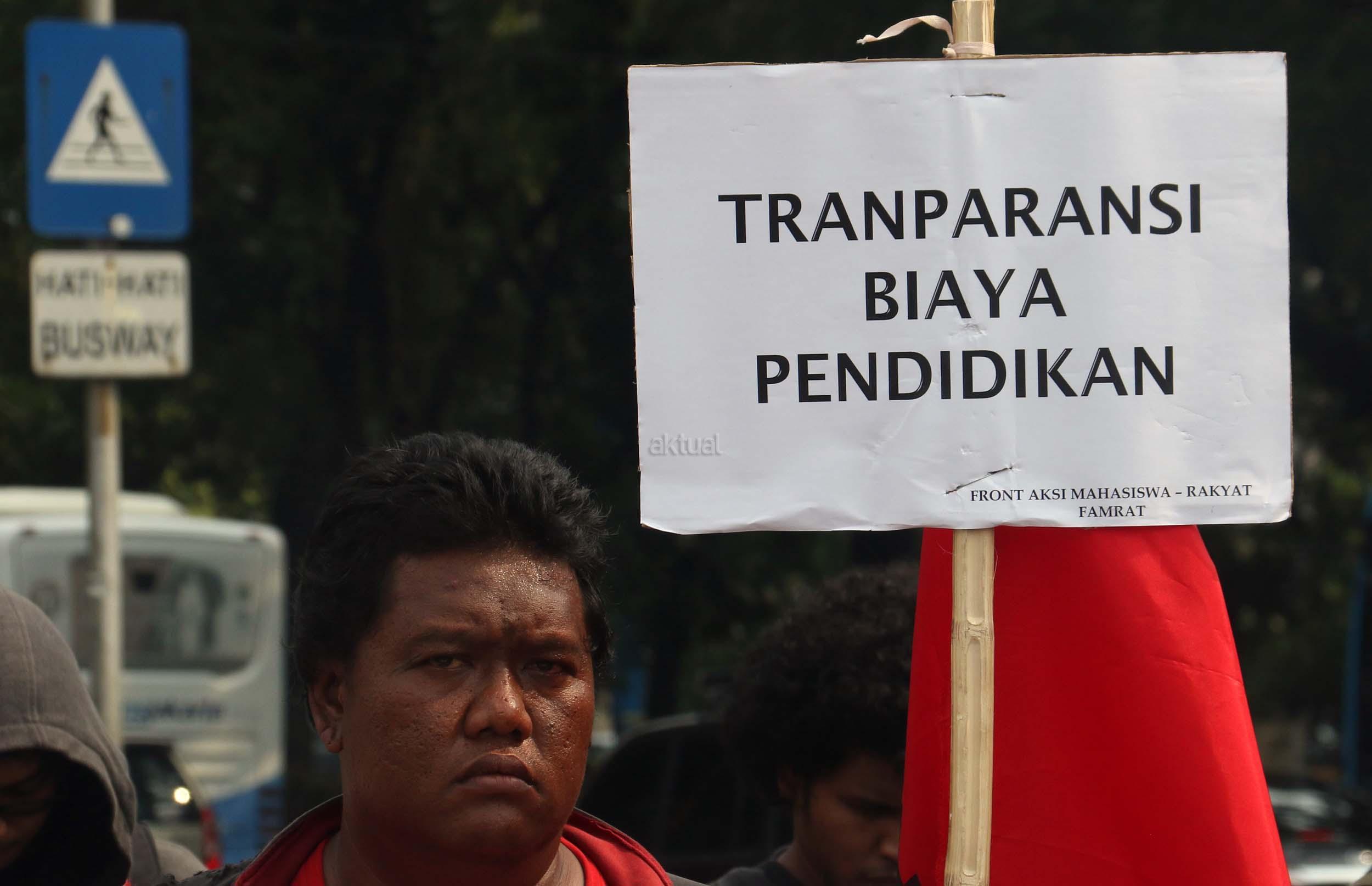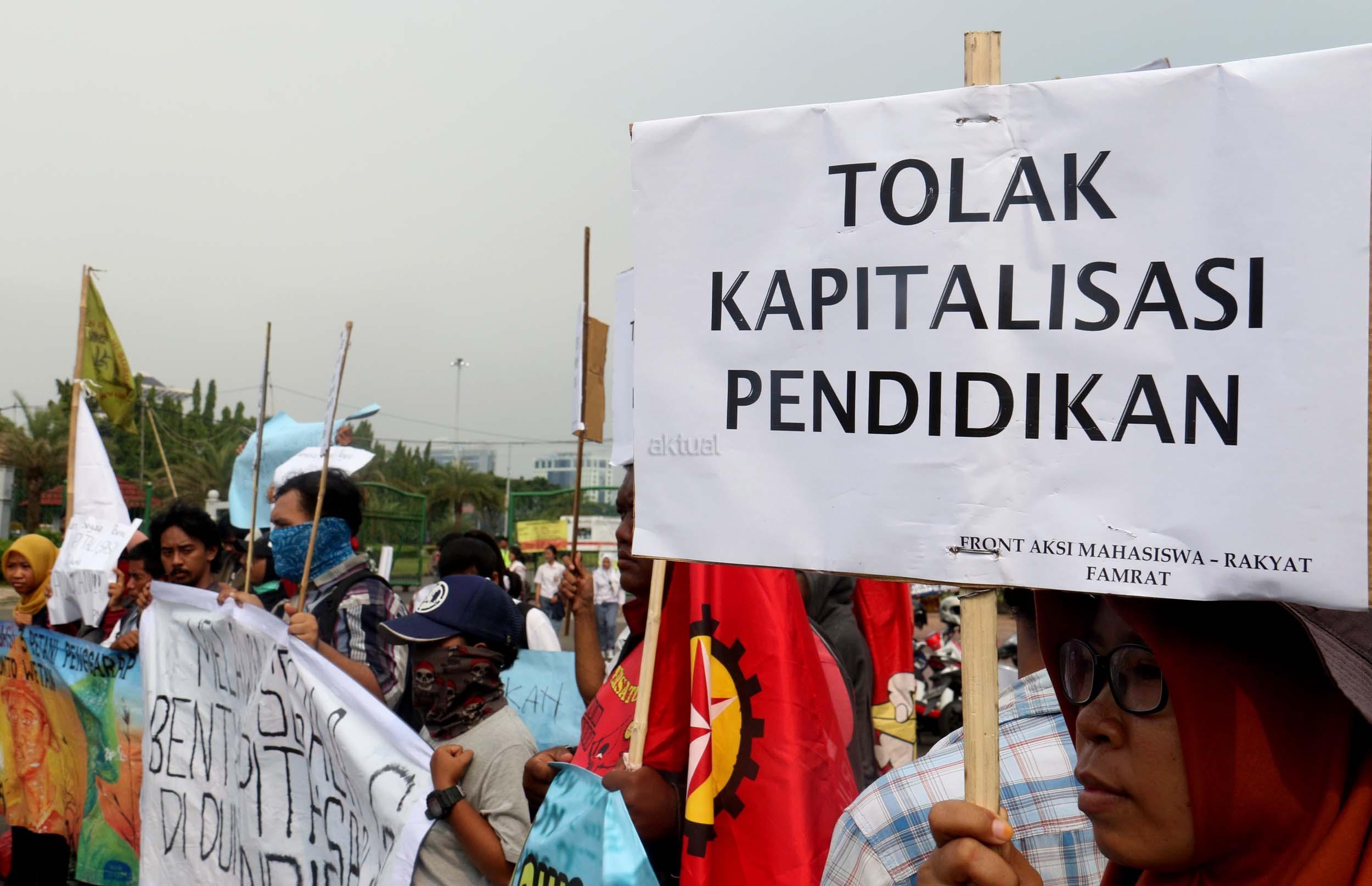 Sejumlah mahasiswa yang tergabung dalam Aliansi Mahasiswa Indonesia melakukan aksi unjuk rasa di depan Istana Merdeka, Jakarta, Selasa (2/5/2017). Dalam aksi tersebut mereka meminta pemerintah untuk mewujudkan pendidikan yang merata untuk rakyat. AKTUAL/Munzir