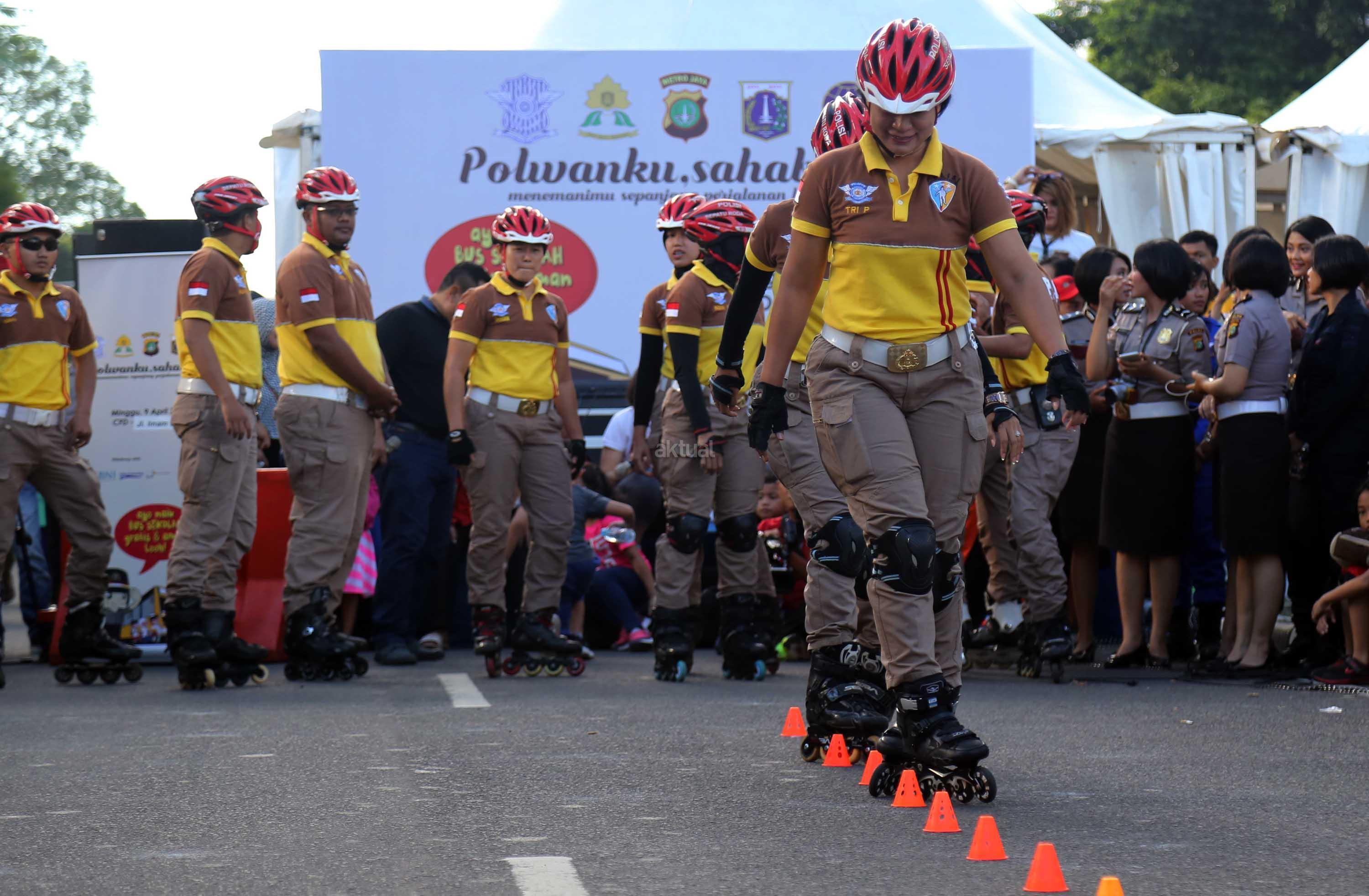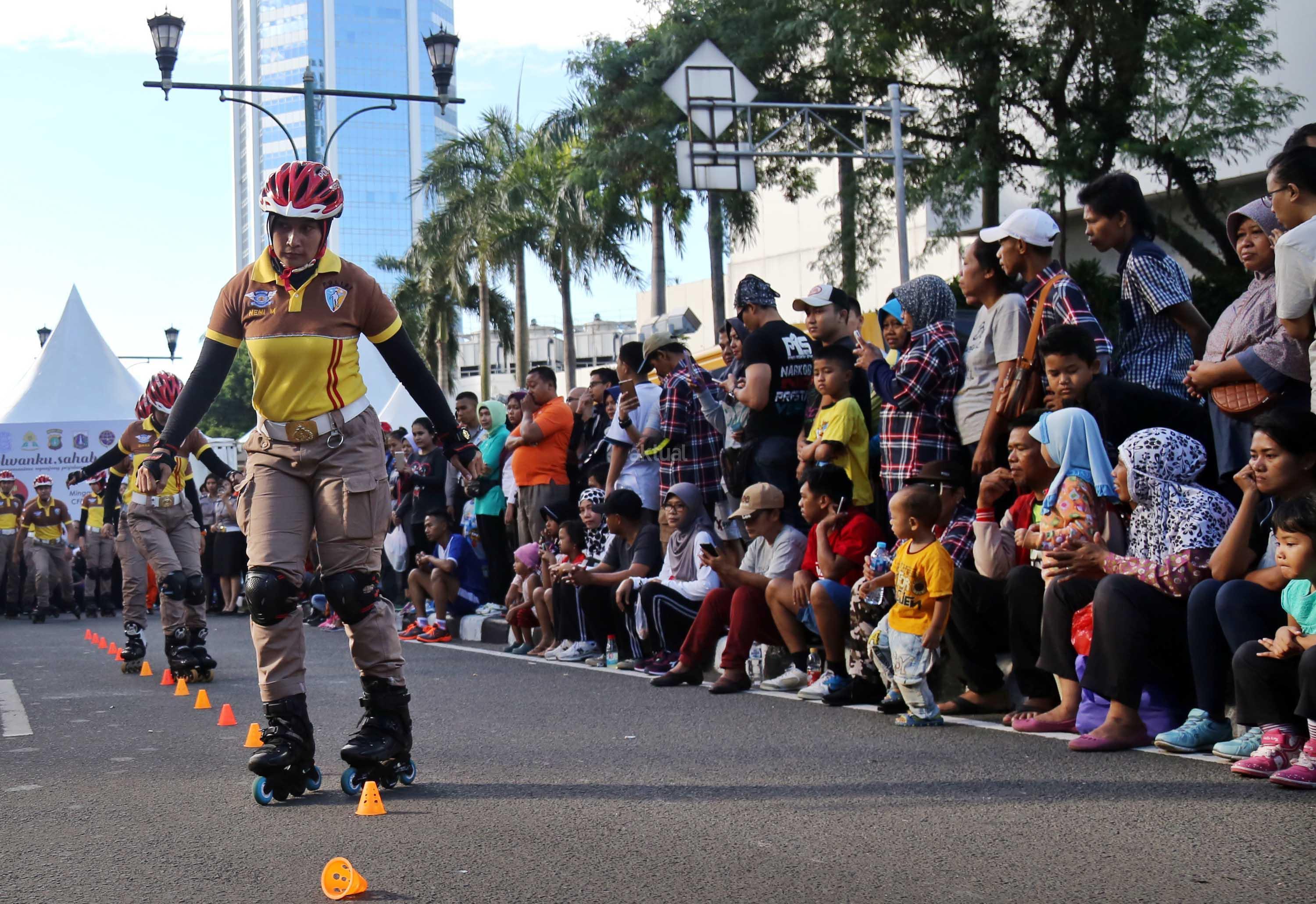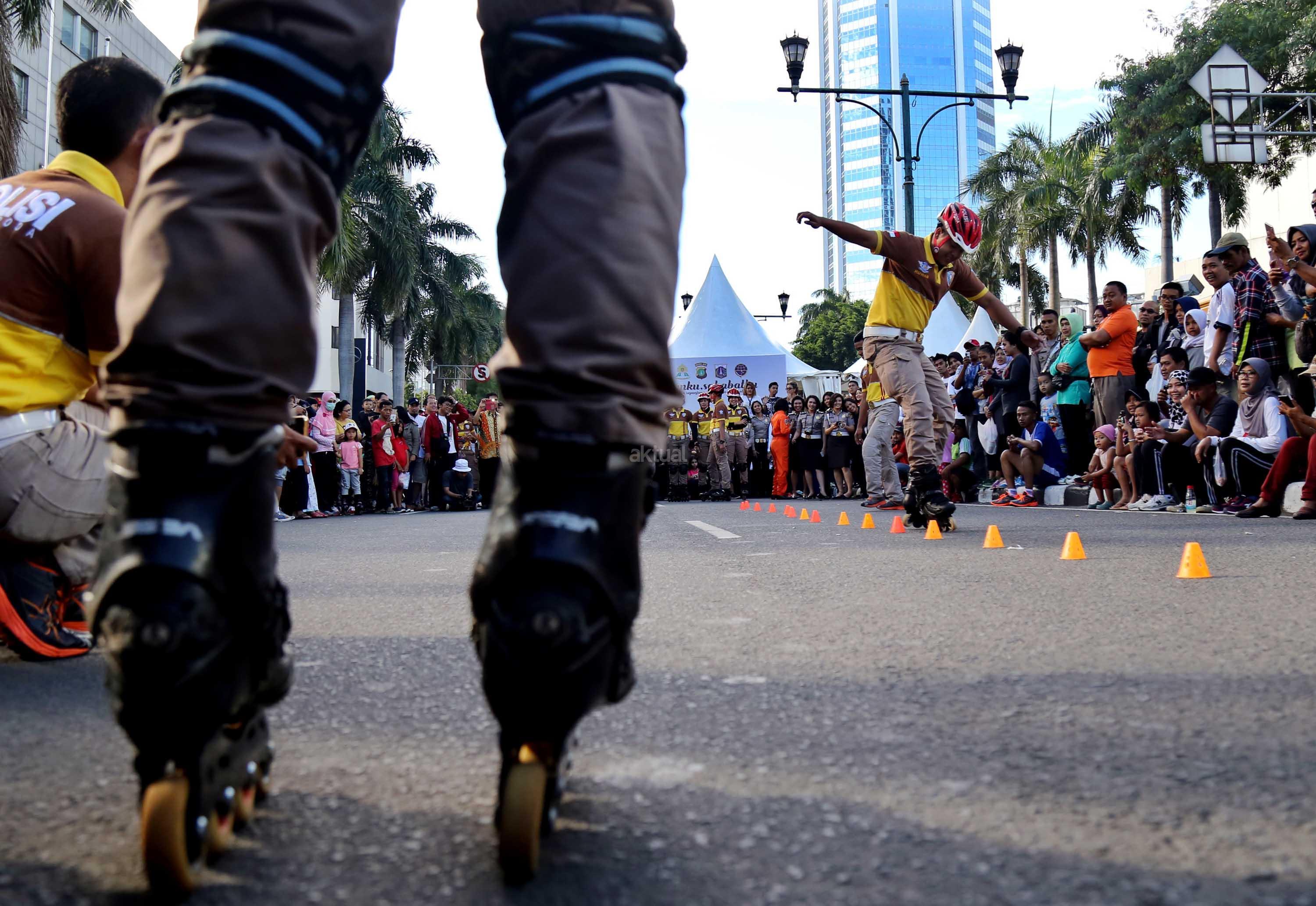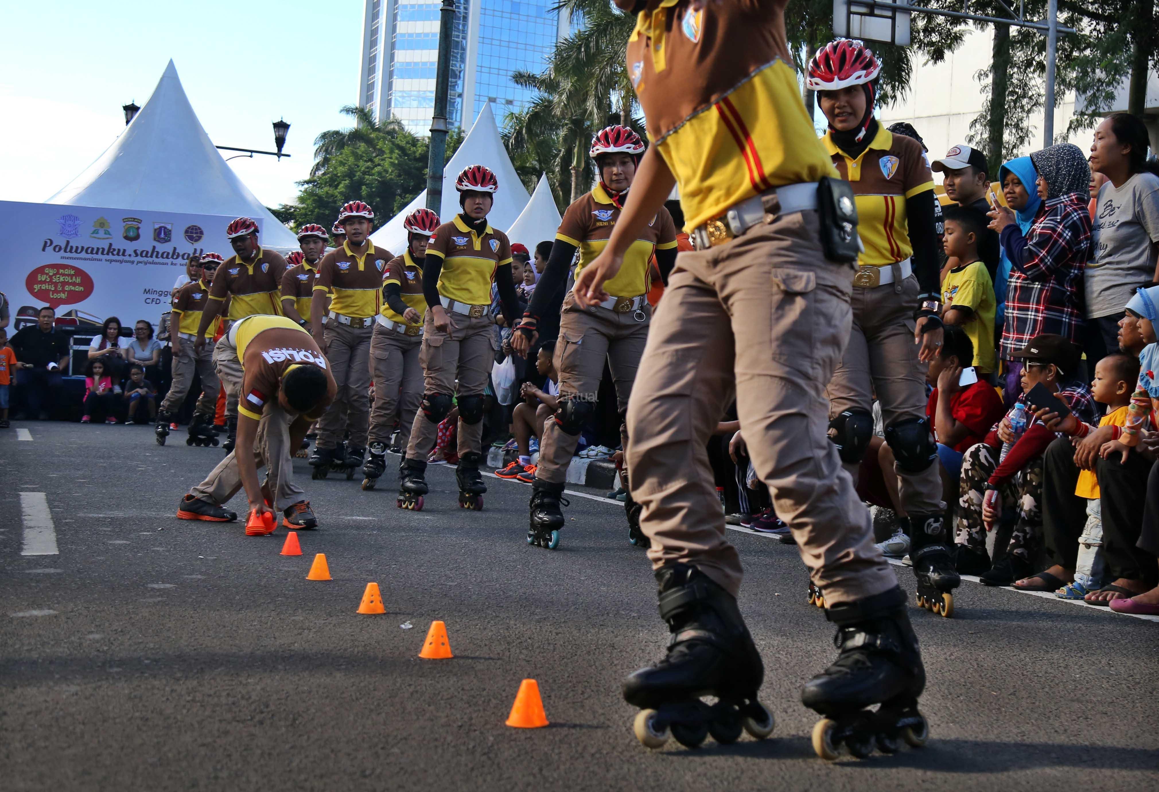Polisi patroli sepatu roda menampilkan atraksi di area Car Free Day di Bundaran HI, Jakarta, Minggu (9/4). Patroli polisi ini dilakukan untuk menjaga ketertiban serta keamanan bagi warga yang berolahraga. AKTUAL/Tino Oktaviano