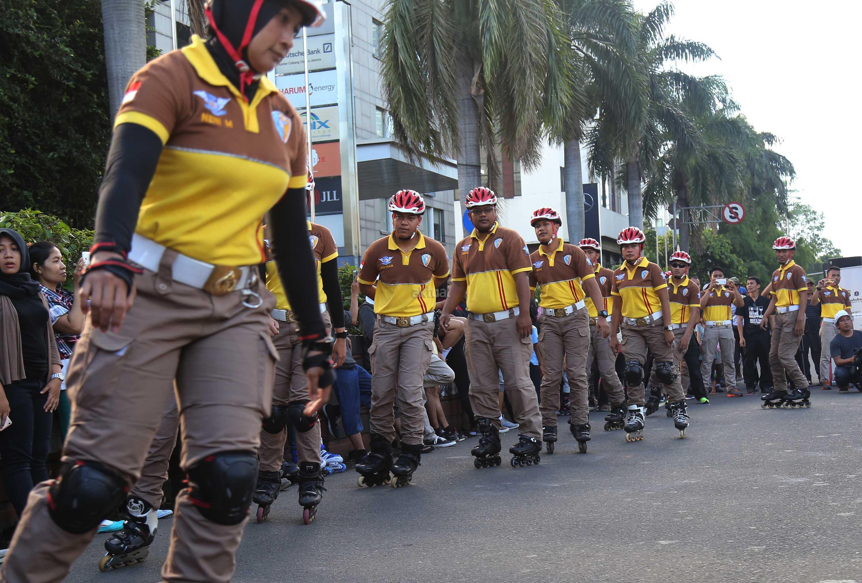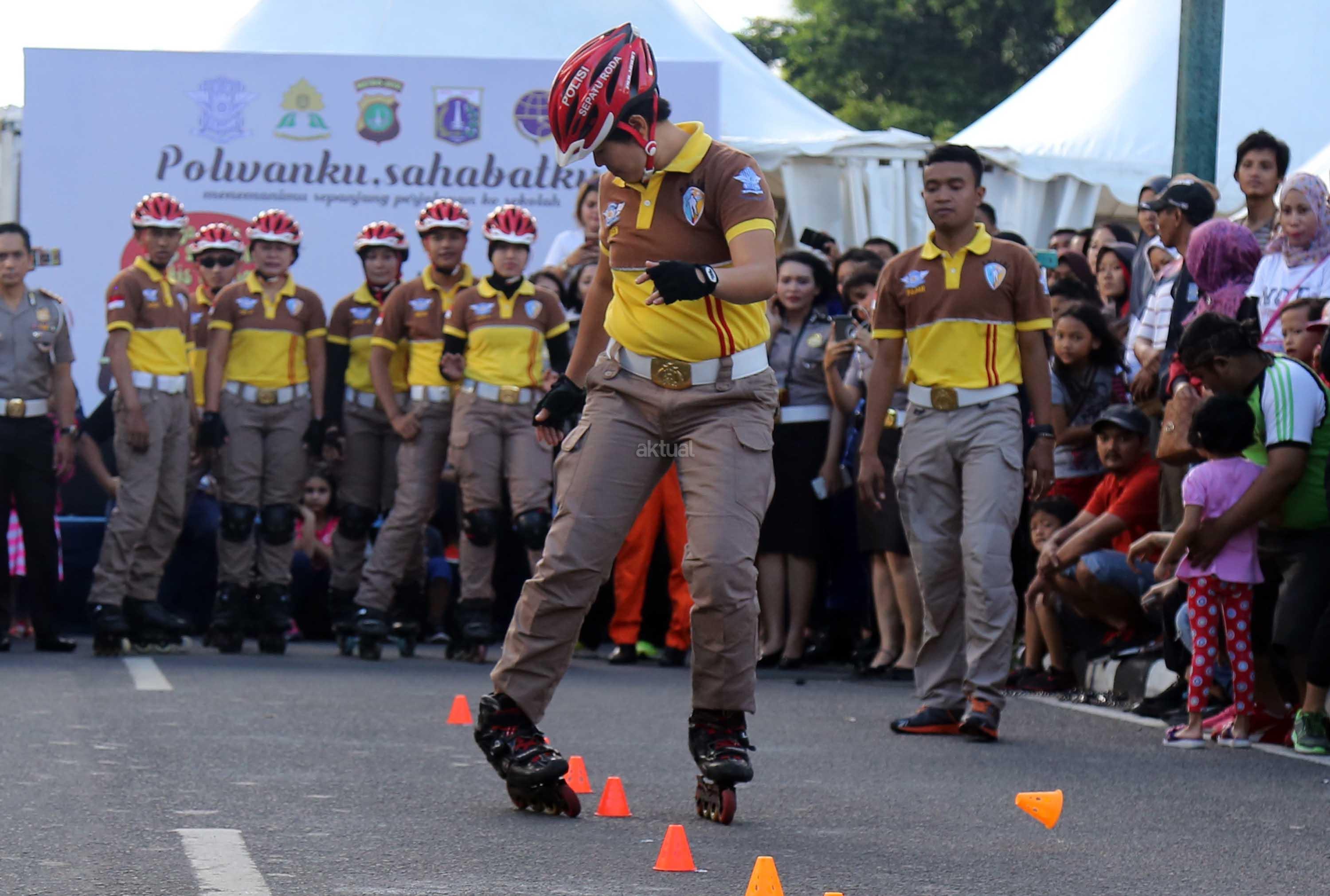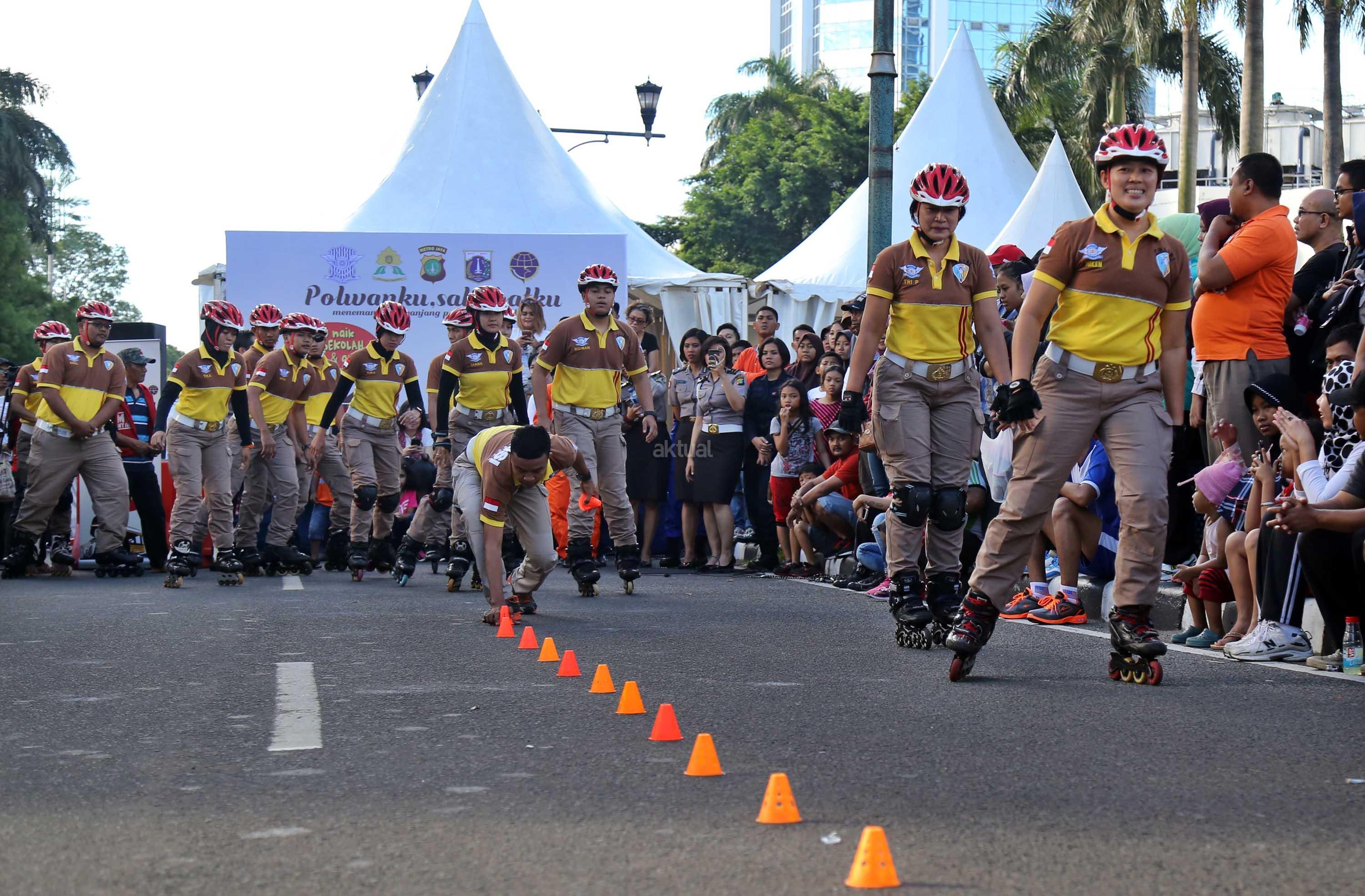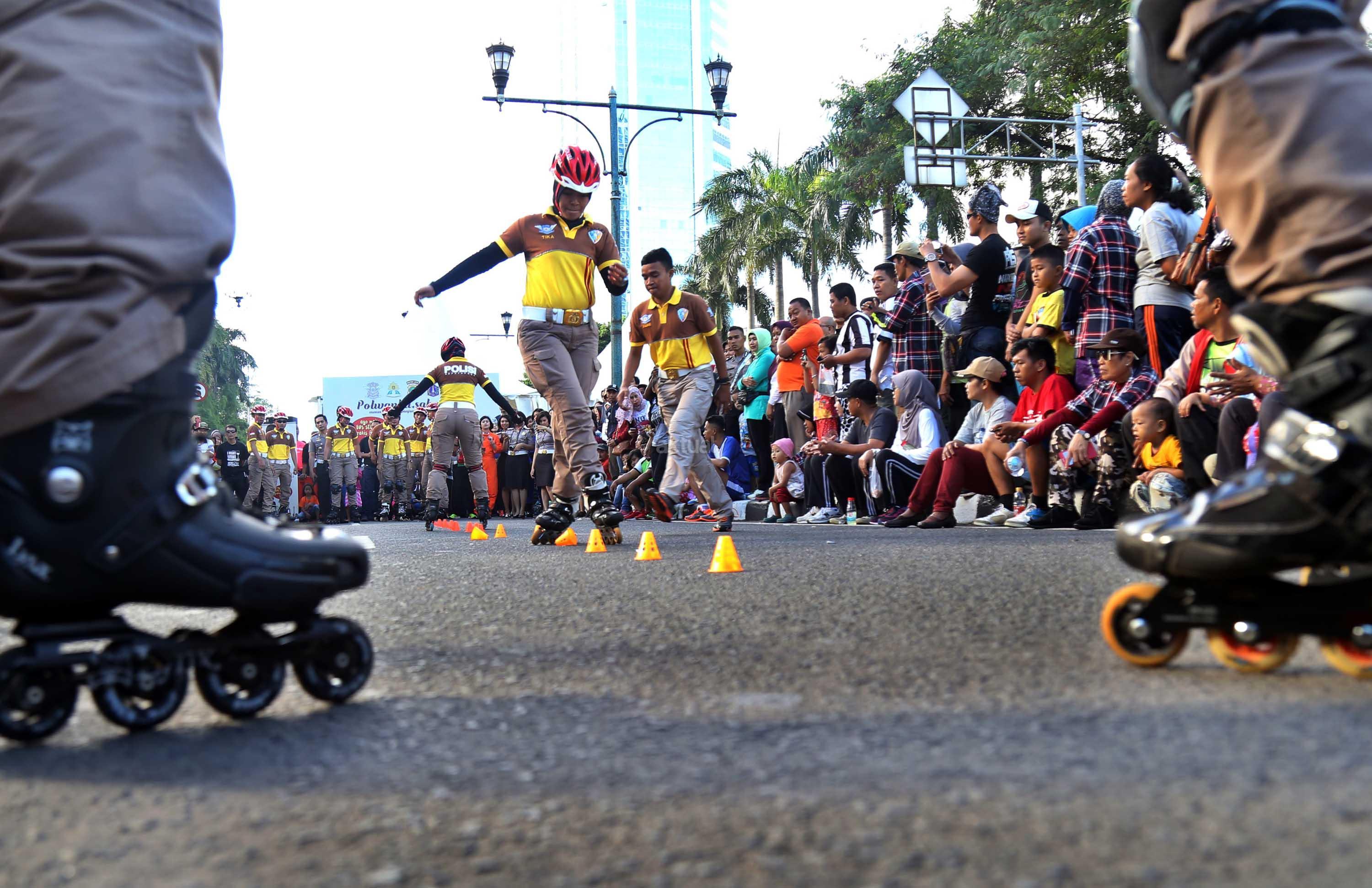 Polisi patroli sepatu roda menampilkan atraksi di area Car Free Day di Bundaran HI, Jakarta, Minggu (9/4). Patroli polisi ini dilakukan untuk menjaga ketertiban serta keamanan bagi warga yang berolahraga. AKTUAL/Tino Oktaviano