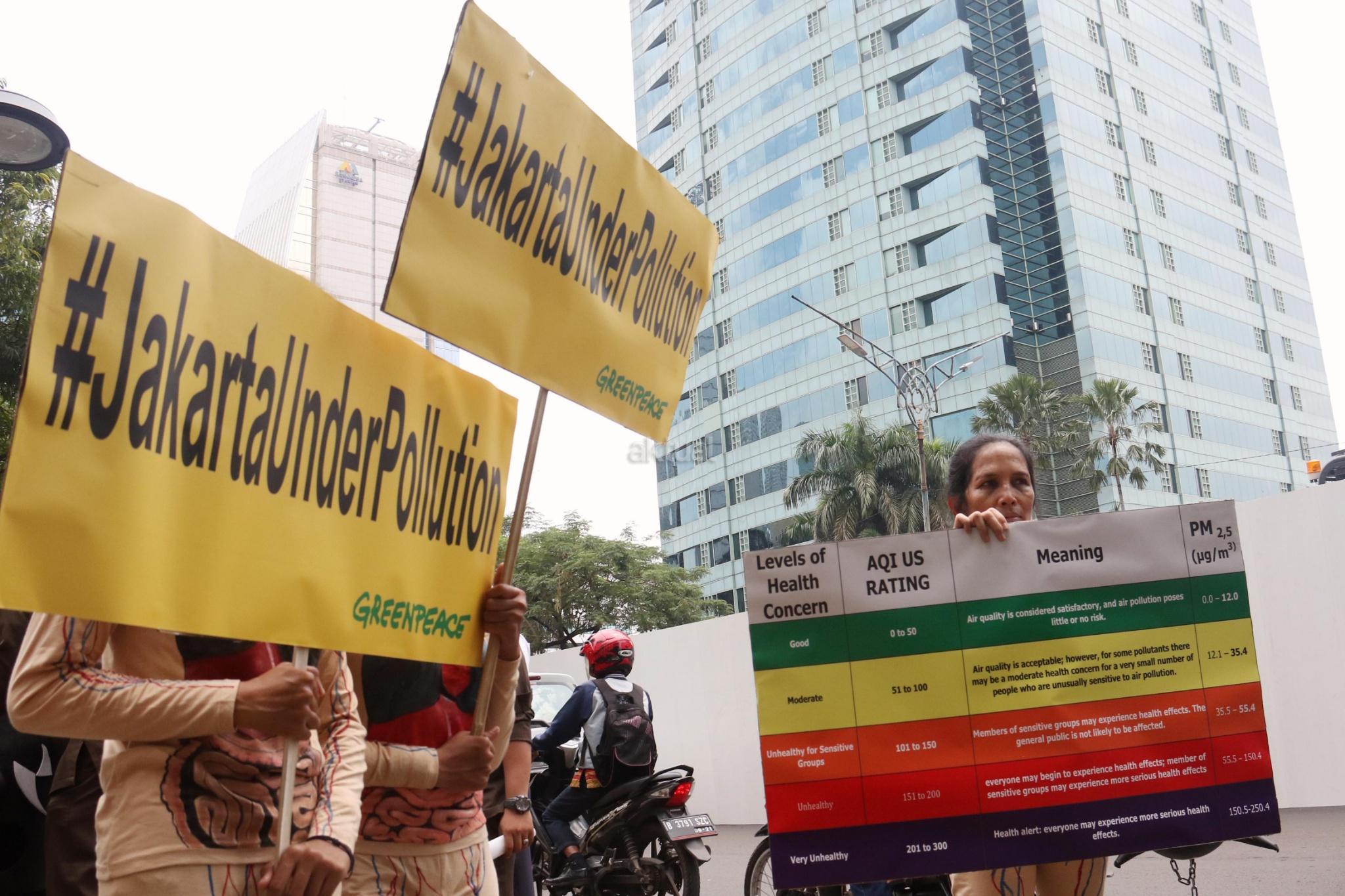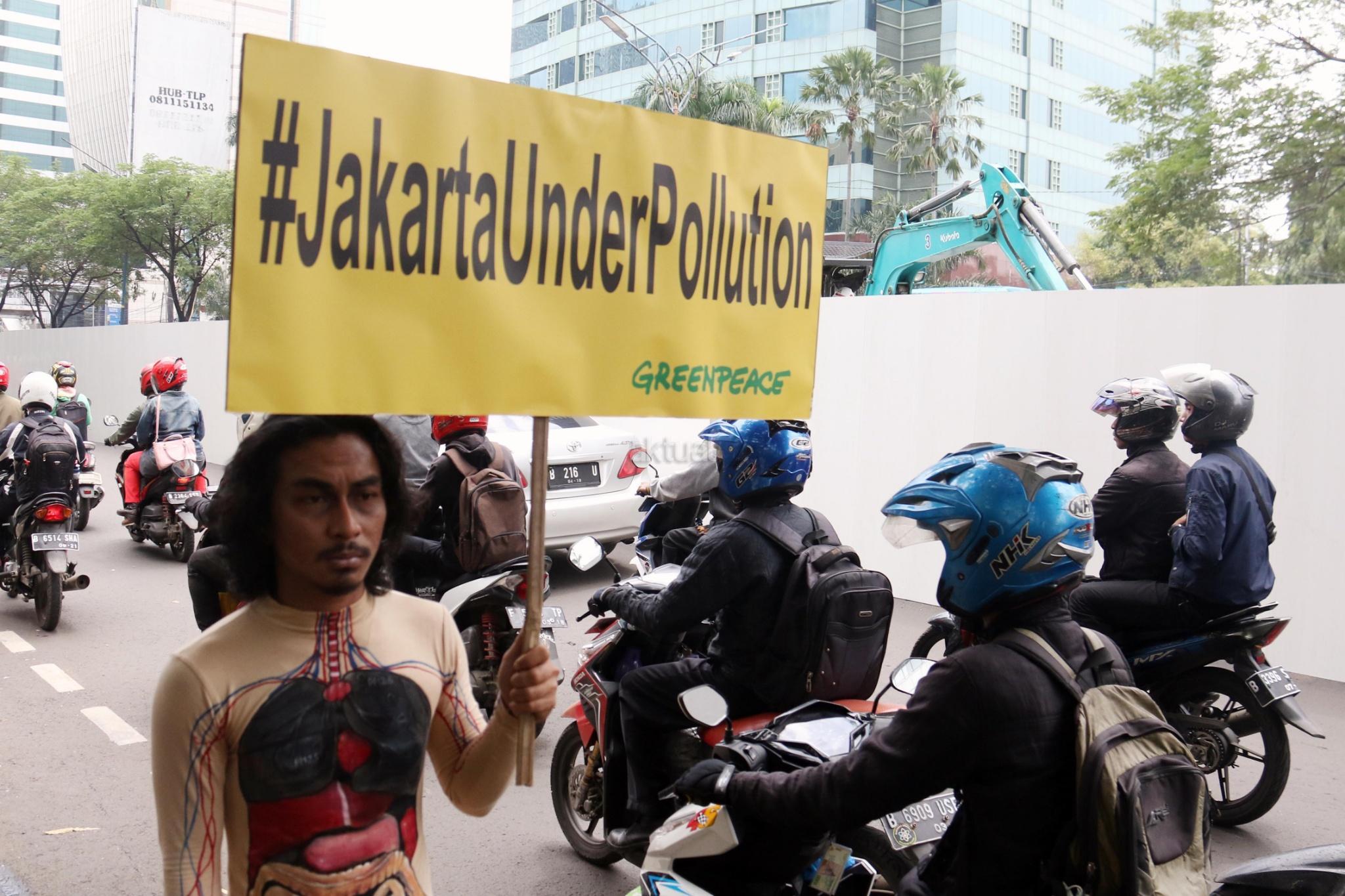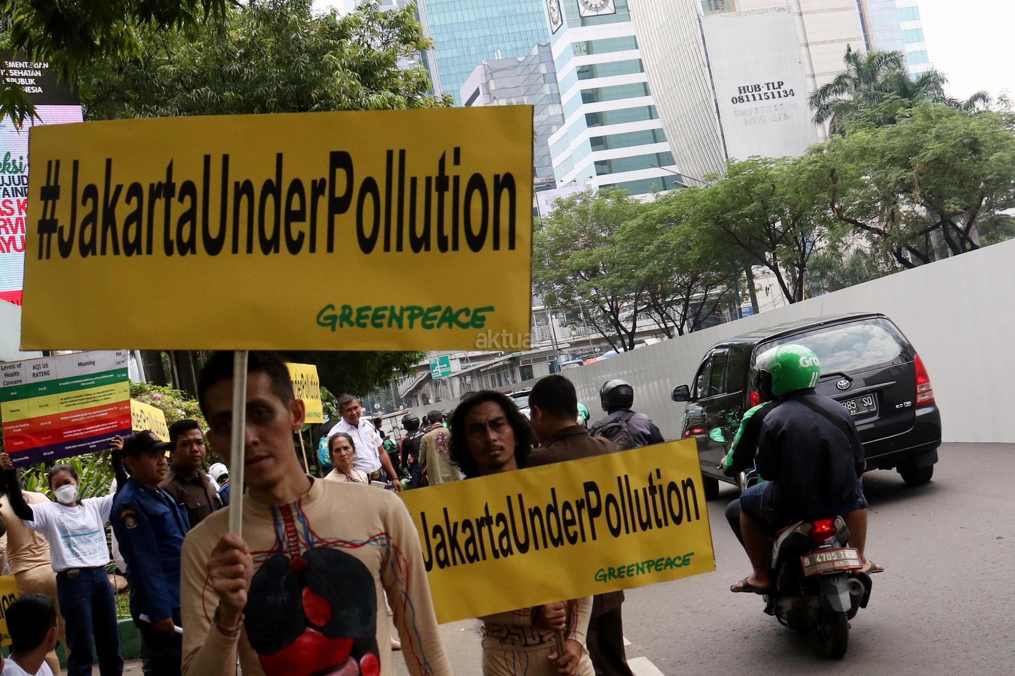 Sejumlah aktivis lingkungan yang tergabung dalam Greenpeace Indonesia melakukan aksi unjuk rasa di depan Gedung Kementerian Kesehatan, di Jakarta, Kamis (28/9/2017).Dalam aksinya para aktivis Greenpeace mengingatkan masyarakat tentang bahaya polusi udara. AKTUAL/Munzir