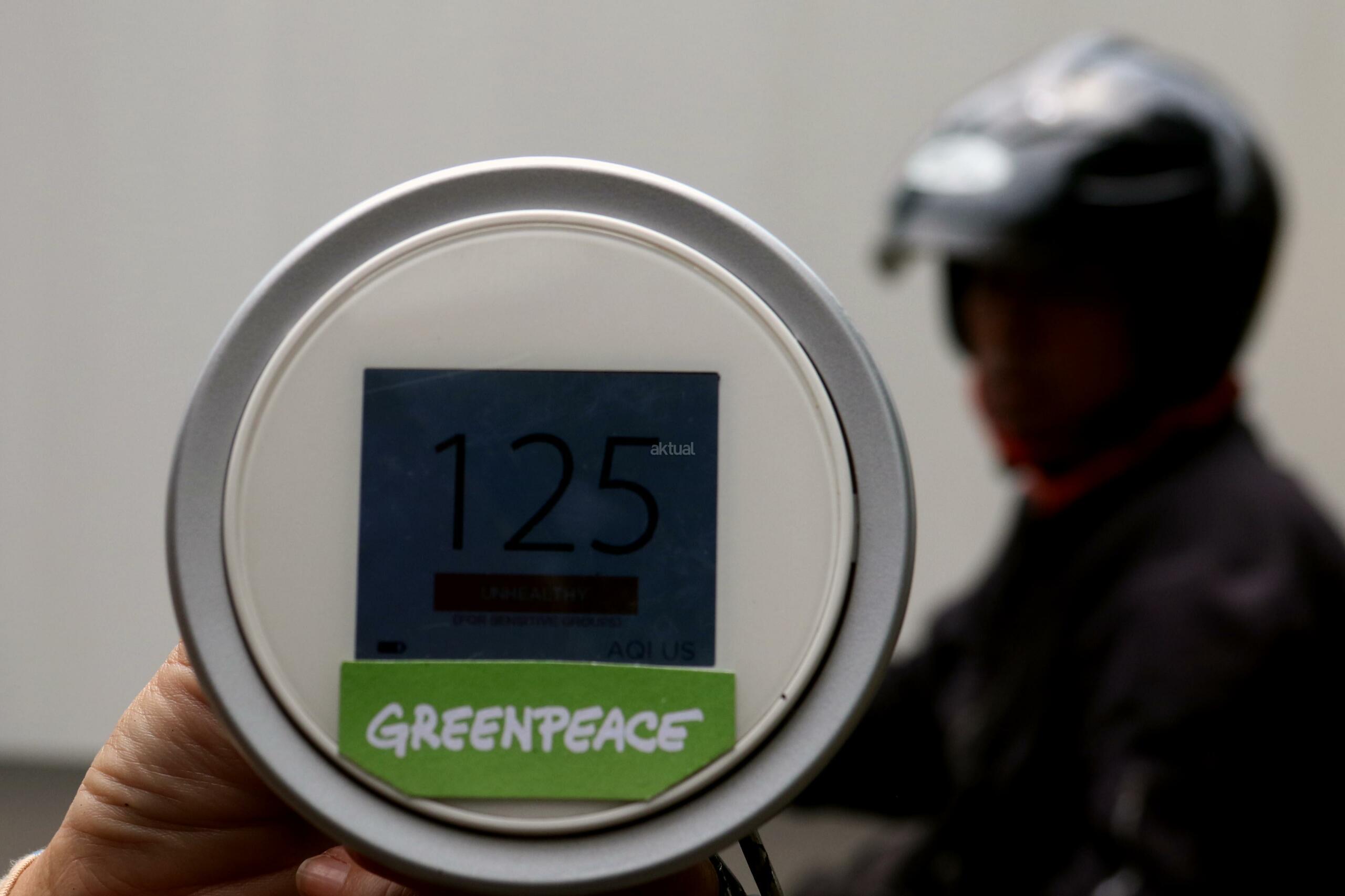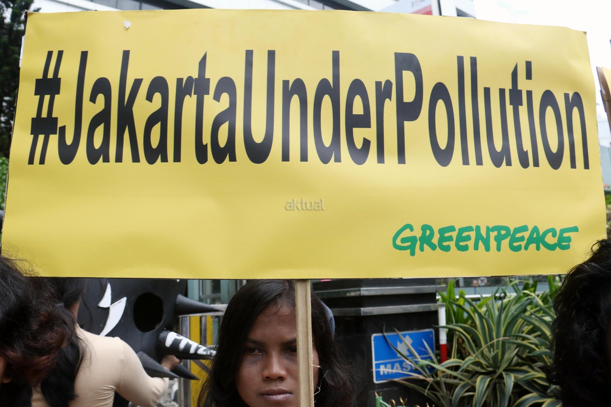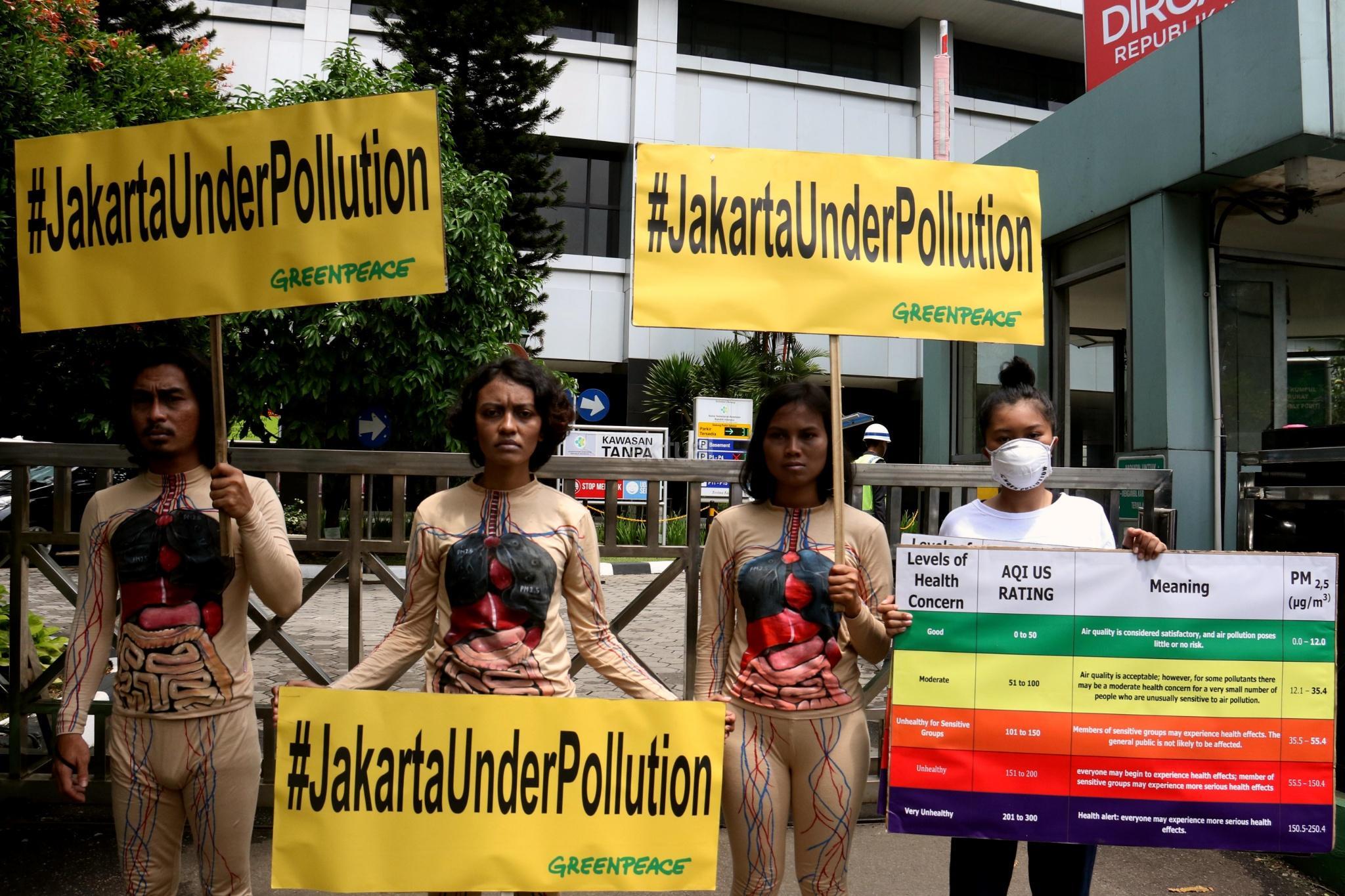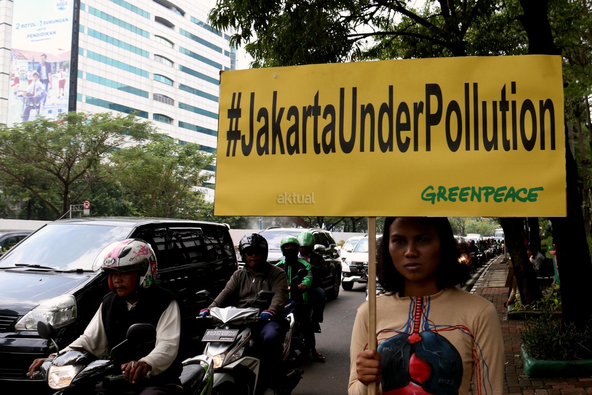 Sejumlah aktivis lingkungan yang tergabung dalam Greenpeace Indonesia melakukan aksi unjuk rasa di depan Gedung Kementerian Kesehatan, di Jakarta, Kamis (28/9/2017).Dalam aksinya para aktivis Greenpeace mengingatkan masyarakat tentang bahaya polusi udara. AKTUAL/Munzir
