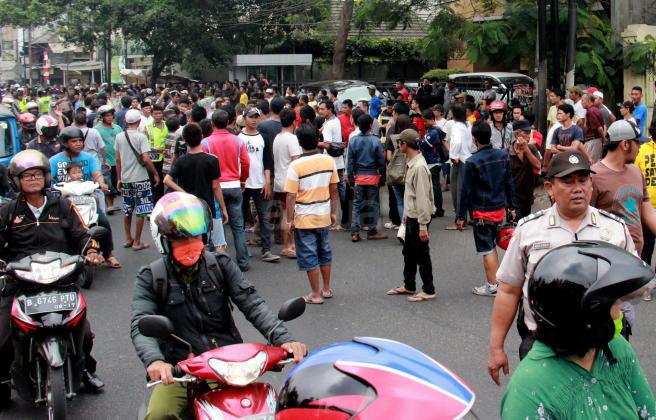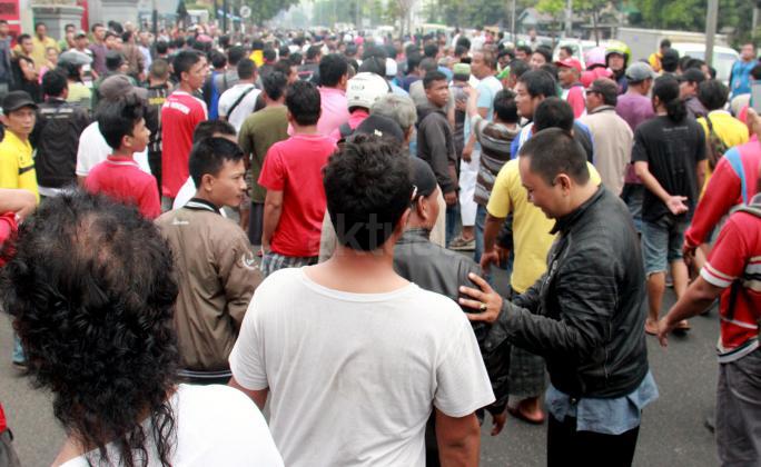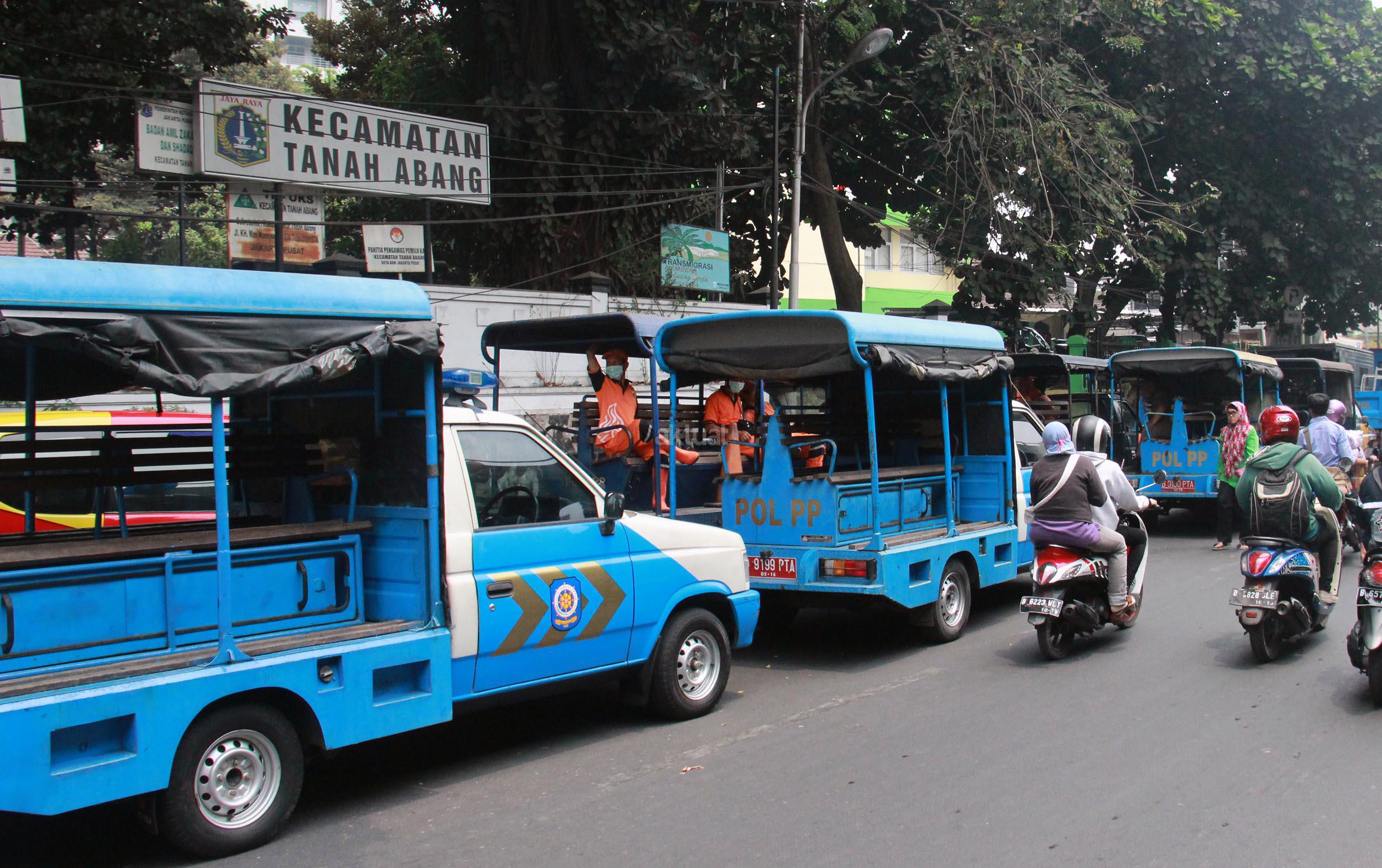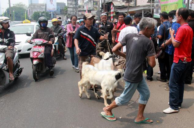 Ratusan pedagang dan warga melakukan penolakan penggusuran lapak penjual hewan kurban di sepanjang Jalan KH Mas Mansyur, Tanah Abang, Jakarta Pusat, Senin (21/9/2015). Para pedagang menolak ditertibkan karena menurut mereka menjual hewan kurban itu tidak melanggar hukum.