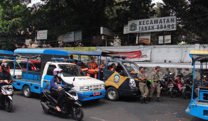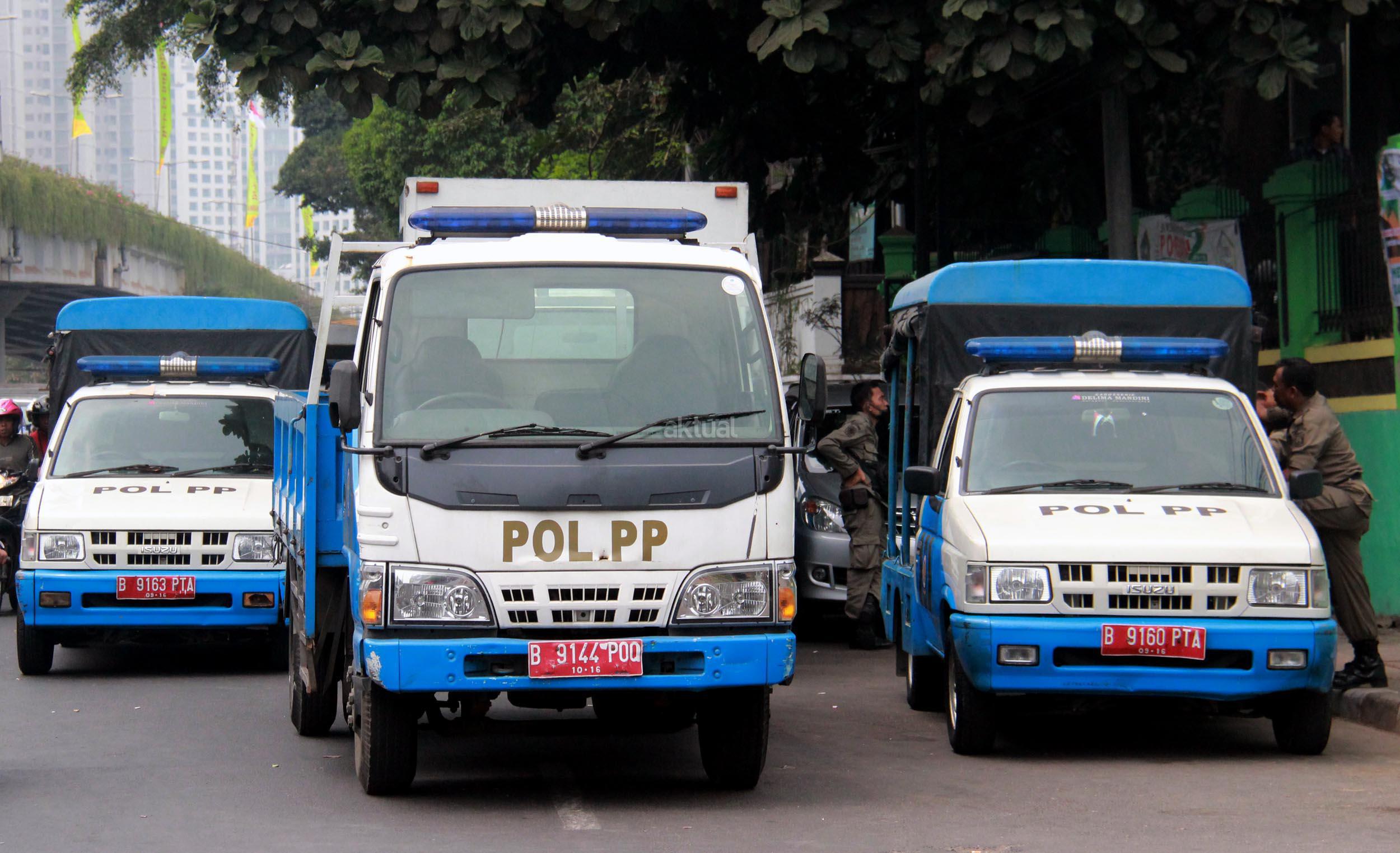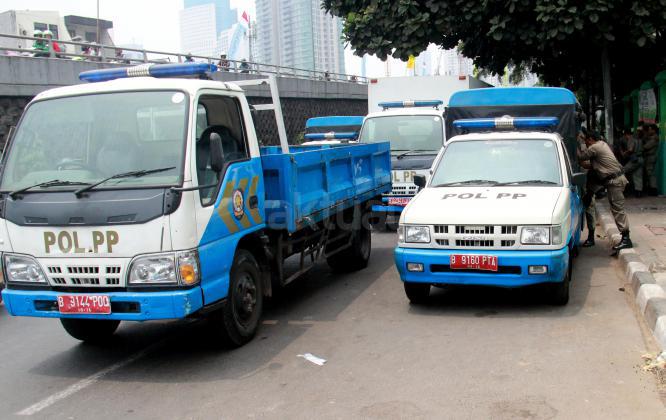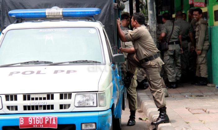 Petugas Satpol PP telihat santai di depan kantor Kecamatan Tanah Abang usai di usir para pedagang hewan kurban yang berada di Jalan. KH Mas Mansyur, Tanah Abang, Jakarta Pusat.