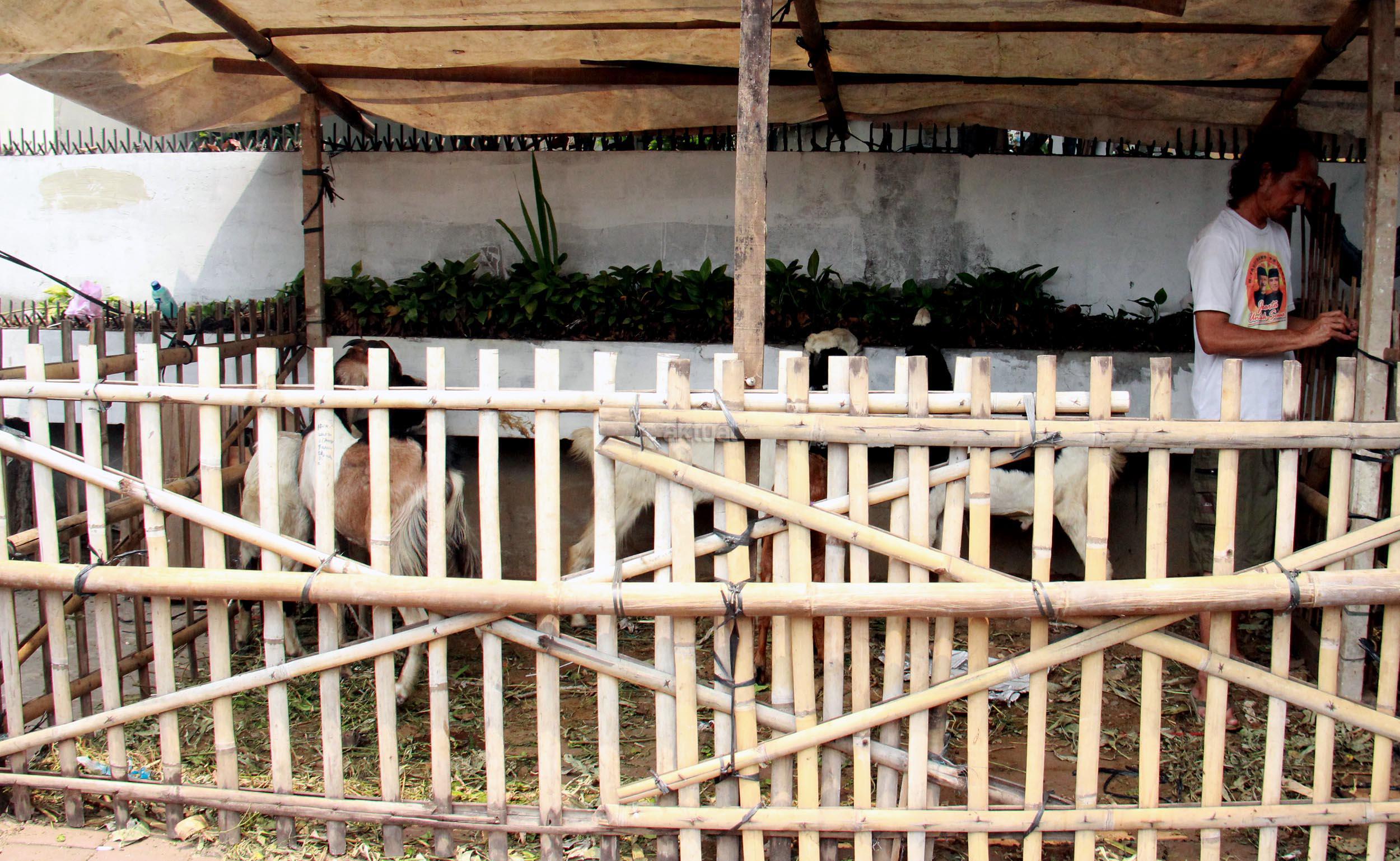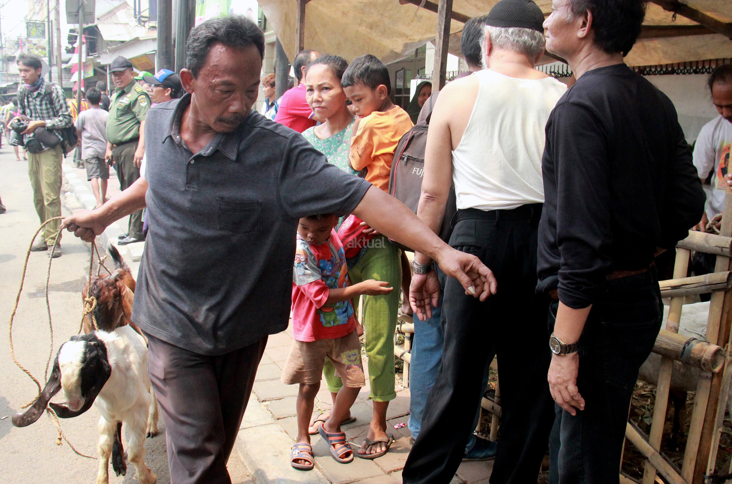 Terlihat pedagang hewan kurban mengembalikan hewan kurbannya ke kandang yang berada di trotoar, Jalan KH Mas Mansyur, Tanah Abang Jakarta Pusat, Senin (21/9/2015). Para pedagang menolak ditertibkan karena menurut mereka menjual hewan kurban itu tidak melanggar hukum.