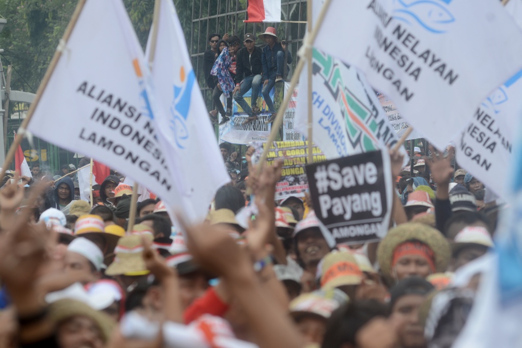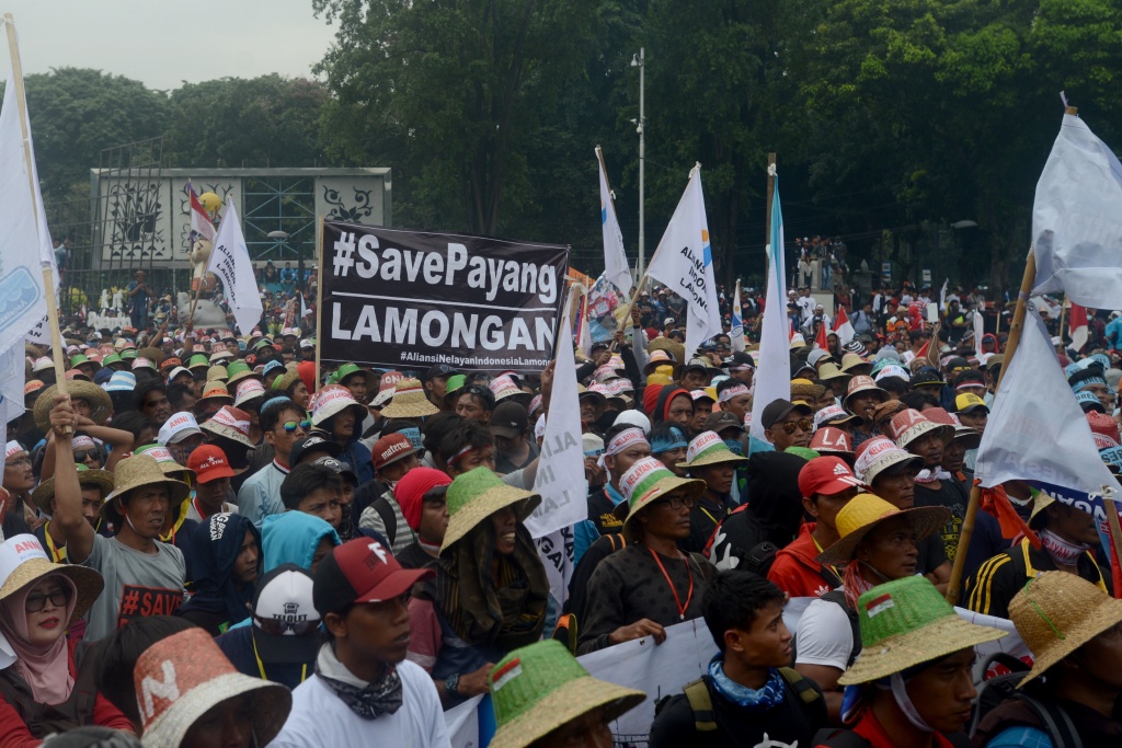 Ratusan nelayan Cantrang memajang membawa berbagai atribut seperti bendera, poster dan spanduk saat berunjuk rasa di depan Istana Negara, Jakarta, Rabu, (17/1/2018). Mereka juga mendesak pencabutan Peraturan Menteri Kelautan Dan Perikanan nomor 02 Tahun 2015 tentang larangan alat tangkap pukat tarik (Cantrang). AKTUAL/Tino Oktaviano
