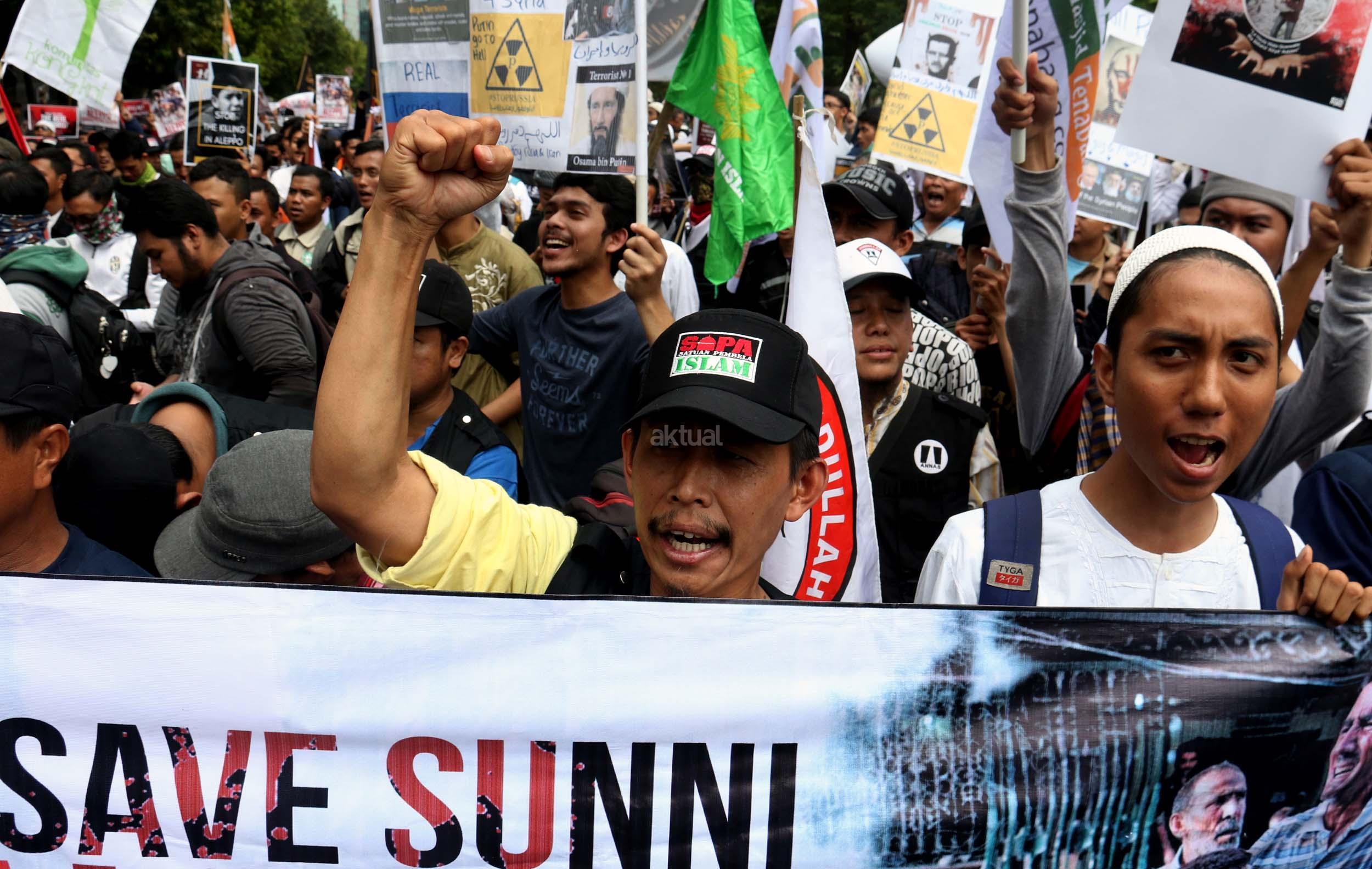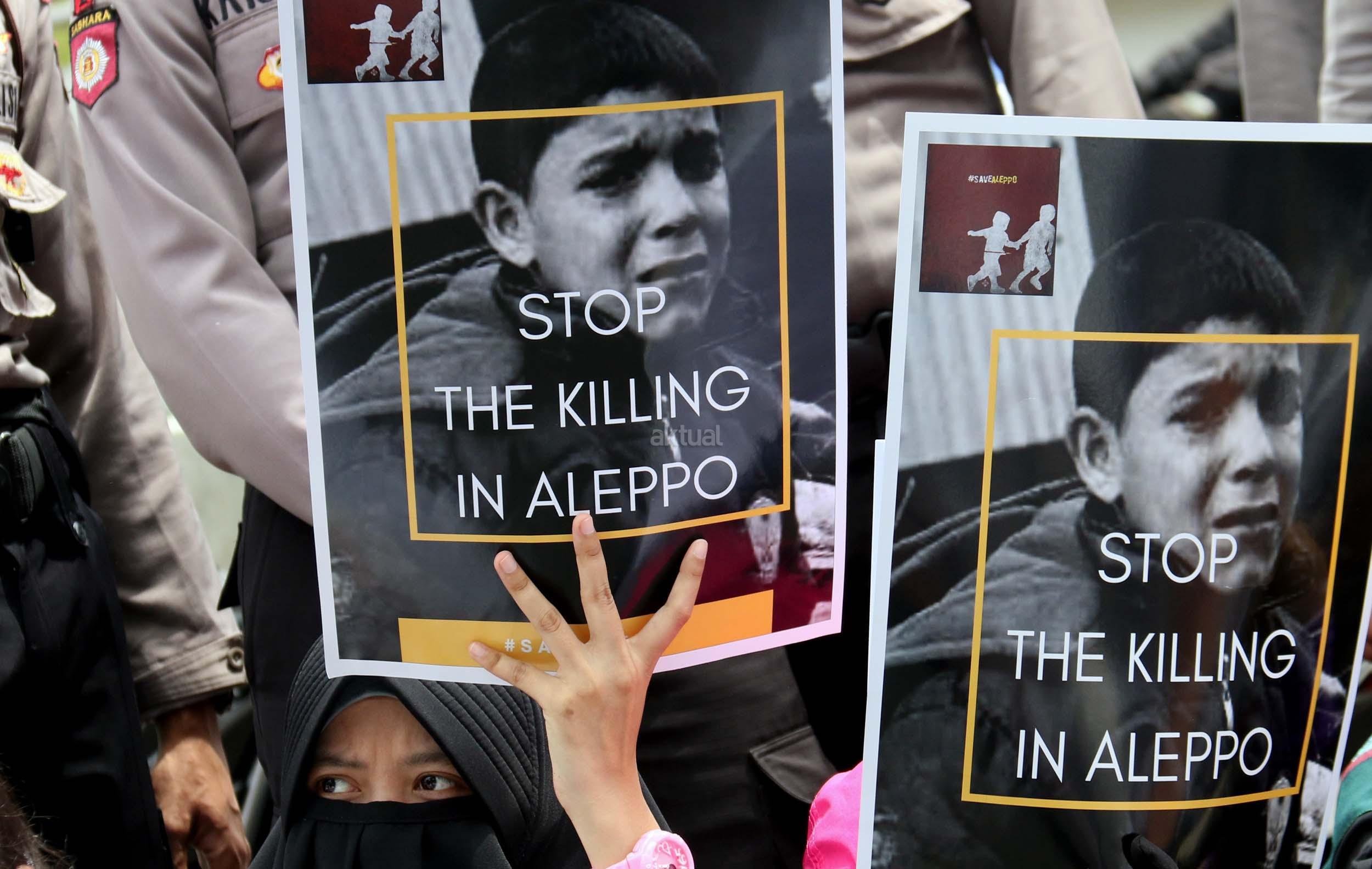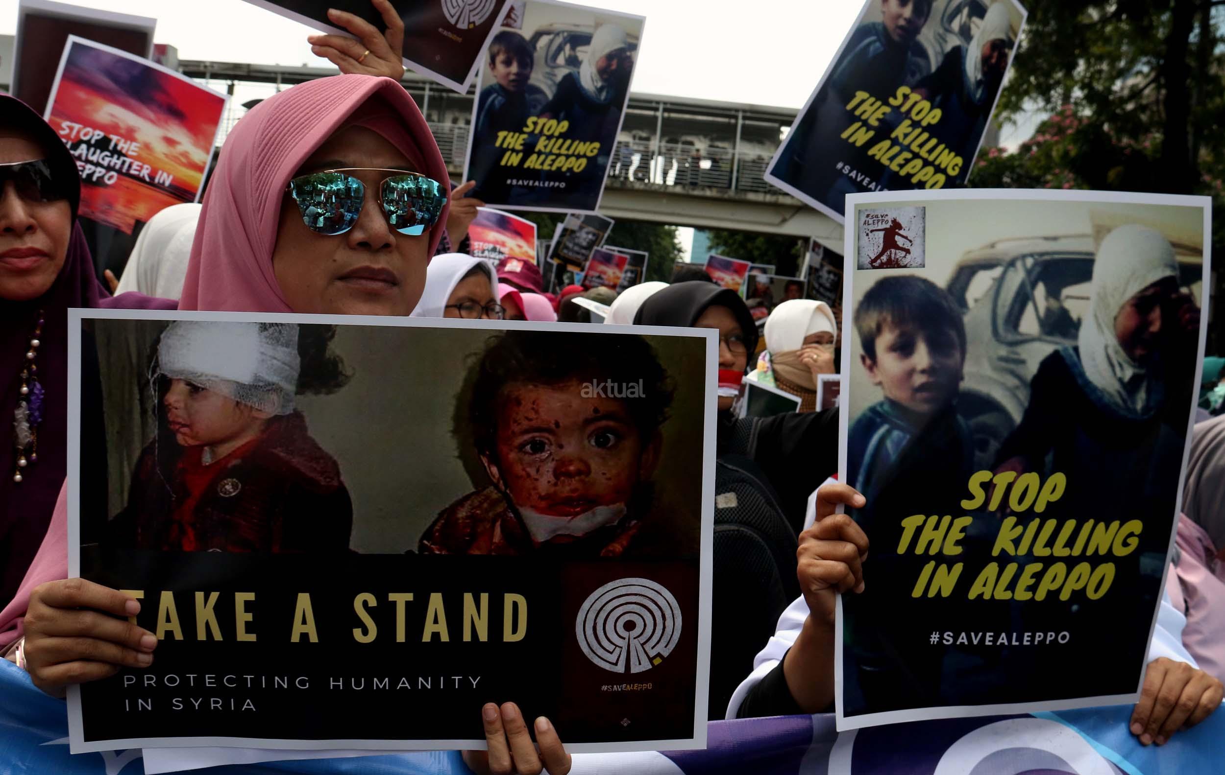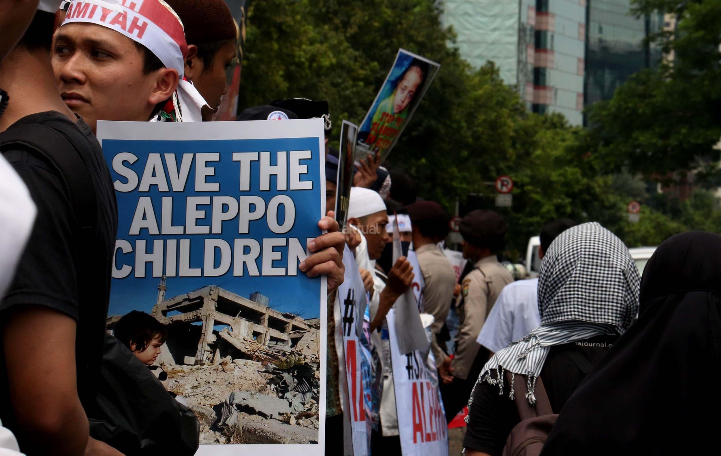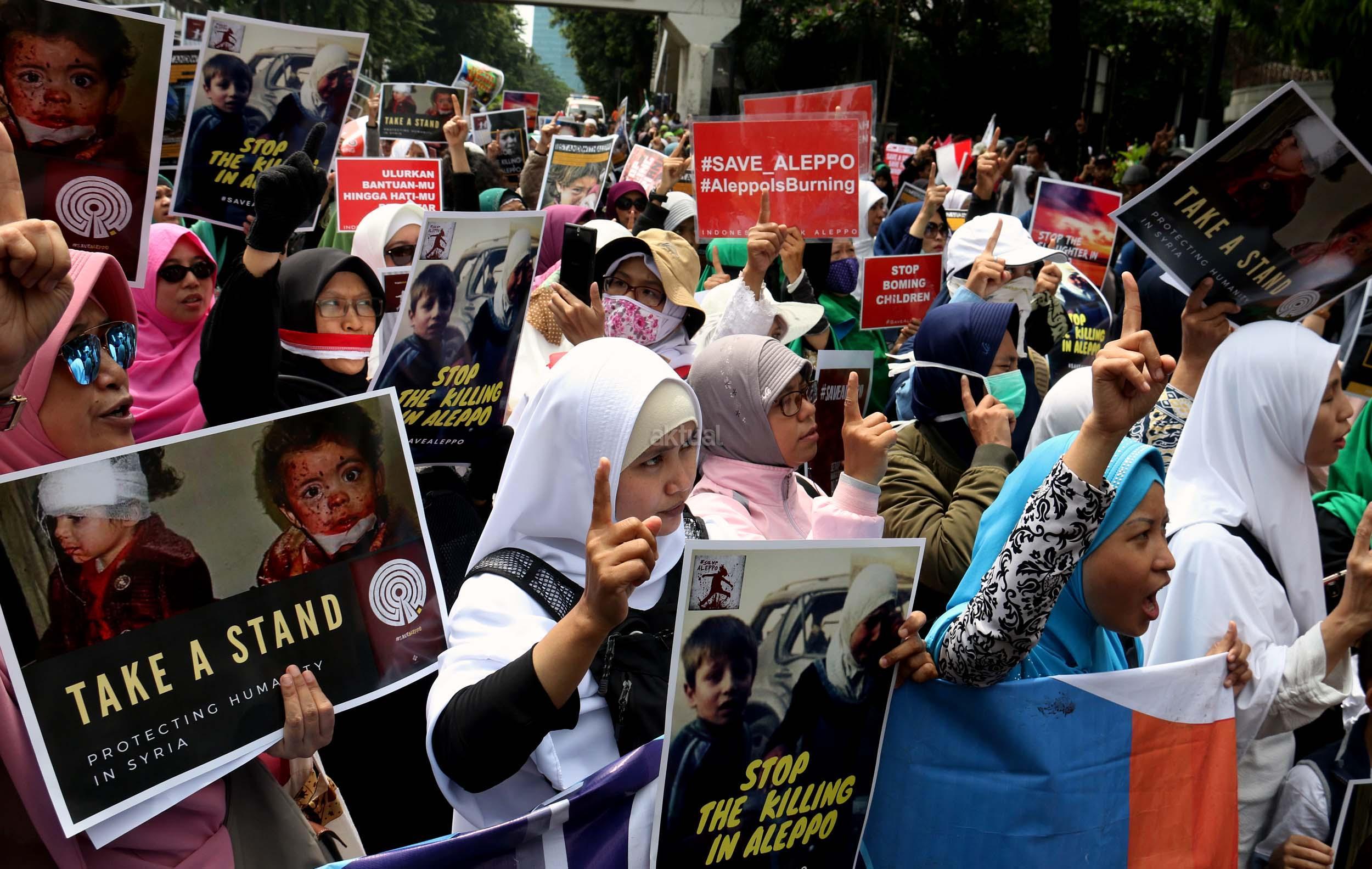 Dalam aksinya umat muslim mengecam pembantaian umat muslim Aleppo, Suriah yang dilakukan oleh rezim Bashar Hafez al-Assad yang dibantu oleh Rusia dan massa juga mendesak Pemerintah Jokowi untuk mengusir Duta Besar Rusia. AKTUAL/Munzir