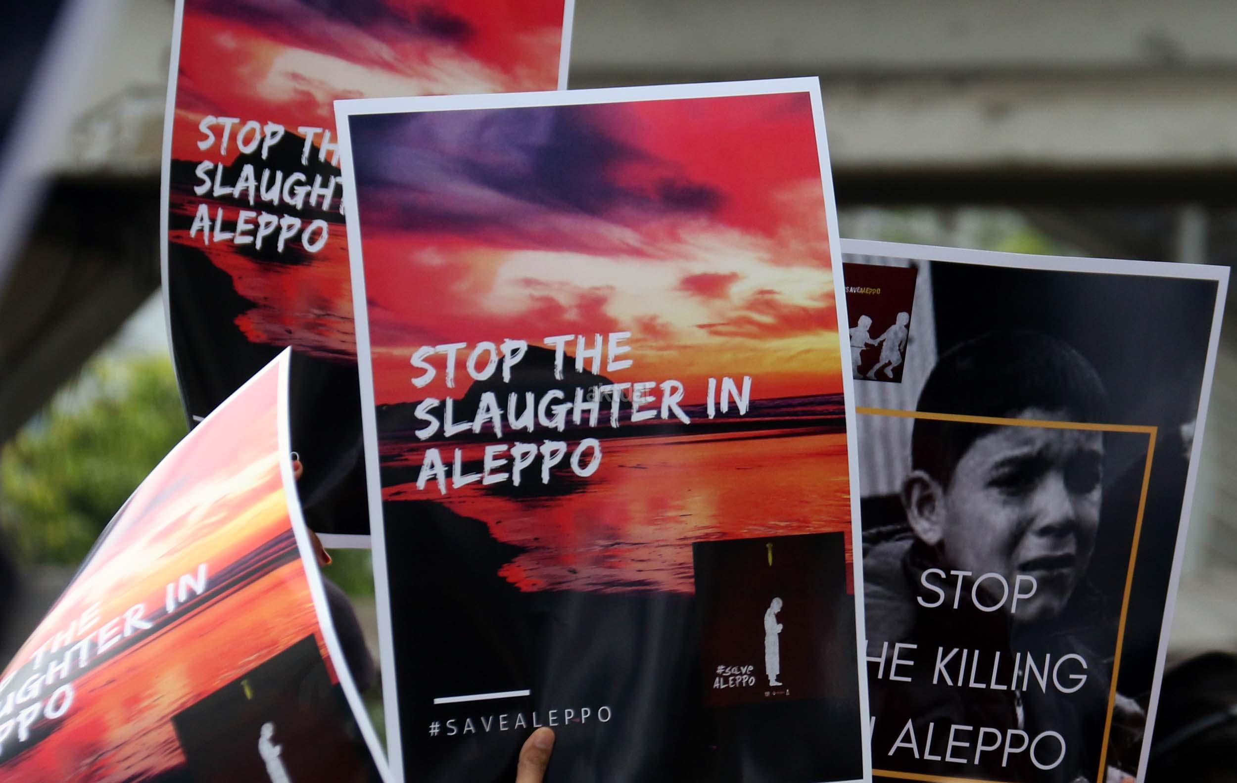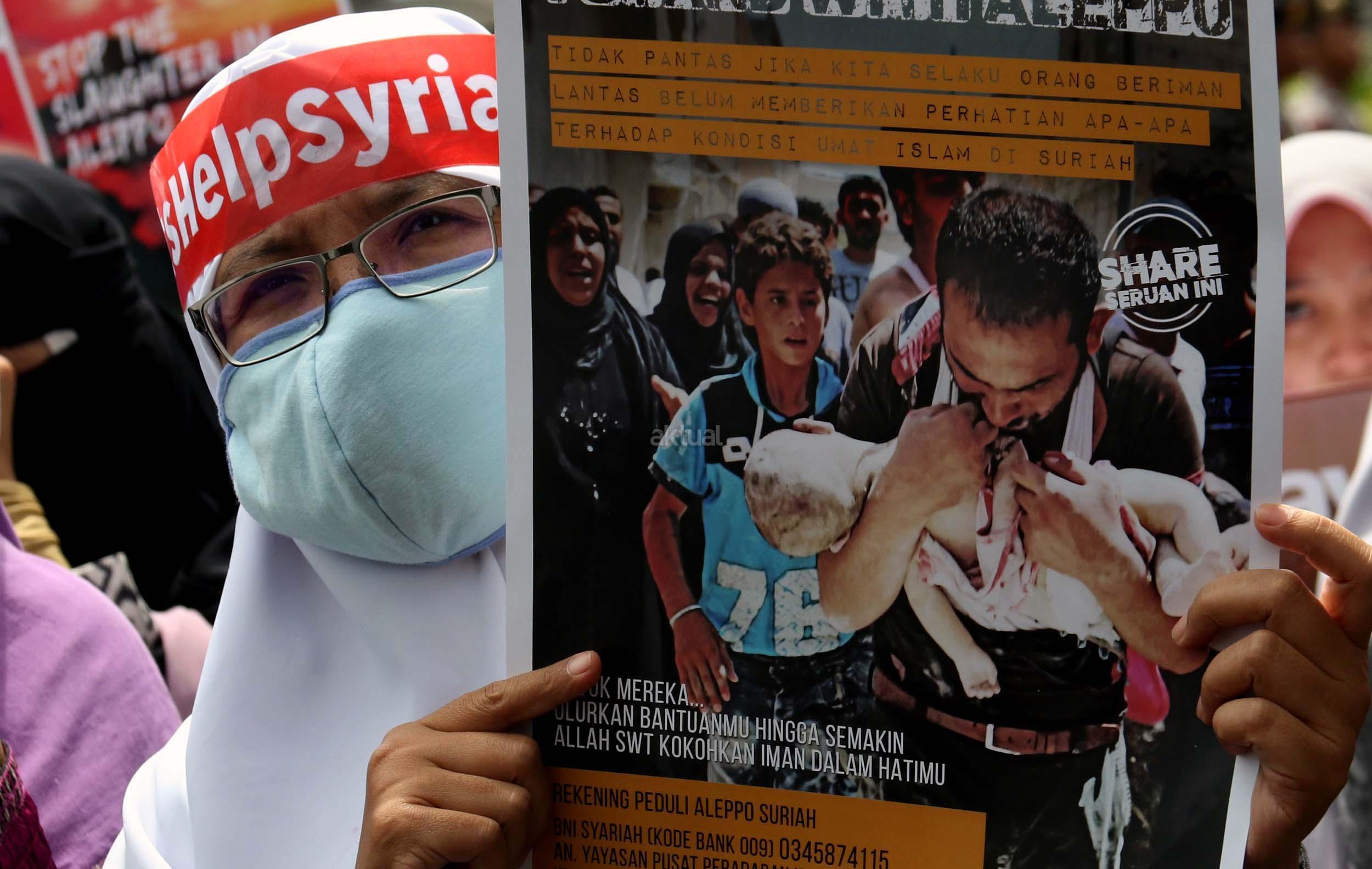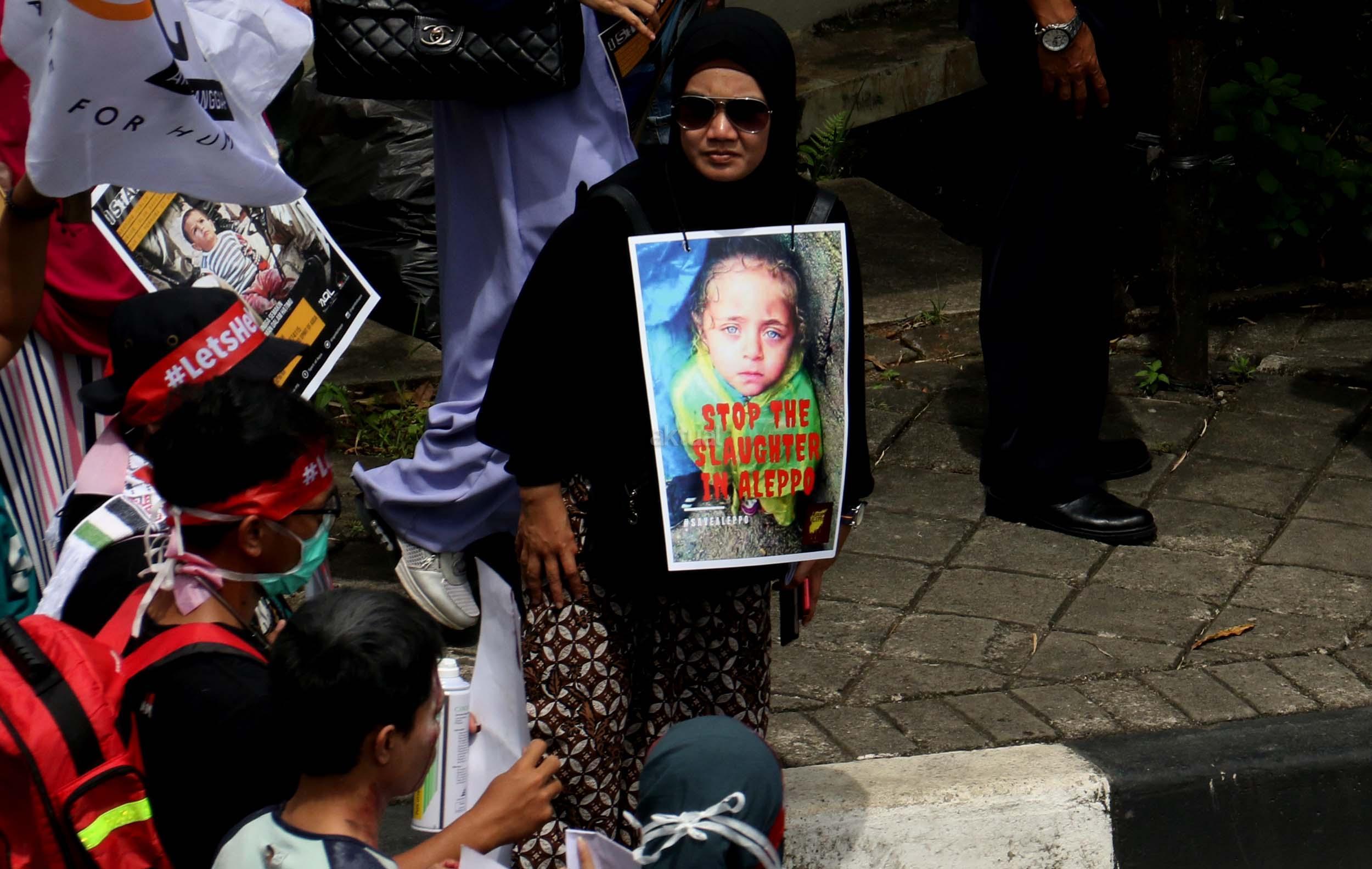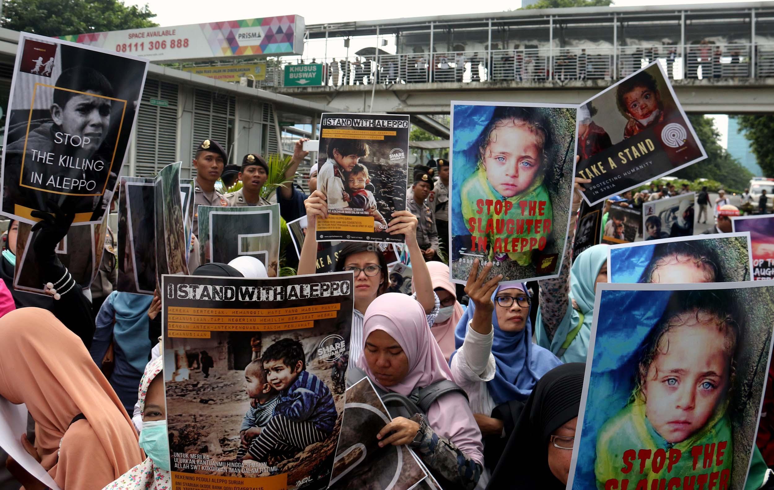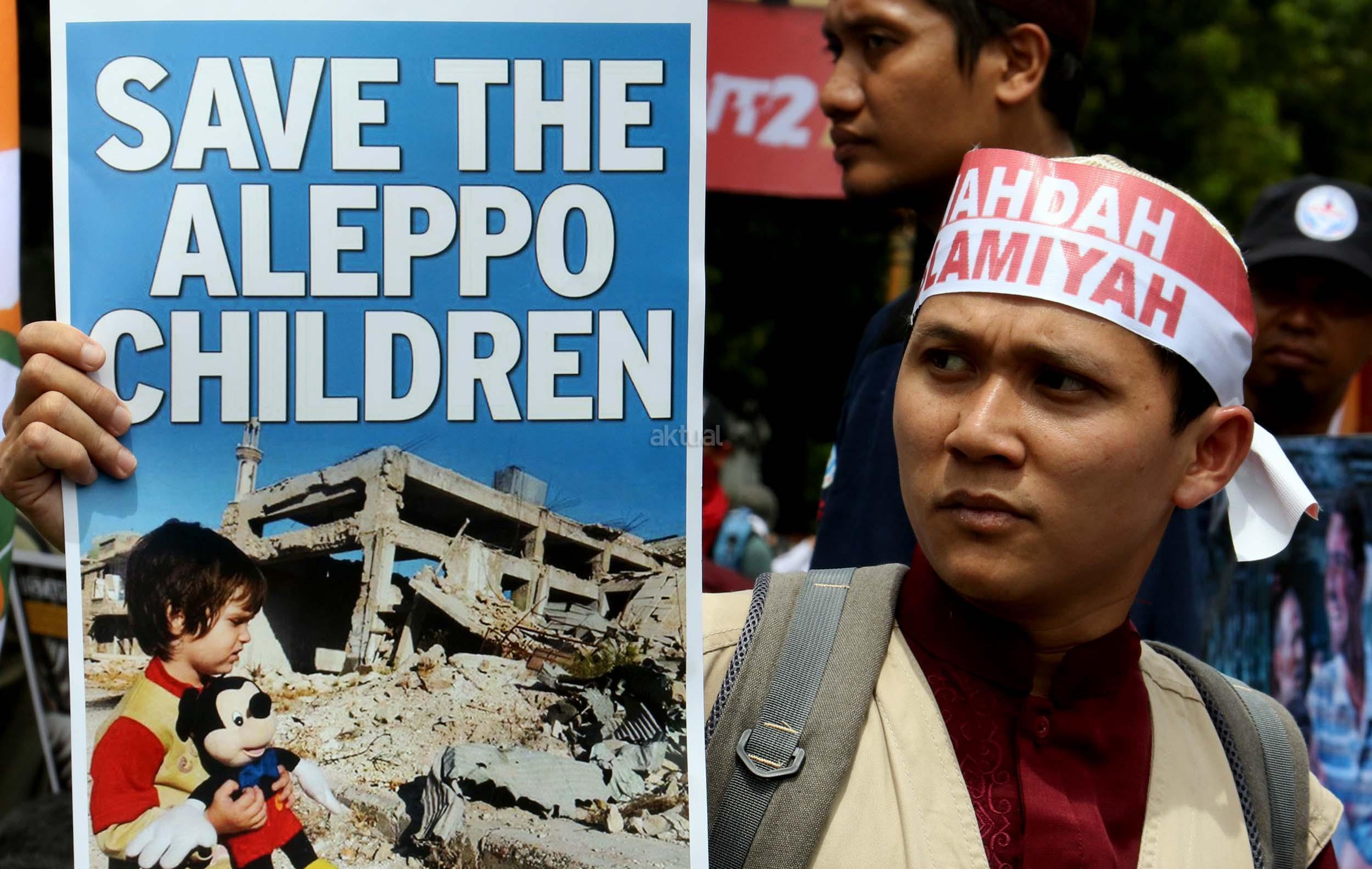 Dalam aksinya umat muslim mengecam pembantaian umat muslim Aleppo, Suriah yang dilakukan oleh rezim Bashar Hafez al-Assad yang dibantu oleh Rusia dan massa juga mendesak Pemerintah Jokowi untuk mengusir Duta Besar Rusia. AKTUAL/Munzir