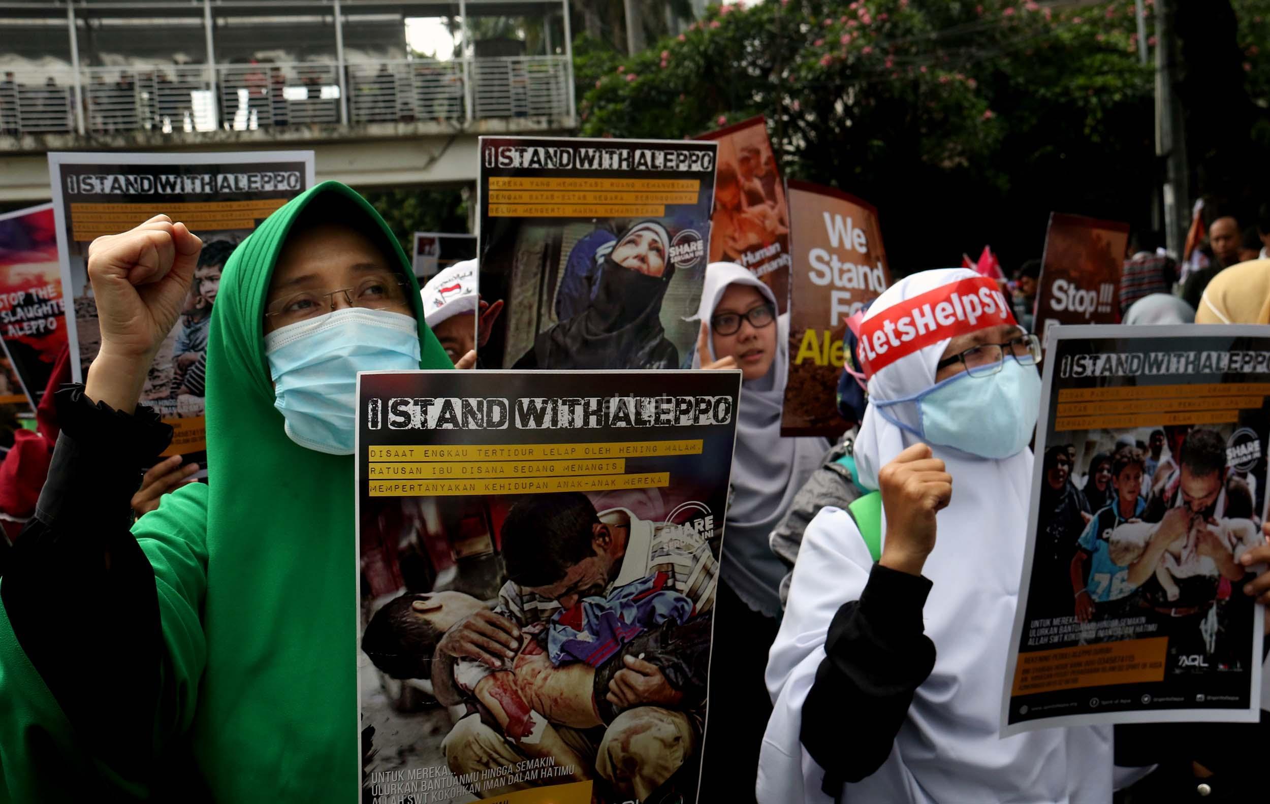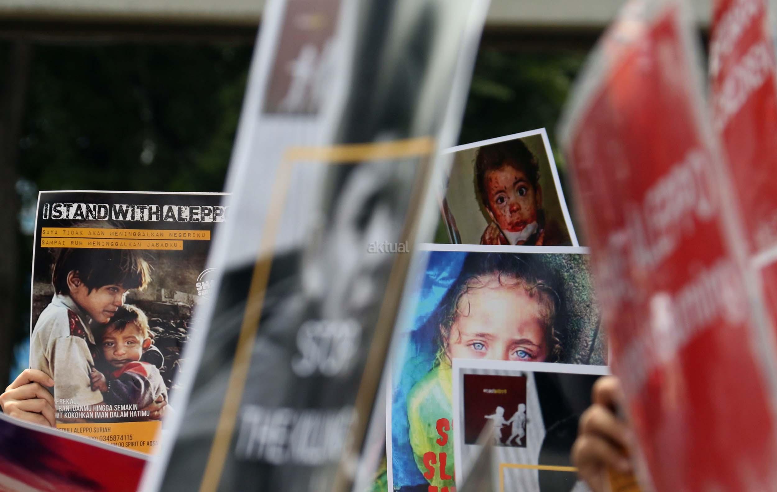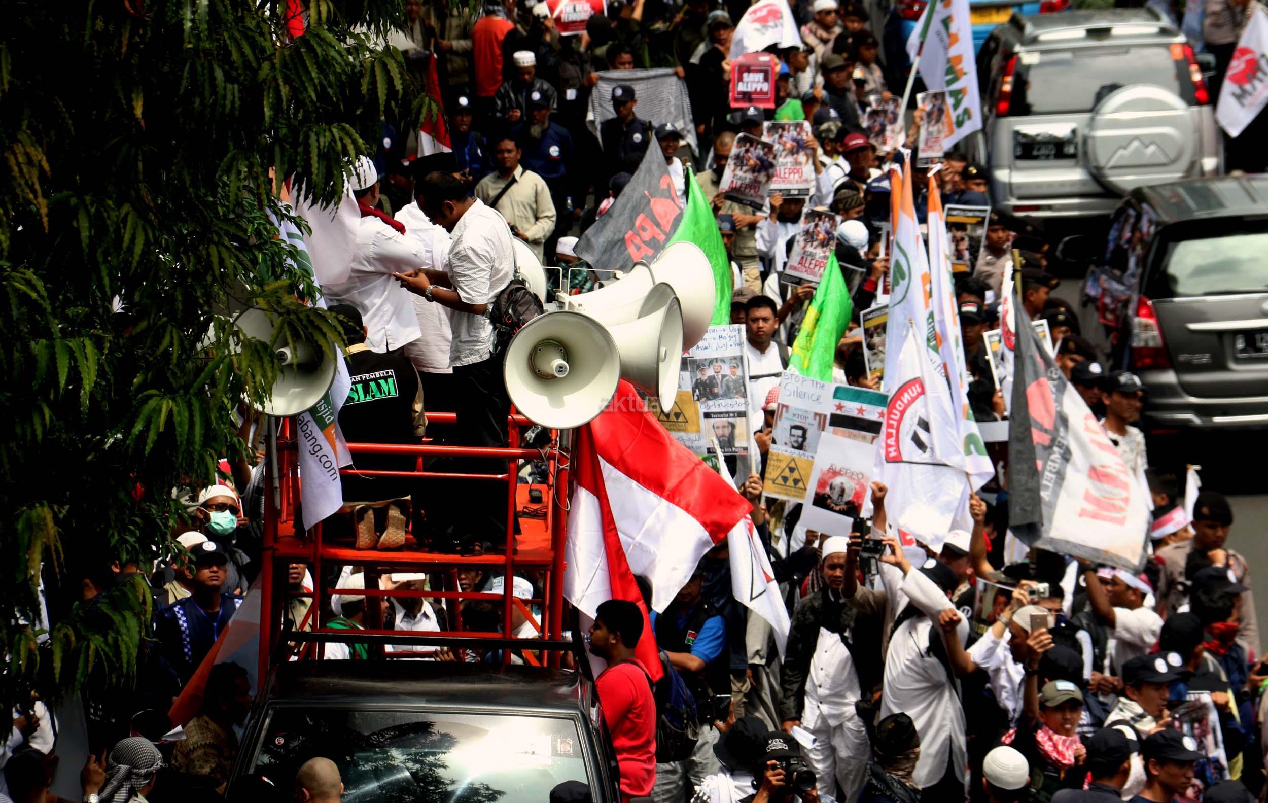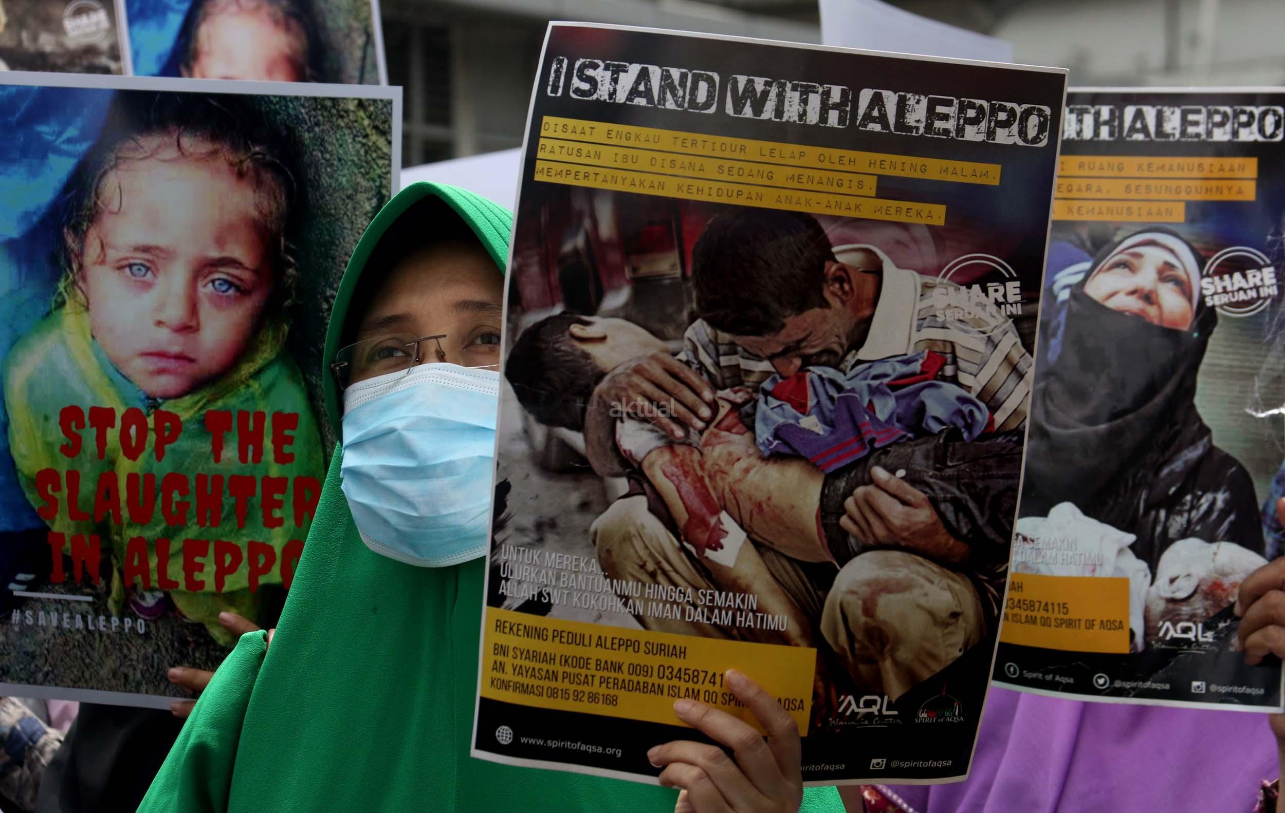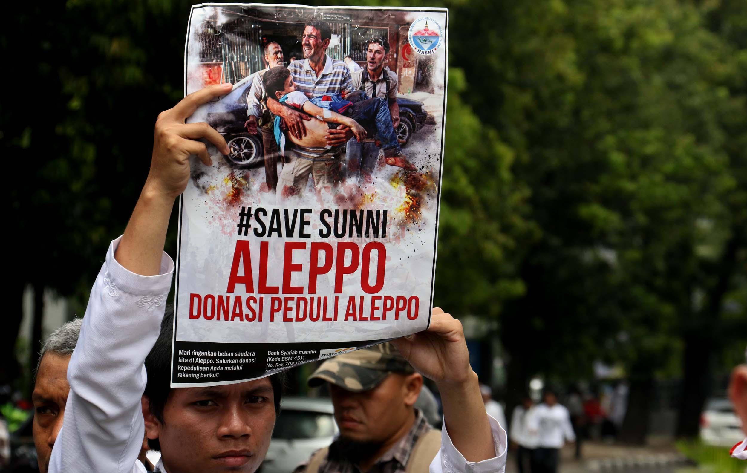 Dalam aksinya umat muslim mengecam pembantaian umat muslim Aleppo, Suriah yang dilakukan oleh rezim Bashar Hafez al-Assad yang dibantu oleh Rusia dan massa juga mendesak Pemerintah Jokowi untuk mengusir Duta Besar Rusia. AKTUAL/Munzir