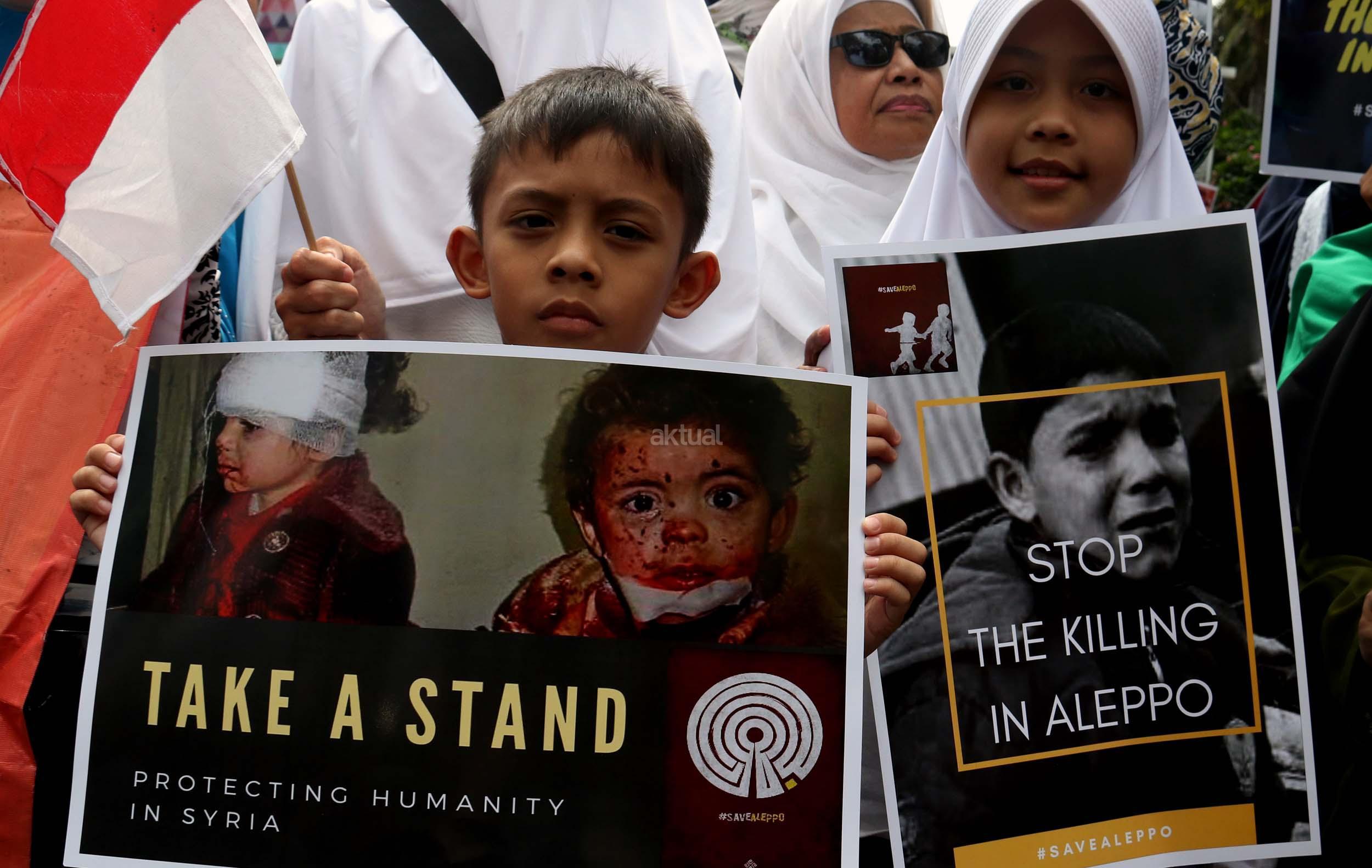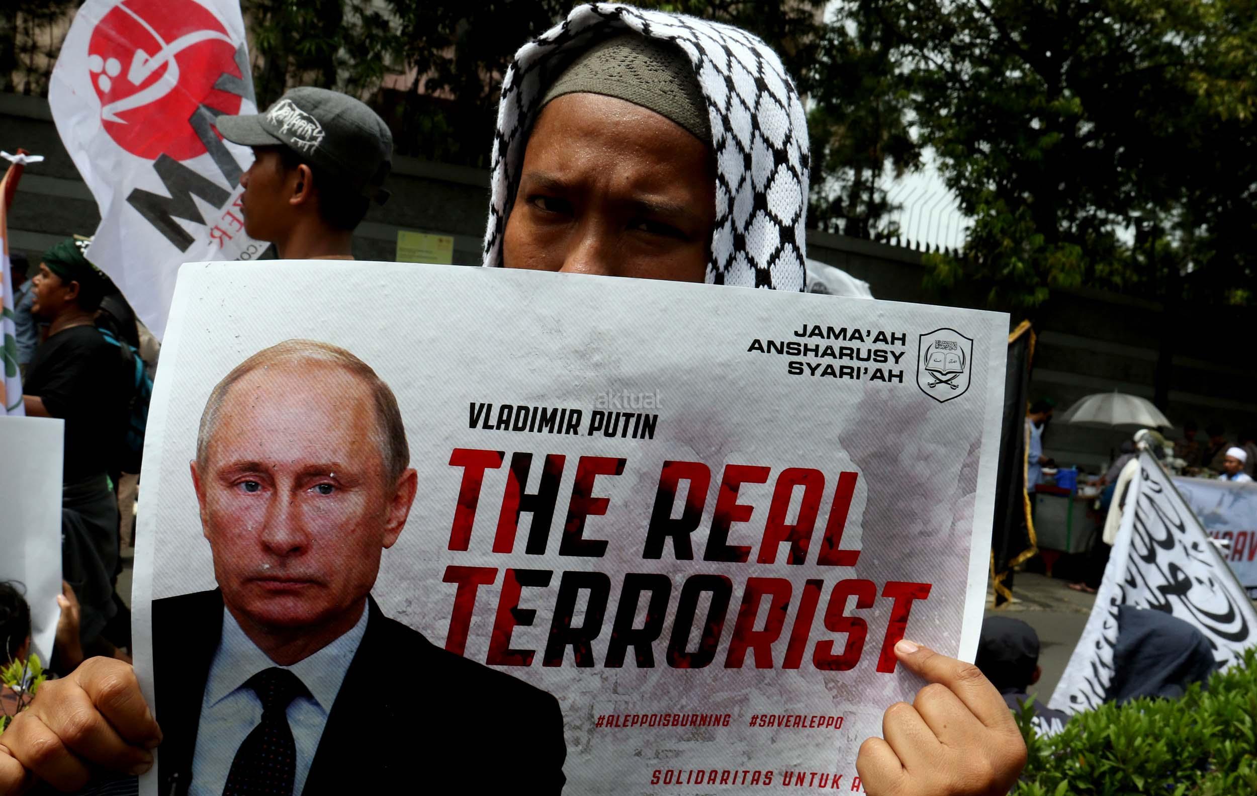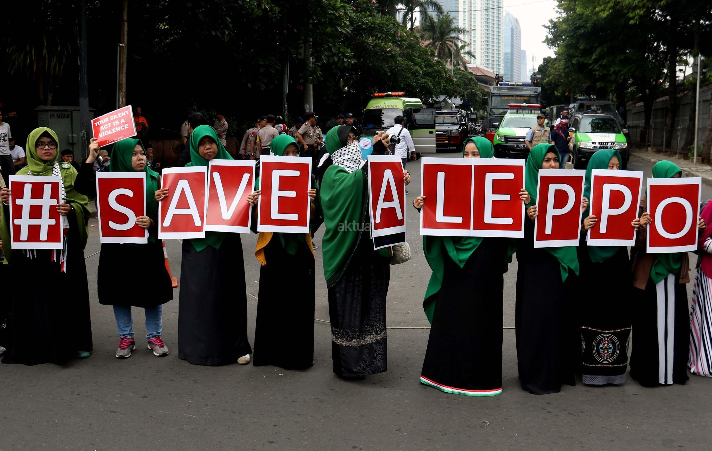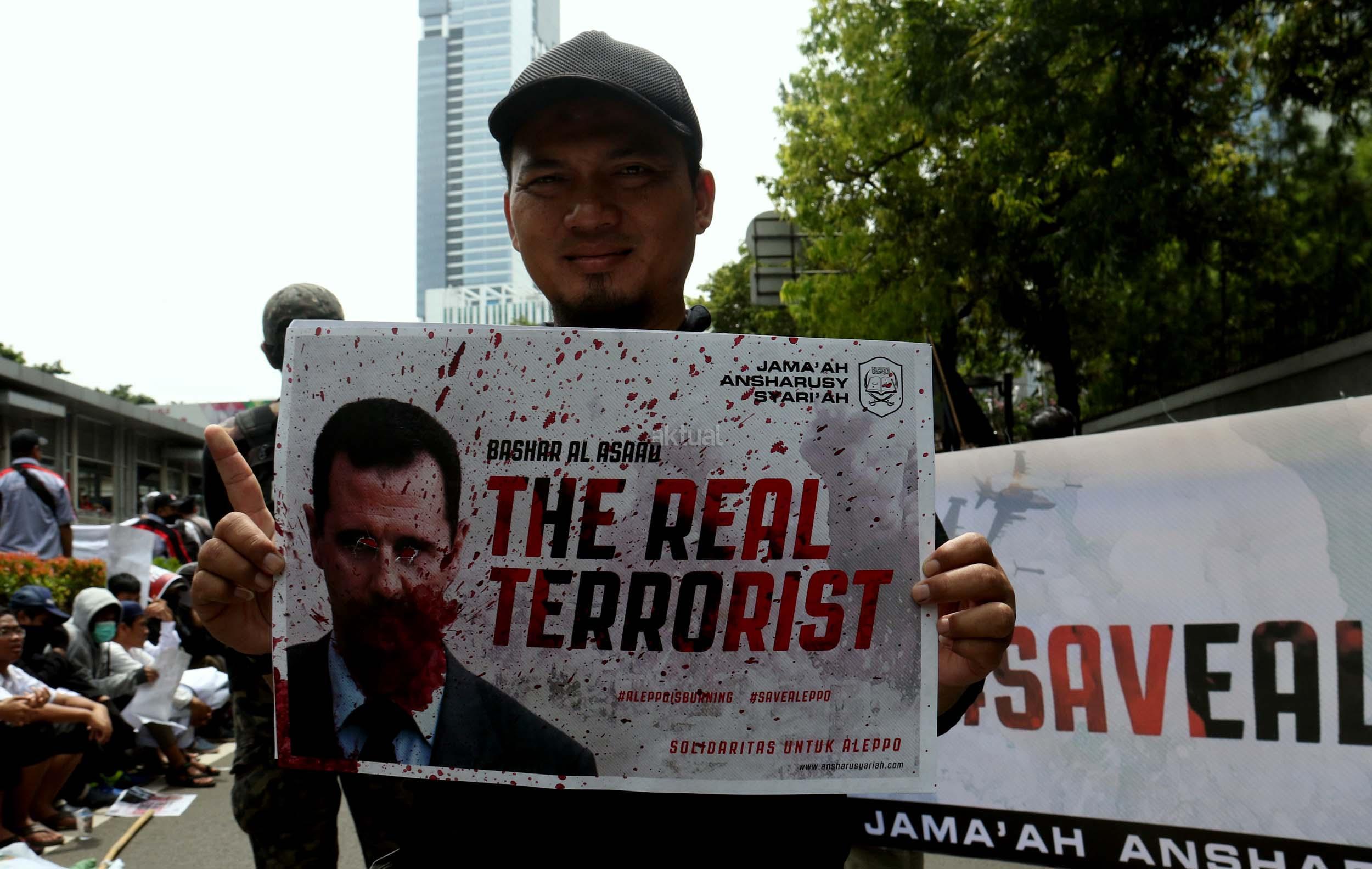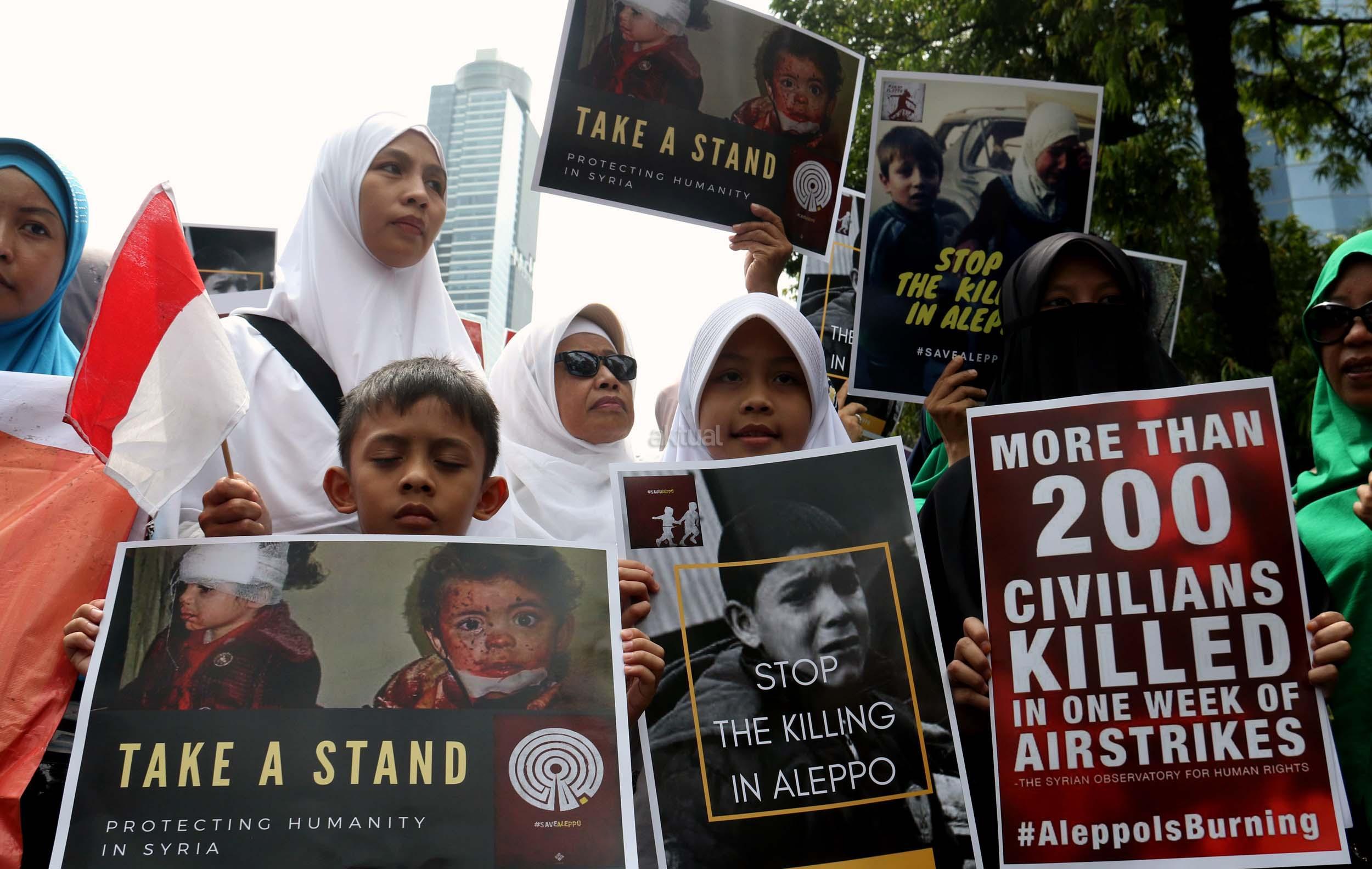 Dalam aksinya umat muslim mengecam pembantaian umat muslim Aleppo, Suriah yang dilakukan oleh rezim Bashar Hafez al-Assad yang dibantu oleh Rusia dan massa juga mendesak Pemerintah Jokowi untuk mengusir Duta Besar Rusia. AKTUAL/Munzir