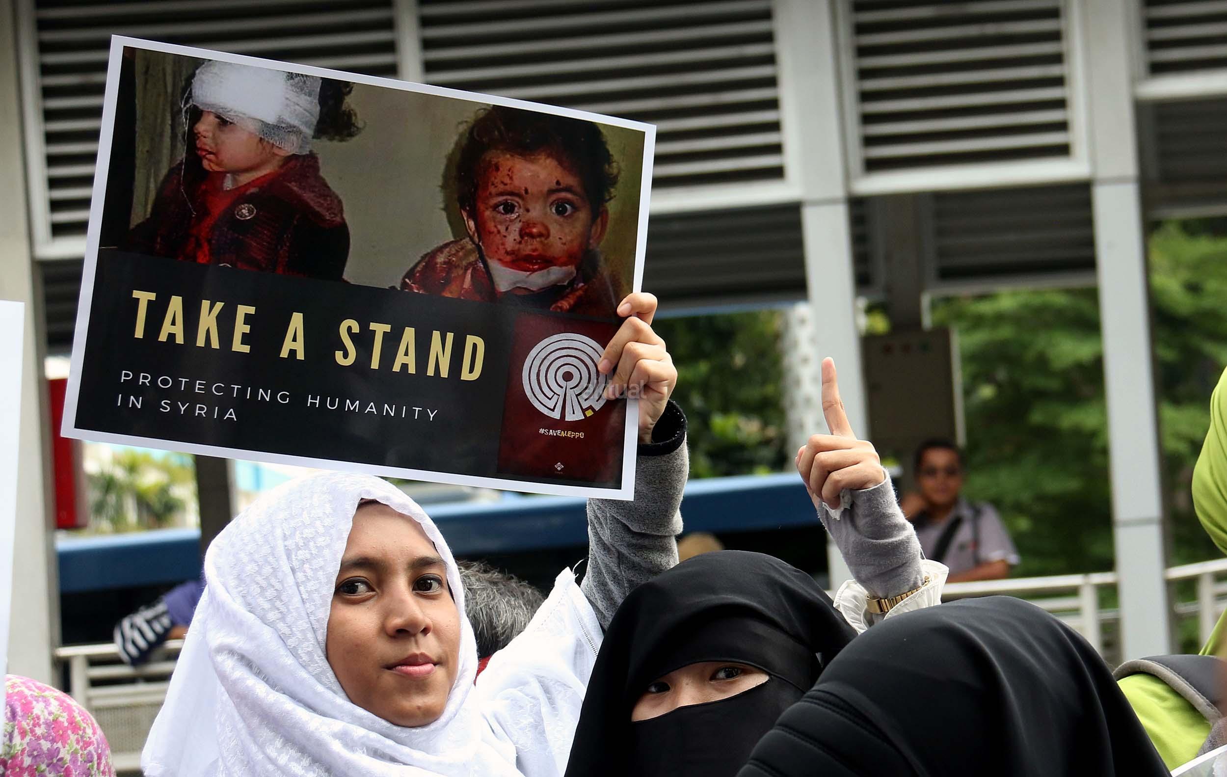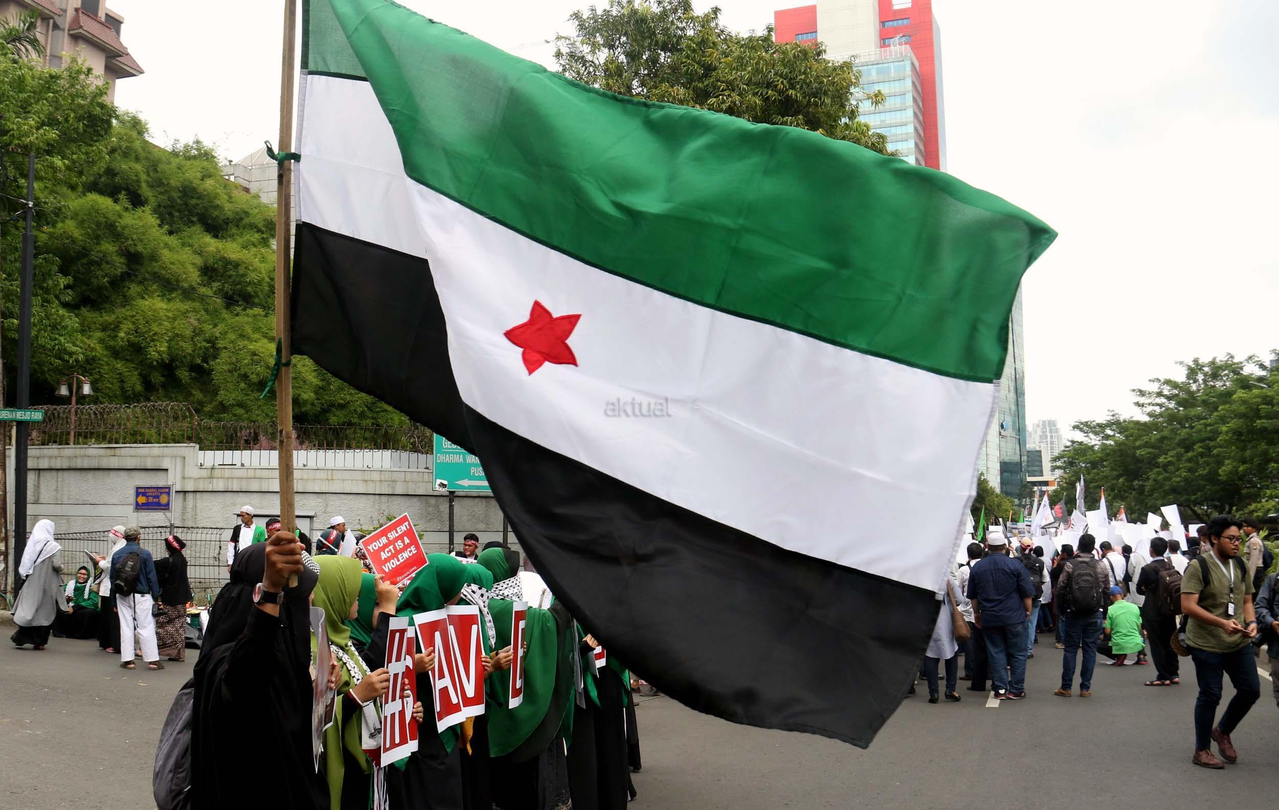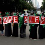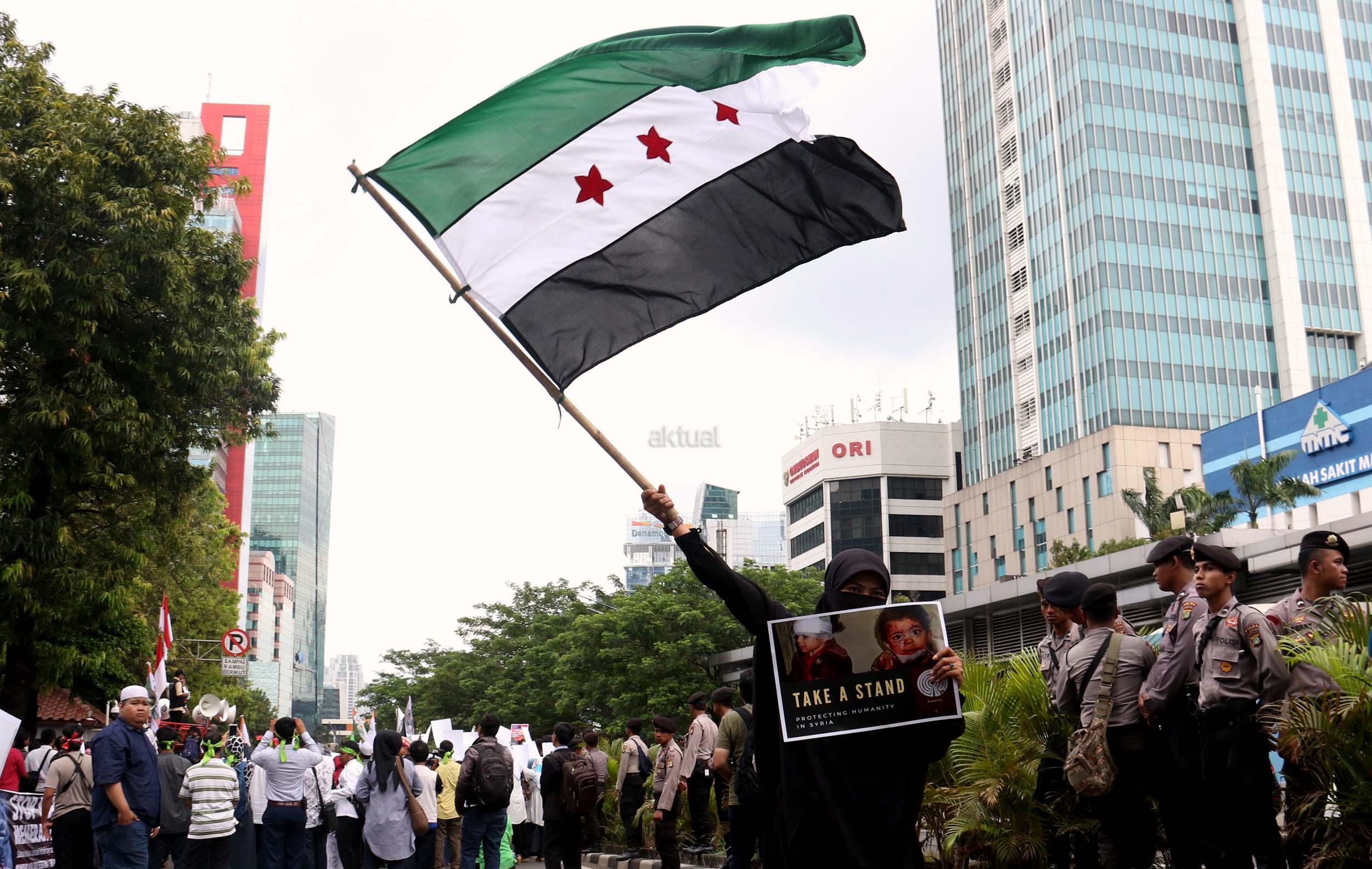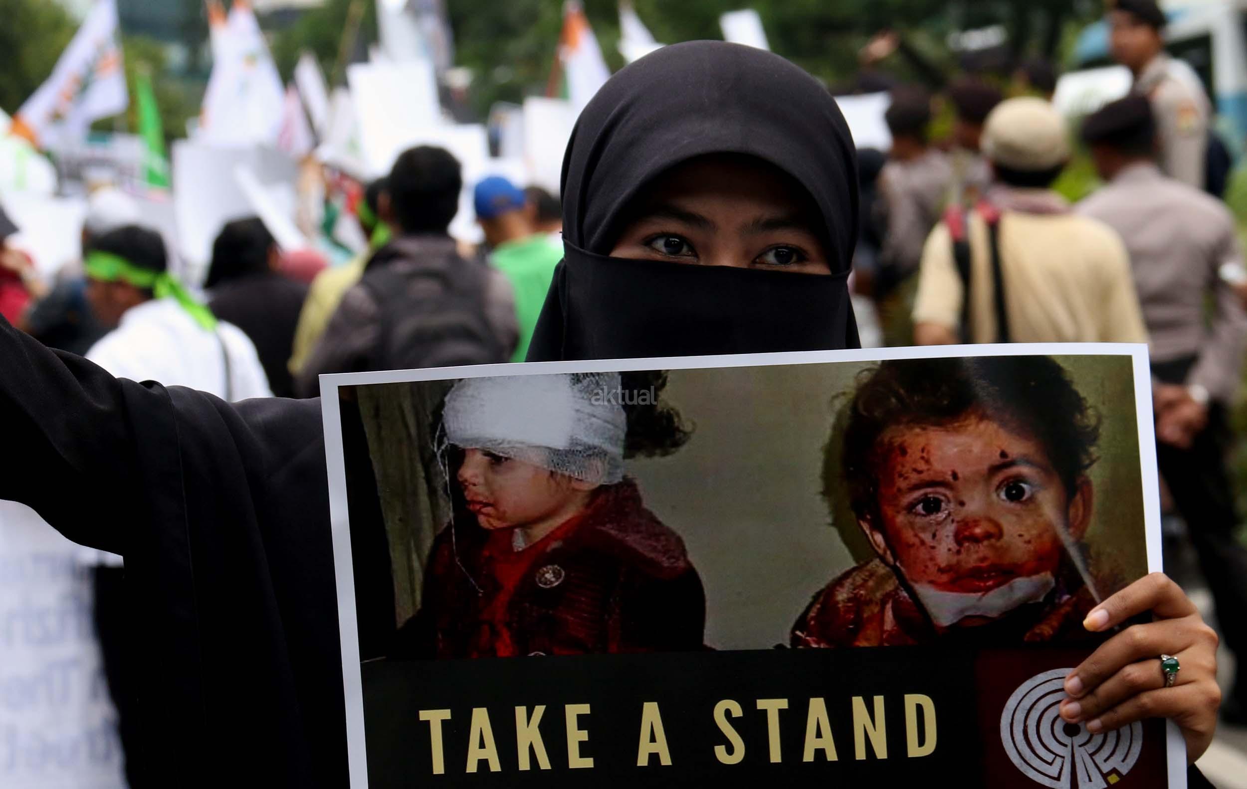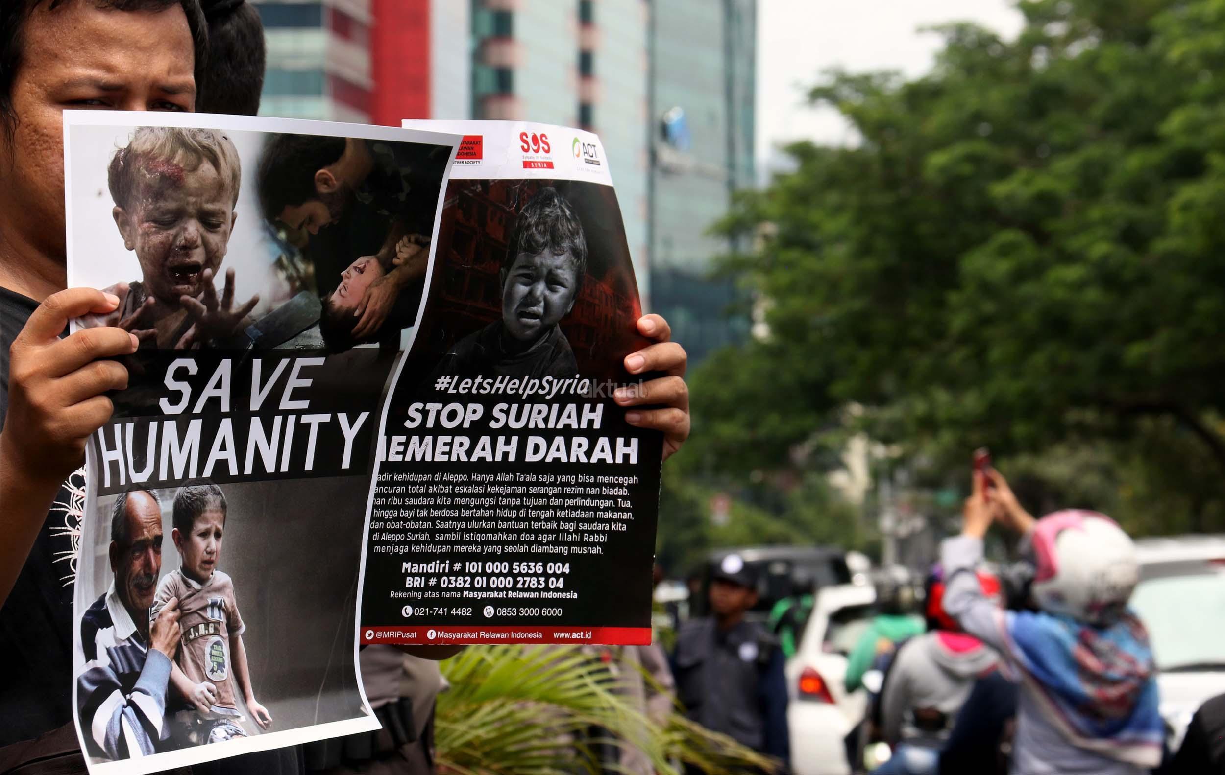 Dalam aksinya umat muslim mengecam pembantaian umat muslim Aleppo, Suriah yang dilakukan oleh rezim Bashar Hafez al-Assad yang dibantu oleh Rusia dan massa juga mendesak Pemerintah Jokowi untuk mengusir Duta Besar Rusia. AKTUAL/Munzir