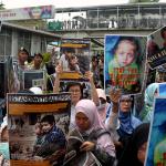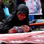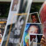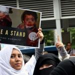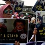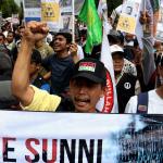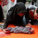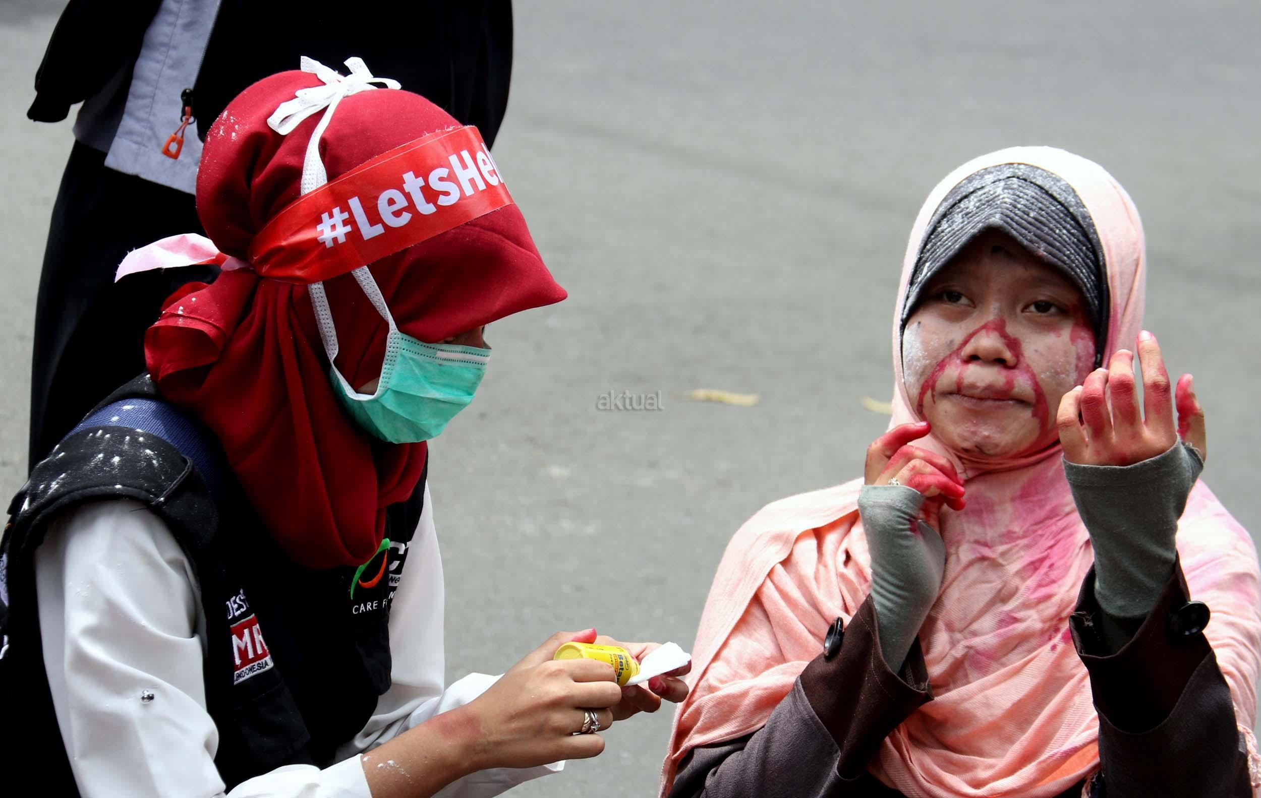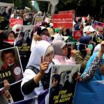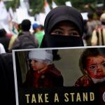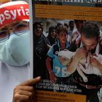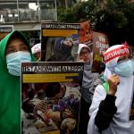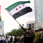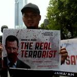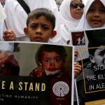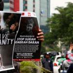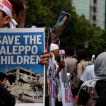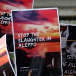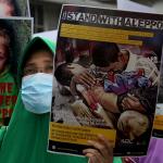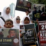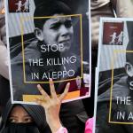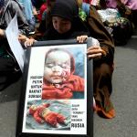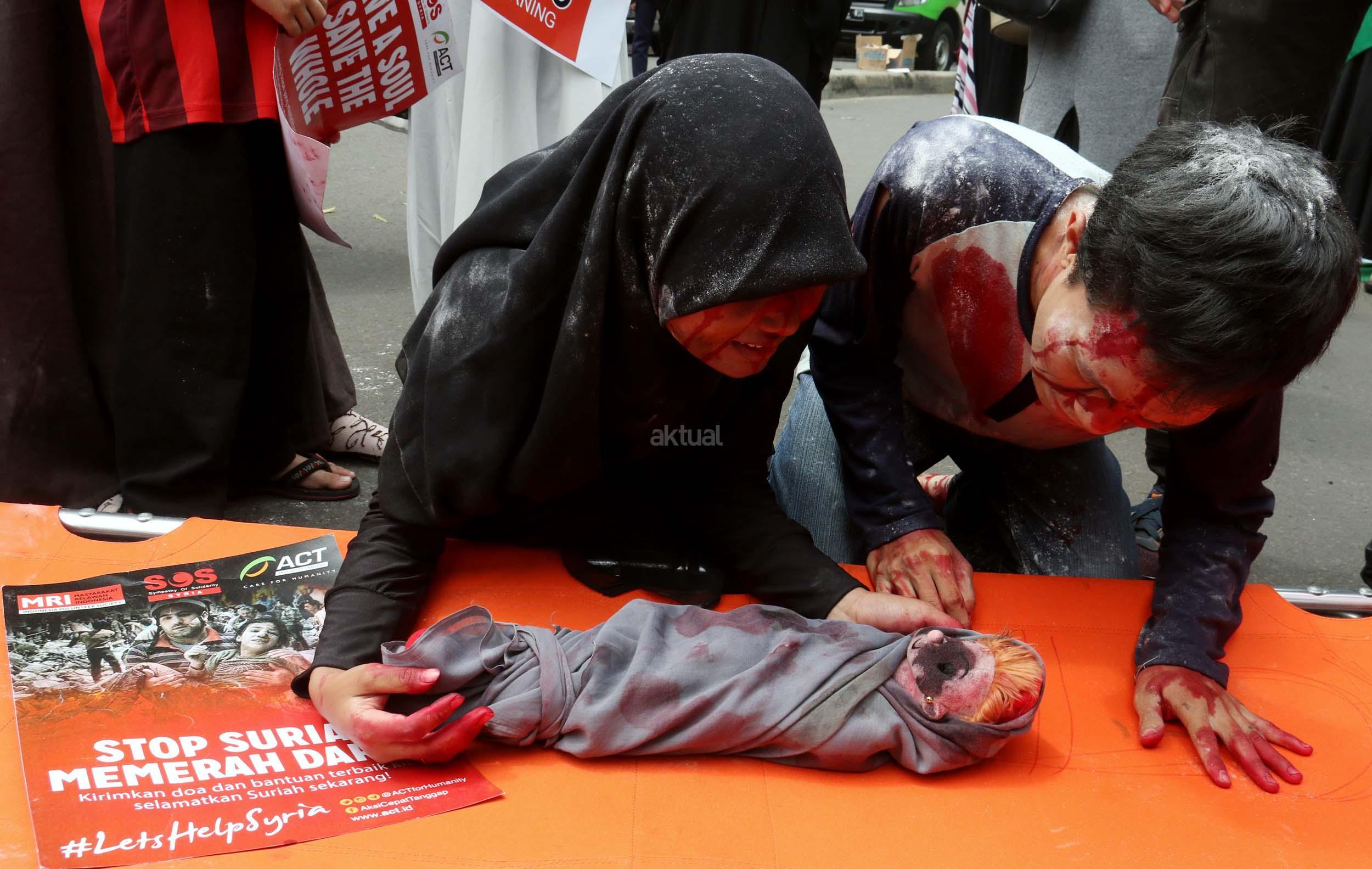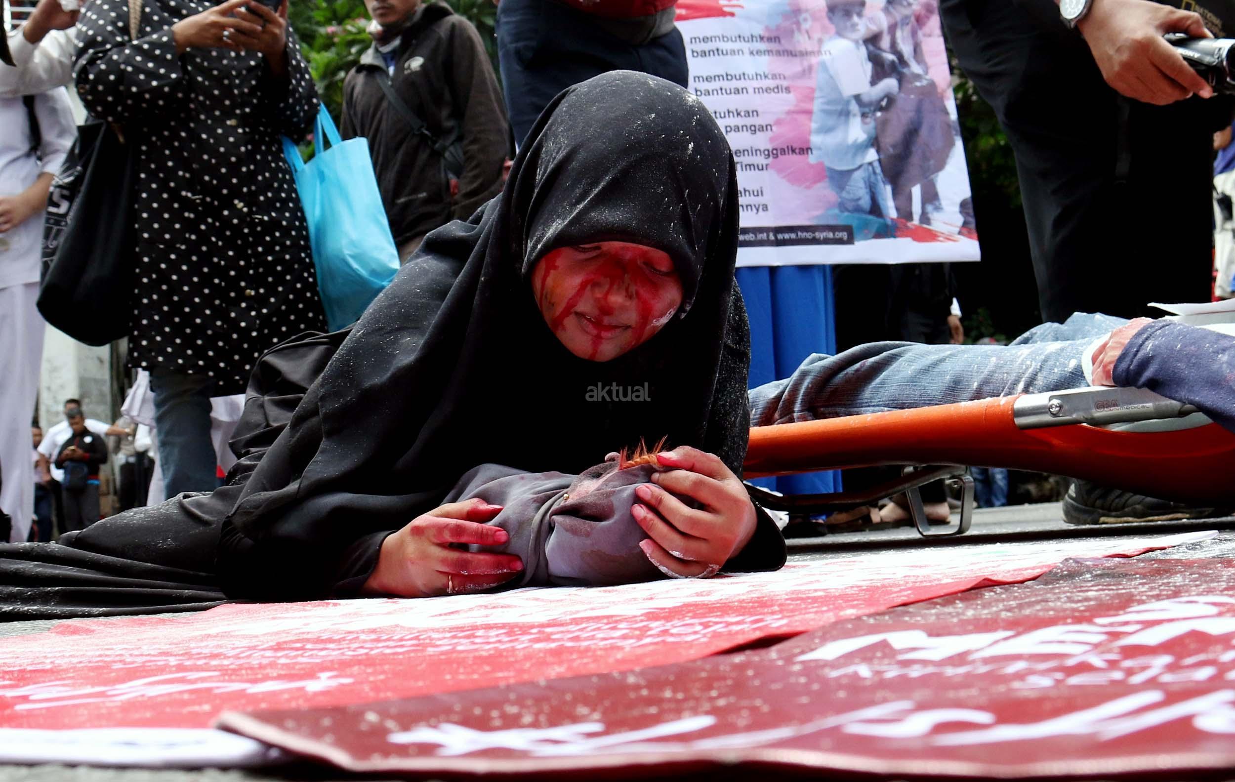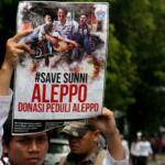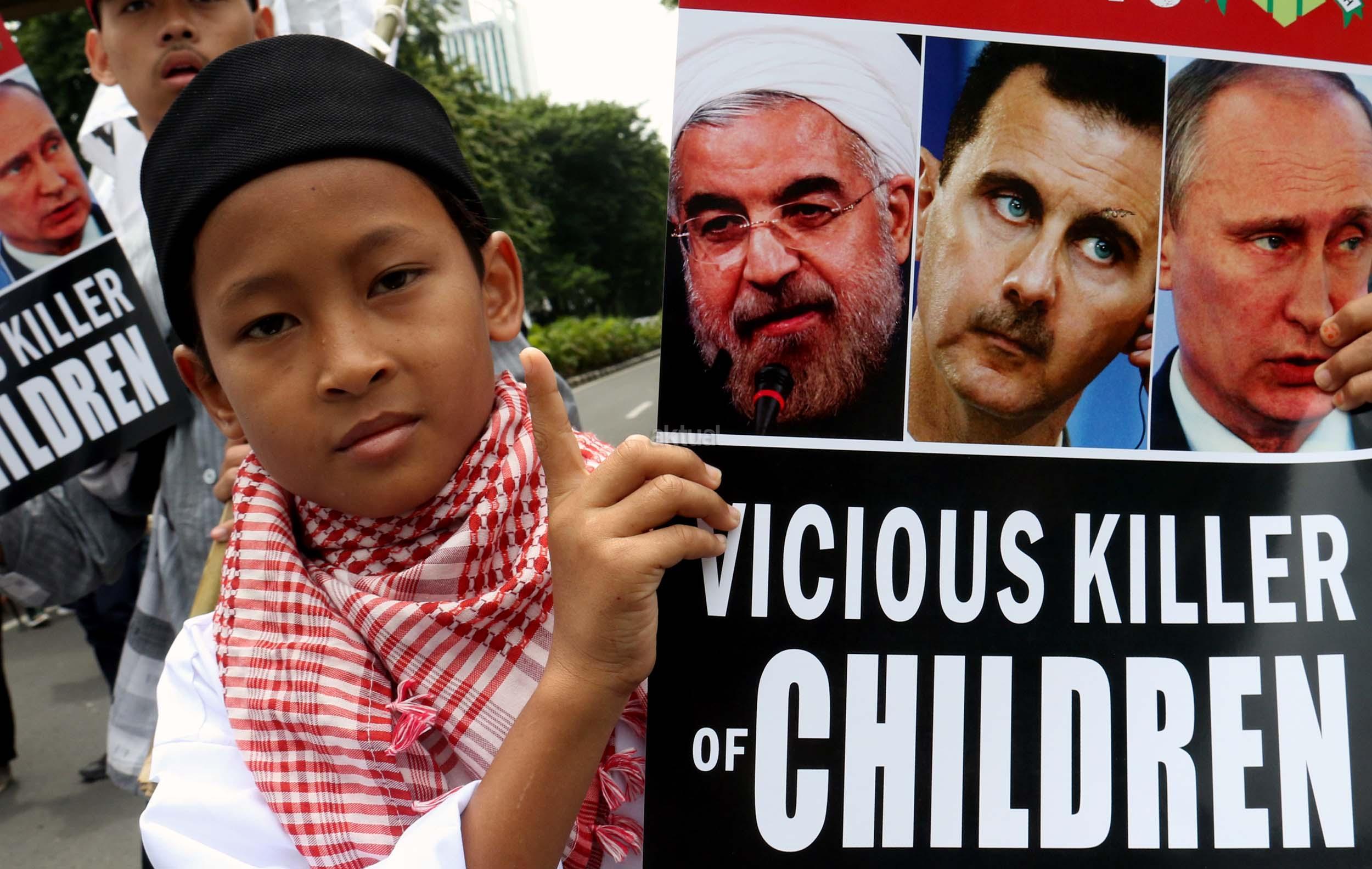 Dalam aksinya umat muslim mengecam pembantaian umat muslim Aleppo, Suriah yang dilakukan oleh rezim Bashar Hafez al-Assad yang dibantu oleh Rusia dan massa juga mendesak Pemerintah Jokowi untuk mengusir Duta Besar Rusia. AKTUAL/Munzir