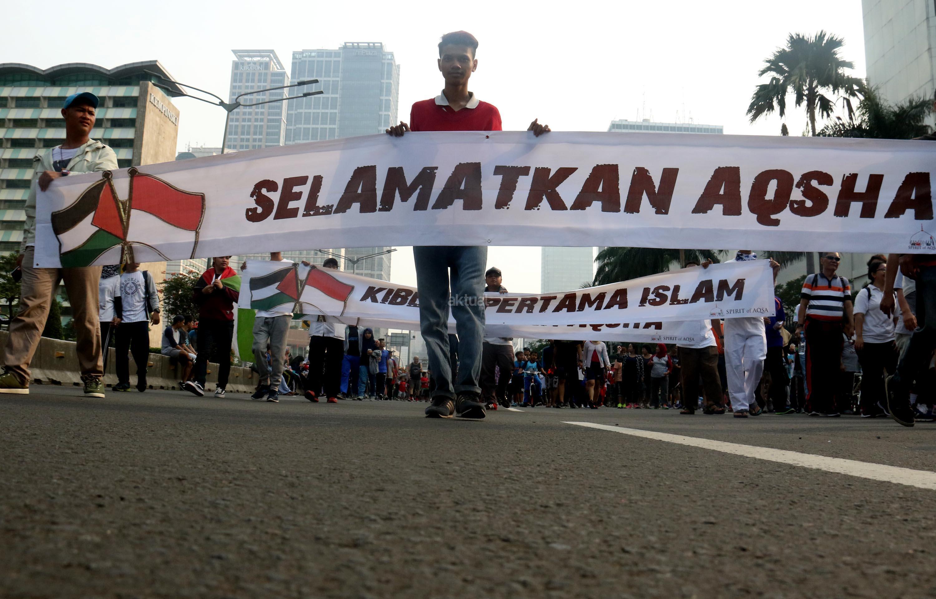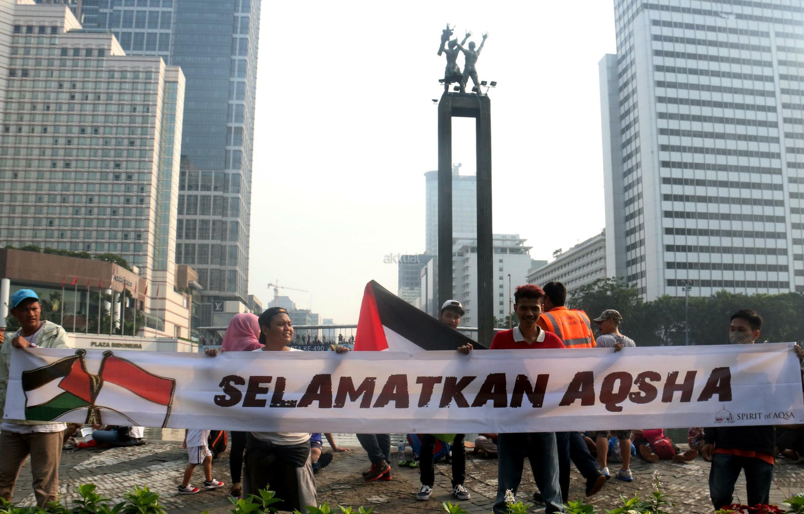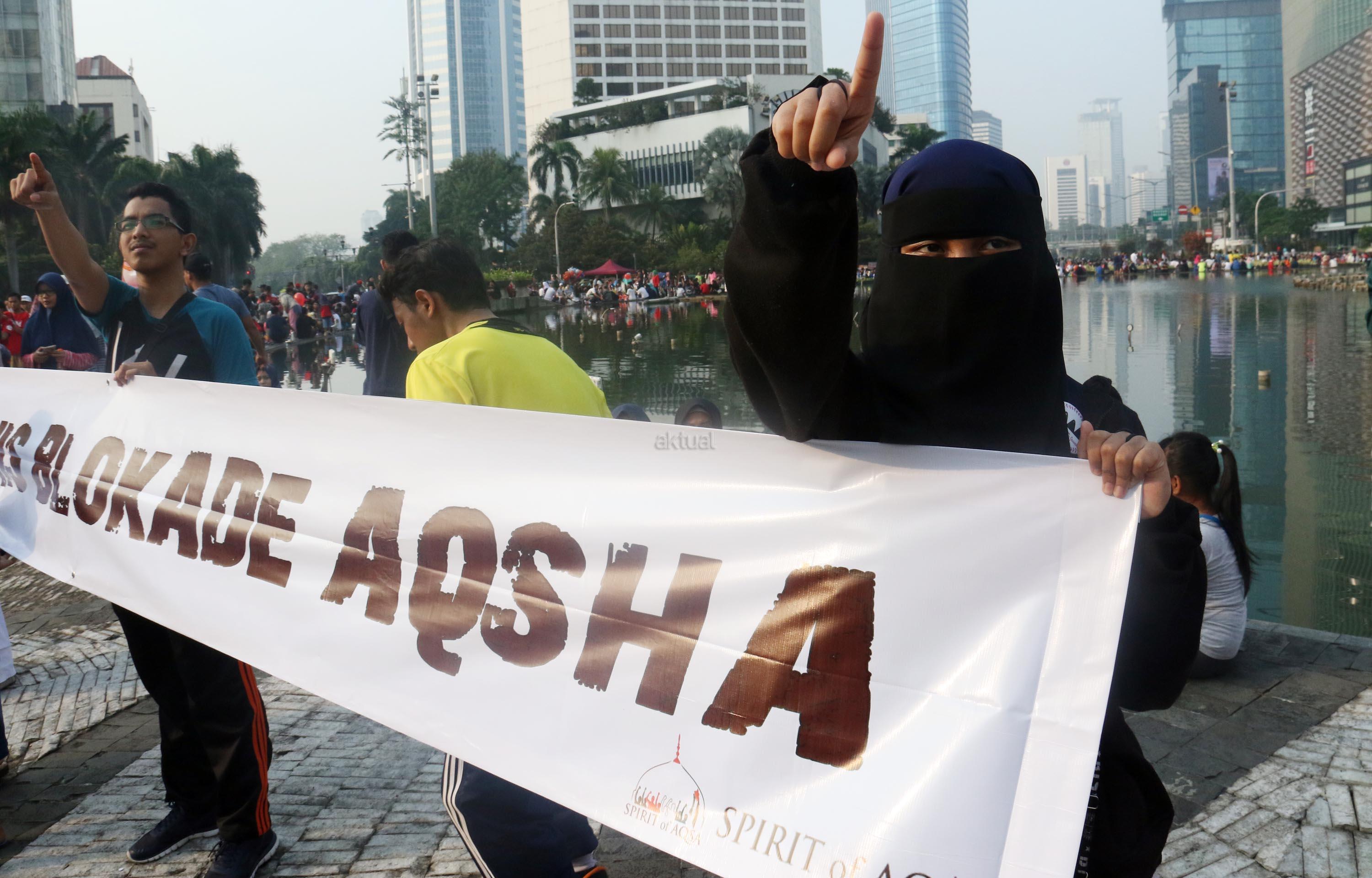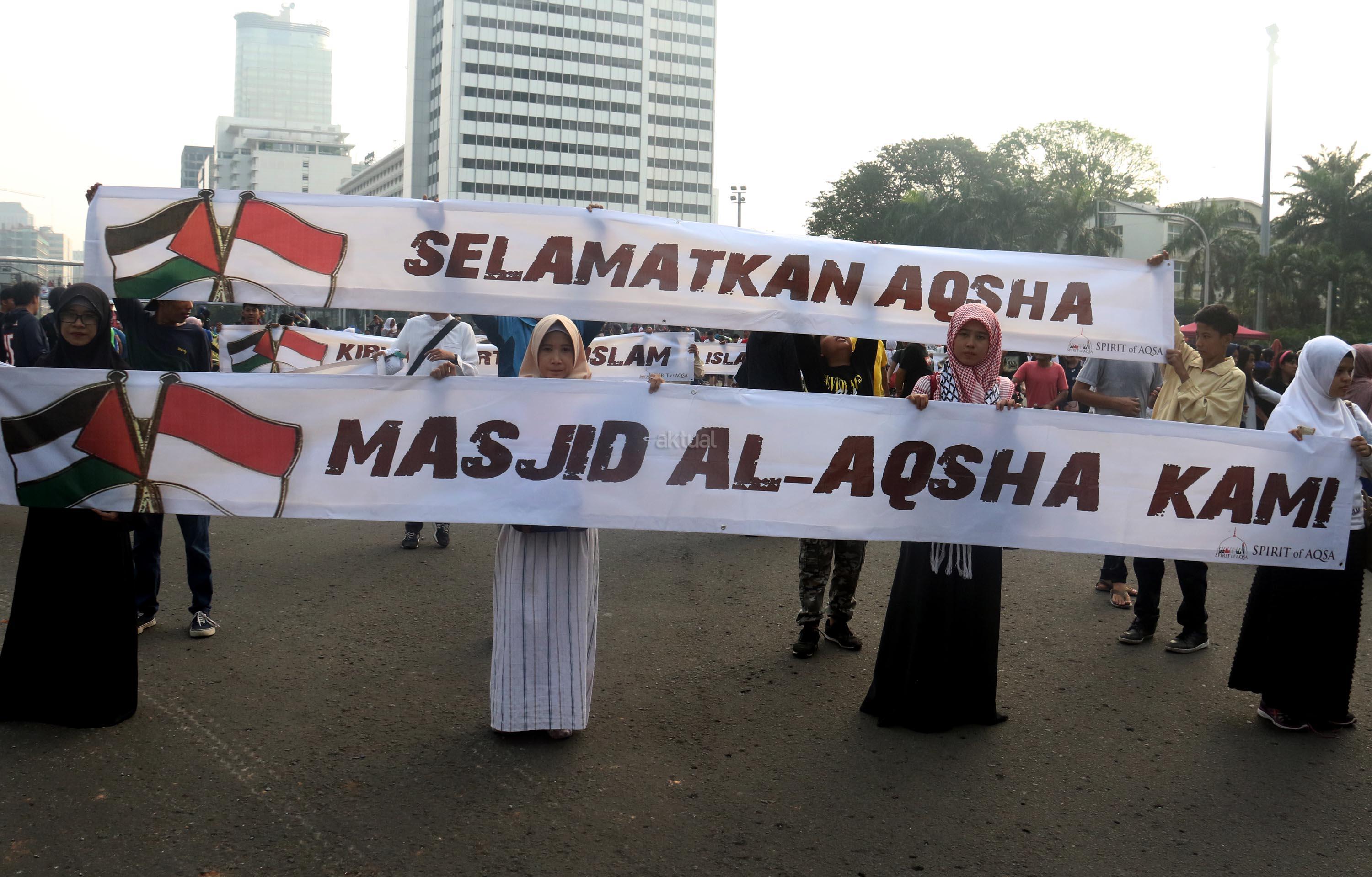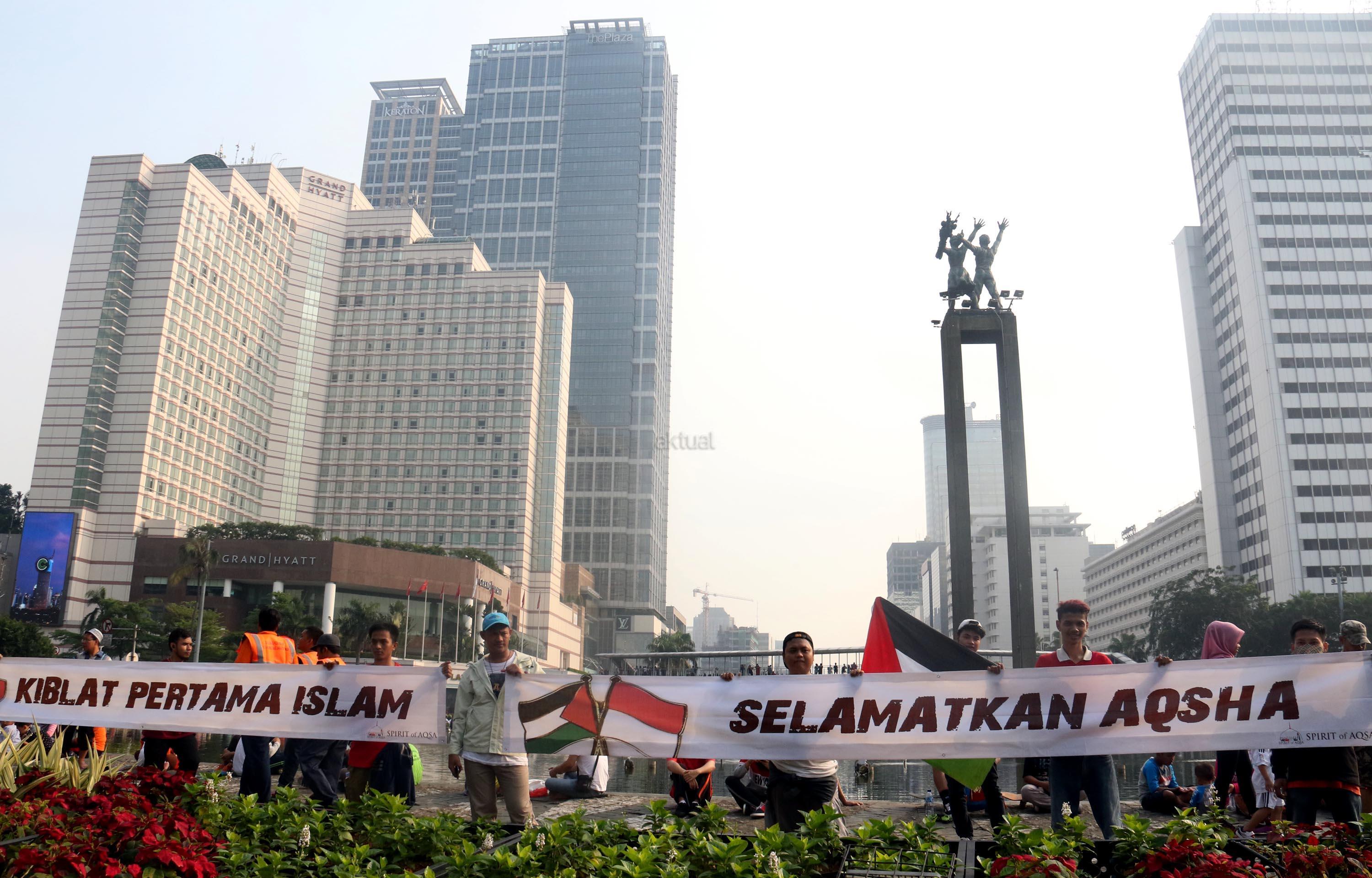 Sejumlah massa yang tergabung dalam Spirit of AQSA melakukan aksi bentang spanduk yang bertuliskan “Save Al Aqsa” di kawasan CFD, Bunderan HI, Jakarta, Minggu (23/7/2017). Dalam aksi “Save Al Aqsa” ini sebagai bentuk protes keras terhadap pemerintahan Zionis Israel yang telah blokade Masjid Al Aqsa dan melakukan penembakan kepadan warga Palestina. AKTUAL/Munzir