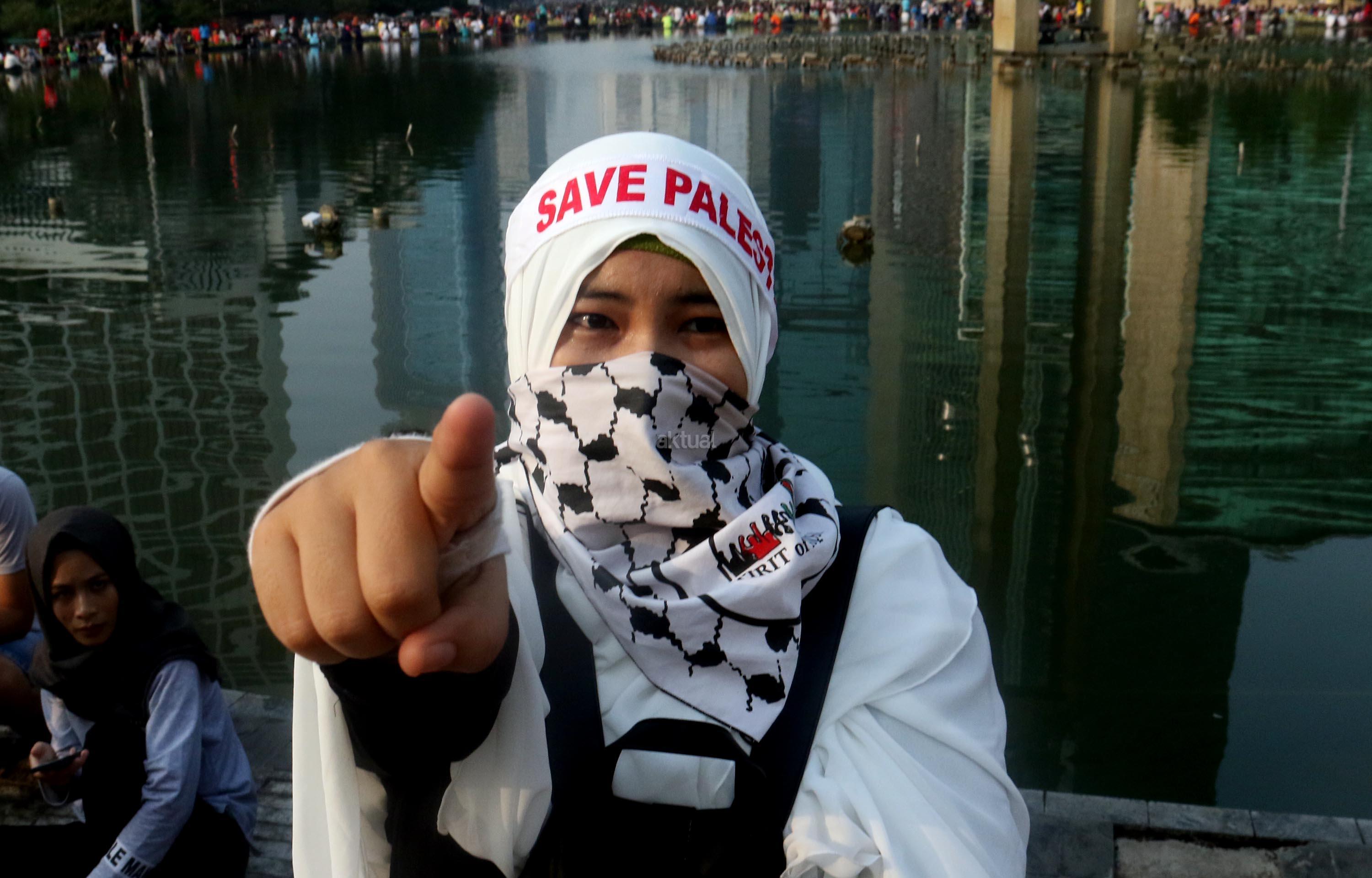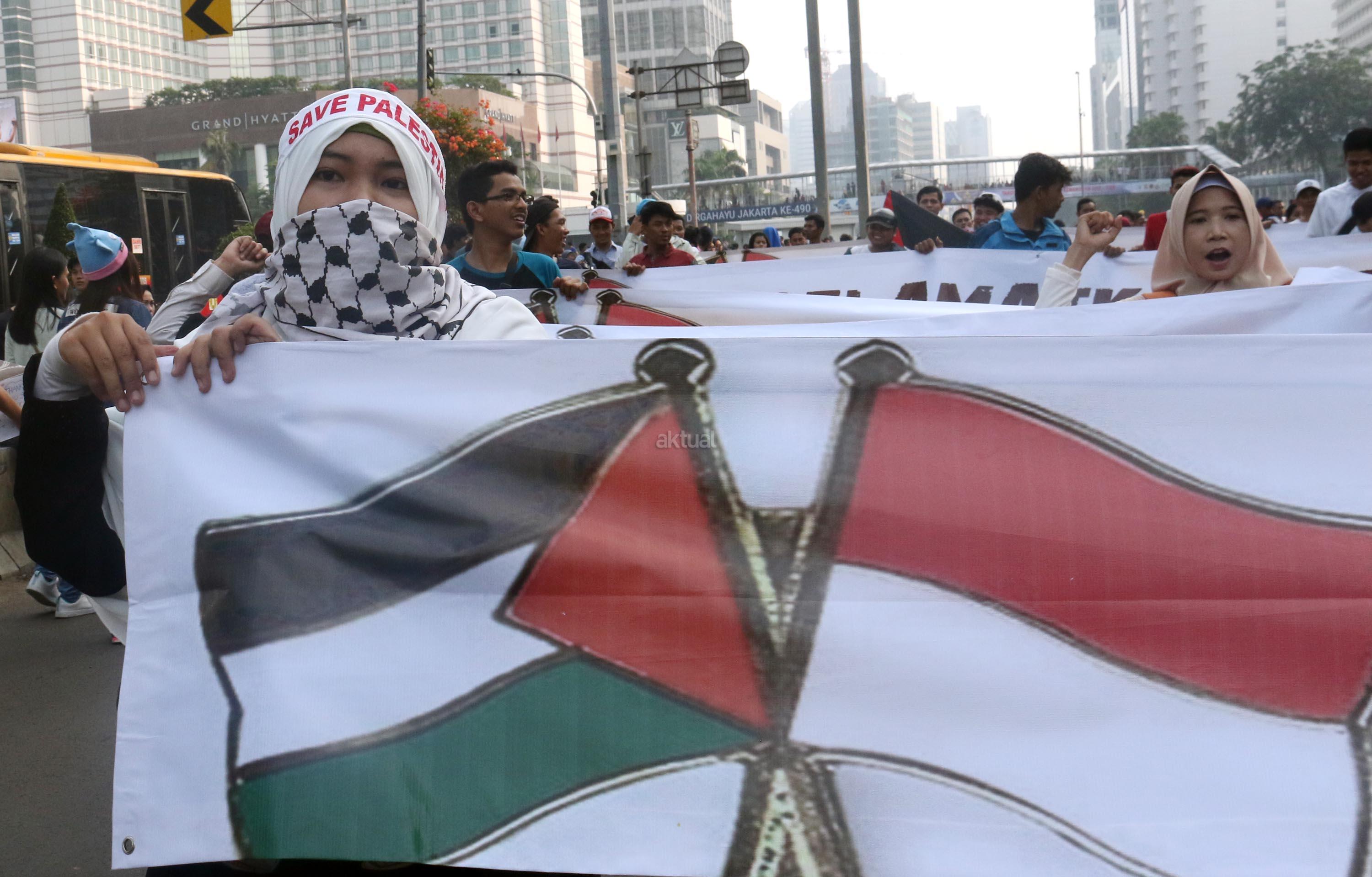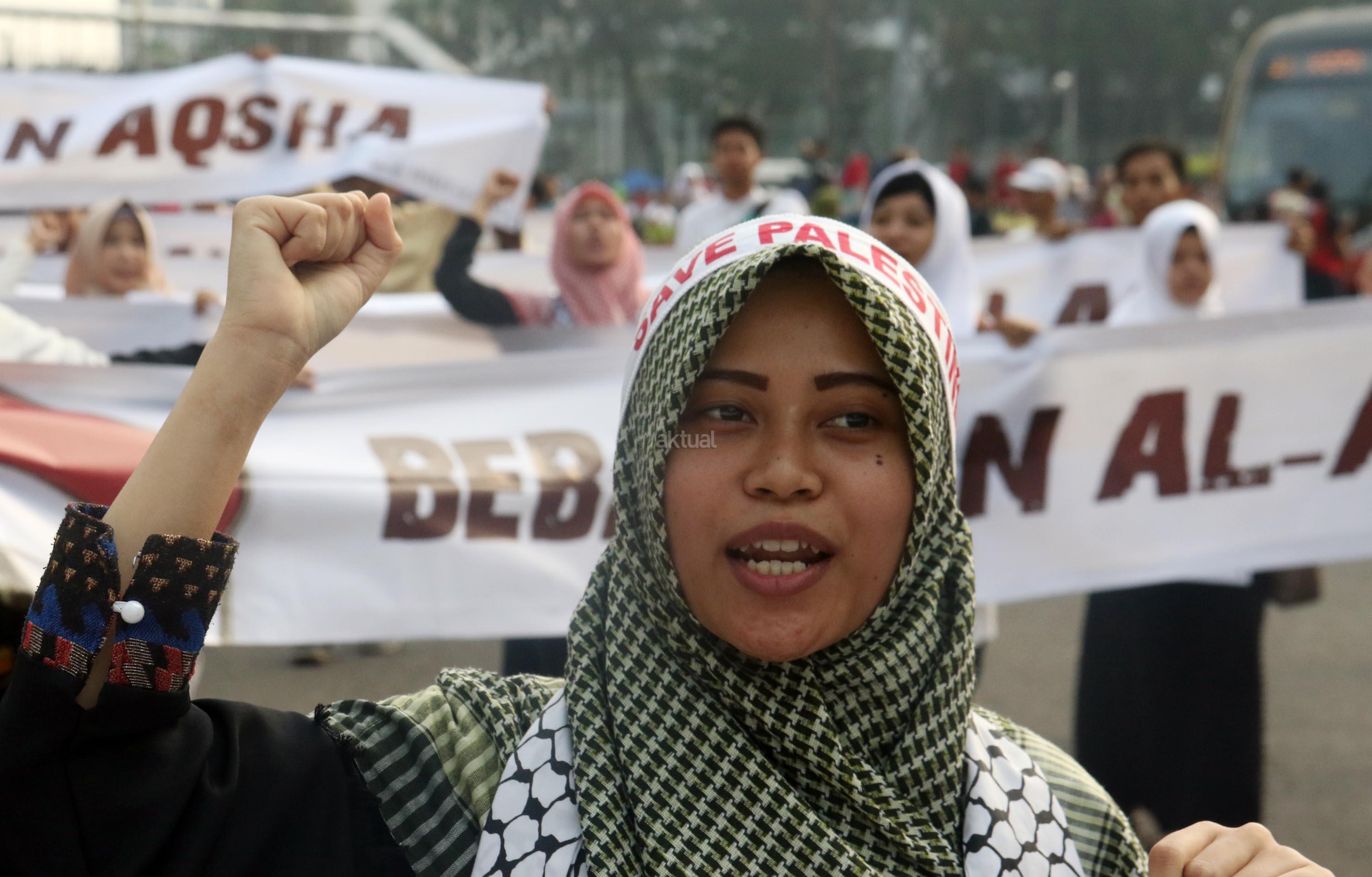 Dalam aksi "Save Al Aqsa" ini sebagai bentuk protes keras terhadap pemerintahan Zionis Israel yang telah blokade Masjid Al Aqsa dan melakukan penembakan kepadan warga Palestina. AKTUAL/Munzir