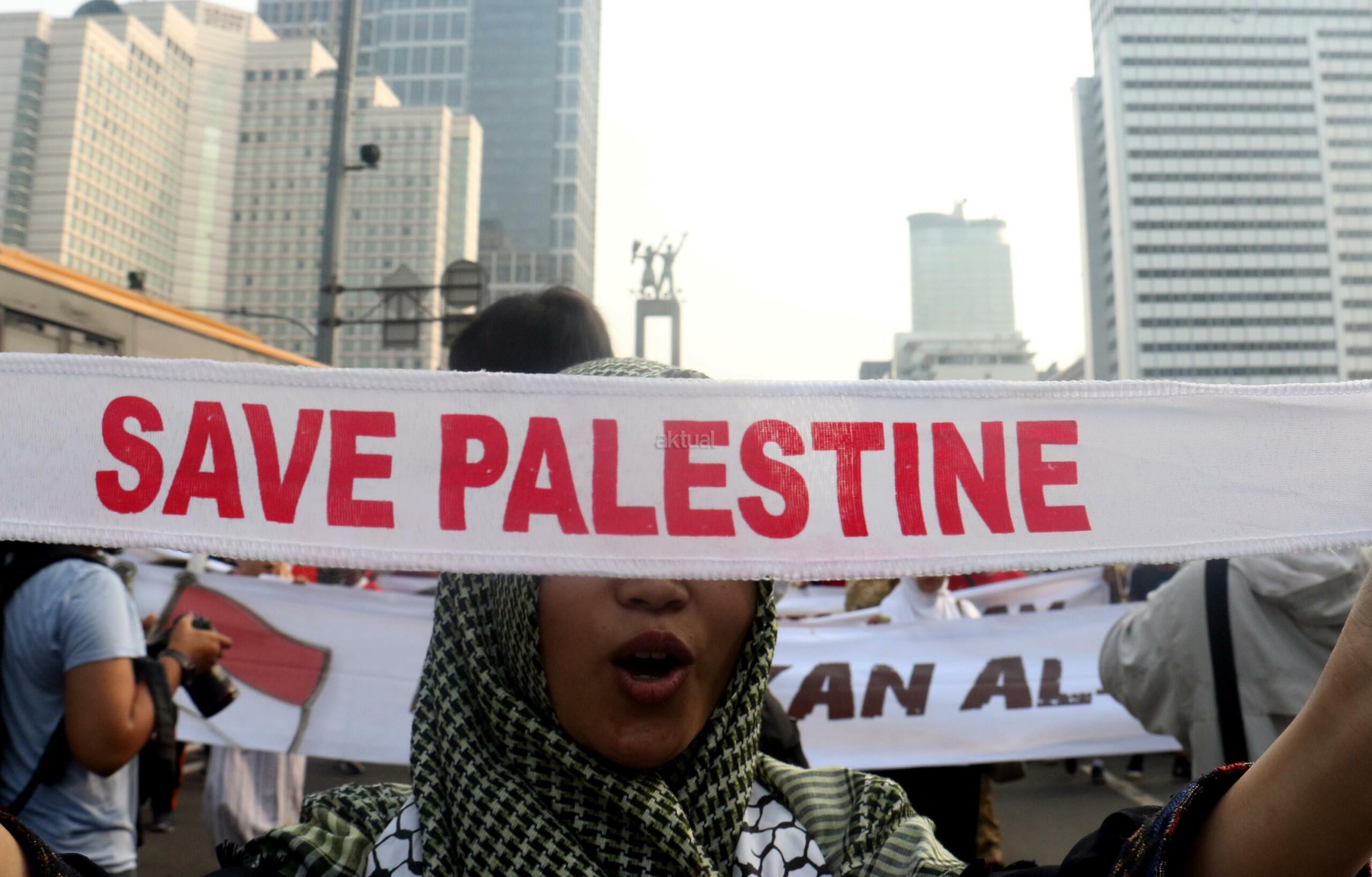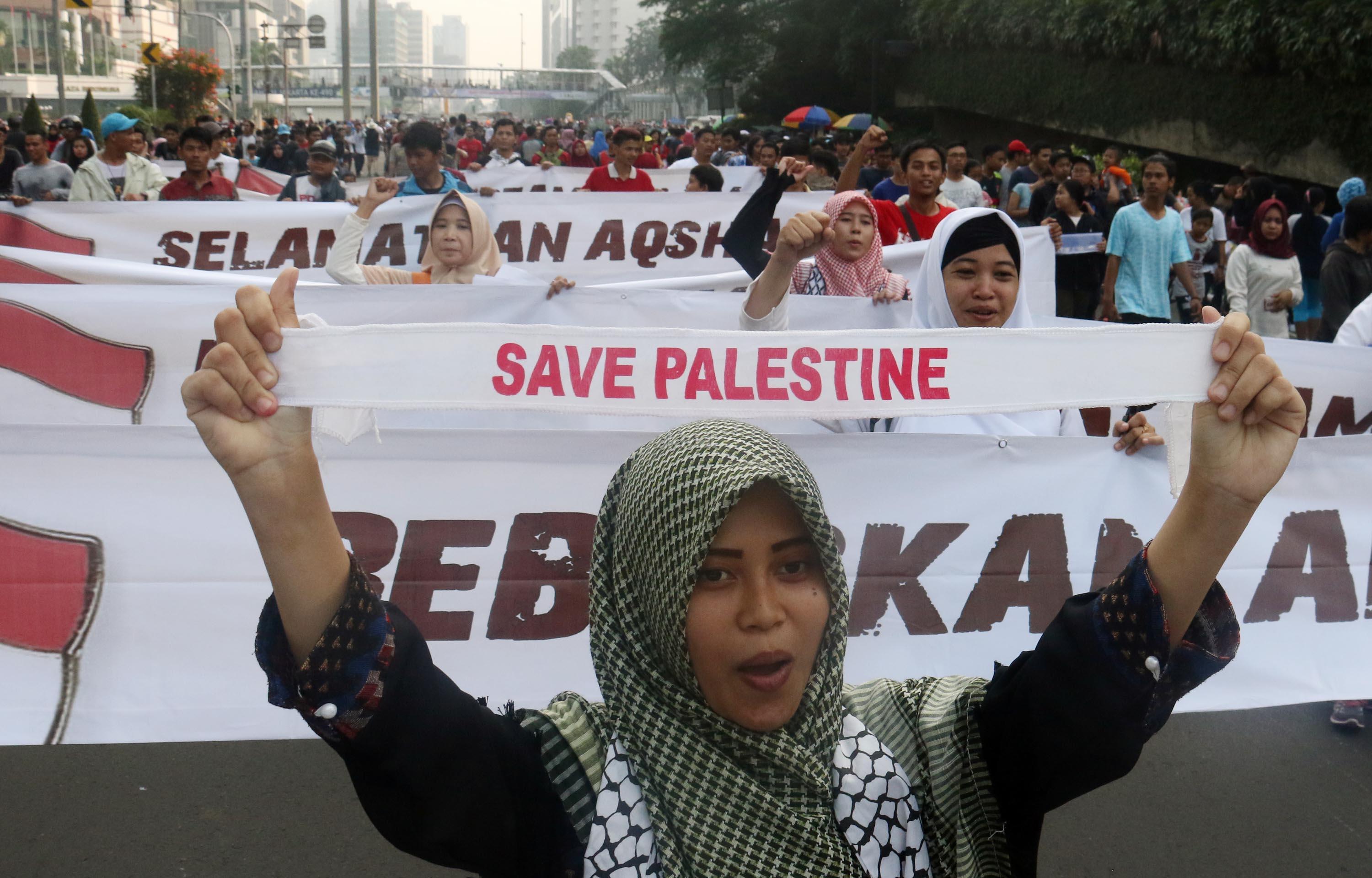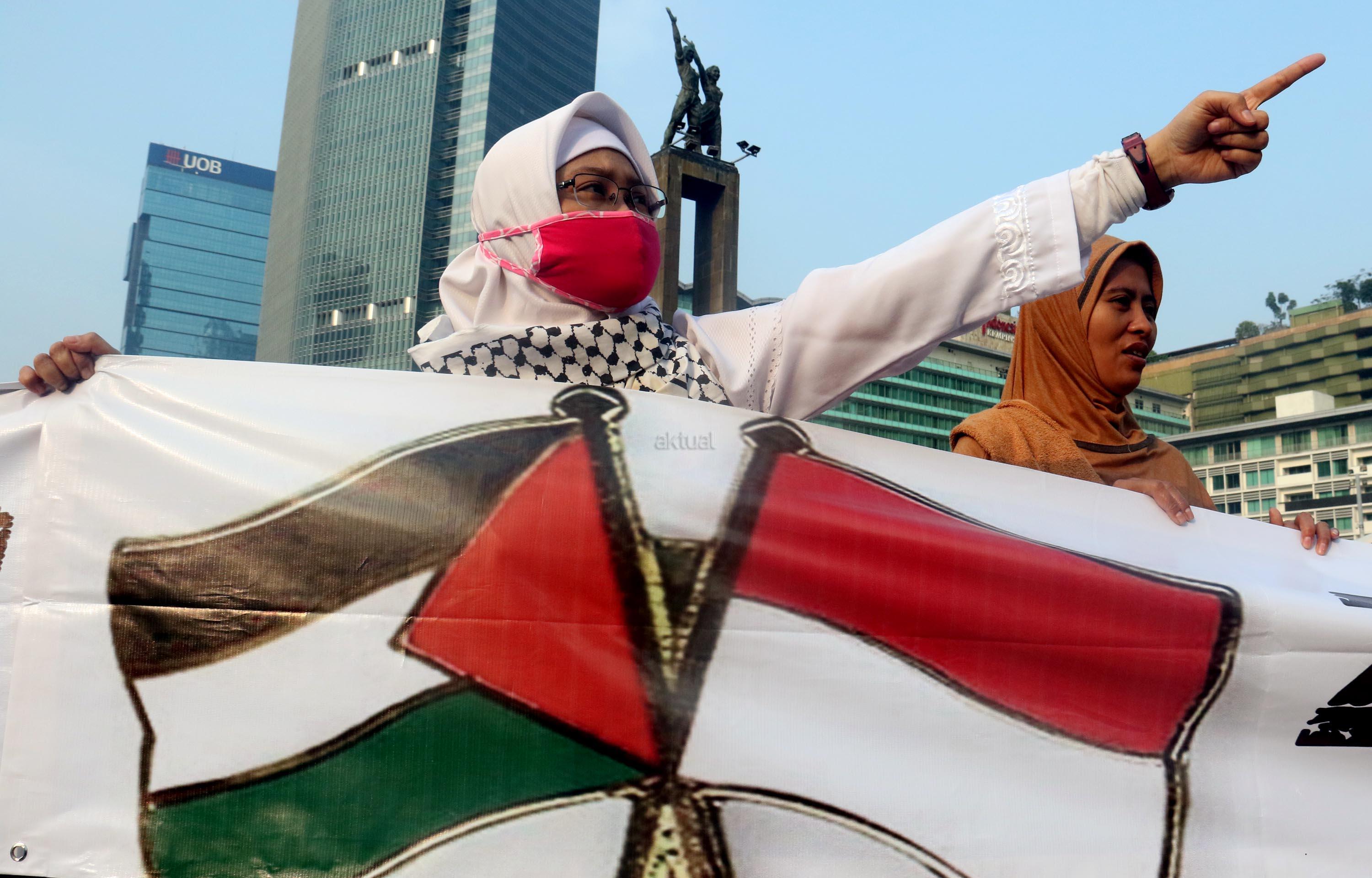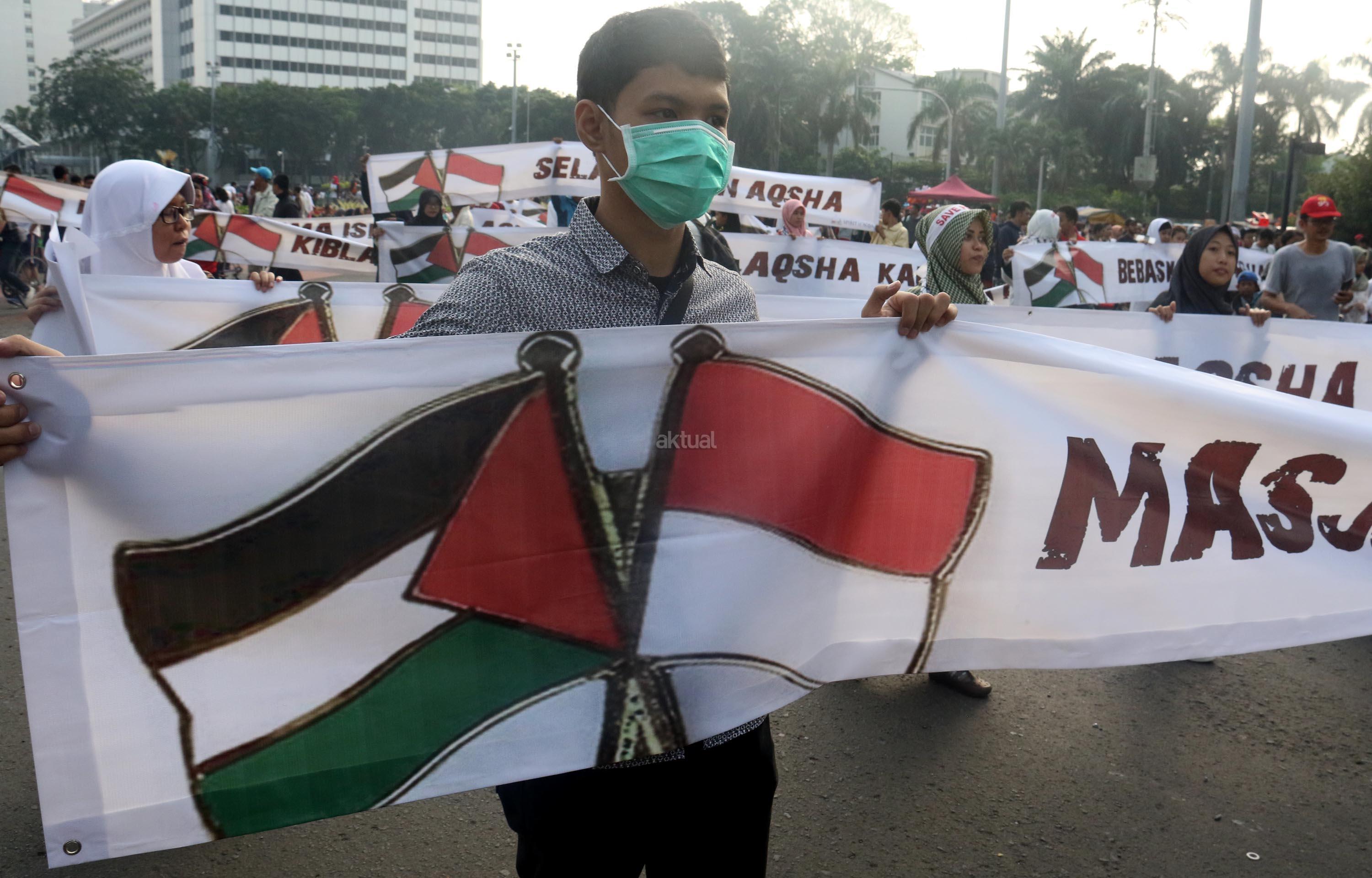 Dalam aksi "Save Al Aqsa" ini sebagai bentuk protes keras terhadap pemerintahan Zionis Israel yang telah blokade Masjid Al Aqsa dan melakukan penembakan kepadan warga Palestina. AKTUAL/Munzir