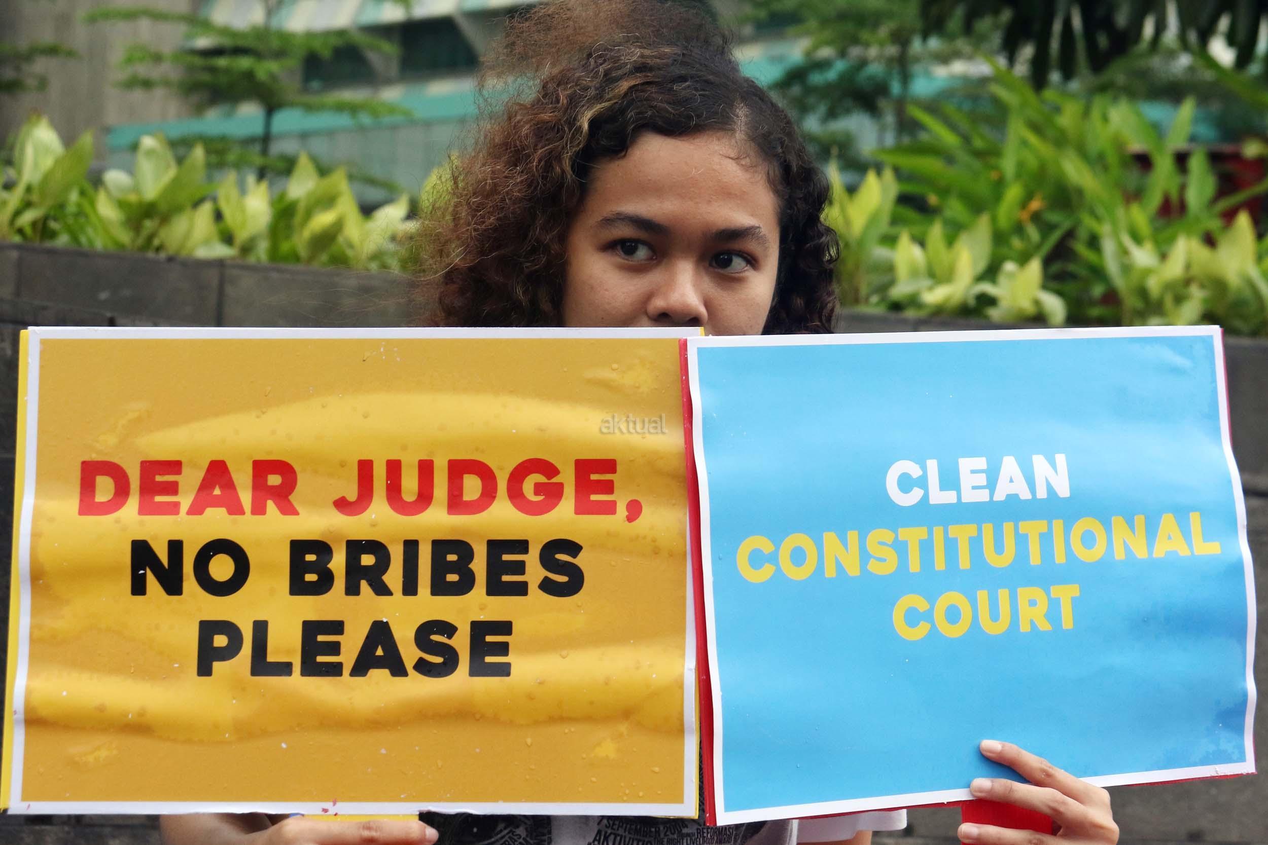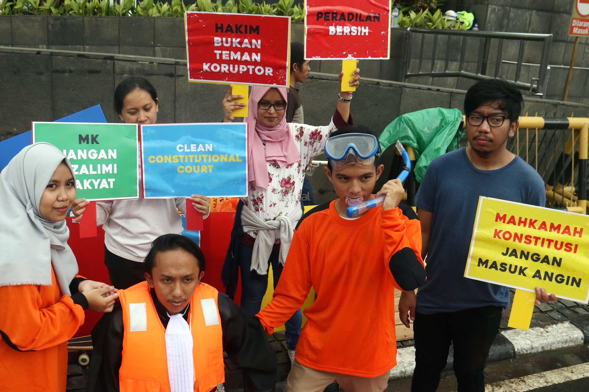 Sejumlah aktivis ICW melakukan unjuk rasa di kawasan CFD, Jakarta, Minggu (12/2/2017). Dalam aksinya para aktivis ICW mengajak masyarakat Indonesia untuk Selamatkan Mahkamah Konstitusi (MK) dari perilaku Hakim Konstitusi yang korup. AKTUAL/Munzir