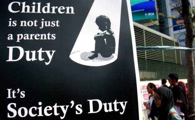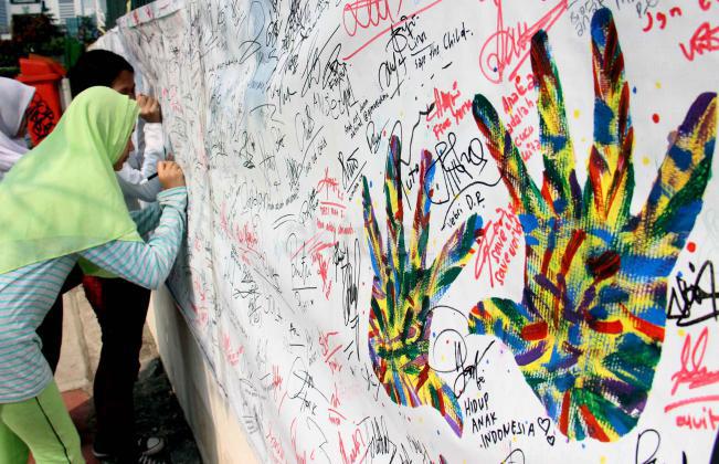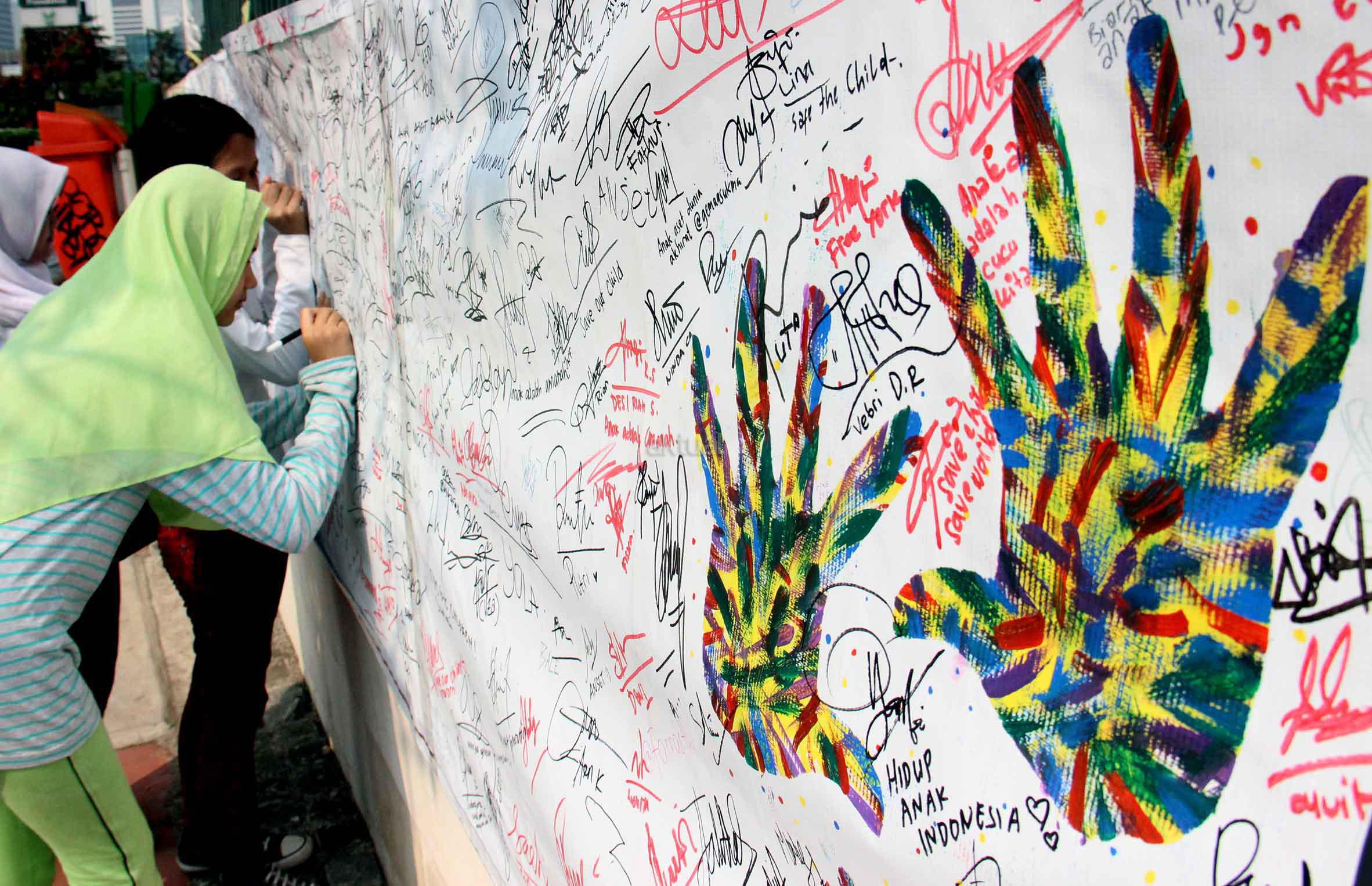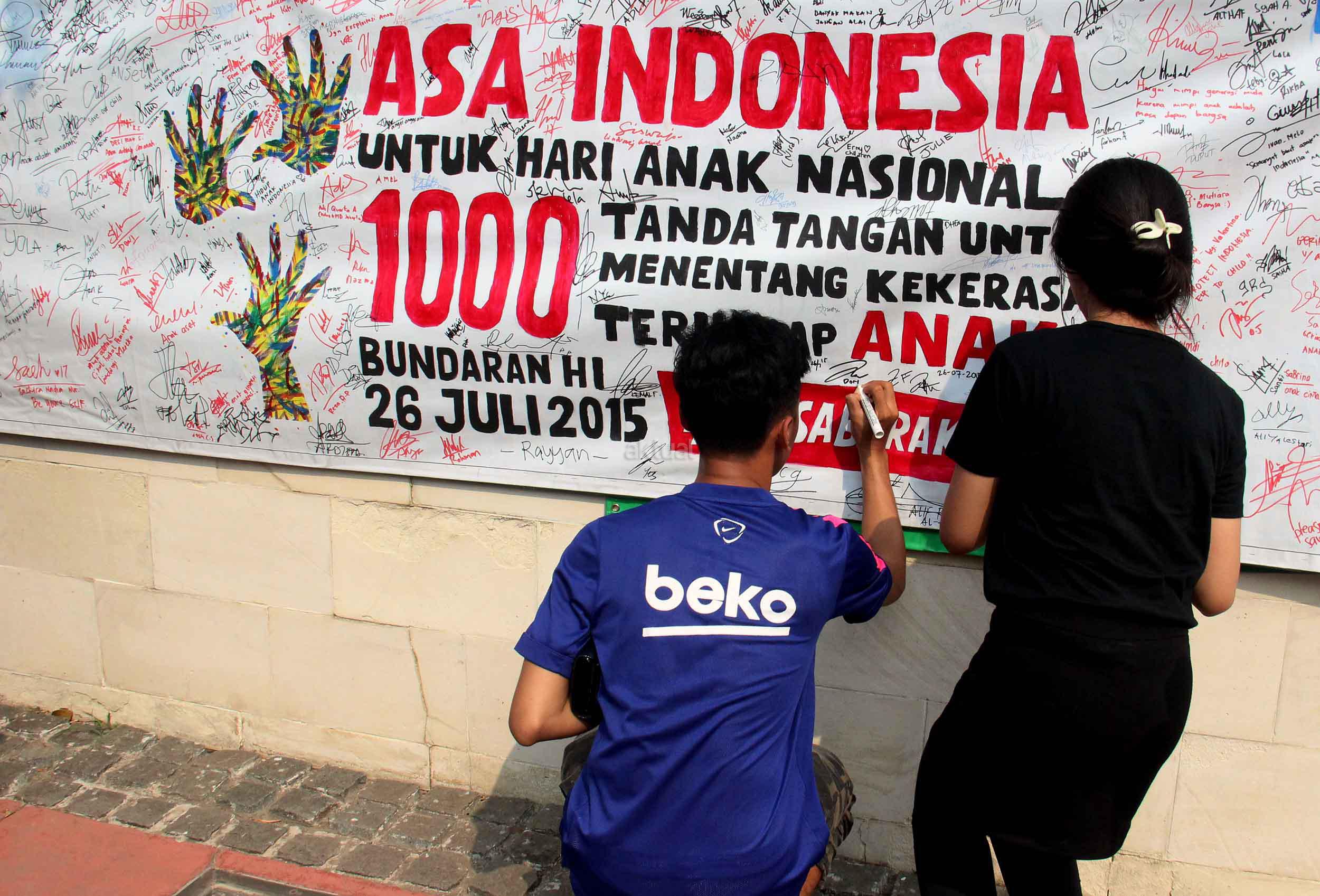 Beberapa masyarakat memberikan dukungan tolak kekerasan terhadap anak dengan membubuhkan tanda tangan, di Jakarta, Minggu (26/7/2015). Hari Anak Nasional yang jatuh pada tanggal 23 Juli 2015, sebagai bentuk perlindungan terhadap anak Indonesia masih cukup tinggi dan tingkat kekerasan terhadap anak.