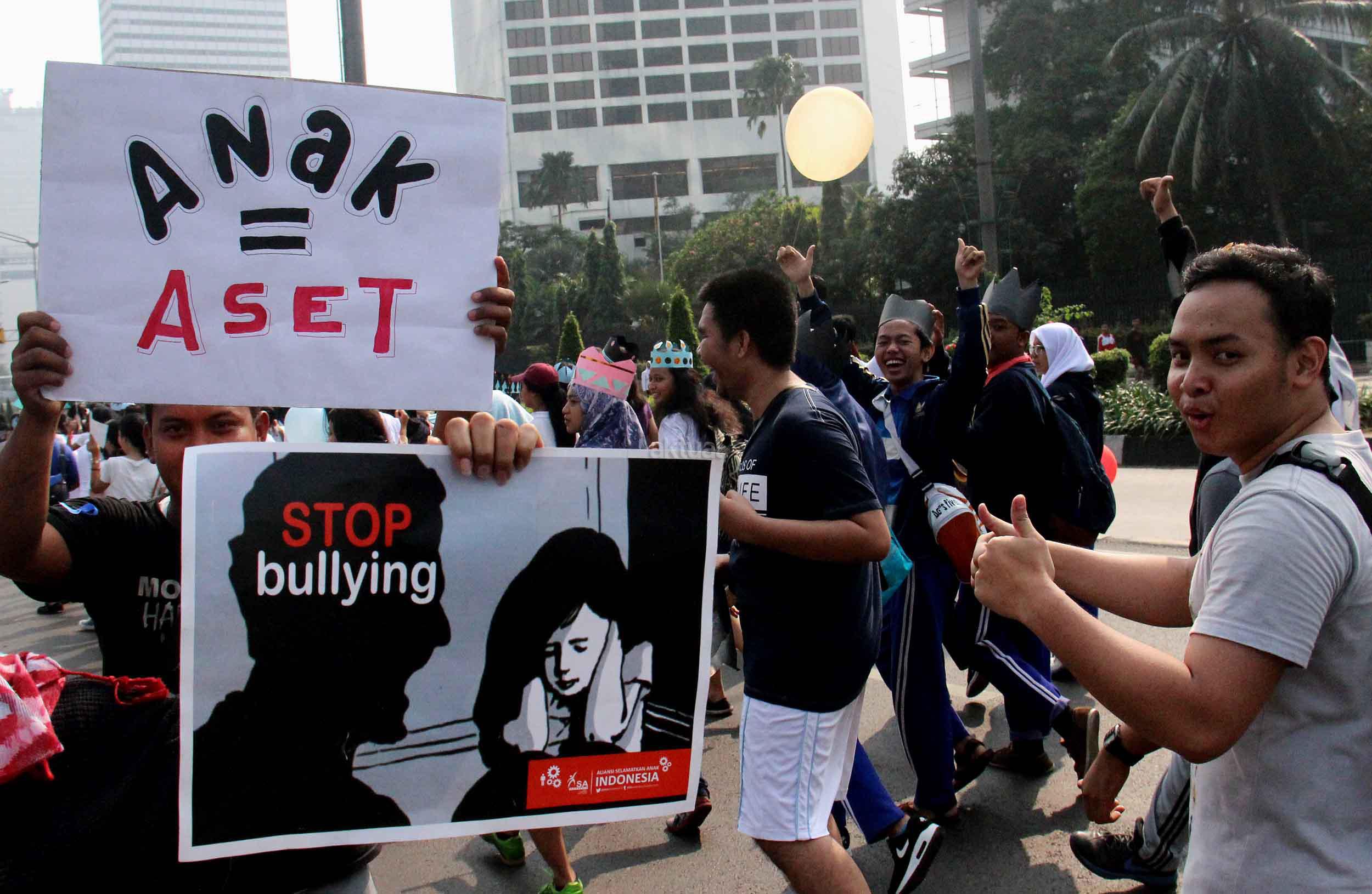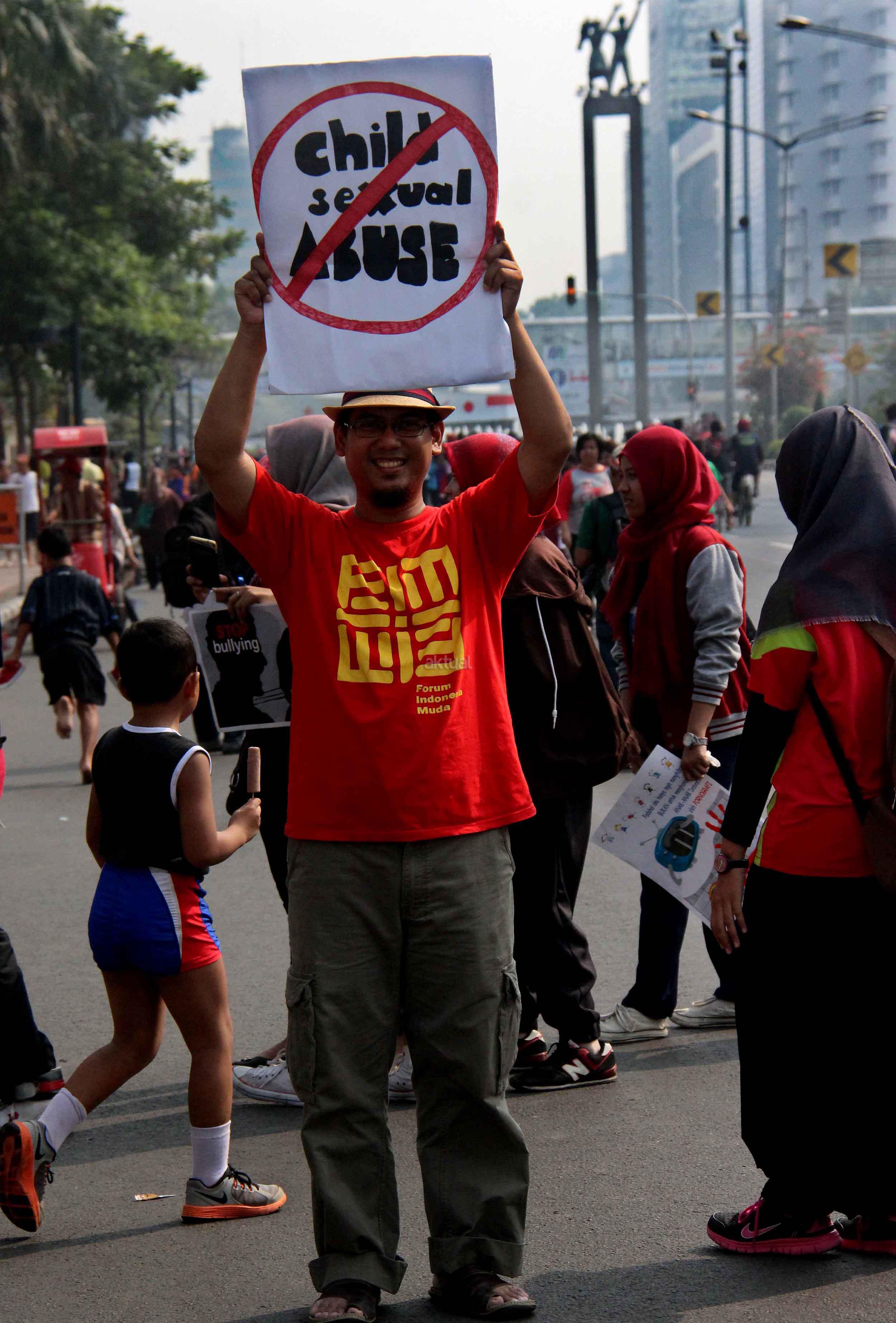 Puluhan aktivis yang tergabung dalam Aliansi Selamatkan Anak (ASA) Indonesia mealukan aksi tanda - tangan menolak kekerasan terhadap anak di Car Free Day (CFD), Jakarta, Minggu (26/7/2015). Hari Anak Nasional yang jatuh pada tanggal 23 Juli 2015, sebagai bentuk perlindungan terhadap anak Indonesia masih cukup tinggi dan tingkat kekerasan terhadap anak.