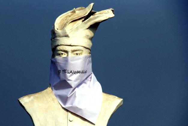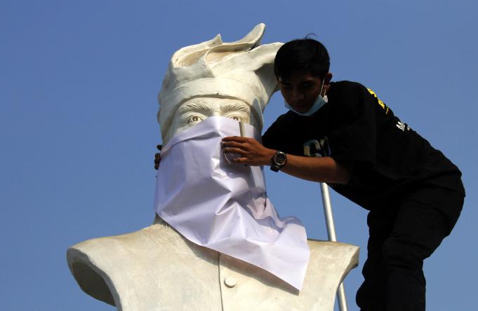 Seorang anggota komunitas Earth Hour Makassar memasangi kain menyerupai masker pelindung pernapasan pada patung Sultan Hasanuddin saat aksi solidaritas melawan asap di Anjungan Pantai Losari, Makassar, Sulawesi Selatan, Minggu (25/10). Aksi tersebut sebagai bentuk protes terhadap perusahaan yang melakukan pembukaan lahan dan pembakaran hutan yang menyebabkan bencana asap yang terjadi di Kalimantan dan Sumatera. ANTARA FOTO/Abriawan Abhe/aww/15.