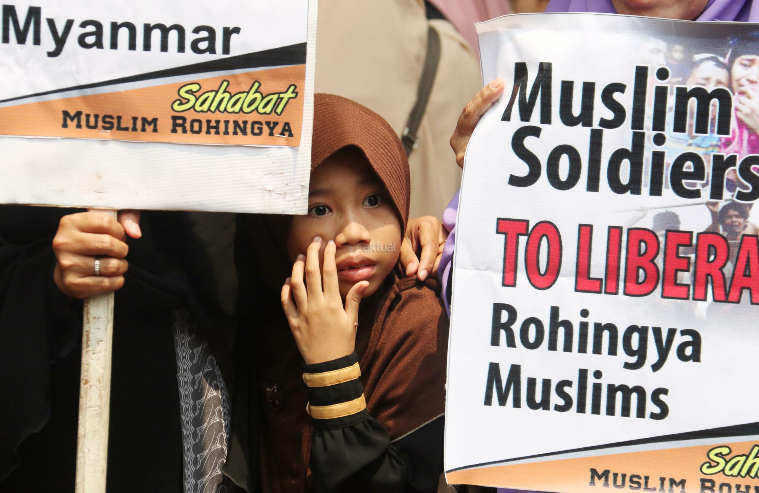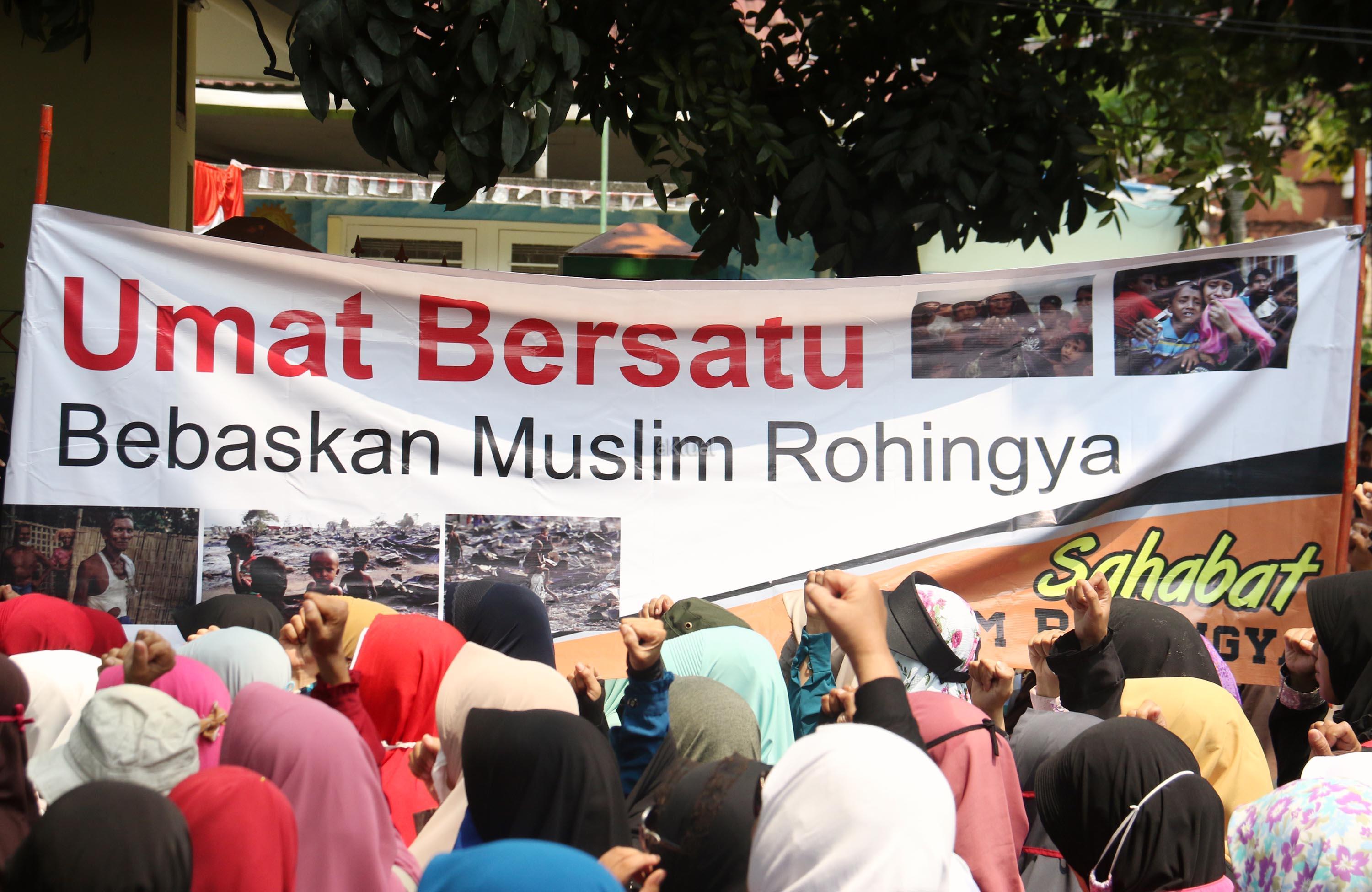 Sejumlah massa yang tergabung dalam Sahabat Muslim Rohingya melakukan aksi di Kedutaan Besar Myanmar, Jakarta, Senin (4/9/2017). Dalam aksinya pengunjuk rasa menuntut pemerintah mengusir Dubes Myanmar dari Indonesia menyusul tragedi kemanusiaan etnis Rohingya. AKTUAL/Munzir