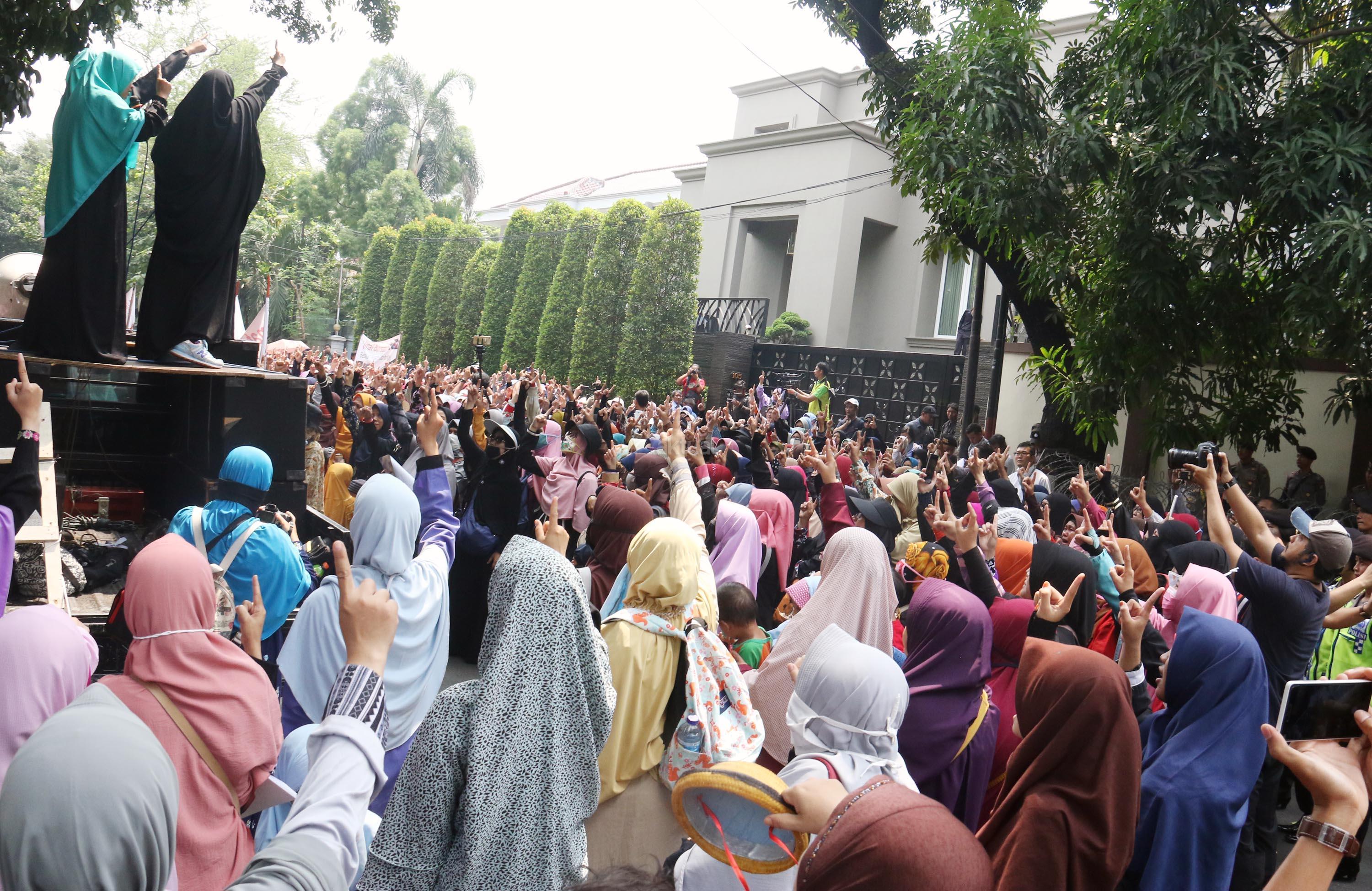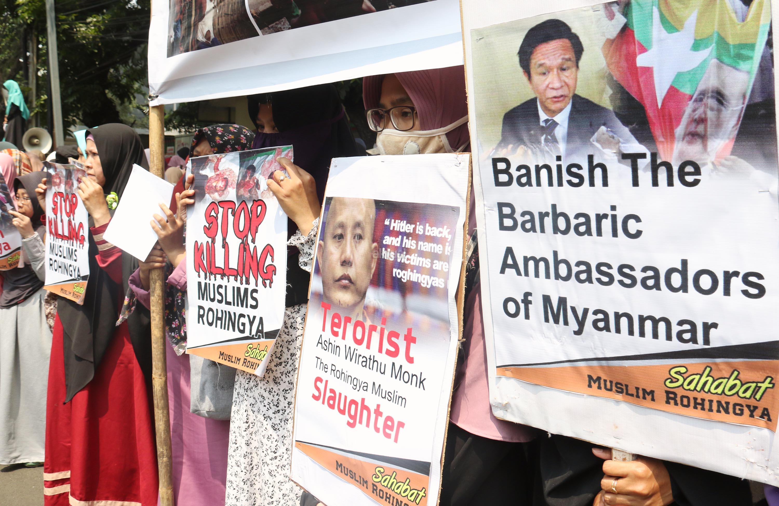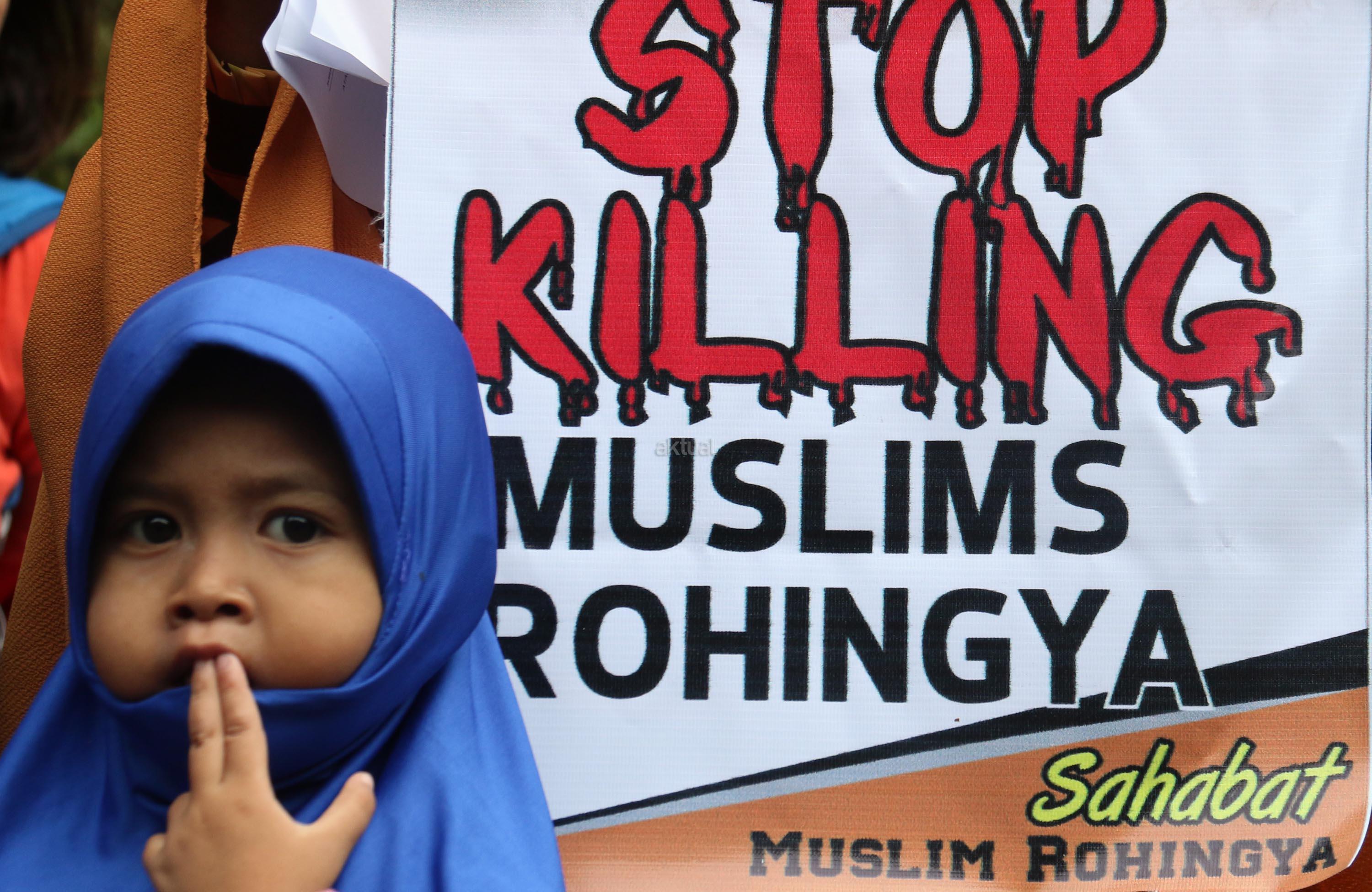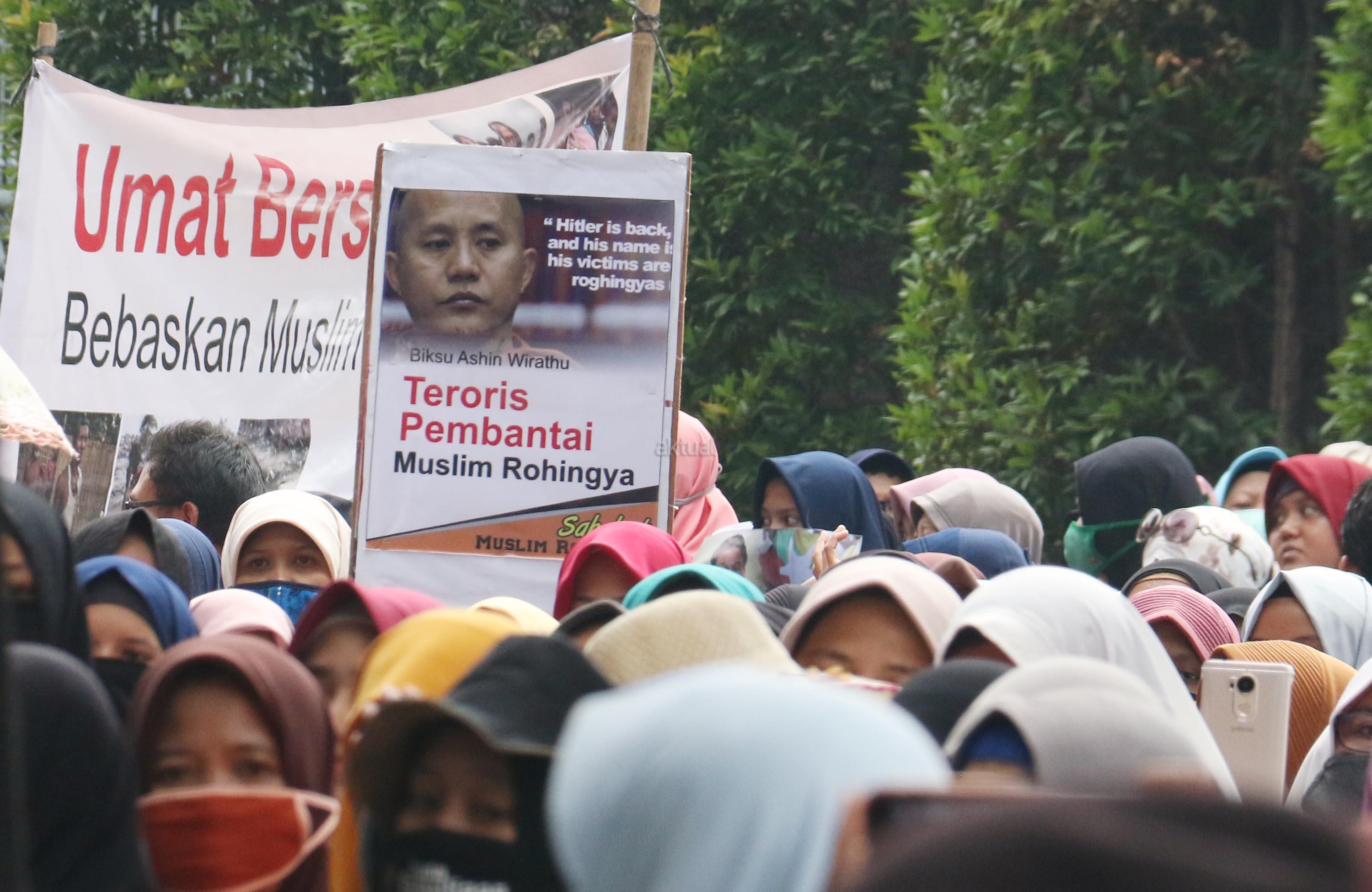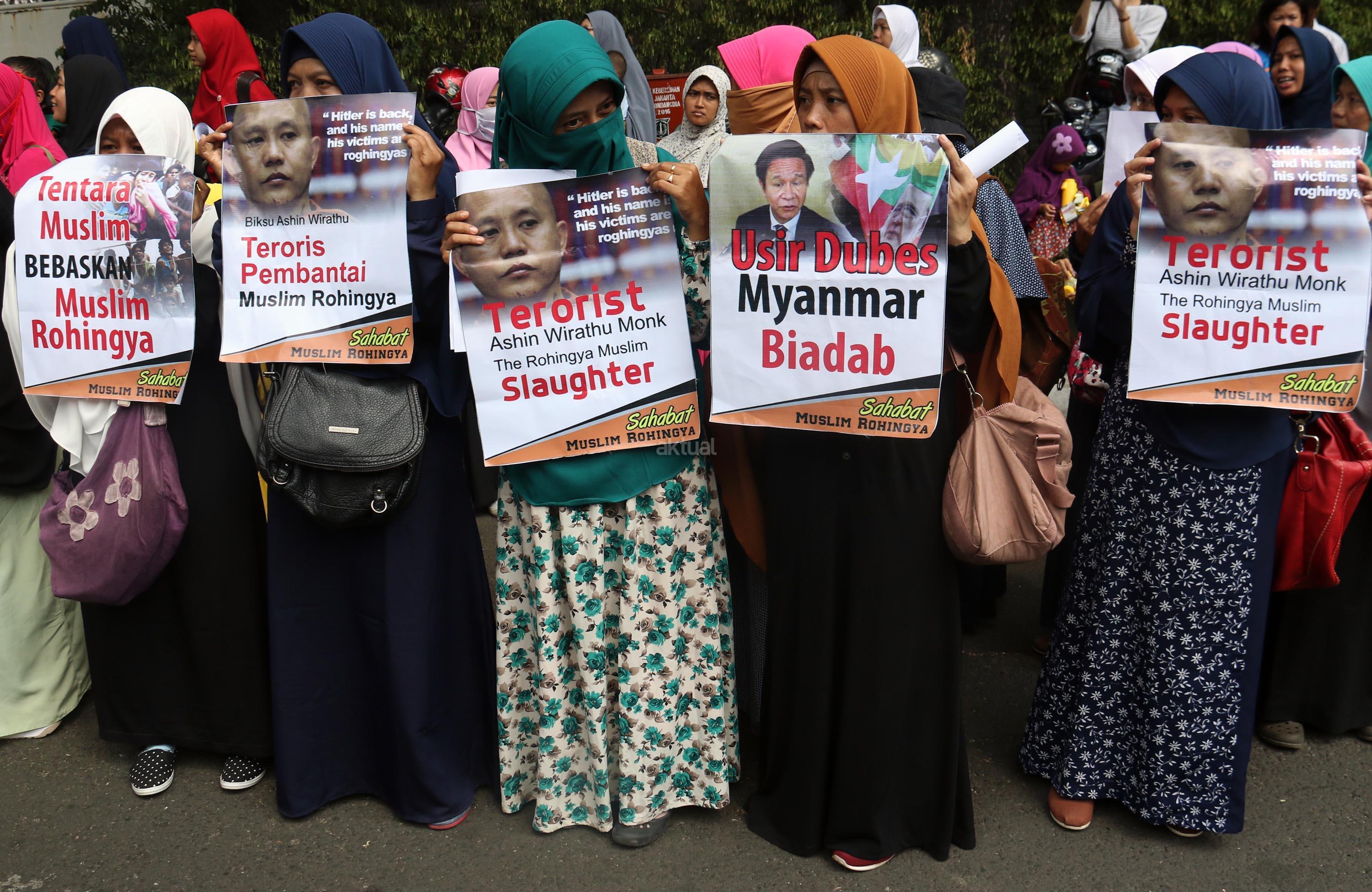 Ratusan massa yang tergabung dalam Sahabat Muslim Rohingya melakukan aksi di Kedutaan Besar Myanmar, Jakarta, Senin (4/9/2017). Dalam aksinya pengunjuk rasa menuntut pemerintah mengusir Dubes Myanmar dari Indonesia menyusul tragedi kemanusiaan etnis Rohingya. AKTUAL/Munzir