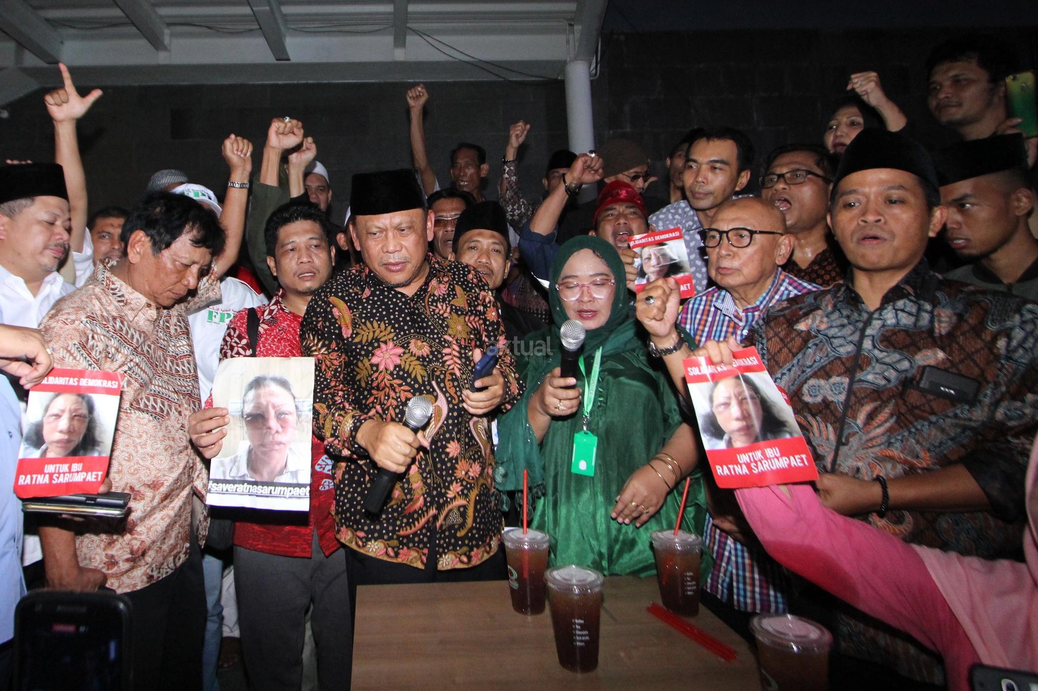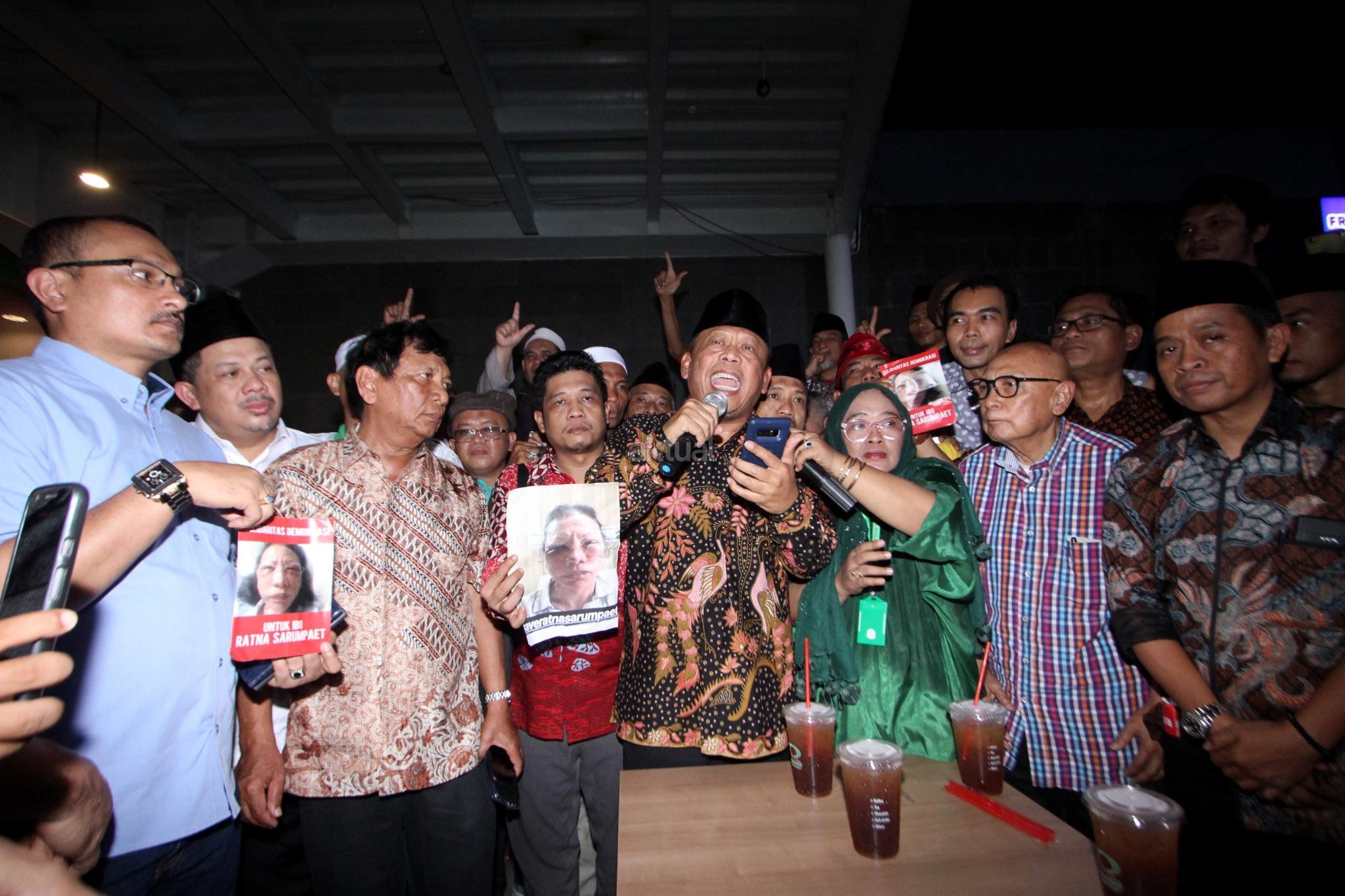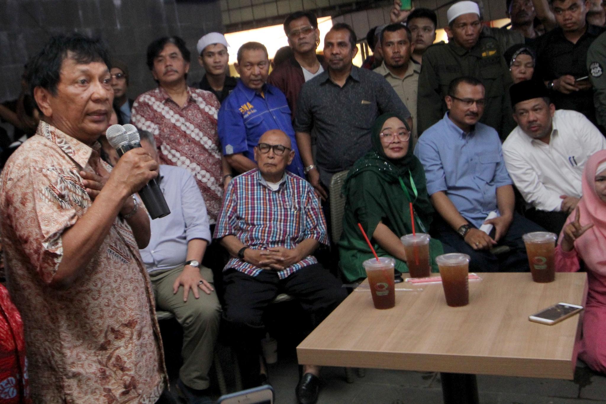 Pengacara Eggi Sudjana (kedua kanan), Wakil Ketua DPR RI Fahri Hamzah (kedua kiri), Aktivis Hariman Siregar (ketiga kiri) dan Politisi Demokrat Ferdinand Hutahaean (kiri) bersama sejumlah aktivis membacakan pernyataan sikap saat acara aksi solidaritas untuk Ratna Sarumpaet di Jakarta, Selasa (2/10). Para aktivis berkumpul untuk memberi dukungan kepada Ratna Sarumpaet dan meminta kepada pemerintah untuk segera menyelesaikan kasus tersebut. AKTUAL/Tino Oktaviano